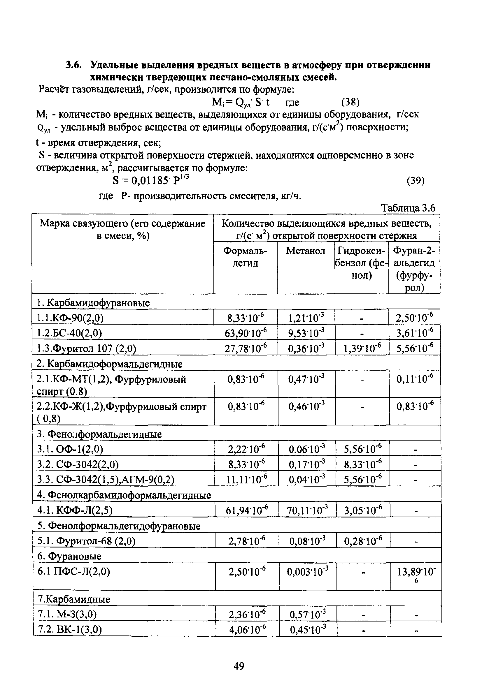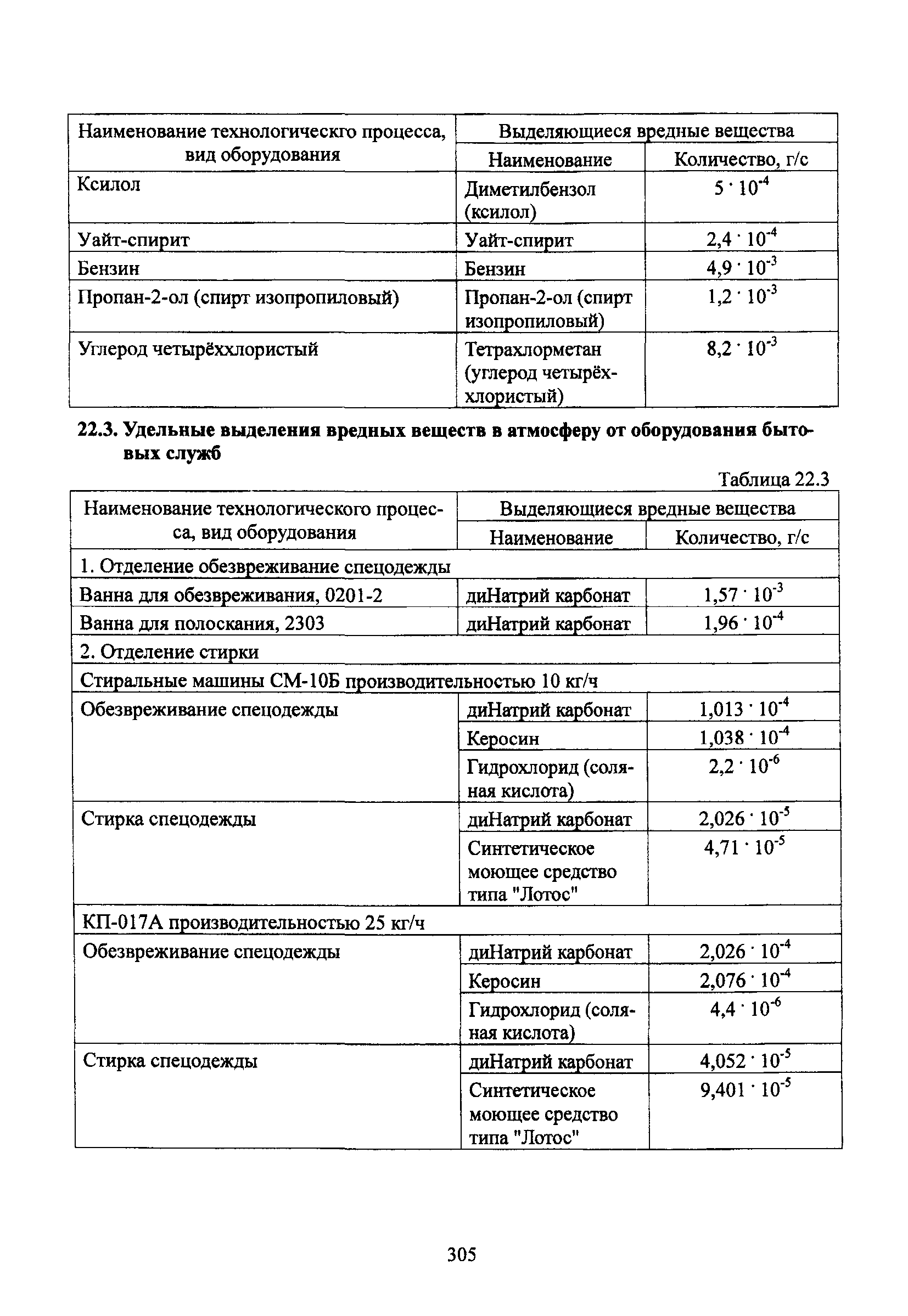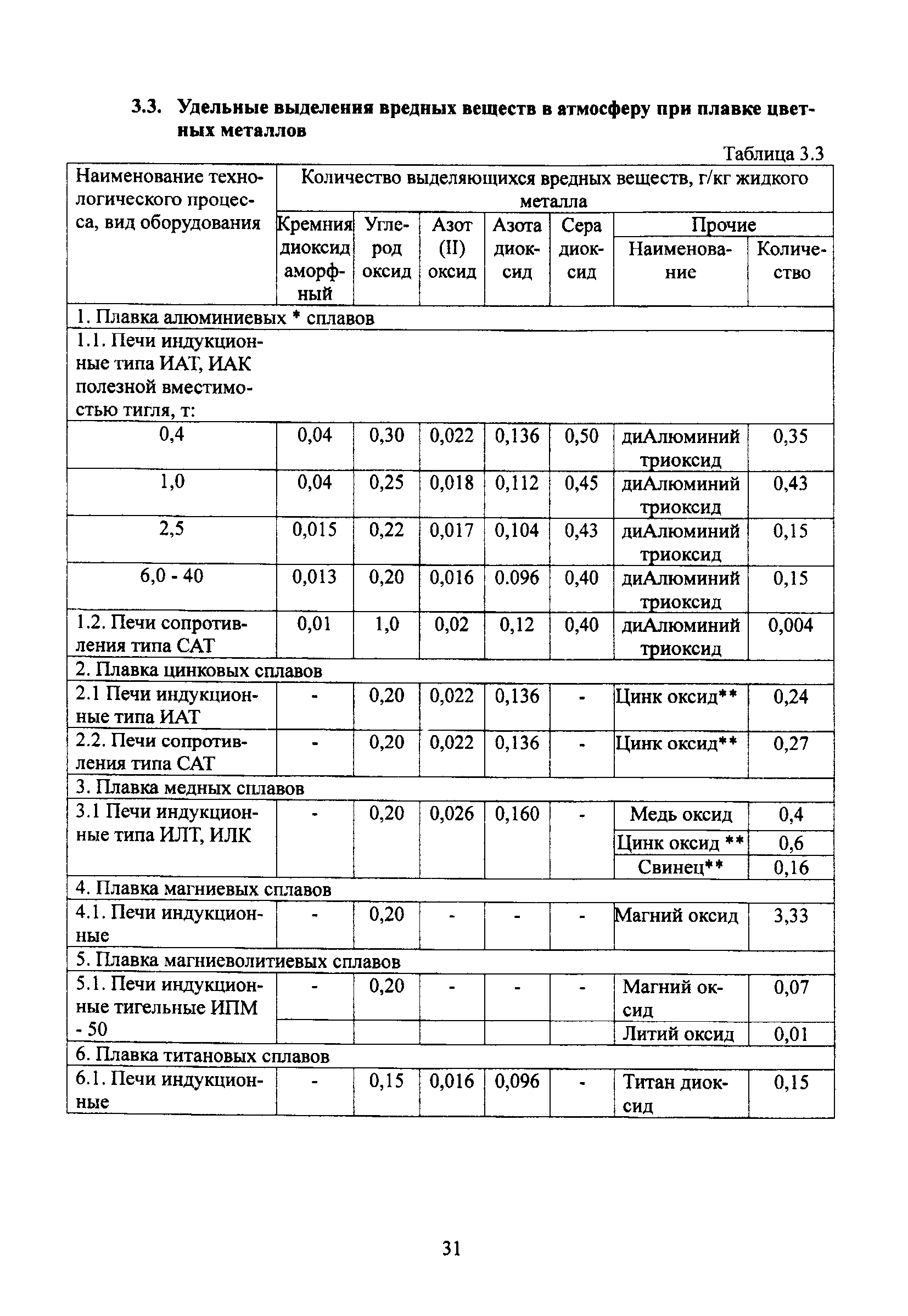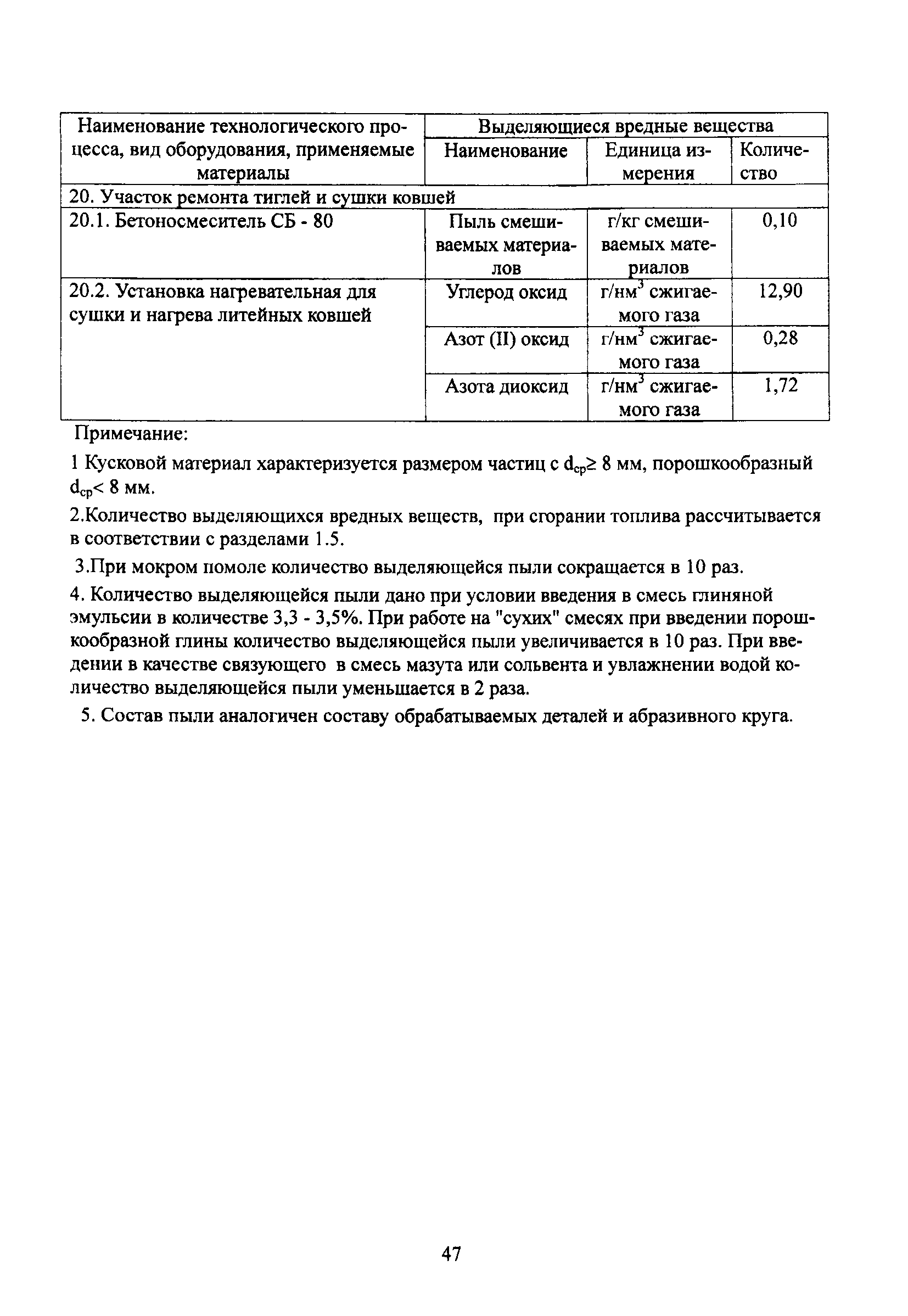 Методика предназначена для определения выбросов вредных веществ в атмосферу от промышленных производств. | | Оглавление: | Порядок применения расчетной инструкции (методики) 1. Область применения методики 2. Основные положения 3. Основные рекомендации по вопросу применения методики I. Введение II. Общие положения III. Методология расчета выбросов загрязняющих веществ в атмосферу на основании инструментальных замеров IV. Методология расчета выбросов загрязняющих веществ от источников выделений (единицы оборудования) на основании удельных показателей V. Методология расчета выбросов загрязняющих веществ, поступающих в атмосферу от источников выбросов 5.1. Количество вредных веществ, удаляемых местными отсосами 5.2. Суммарная эффективность двухступенчатой очистки 5.3. Количество вредных веществ, удаляемых общеобменной вентиляцией 5.4. Количество вредных веществ, удаляемых общеобменной вентиляцией в случае, если оборудование оснащено рециркуляционными пылеулавливающими агрегатами 5.5. Учет длительности выброса загрязняющего вещества 5.6. Годовые выбросы вредных веществ VI. Методология расчета выбросов загрязняющих веществ при сжигании топлива в горнах и бытовых теплогенераторах 6.1. Расчет количества топлива, сжигаемого в теплогенераторах 6.2. Расчет объема дымовых газов 6.3. Расчет температуры дымовых газов 6.4. Выделения вредных веществ при сжигании топлива 6.4.1. Расчет выделений твердых частиц 6.4.2. Расчет выделений серы диоксида 6.4.3. Расчет выделений углерода оксида 6.4.4. Расчет выделений оксидов азота 6.4.5. Расчет выделений бенз/а/пирена 6.5. Выделения вредных веществ при розжиге горнов с применением нефтесодержащих отходов Приложение 1 Сжигание топлива в горнах и бытовых теплогенераторах (печах) Приложение 2 Нанесение покрытий путем напыления и в расплавах металлов Приложение 3 Литейное производство Приложение 4 Производство деталей методом порошковой металлургии Приложение 5 Кузнечно - прессовое, штамповочное производство и термическая обработка металлов Приложение 6 Механическая обработка материалов Приложение 7 Общезаводские лаборатории Приложение 8 Механическая подготовка поверхностей деталей Приложение 9 Участки подготовки для нанесения электрохимических покрытий Приложение 10 Производство лакокрасочных покрытий Приложение 11 Производство эмалевых покрытий Приложение 12 Деревообрабатывающее производство Приложение 13 Участки остеклования Приложение 14 Производства по переработке пластмасс Приложение 15 Производство деталей из полимерных композиционных материалов (ПКМ) Приложение 16 Изготовление резинотехнических изделий Приложение 17 Участки герметизации изделий радиоэлектронной аппаратуры полимерными материалами Приложение 18 Производство печатных плат Приложение 19 Микроэлектронное производство Приложение 20 Производство активно-матричных жидкокристаллических и автоэмиссионных экранов (АМ ЖКЭ) Приложение 21 Сборочно-монтажное производство узлов и блоков радиоэлектронной аппаратуры Приложение 22 Вспомогательные и бытовые службы Приложение 23 Условные обозначения | | Разработан: | ООО ЭВИОН ОАО ГПНИИ-5
