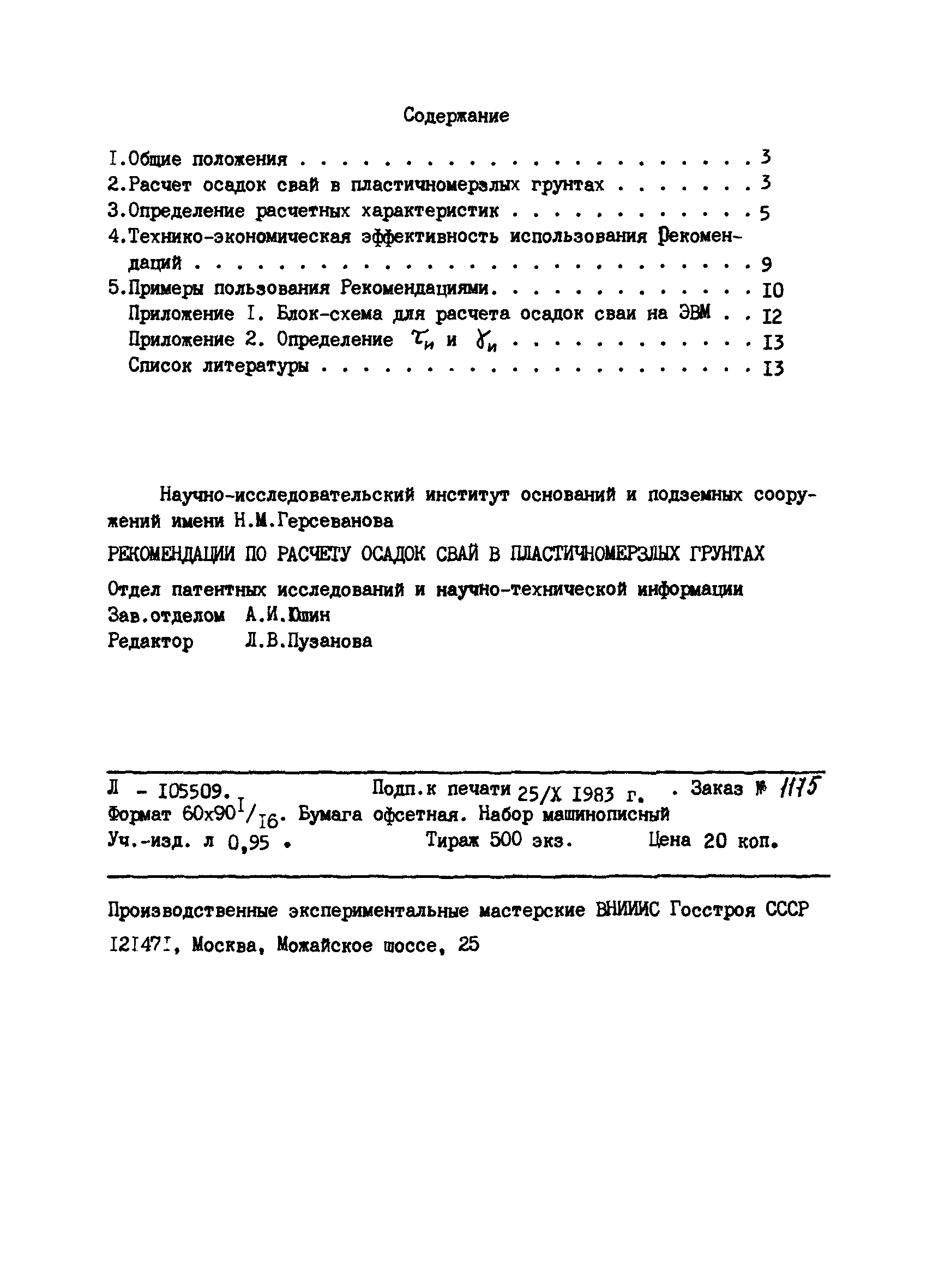 | Оглавление: | 1 Общие положения 2 Расчет осадок свай в пластичномерзлых грунтах 3 Определение расчетных характеристик 4 Технико-экономическая эффективность использования рекомендаций 5 Примеры пользования Рекомендациями Приложение Список литературы |