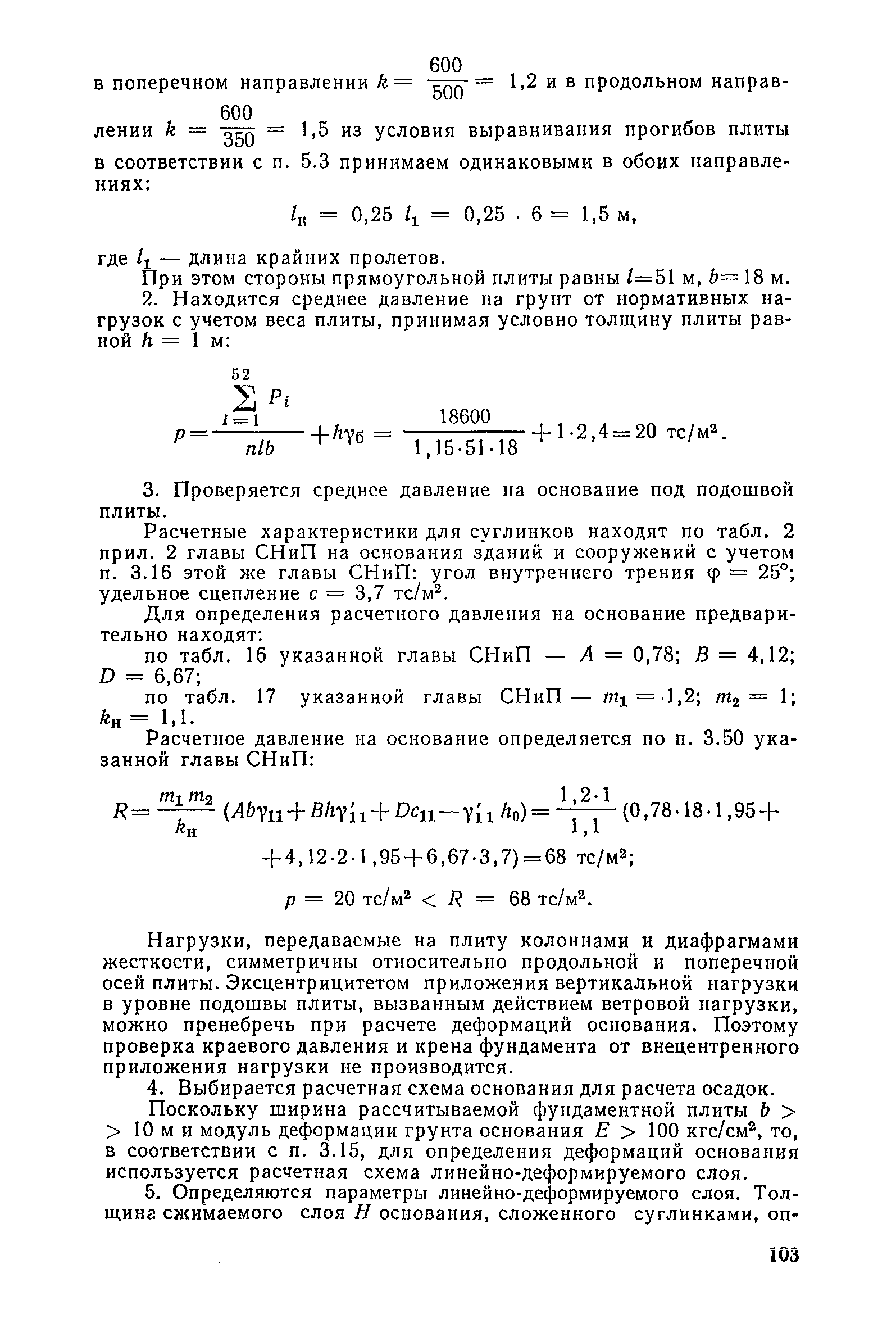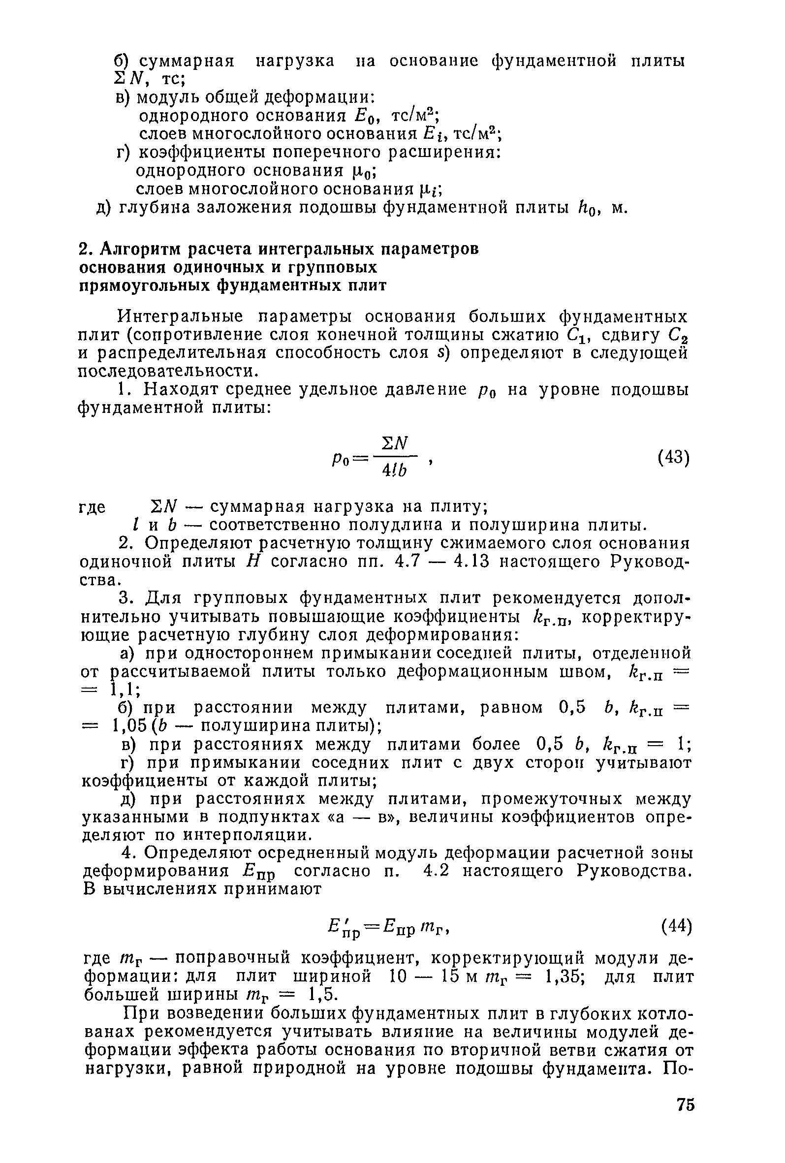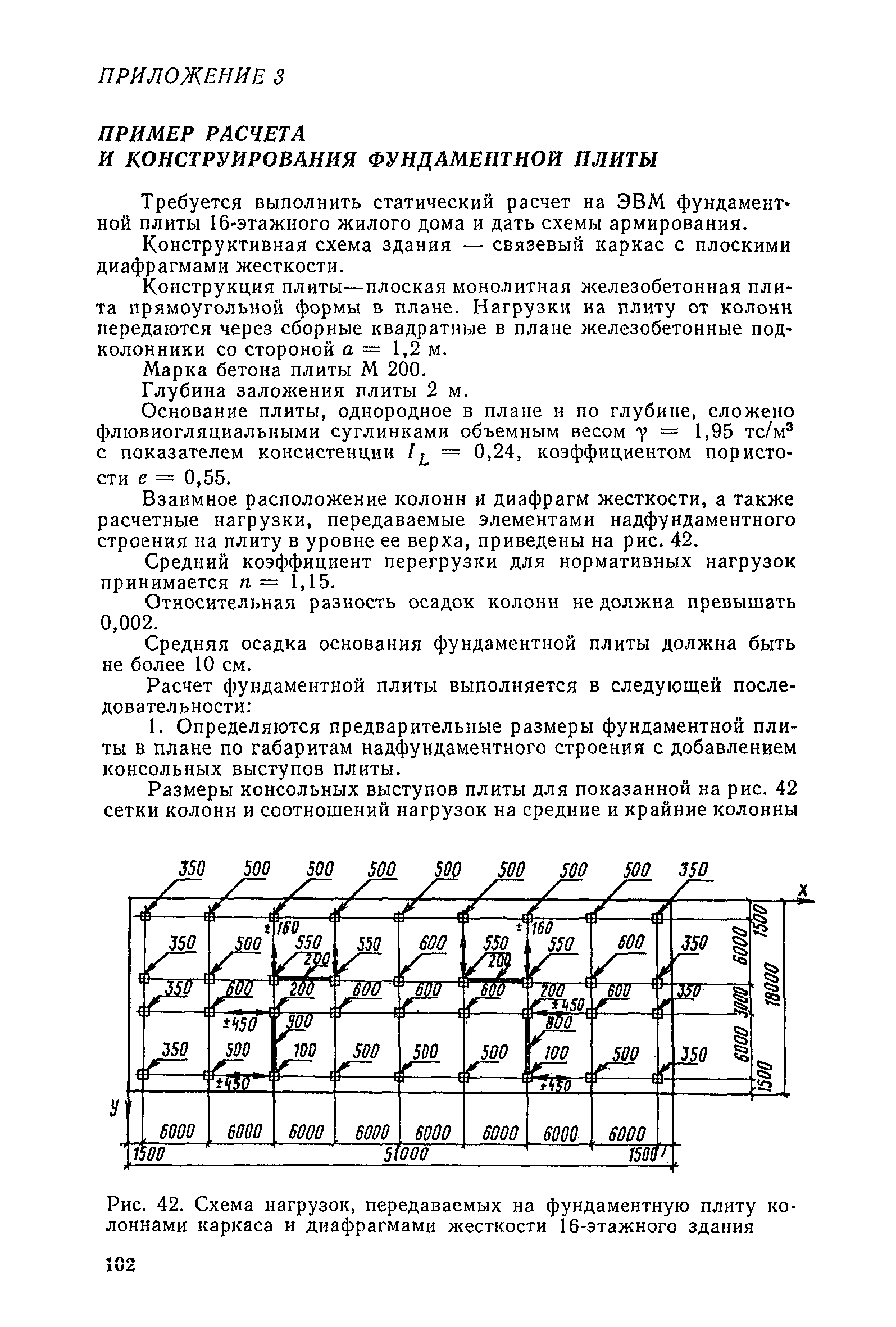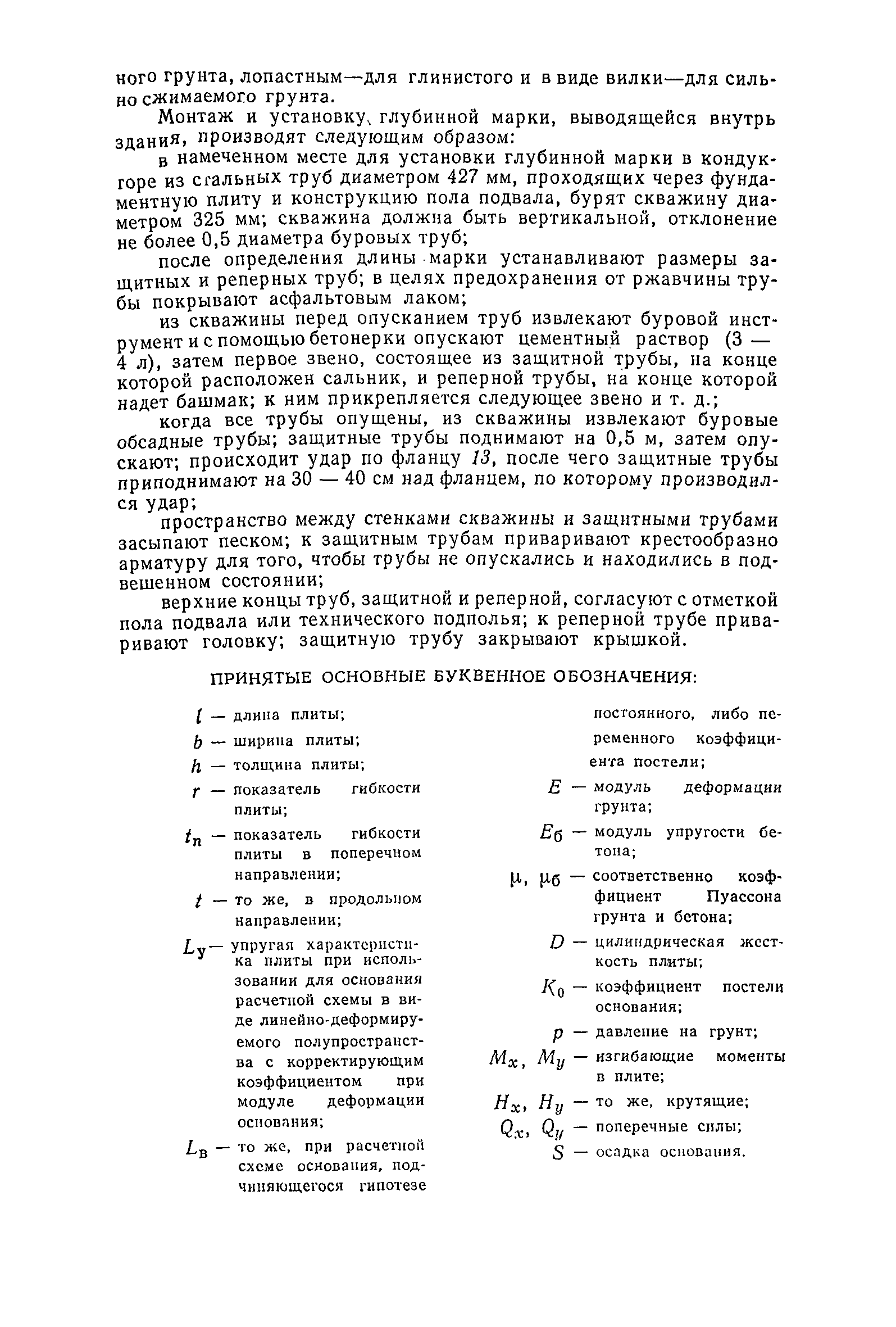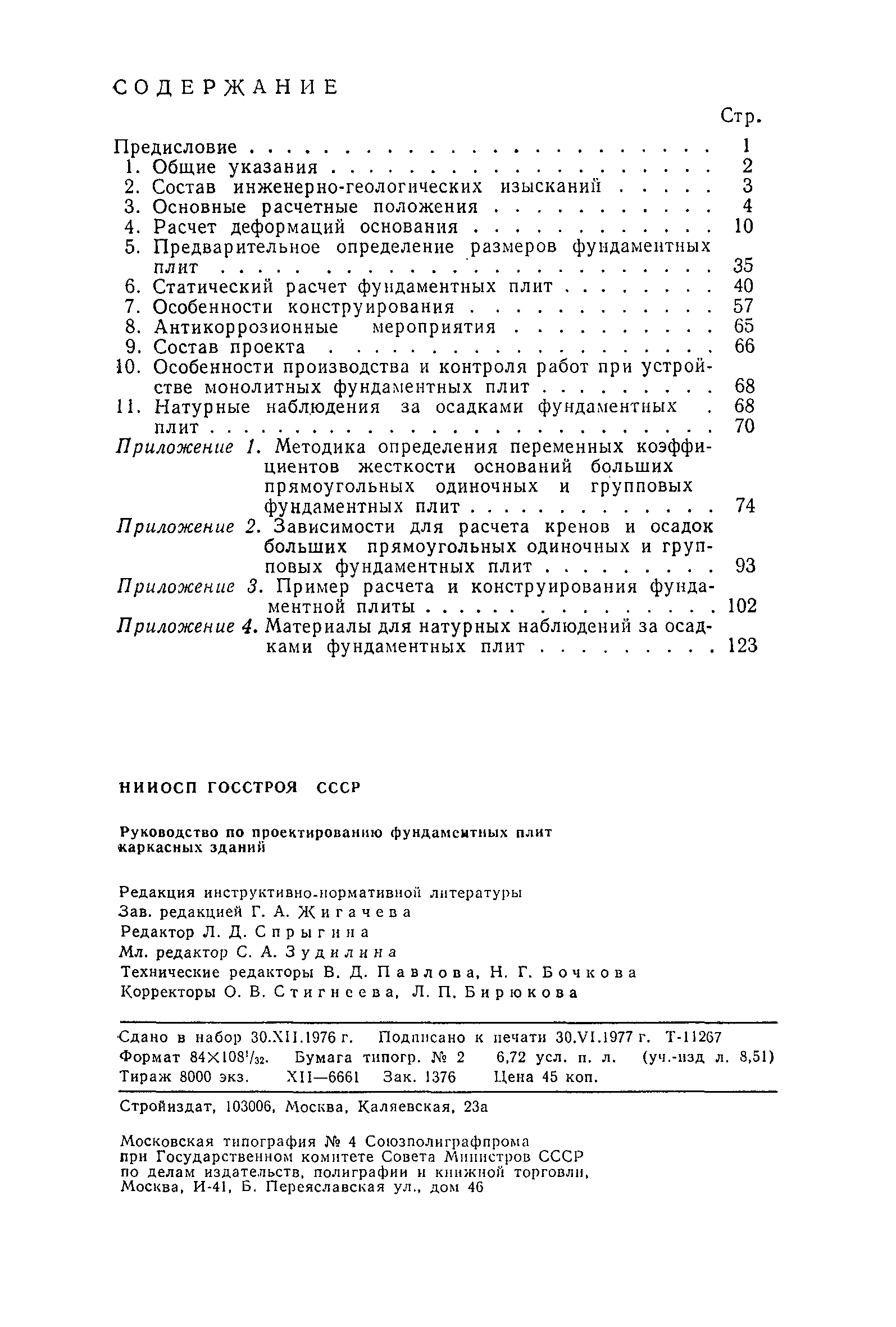 | Оглавление: | Предисловие 1. Общие указания 2. Состав инженерно-геологических изысканий 3. Основные расчетные положения 4. Расчет деформаций основания 5. Предварительное определение размеров фундаментных плит 6. Статический расчет фундаментных плит 7. Особенности конструирования 8. Антикоррозионные мероприятия 9. Состав проекта 10. Особенности производства и контроля работ при устройстве монолитных фундаментных плит 11. Натурные наблюдения за осадками фундаментных плит Приложение 1. Методика определения переменных коэффициентов жесткости оснований больших прямоугольных одиночных и групповых фундаментных плит Приложение 2. Зависимости для расчета кренов и осадок больших прямоугольных одиночных и групповых фундаментных плит Приложение 3. Пример расчета и конструирования фундаментной плиты Приложение 4. Материалы для натурных наблюдений за осадками фундаментных плит |