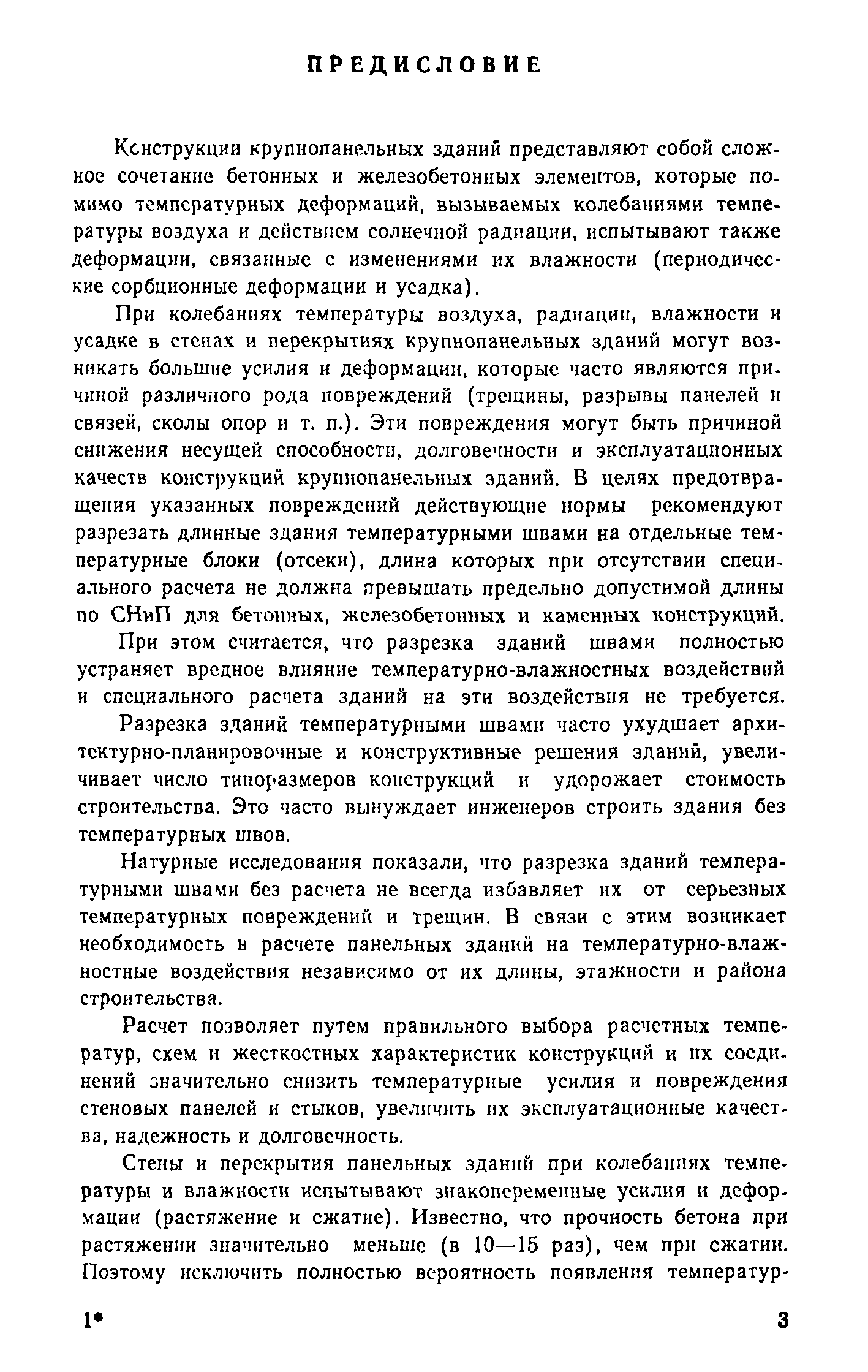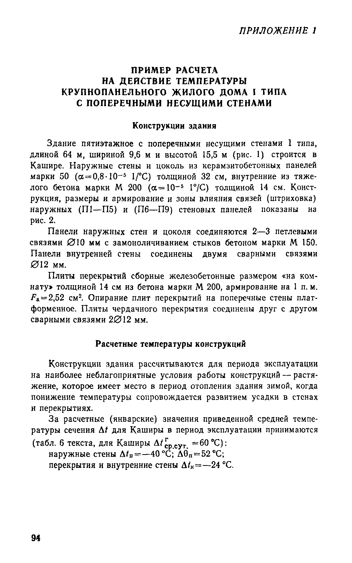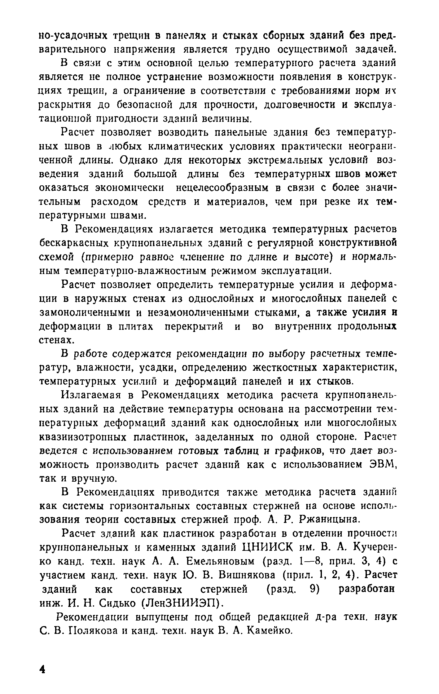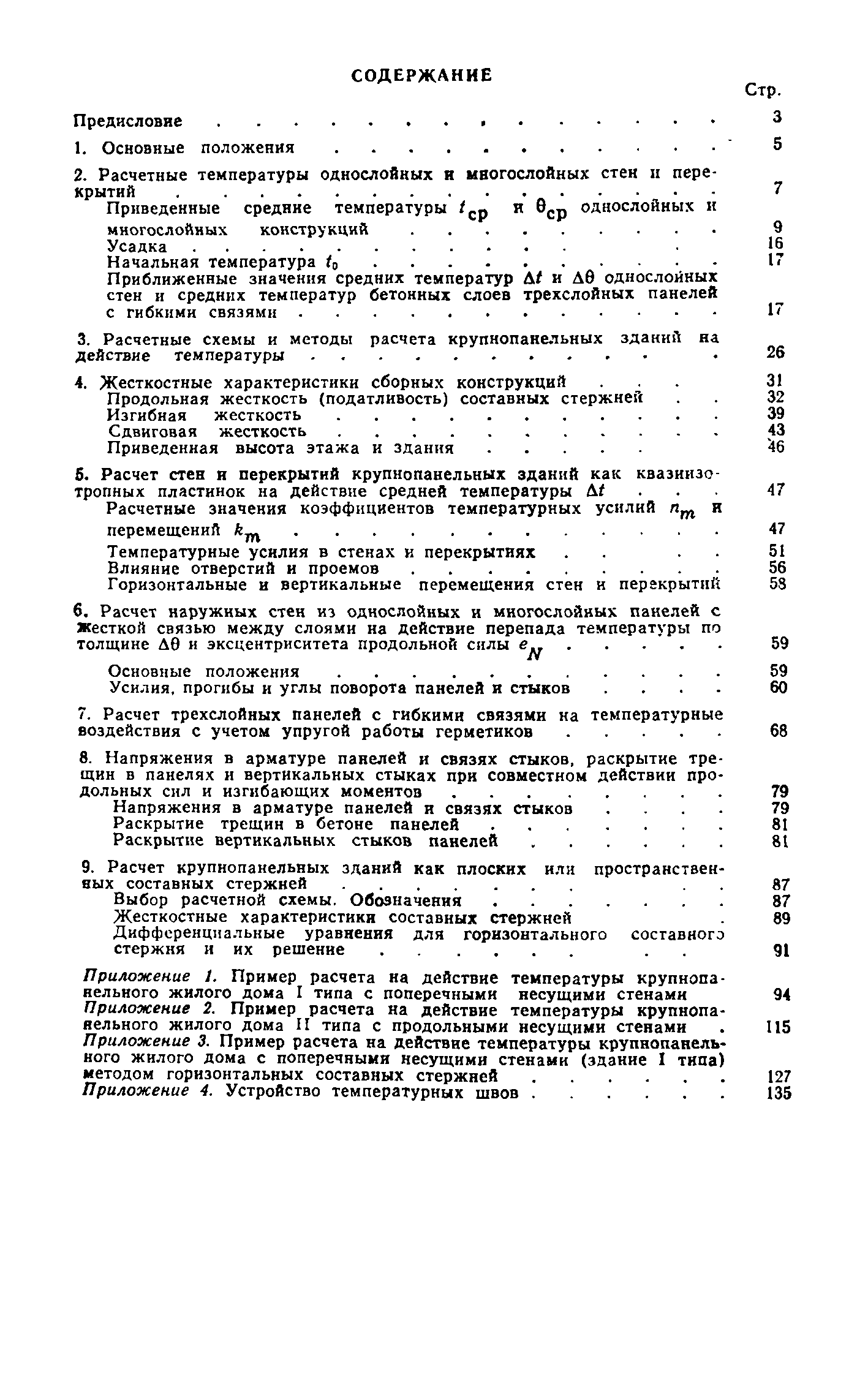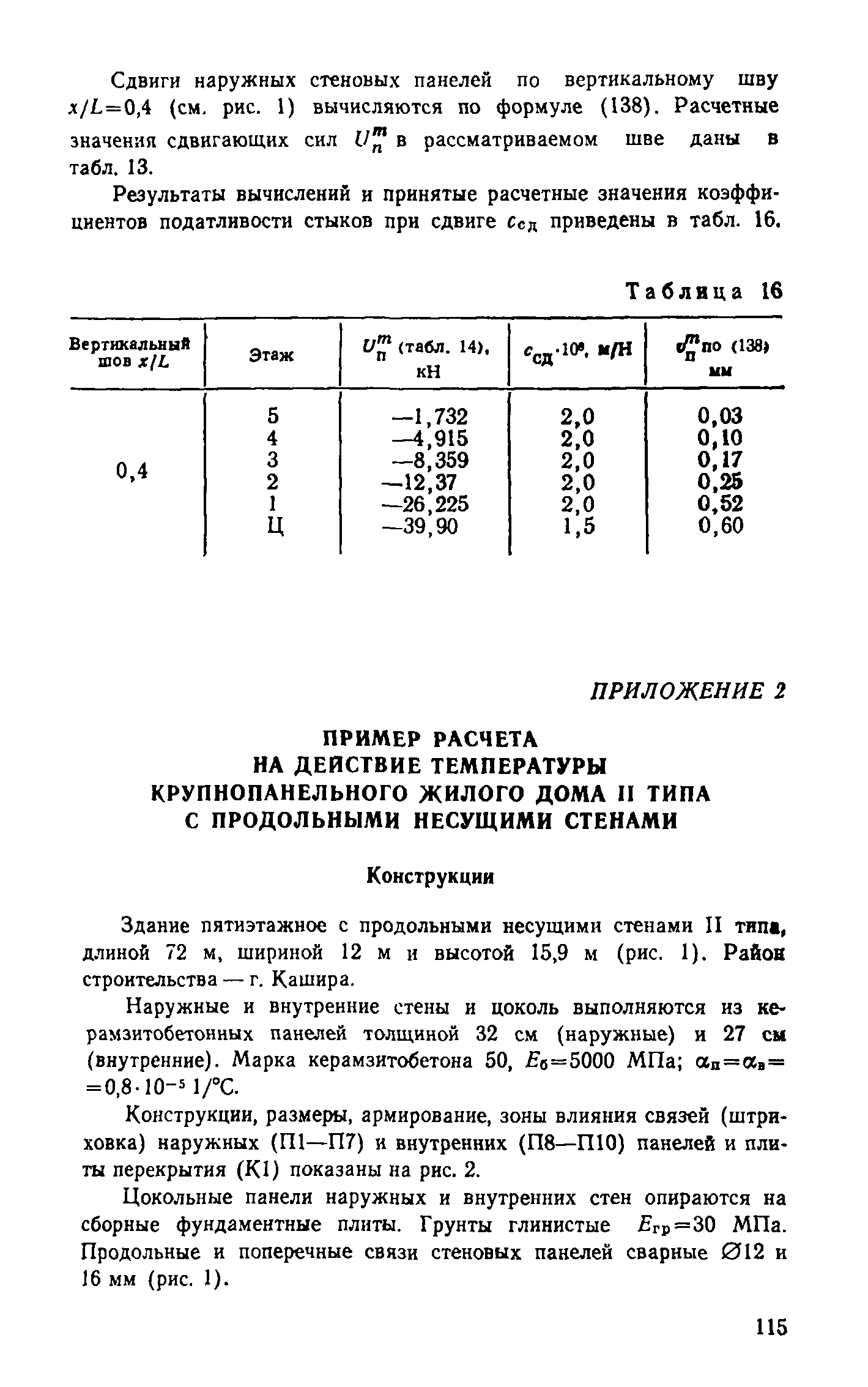 | Оглавление: | Предисловие 1 Основные положения 2 Расчетные температуры однослойных и многослойных стен и перекрытий Приведенные средние температуры однослойных и многослойных конструкций Усадка Начальная температура Приближенные значения средних температур однослойных стен и средних температур бетонных слоев трехслойных панелей с гибкими связями 3 Расчетные схемы и методы расчета крупнопанельных зданий на действие температуры 4 Жесткостные характеристики сборных конструкций Продольная жесткость (податливость) составных стержней Изгибная жесткость Сдвиговая жесткость Приведенная высота этажа и здания 5 Расчет стен и перекрытий крупнопанельных зданий как квазнизотропных пластинок на действие средней температуры Расчетные значения коэффициентов температурных усилий и перемещений Температурные усилия в стенах и перекрытиях Влияние отверстий и проемов Горизонтальные и вертикальные перемещения стен и перекрытий 6 Расчет наружных стен из однослойных и многослойных панелей с жесткой связью между слоями на действие перепада температуры по толщине и эксцентриситета продольной силы Основные положения Усилия, прогибы и углы поворота панелей и стыков 7 Расчет трехслойных панелей с гибкими связями на температурные воздействия с учетом упругой работы герметиков 8 Напряжения в арматуре панелей и связях стыков, раскрытие трещин в панелях и вертикальных стыках при совместном действии продольных сил и изгибающих моментов Напряжения в арматуре панелей и связях стыков Раскрытие трещин в бетоне панелей Раскрытие вертикальных стыков панелей 9 Расчет крупнопанельных зданий как плоских или пространственных составных стержней Выбор расчетной схемы. Обозначения Жесткостные характеристики составных стержней Дифференциальные уравнения для горизонтального составного стержня и их решение Приложение 1 Пример расчета на действие температуры крупнопанельного жилого дома I типа с поперечными несущими стенами Приложение 2 Пример расчета на действие температуры крупнопанельного жилого дома II типа с продольными несущими стенами Приложение 3 Пример расчета на действие температуры крупнопанельного жилого дома с поперечными несущими стенами (здание I типа) методом горизонтальных составных стержней Приложение 4 Устройство температурных швов |