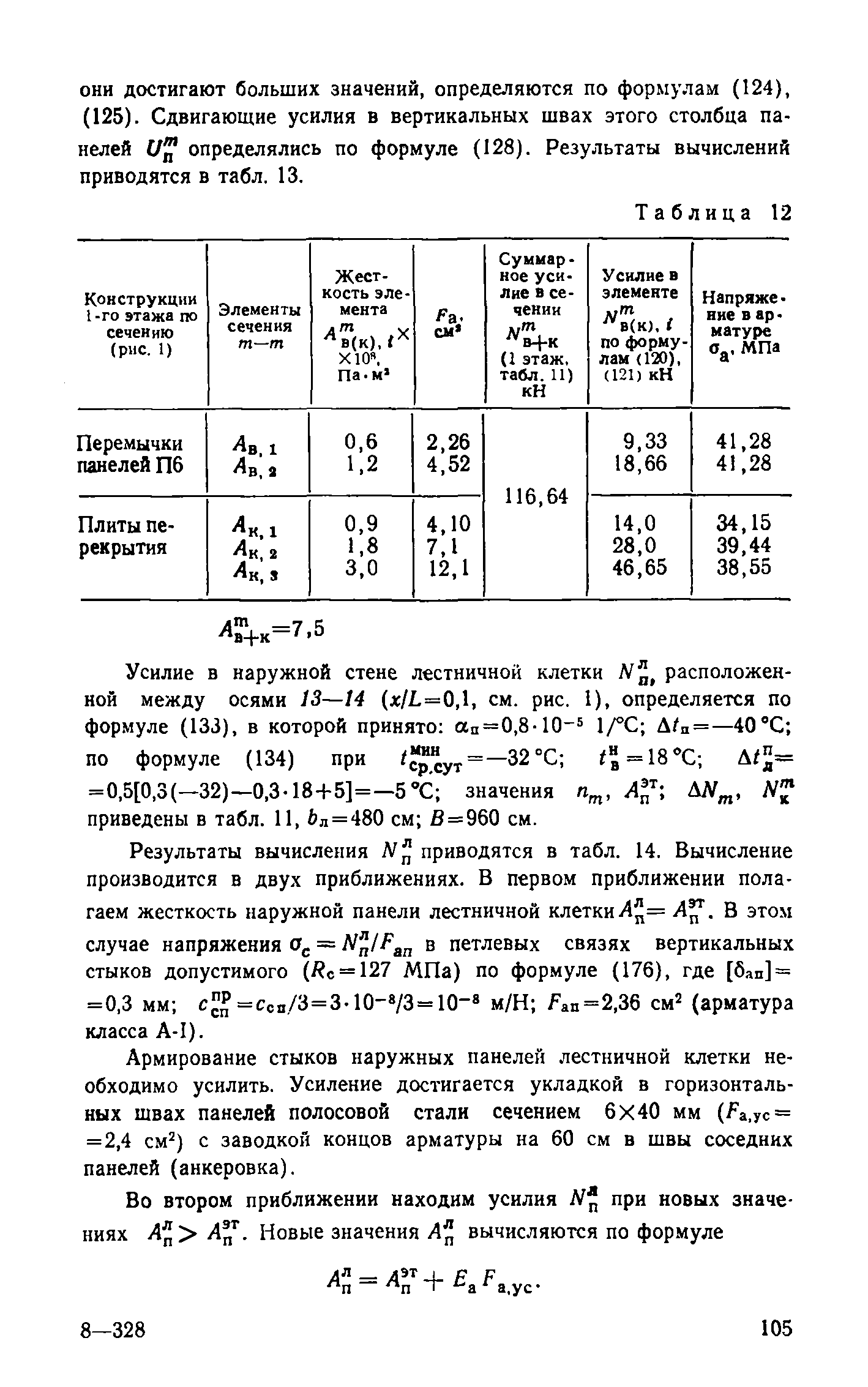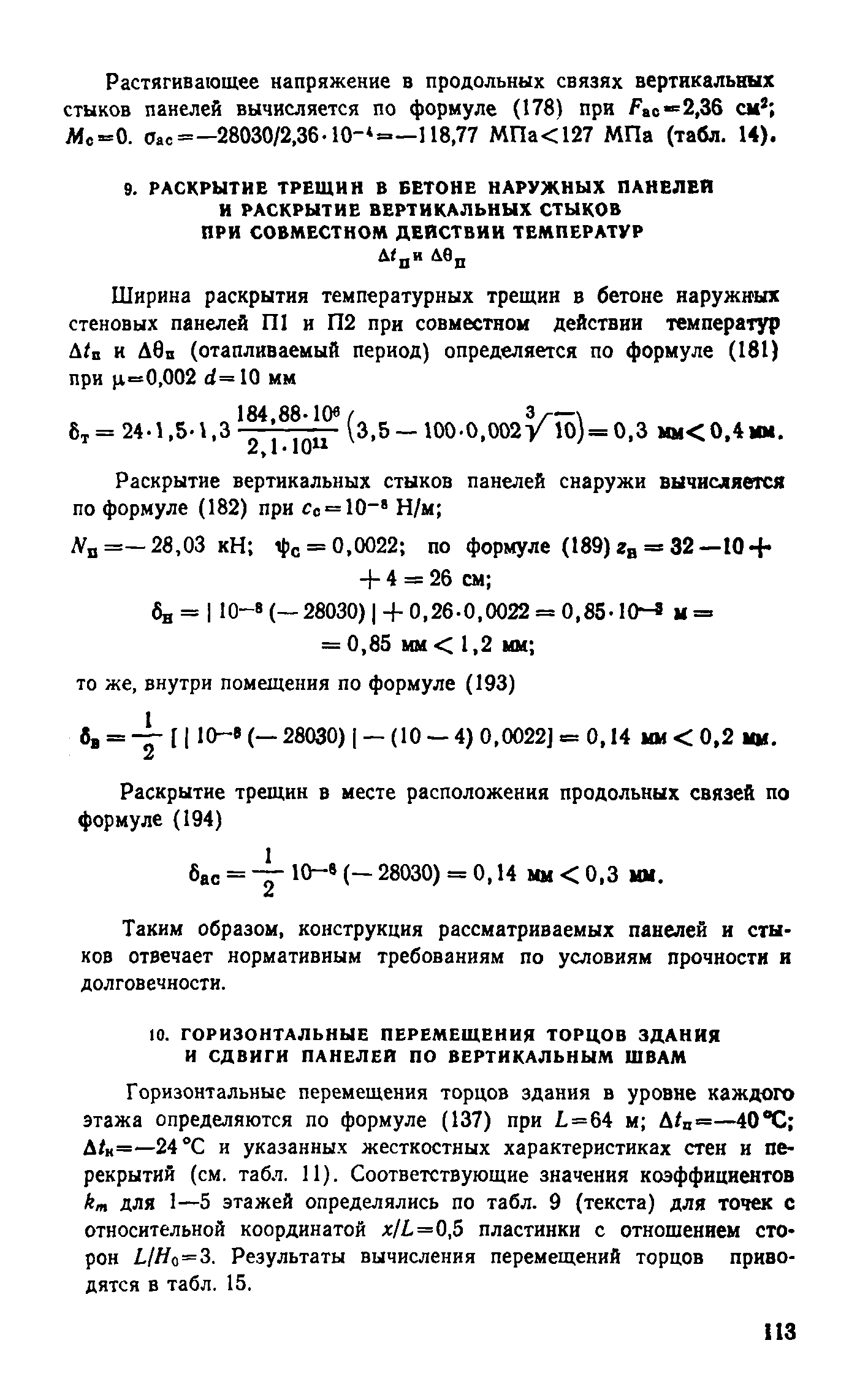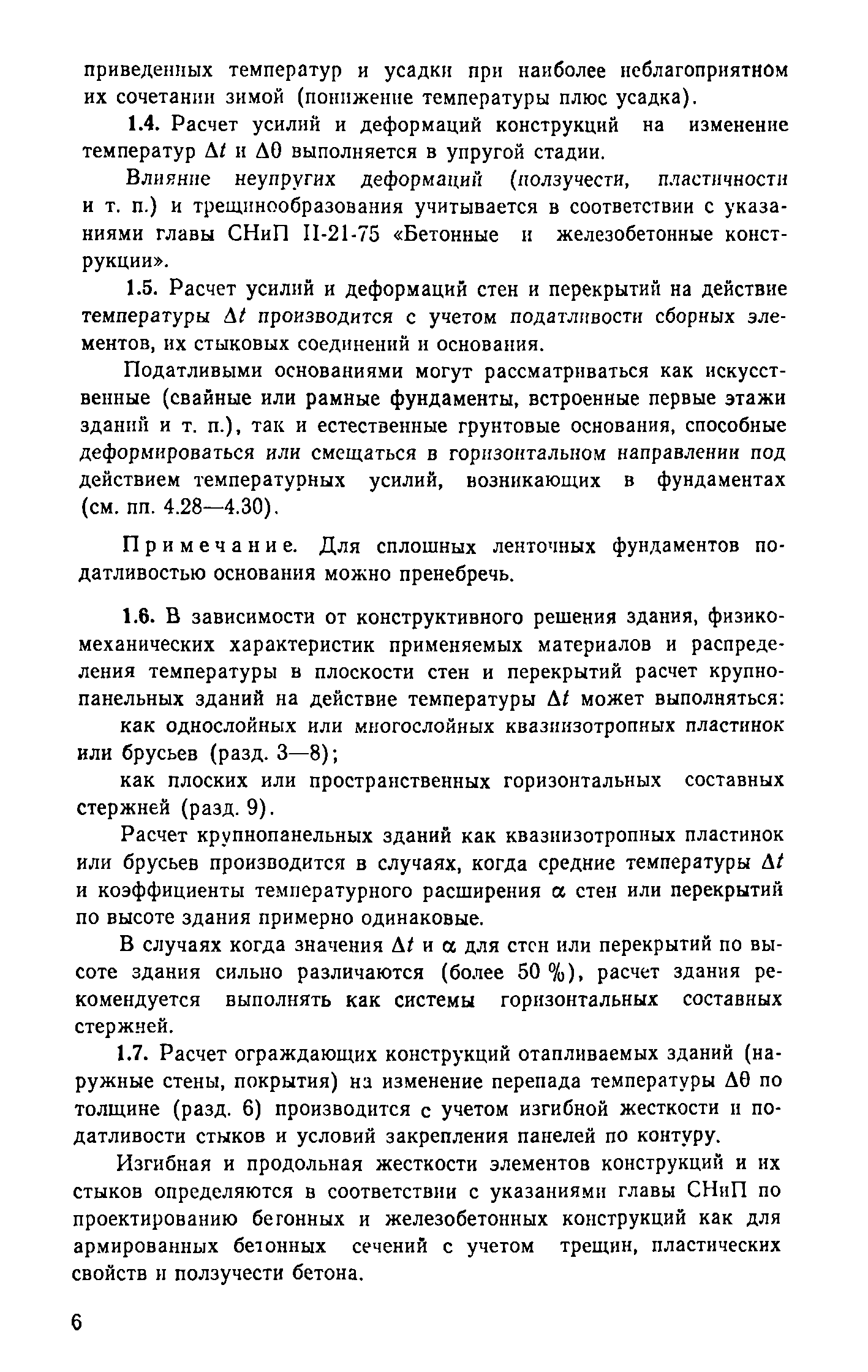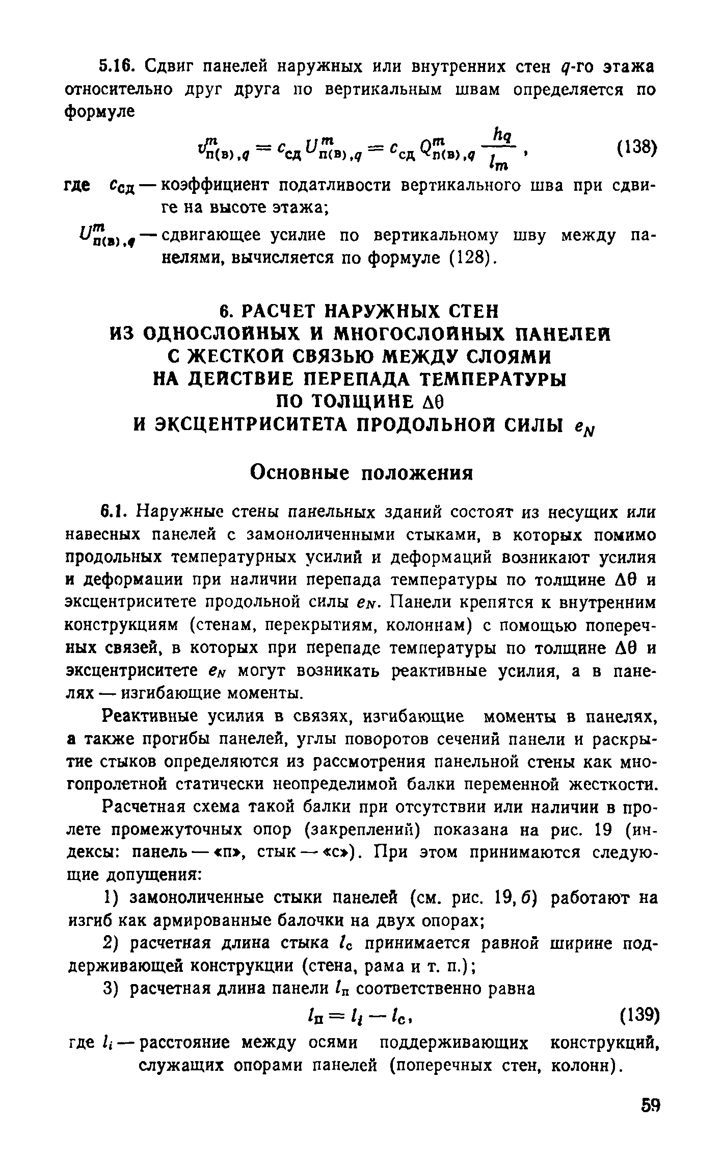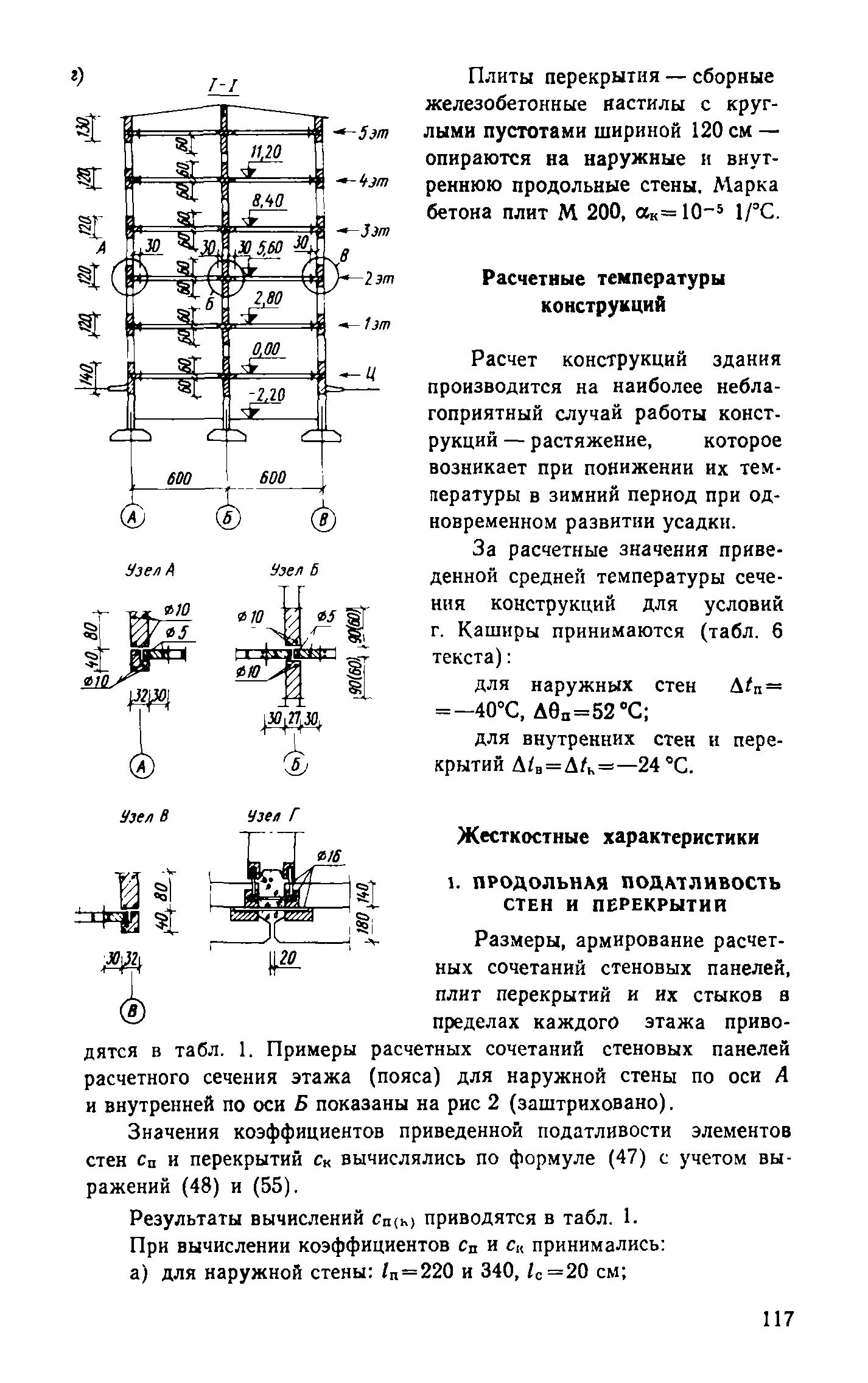 | Оглавление: | Предисловие 1 Основные положения 2 Расчетные температуры однослойных и многослойных стен и перекрытий Приведенные средние температуры однослойных и многослойных конструкций Усадка Начальная температура Приближенные значения средних температур однослойных стен и средних температур бетонных слоев трехслойных панелей с гибкими связями 3 Расчетные схемы и методы расчета крупнопанельных зданий на действие температуры 4 Жесткостные характеристики сборных конструкций Продольная жесткость (податливость) составных стержней Изгибная жесткость Сдвиговая жесткость Приведенная высота этажа и здания 5 Расчет стен и перекрытий крупнопанельных зданий как квазнизотропных пластинок на действие средней температуры Расчетные значения коэффициентов температурных усилий и перемещений Температурные усилия в стенах и перекрытиях Влияние отверстий и проемов Горизонтальные и вертикальные перемещения стен и перекрытий 6 Расчет наружных стен из однослойных и многослойных панелей с жесткой связью между слоями на действие перепада температуры по толщине и эксцентриситета продольной силы Основные положения Усилия, прогибы и углы поворота панелей и стыков 7 Расчет трехслойных панелей с гибкими связями на температурные воздействия с учетом упругой работы герметиков 8 Напряжения в арматуре панелей и связях стыков, раскрытие трещин в панелях и вертикальных стыках при совместном действии продольных сил и изгибающих моментов Напряжения в арматуре панелей и связях стыков Раскрытие трещин в бетоне панелей Раскрытие вертикальных стыков панелей 9 Расчет крупнопанельных зданий как плоских или пространственных составных стержней Выбор расчетной схемы. Обозначения Жесткостные характеристики составных стержней Дифференциальные уравнения для горизонтального составного стержня и их решение Приложение 1 Пример расчета на действие температуры крупнопанельного жилого дома I типа с поперечными несущими стенами Приложение 2 Пример расчета на действие температуры крупнопанельного жилого дома II типа с продольными несущими стенами Приложение 3 Пример расчета на действие температуры крупнопанельного жилого дома с поперечными несущими стенами (здание I типа) методом горизонтальных составных стержней Приложение 4 Устройство температурных швов |