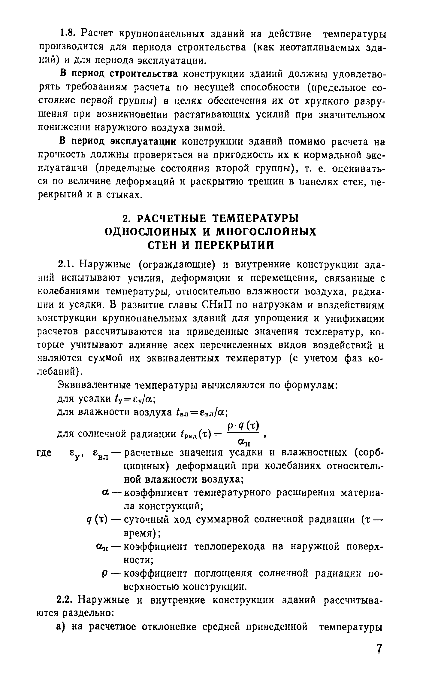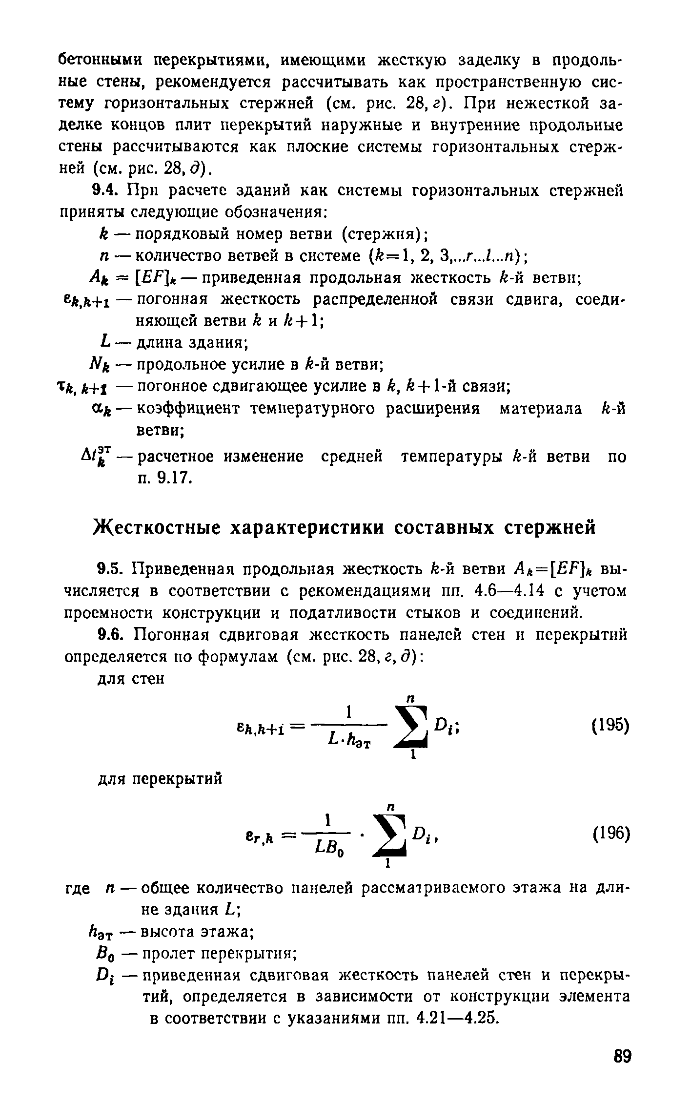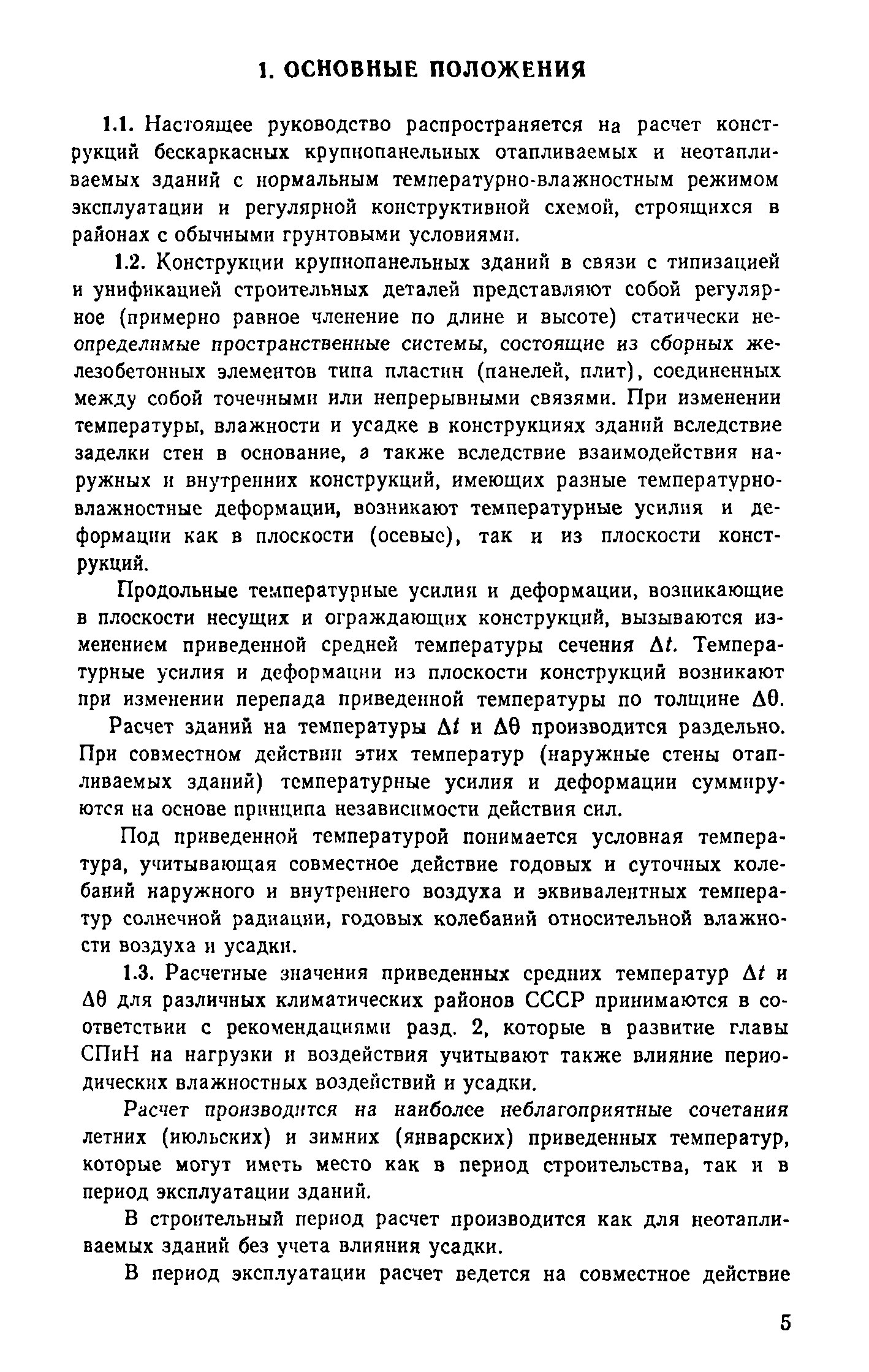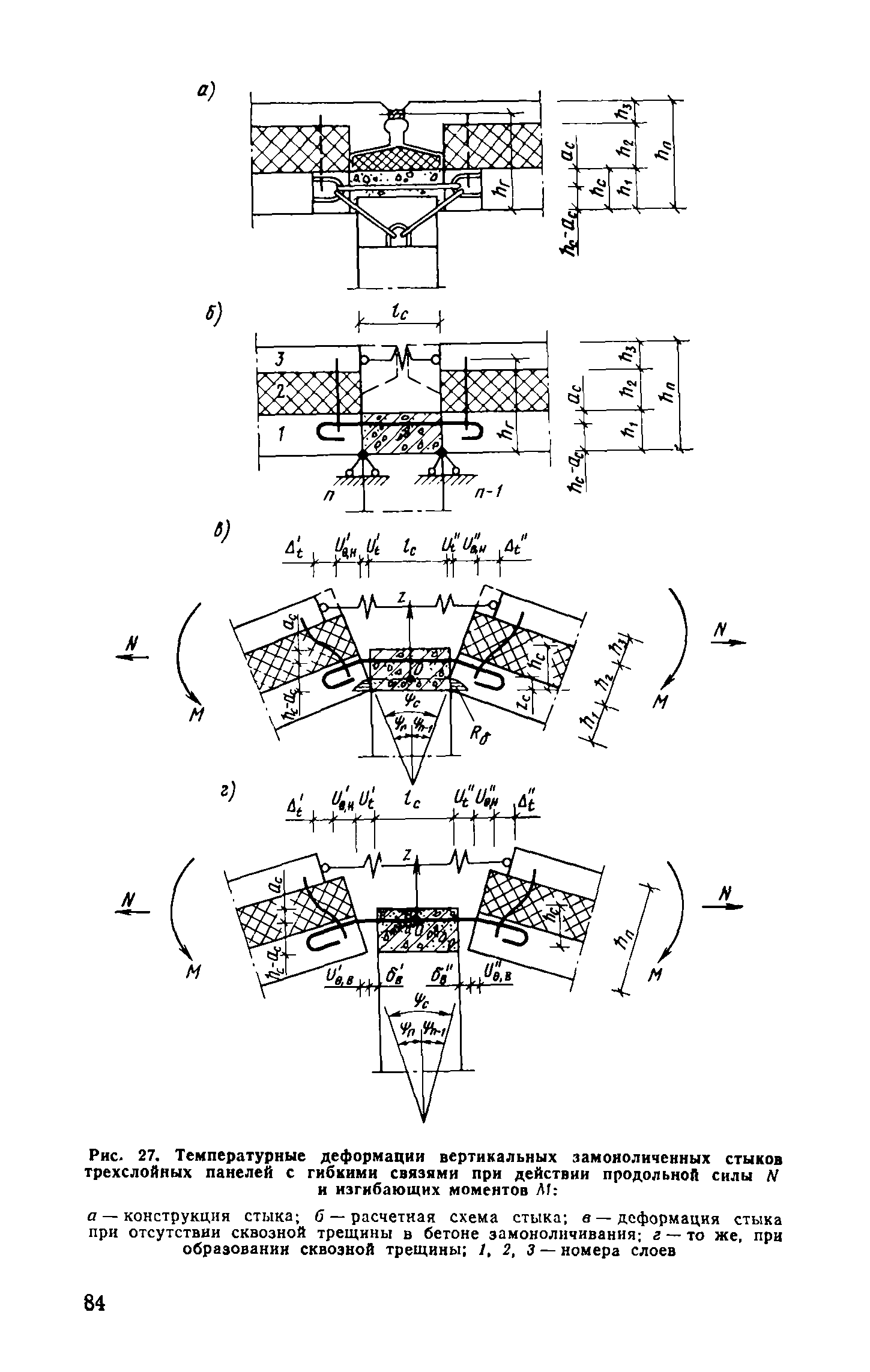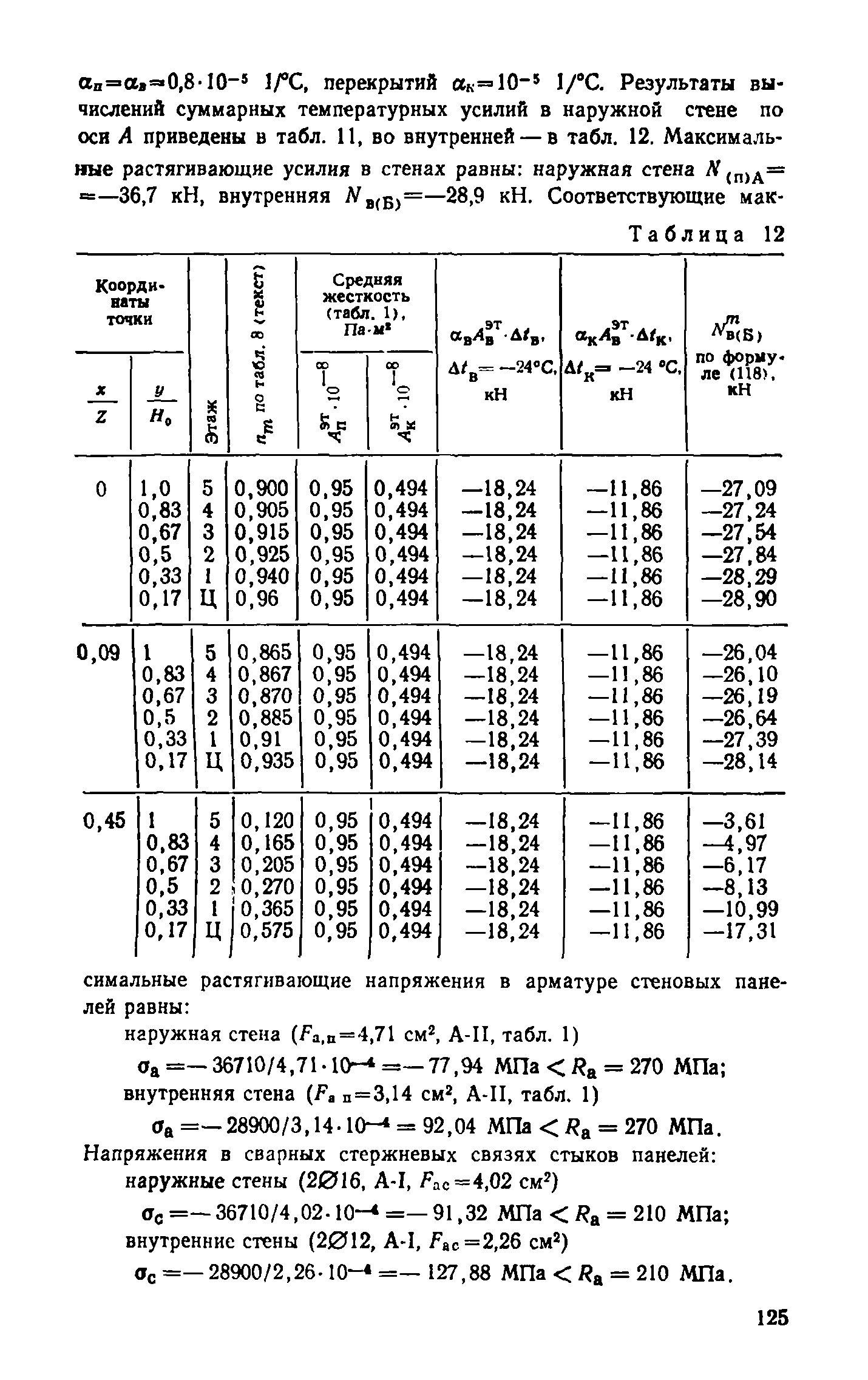 | Оглавление: | Предисловие 1 Основные положения 2 Расчетные температуры однослойных и многослойных стен и перекрытий Приведенные средние температуры однослойных и многослойных конструкций Усадка Начальная температура Приближенные значения средних температур однослойных стен и средних температур бетонных слоев трехслойных панелей с гибкими связями 3 Расчетные схемы и методы расчета крупнопанельных зданий на действие температуры 4 Жесткостные характеристики сборных конструкций Продольная жесткость (податливость) составных стержней Изгибная жесткость Сдвиговая жесткость Приведенная высота этажа и здания 5 Расчет стен и перекрытий крупнопанельных зданий как квазнизотропных пластинок на действие средней температуры Расчетные значения коэффициентов температурных усилий и перемещений Температурные усилия в стенах и перекрытиях Влияние отверстий и проемов Горизонтальные и вертикальные перемещения стен и перекрытий 6 Расчет наружных стен из однослойных и многослойных панелей с жесткой связью между слоями на действие перепада температуры по толщине и эксцентриситета продольной силы Основные положения Усилия, прогибы и углы поворота панелей и стыков 7 Расчет трехслойных панелей с гибкими связями на температурные воздействия с учетом упругой работы герметиков 8 Напряжения в арматуре панелей и связях стыков, раскрытие трещин в панелях и вертикальных стыках при совместном действии продольных сил и изгибающих моментов Напряжения в арматуре панелей и связях стыков Раскрытие трещин в бетоне панелей Раскрытие вертикальных стыков панелей 9 Расчет крупнопанельных зданий как плоских или пространственных составных стержней Выбор расчетной схемы. Обозначения Жесткостные характеристики составных стержней Дифференциальные уравнения для горизонтального составного стержня и их решение Приложение 1 Пример расчета на действие температуры крупнопанельного жилого дома I типа с поперечными несущими стенами Приложение 2 Пример расчета на действие температуры крупнопанельного жилого дома II типа с продольными несущими стенами Приложение 3 Пример расчета на действие температуры крупнопанельного жилого дома с поперечными несущими стенами (здание I типа) методом горизонтальных составных стержней Приложение 4 Устройство температурных швов |