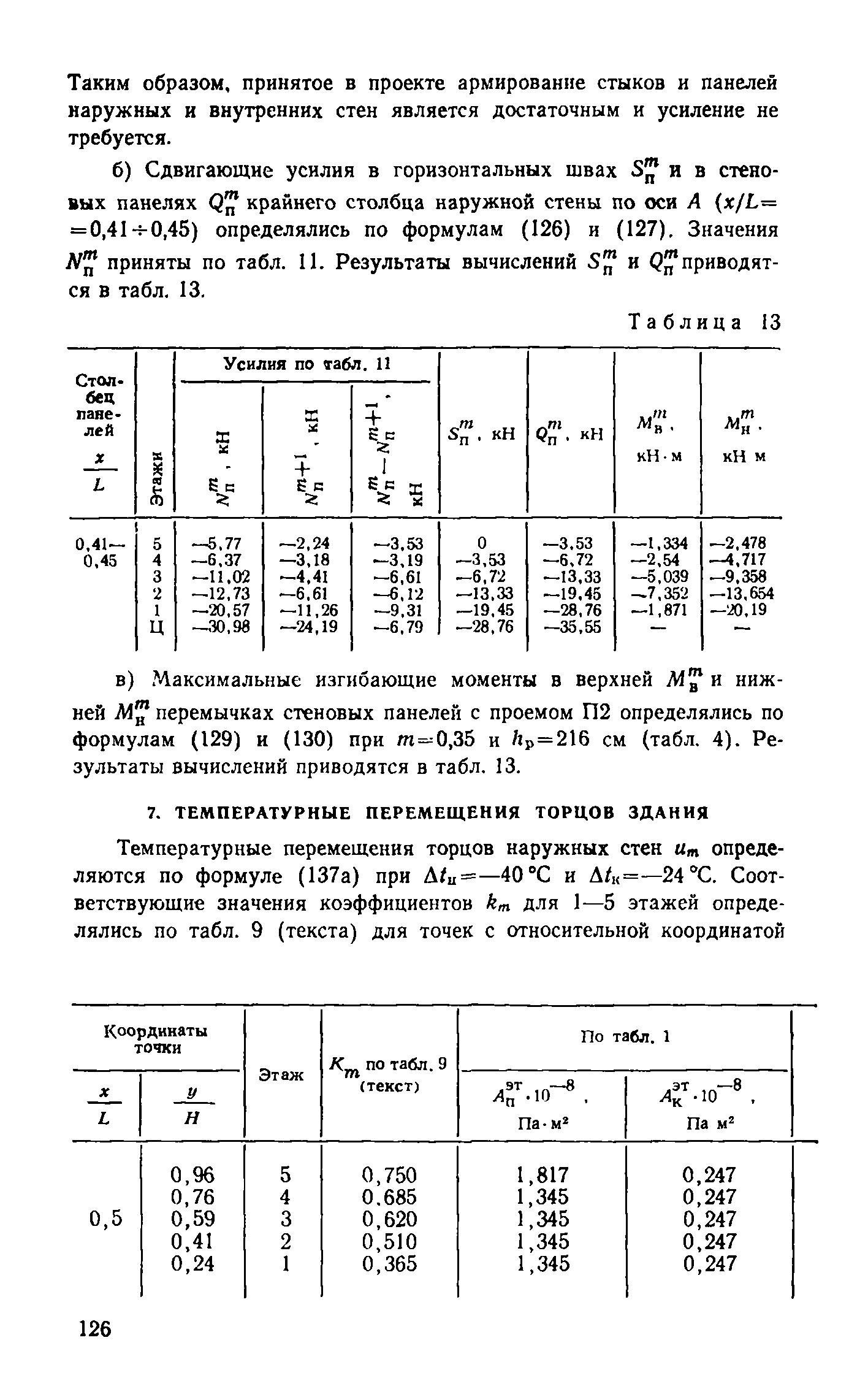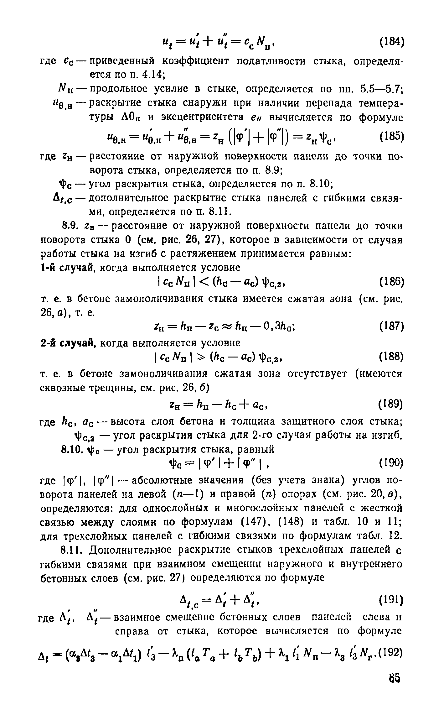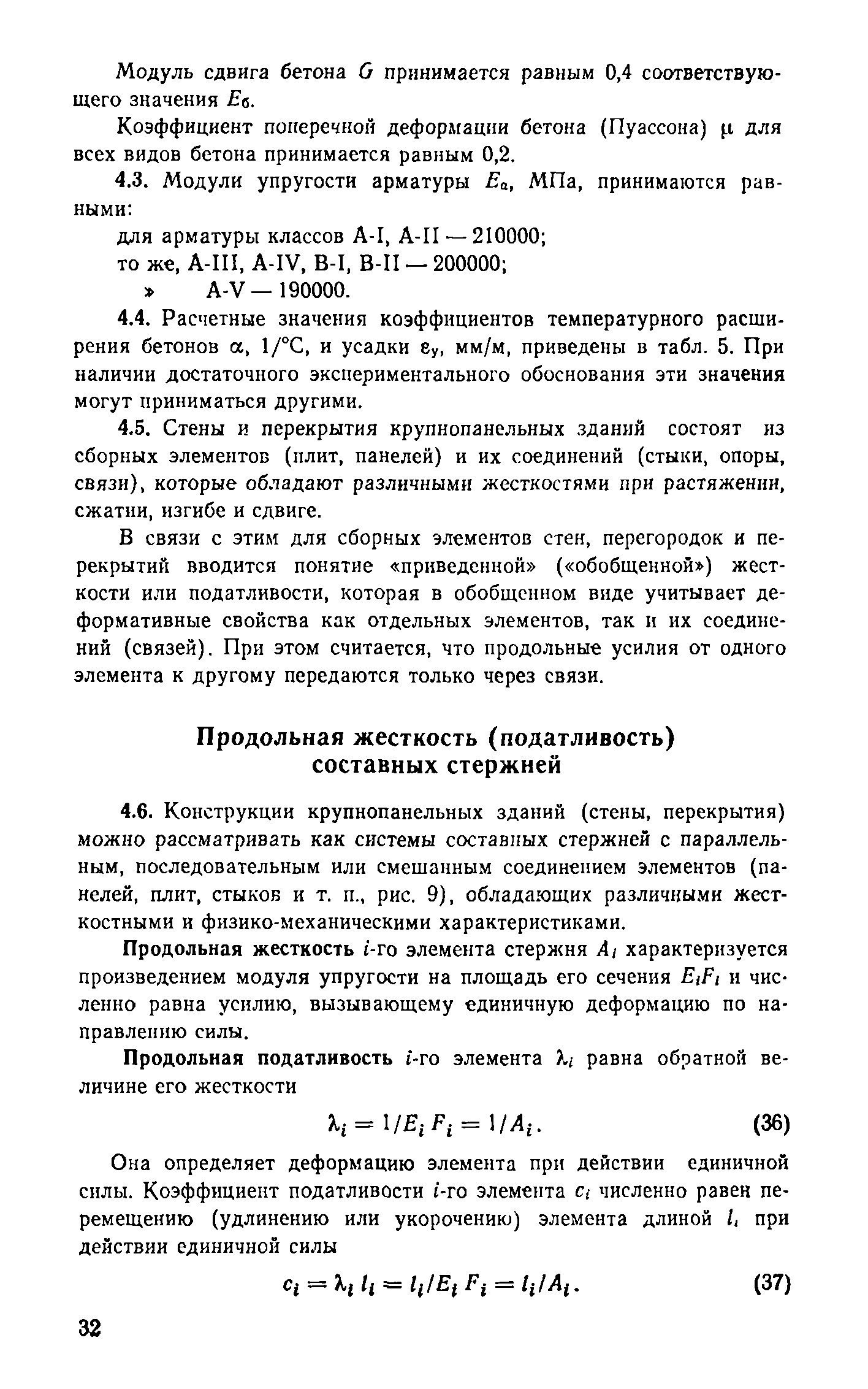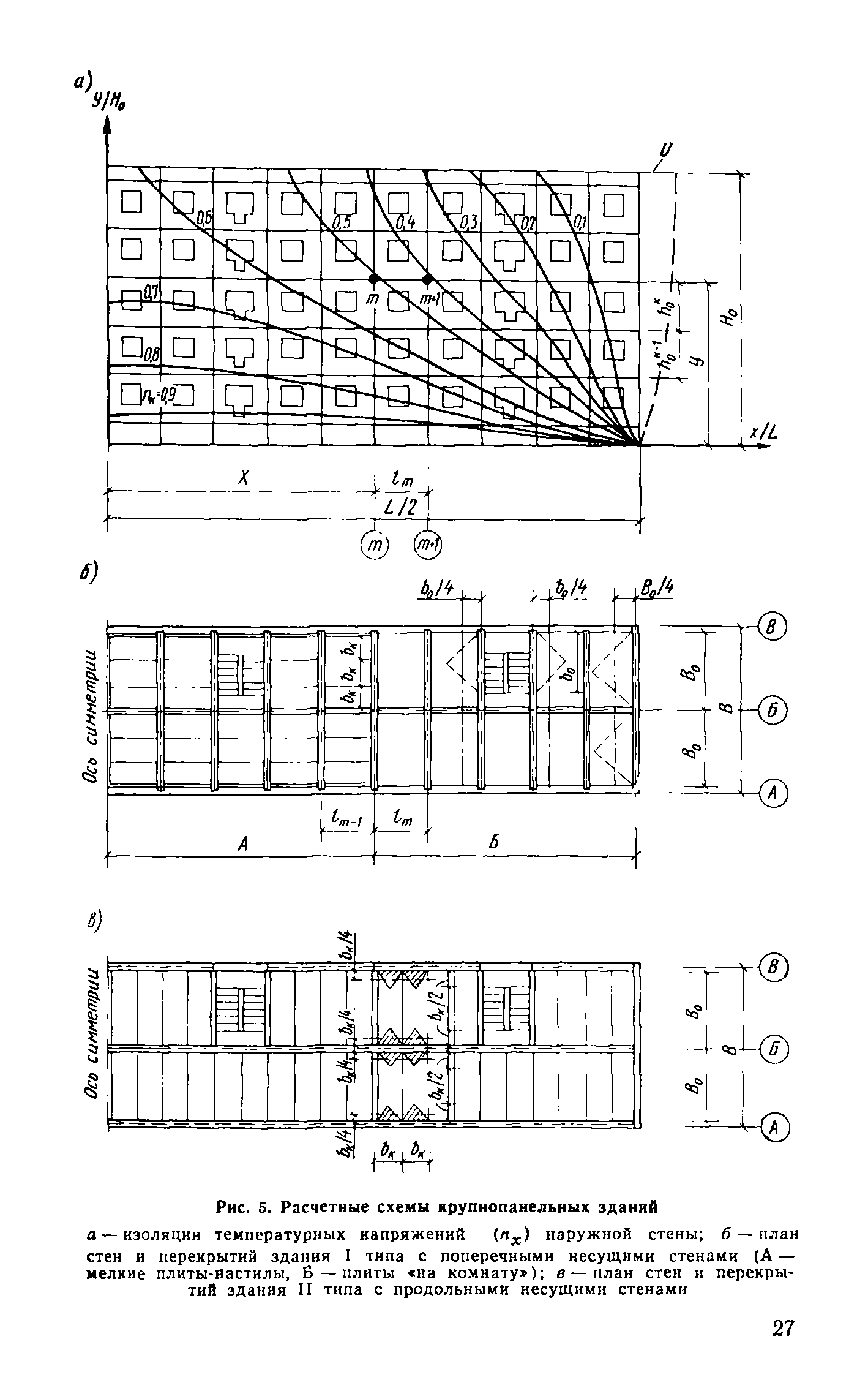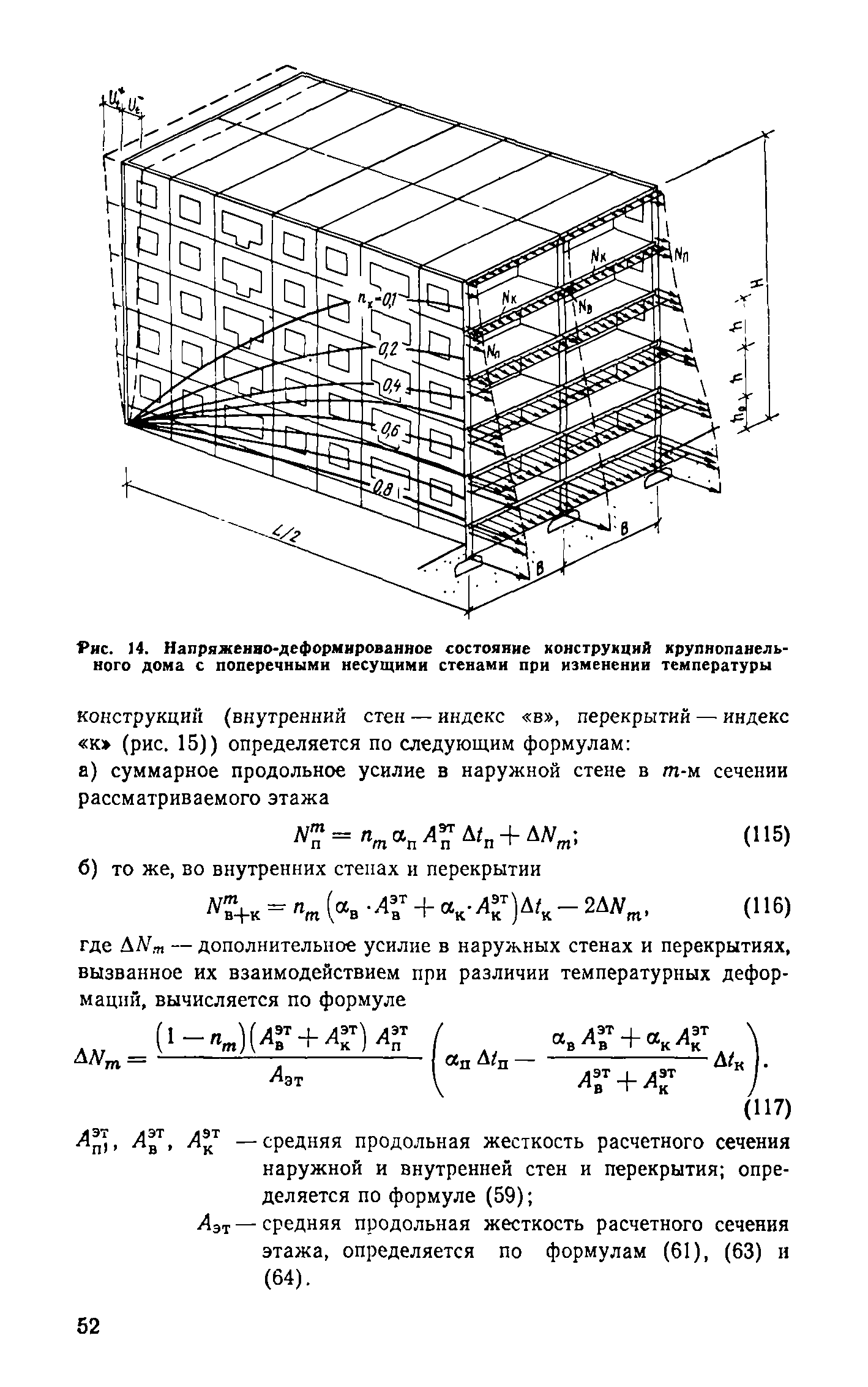| Оглавление: | Предисловие 1 Основные положения 2 Расчетные температуры однослойных и многослойных стен и перекрытий Приведенные средние температуры однослойных и многослойных конструкций Усадка Начальная температура Приближенные значения средних температур однослойных стен и средних температур бетонных слоев трехслойных панелей с гибкими связями 3 Расчетные схемы и методы расчета крупнопанельных зданий на действие температуры 4 Жесткостные характеристики сборных конструкций Продольная жесткость (податливость) составных стержней Изгибная жесткость Сдвиговая жесткость Приведенная высота этажа и здания 5 Расчет стен и перекрытий крупнопанельных зданий как квазнизотропных пластинок на действие средней температуры Расчетные значения коэффициентов температурных усилий и перемещений Температурные усилия в стенах и перекрытиях Влияние отверстий и проемов Горизонтальные и вертикальные перемещения стен и перекрытий 6 Расчет наружных стен из однослойных и многослойных панелей с жесткой связью между слоями на действие перепада температуры по толщине и эксцентриситета продольной силы Основные положения Усилия, прогибы и углы поворота панелей и стыков 7 Расчет трехслойных панелей с гибкими связями на температурные воздействия с учетом упругой работы герметиков 8 Напряжения в арматуре панелей и связях стыков, раскрытие трещин в панелях и вертикальных стыках при совместном действии продольных сил и изгибающих моментов Напряжения в арматуре панелей и связях стыков Раскрытие трещин в бетоне панелей Раскрытие вертикальных стыков панелей 9 Расчет крупнопанельных зданий как плоских или пространственных составных стержней Выбор расчетной схемы. Обозначения Жесткостные характеристики составных стержней Дифференциальные уравнения для горизонтального составного стержня и их решение Приложение 1 Пример расчета на действие температуры крупнопанельного жилого дома I типа с поперечными несущими стенами Приложение 2 Пример расчета на действие температуры крупнопанельного жилого дома II типа с продольными несущими стенами Приложение 3 Пример расчета на действие температуры крупнопанельного жилого дома с поперечными несущими стенами (здание I типа) методом горизонтальных составных стержней Приложение 4 Устройство температурных швов |