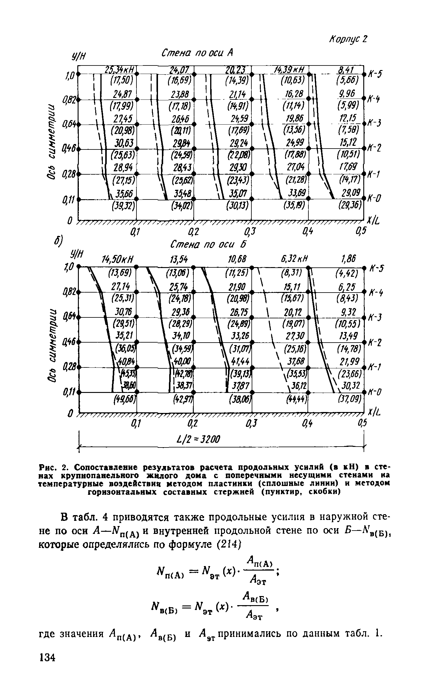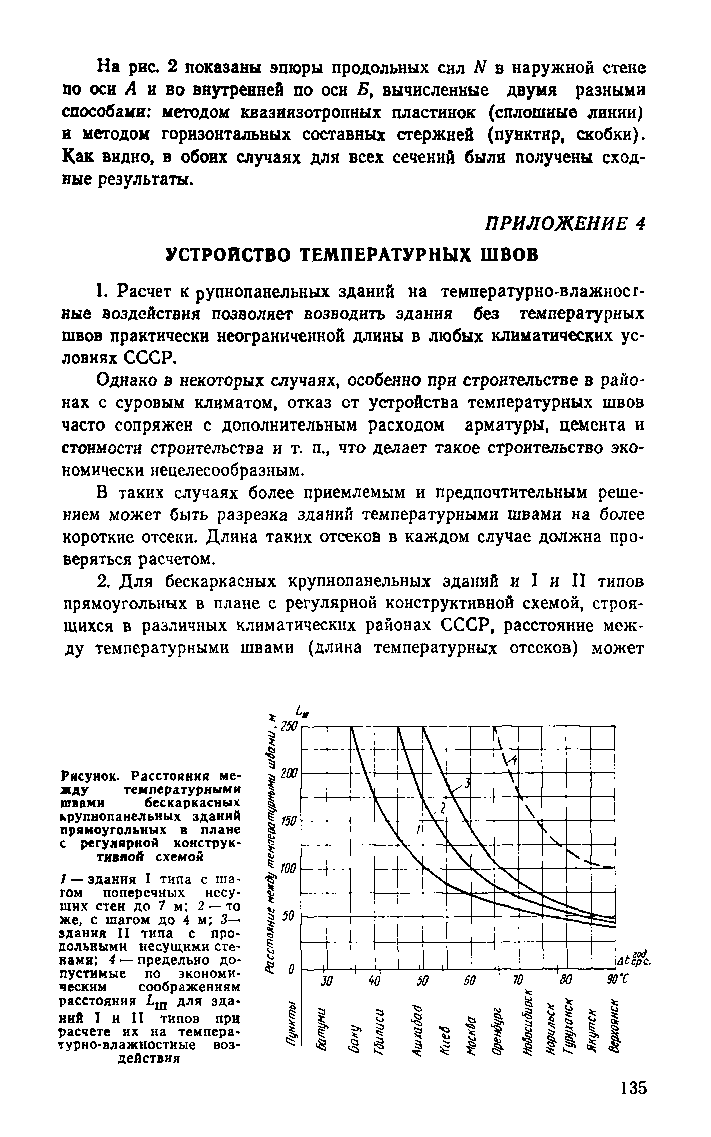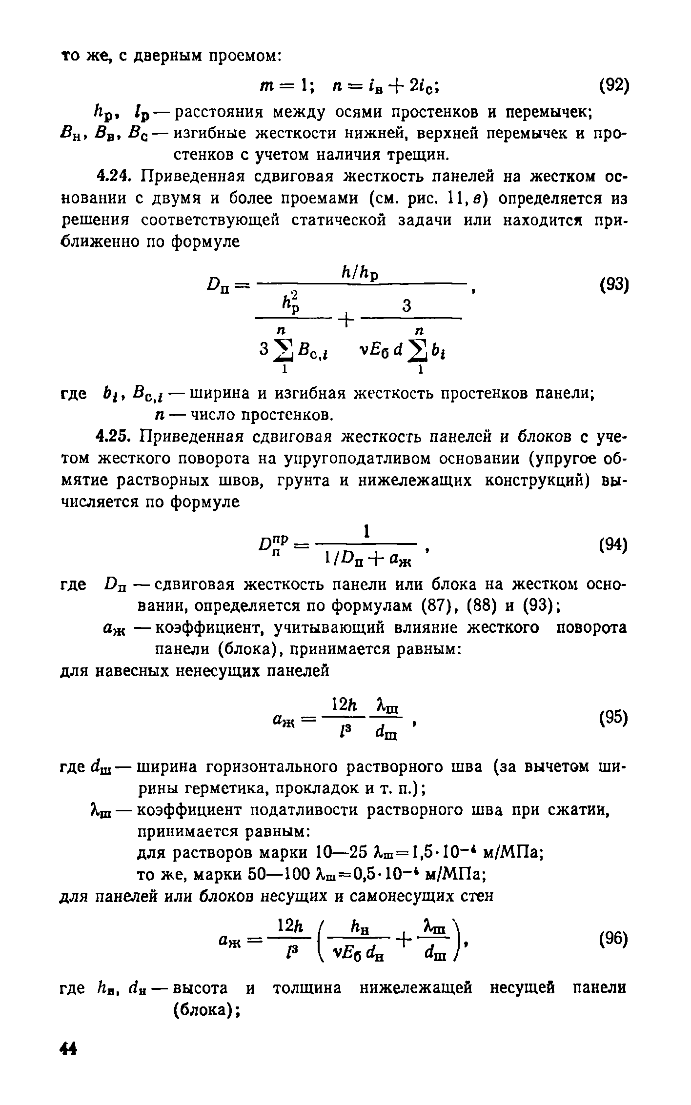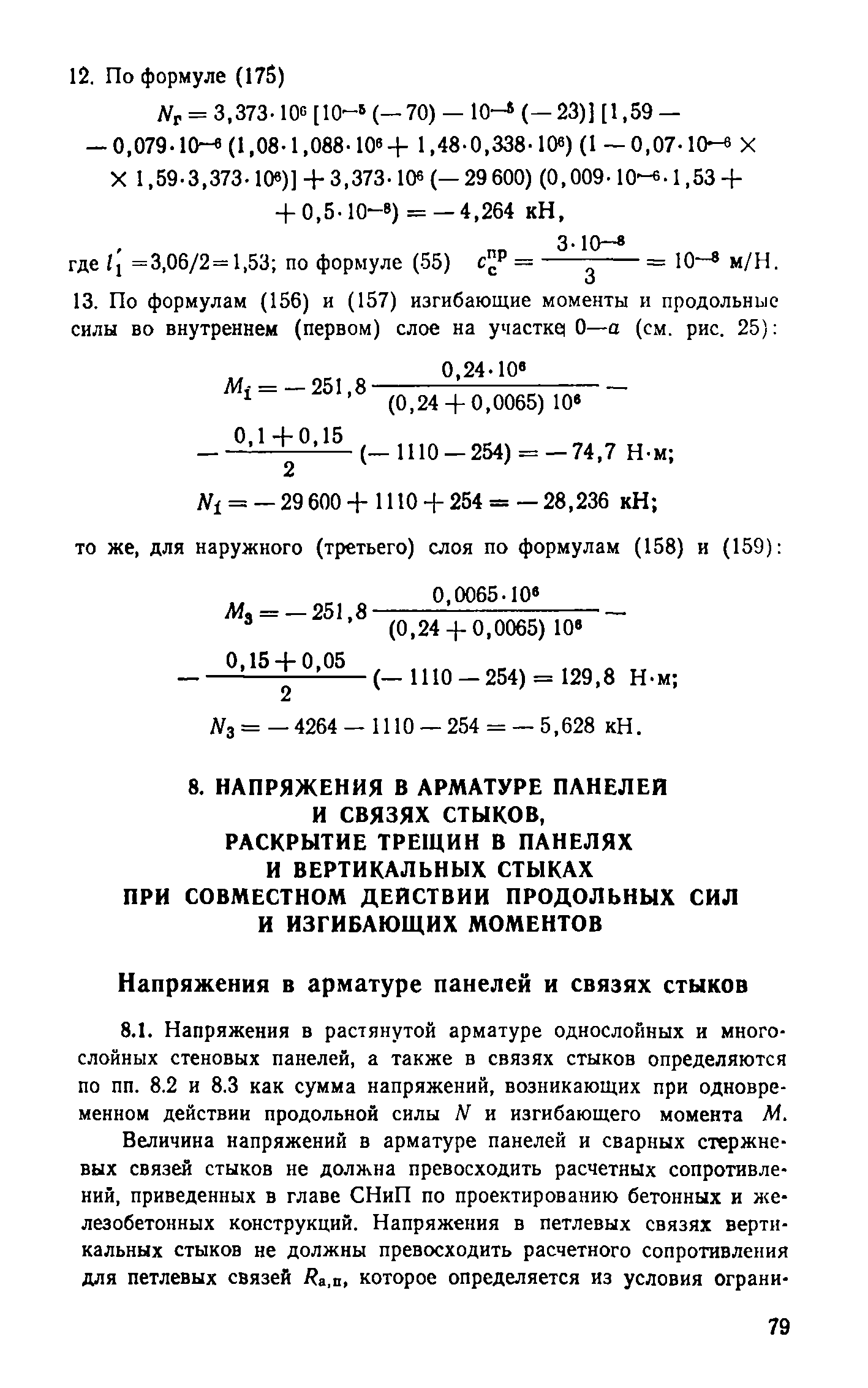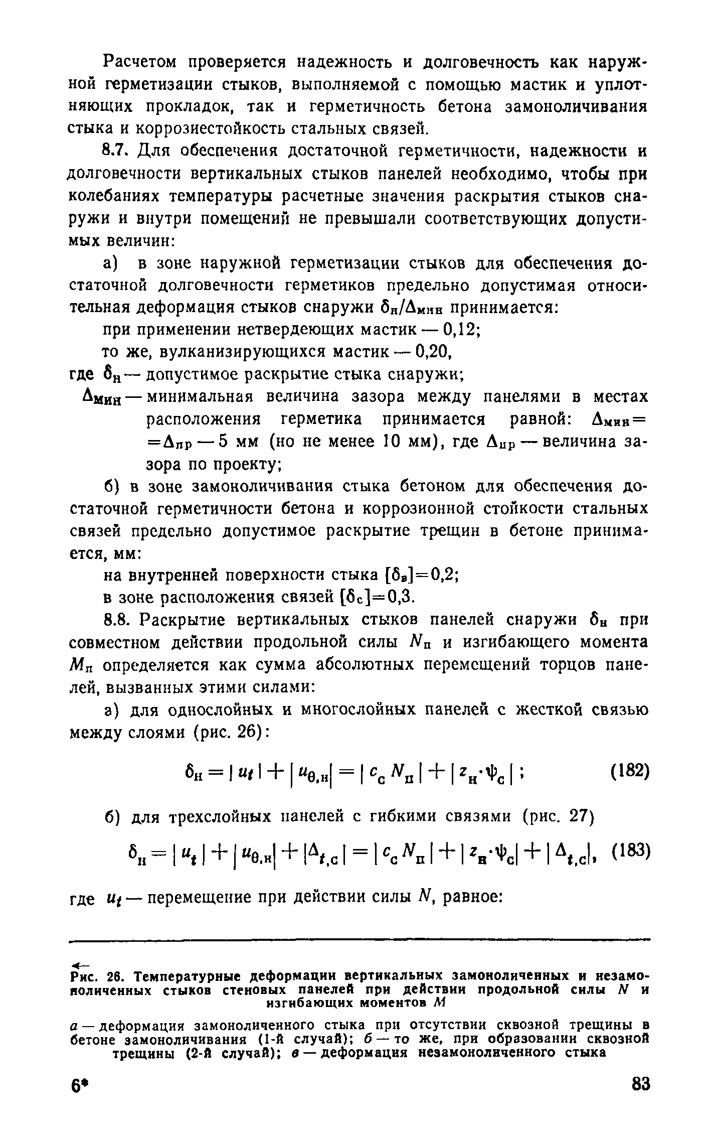 | Оглавление: | Предисловие 1 Основные положения 2 Расчетные температуры однослойных и многослойных стен и перекрытий Приведенные средние температуры однослойных и многослойных конструкций Усадка Начальная температура Приближенные значения средних температур однослойных стен и средних температур бетонных слоев трехслойных панелей с гибкими связями 3 Расчетные схемы и методы расчета крупнопанельных зданий на действие температуры 4 Жесткостные характеристики сборных конструкций Продольная жесткость (податливость) составных стержней Изгибная жесткость Сдвиговая жесткость Приведенная высота этажа и здания 5 Расчет стен и перекрытий крупнопанельных зданий как квазнизотропных пластинок на действие средней температуры Расчетные значения коэффициентов температурных усилий и перемещений Температурные усилия в стенах и перекрытиях Влияние отверстий и проемов Горизонтальные и вертикальные перемещения стен и перекрытий 6 Расчет наружных стен из однослойных и многослойных панелей с жесткой связью между слоями на действие перепада температуры по толщине и эксцентриситета продольной силы Основные положения Усилия, прогибы и углы поворота панелей и стыков 7 Расчет трехслойных панелей с гибкими связями на температурные воздействия с учетом упругой работы герметиков 8 Напряжения в арматуре панелей и связях стыков, раскрытие трещин в панелях и вертикальных стыках при совместном действии продольных сил и изгибающих моментов Напряжения в арматуре панелей и связях стыков Раскрытие трещин в бетоне панелей Раскрытие вертикальных стыков панелей 9 Расчет крупнопанельных зданий как плоских или пространственных составных стержней Выбор расчетной схемы. Обозначения Жесткостные характеристики составных стержней Дифференциальные уравнения для горизонтального составного стержня и их решение Приложение 1 Пример расчета на действие температуры крупнопанельного жилого дома I типа с поперечными несущими стенами Приложение 2 Пример расчета на действие температуры крупнопанельного жилого дома II типа с продольными несущими стенами Приложение 3 Пример расчета на действие температуры крупнопанельного жилого дома с поперечными несущими стенами (здание I типа) методом горизонтальных составных стержней Приложение 4 Устройство температурных швов |