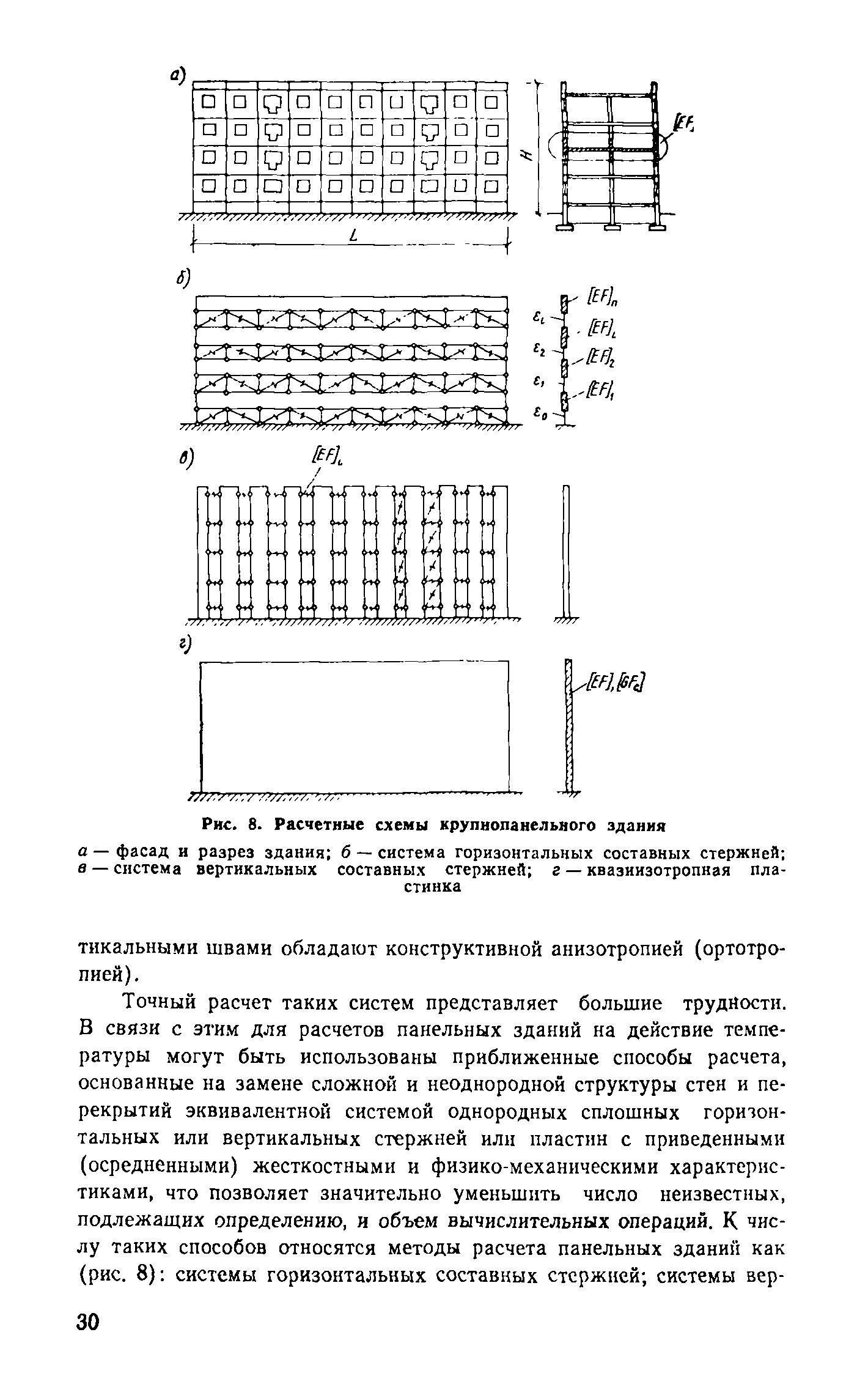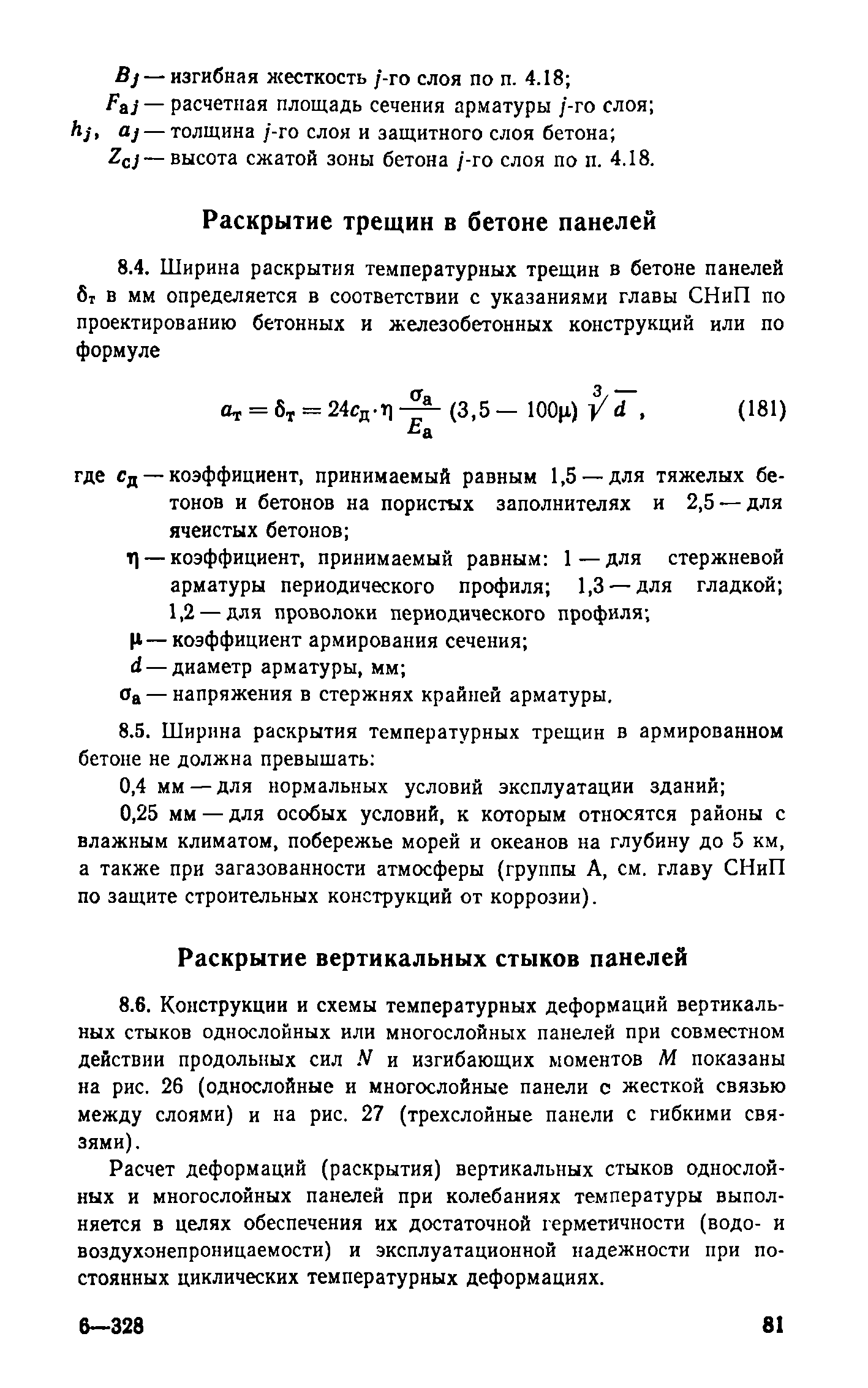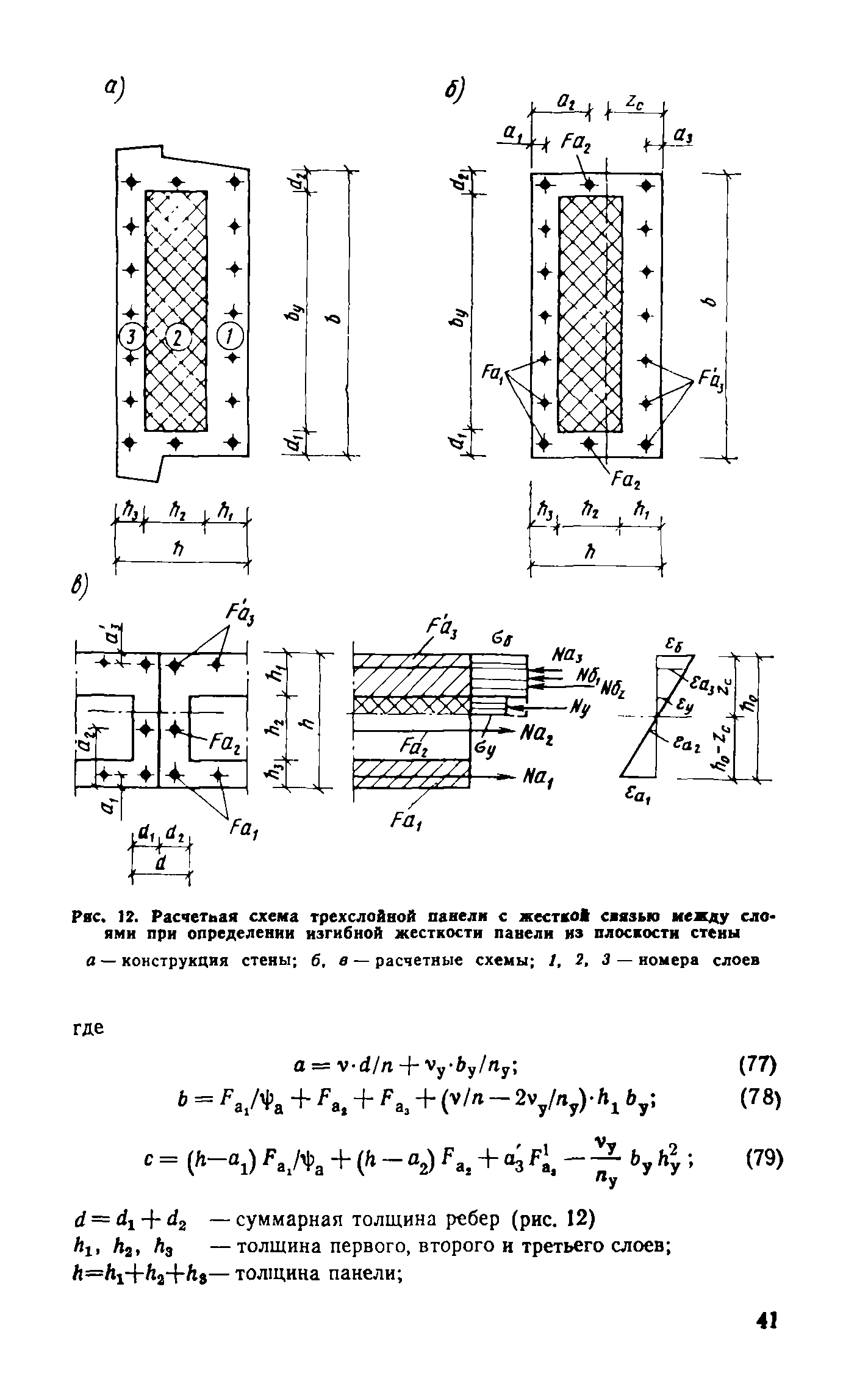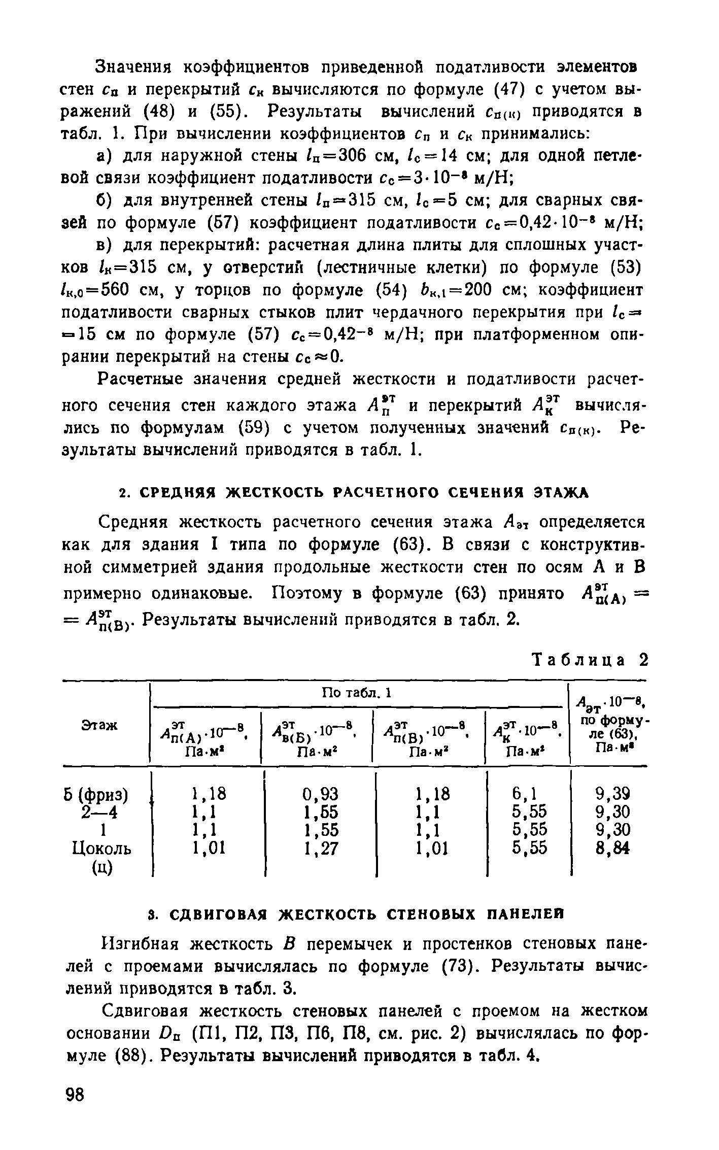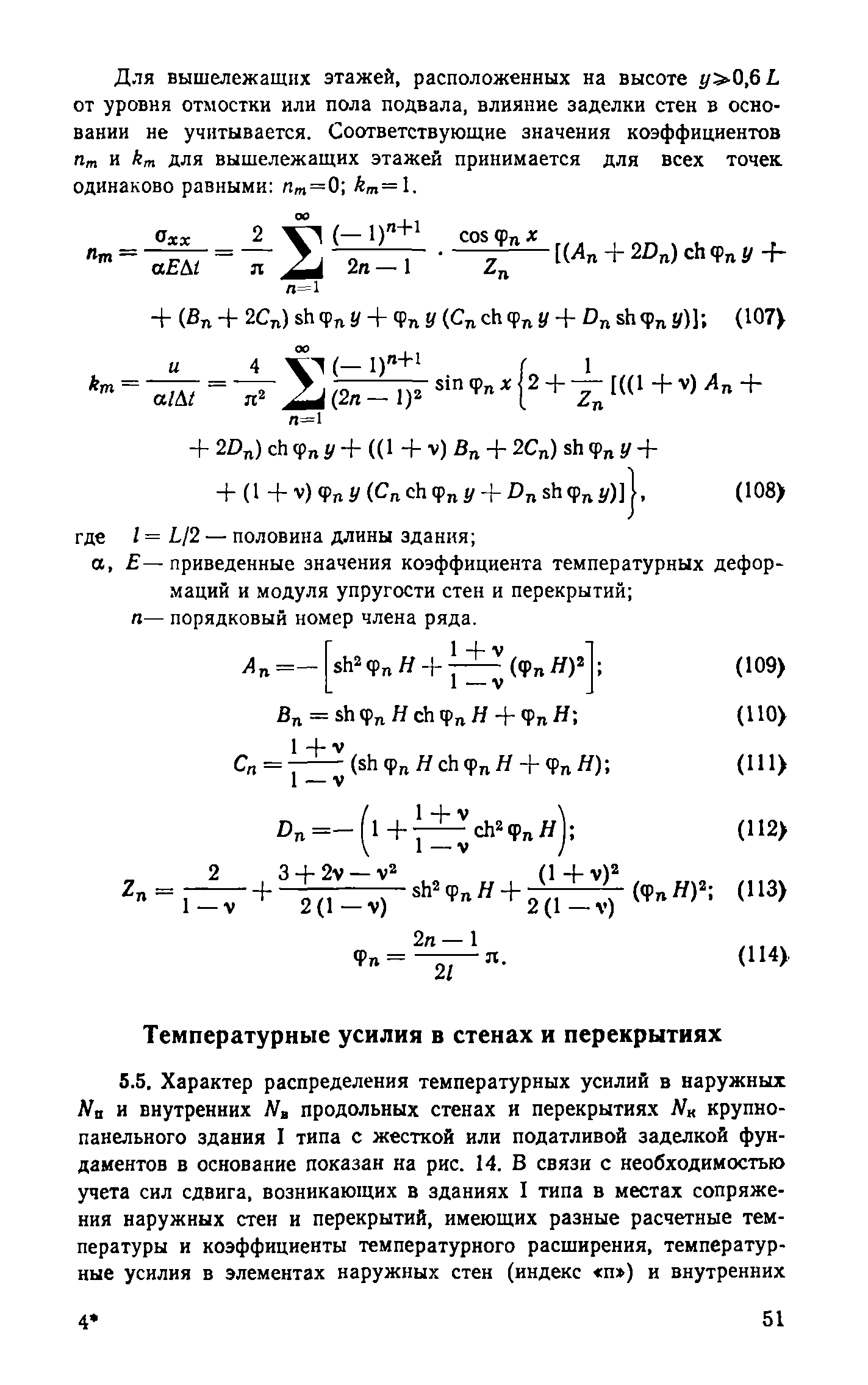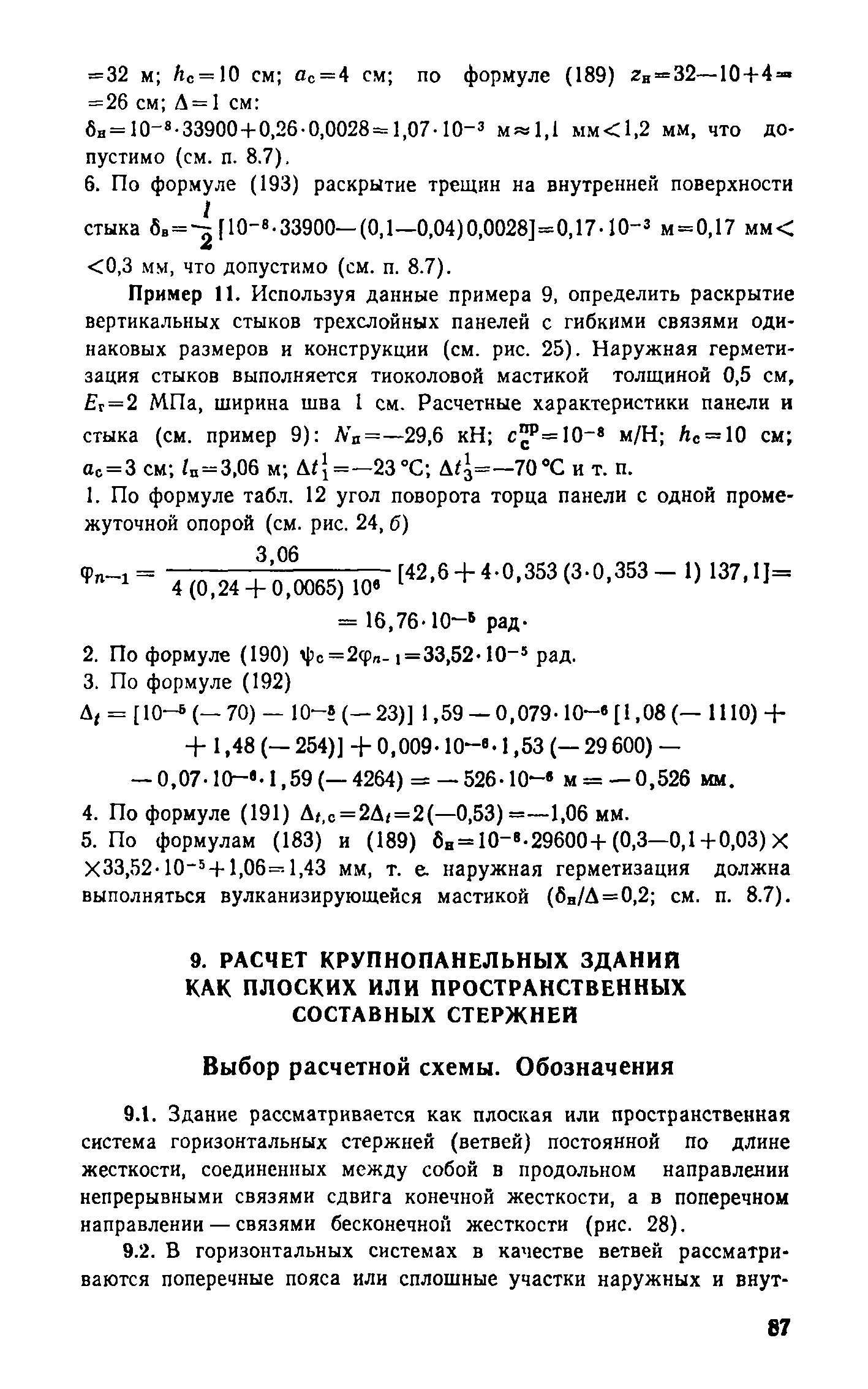 | Оглавление: | Предисловие 1 Основные положения 2 Расчетные температуры однослойных и многослойных стен и перекрытий Приведенные средние температуры однослойных и многослойных конструкций Усадка Начальная температура Приближенные значения средних температур однослойных стен и средних температур бетонных слоев трехслойных панелей с гибкими связями 3 Расчетные схемы и методы расчета крупнопанельных зданий на действие температуры 4 Жесткостные характеристики сборных конструкций Продольная жесткость (податливость) составных стержней Изгибная жесткость Сдвиговая жесткость Приведенная высота этажа и здания 5 Расчет стен и перекрытий крупнопанельных зданий как квазнизотропных пластинок на действие средней температуры Расчетные значения коэффициентов температурных усилий и перемещений Температурные усилия в стенах и перекрытиях Влияние отверстий и проемов Горизонтальные и вертикальные перемещения стен и перекрытий 6 Расчет наружных стен из однослойных и многослойных панелей с жесткой связью между слоями на действие перепада температуры по толщине и эксцентриситета продольной силы Основные положения Усилия, прогибы и углы поворота панелей и стыков 7 Расчет трехслойных панелей с гибкими связями на температурные воздействия с учетом упругой работы герметиков 8 Напряжения в арматуре панелей и связях стыков, раскрытие трещин в панелях и вертикальных стыках при совместном действии продольных сил и изгибающих моментов Напряжения в арматуре панелей и связях стыков Раскрытие трещин в бетоне панелей Раскрытие вертикальных стыков панелей 9 Расчет крупнопанельных зданий как плоских или пространственных составных стержней Выбор расчетной схемы. Обозначения Жесткостные характеристики составных стержней Дифференциальные уравнения для горизонтального составного стержня и их решение Приложение 1 Пример расчета на действие температуры крупнопанельного жилого дома I типа с поперечными несущими стенами Приложение 2 Пример расчета на действие температуры крупнопанельного жилого дома II типа с продольными несущими стенами Приложение 3 Пример расчета на действие температуры крупнопанельного жилого дома с поперечными несущими стенами (здание I типа) методом горизонтальных составных стержней Приложение 4 Устройство температурных швов |