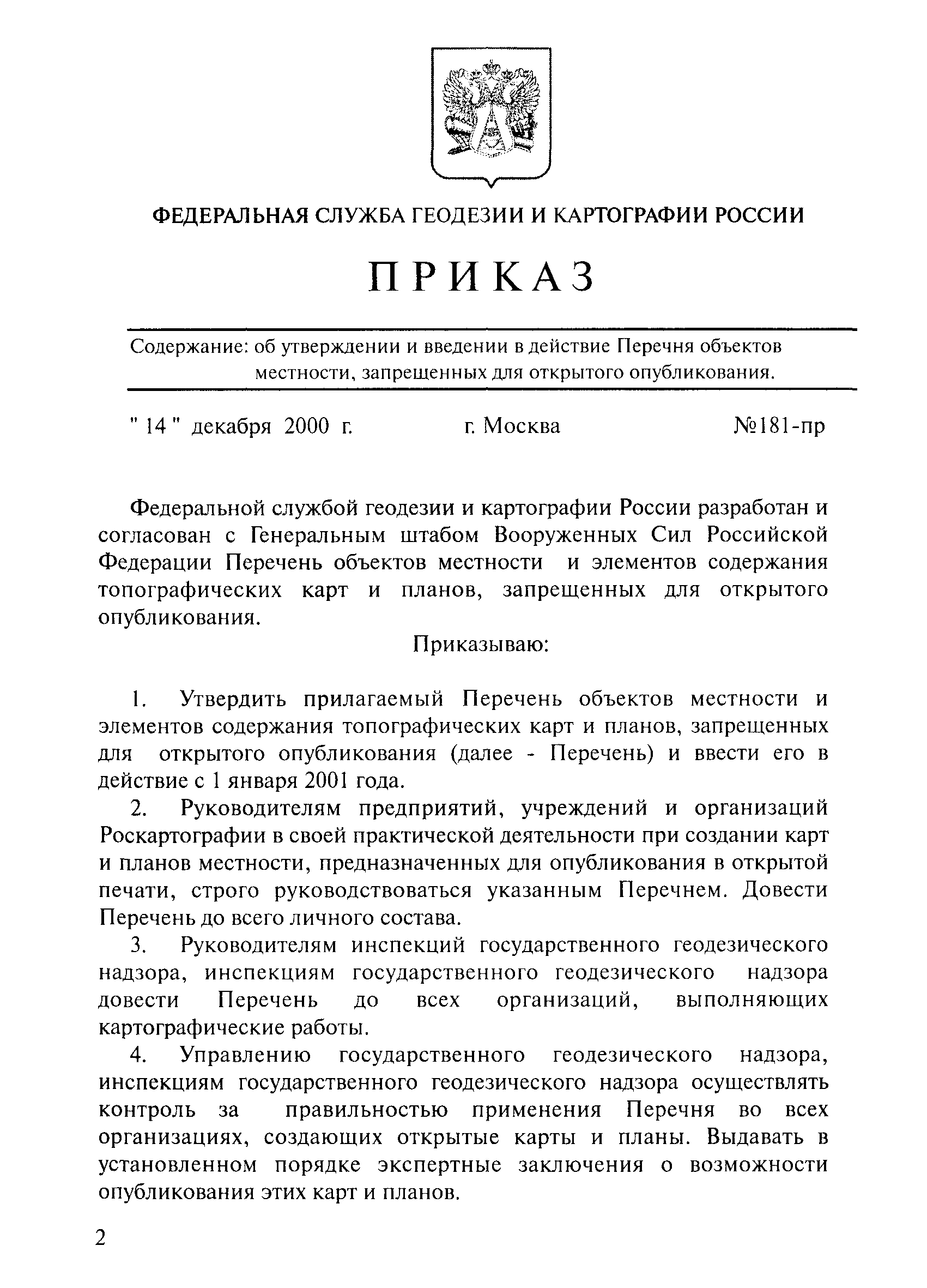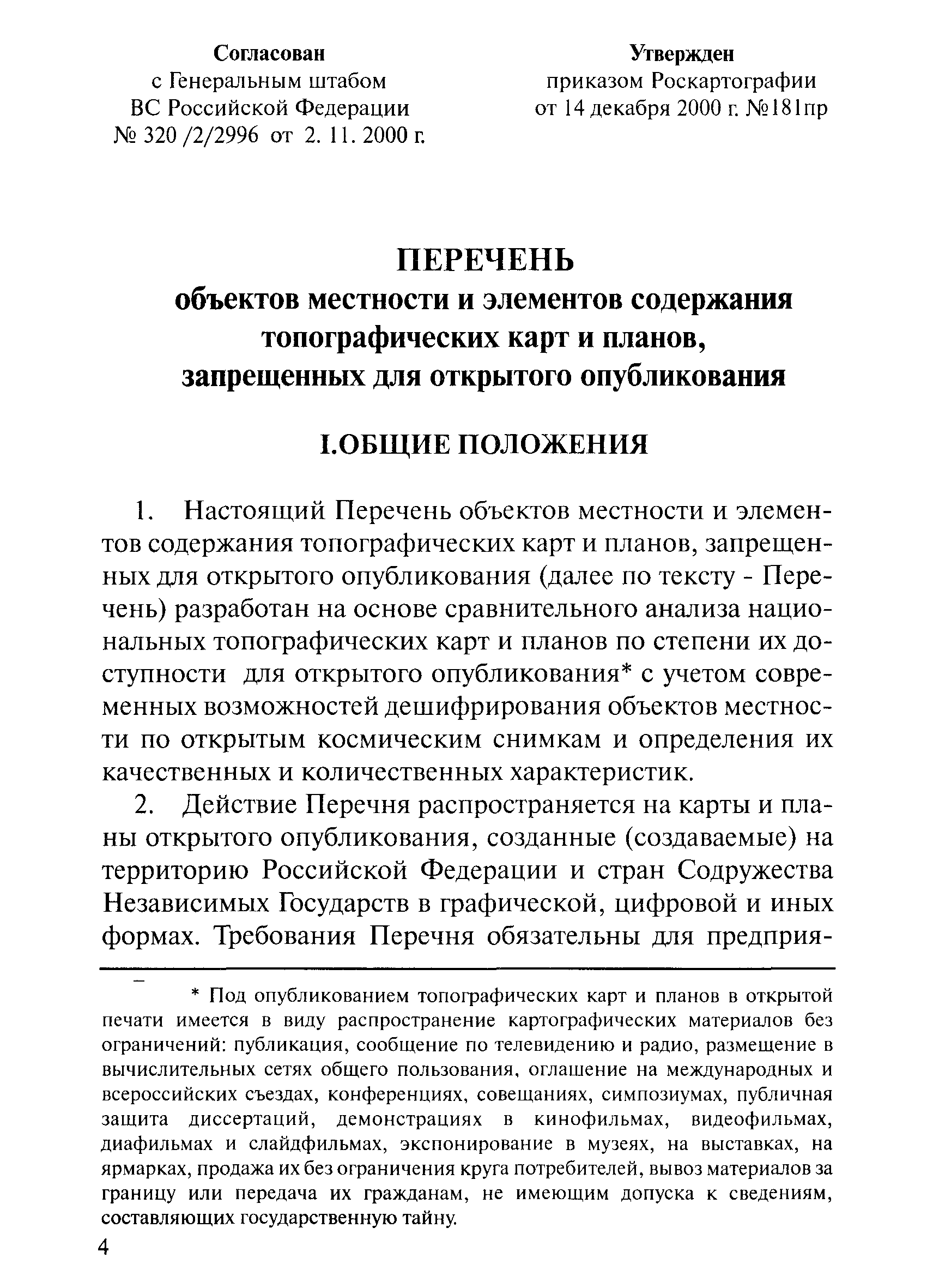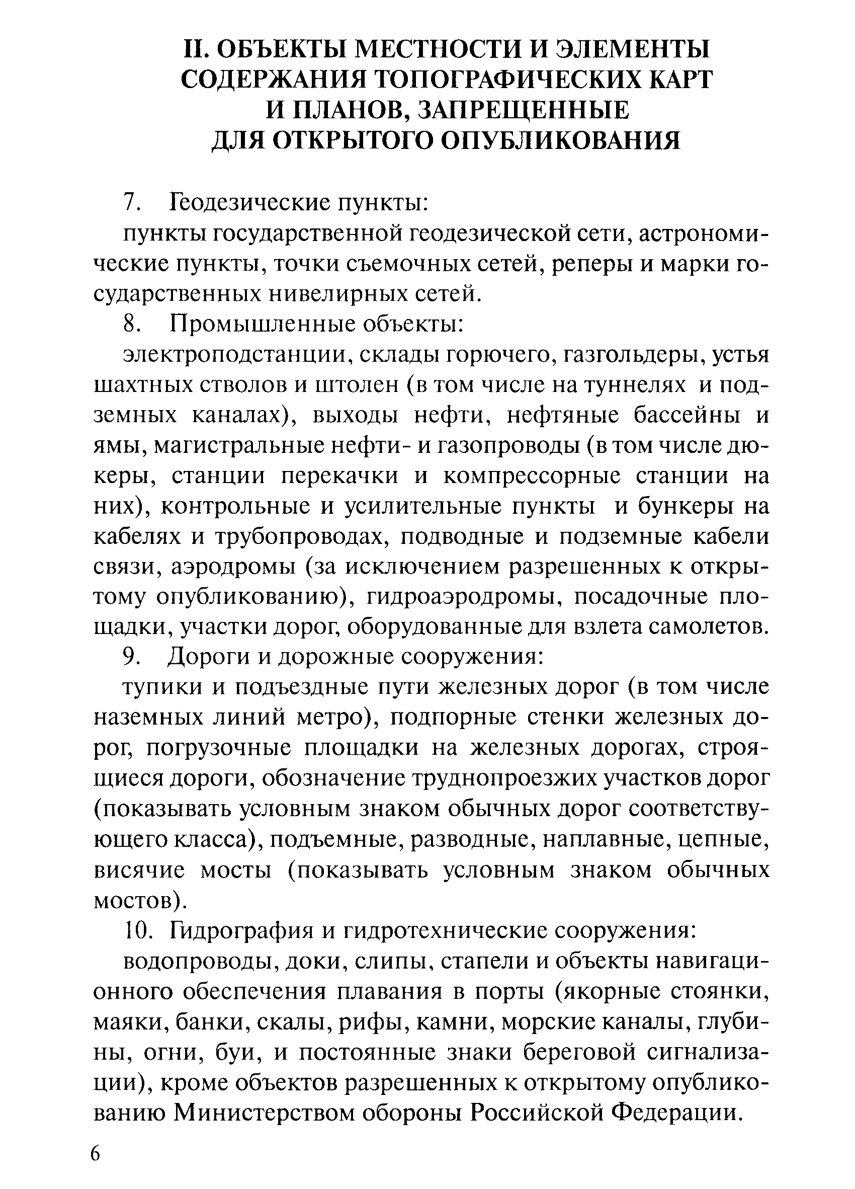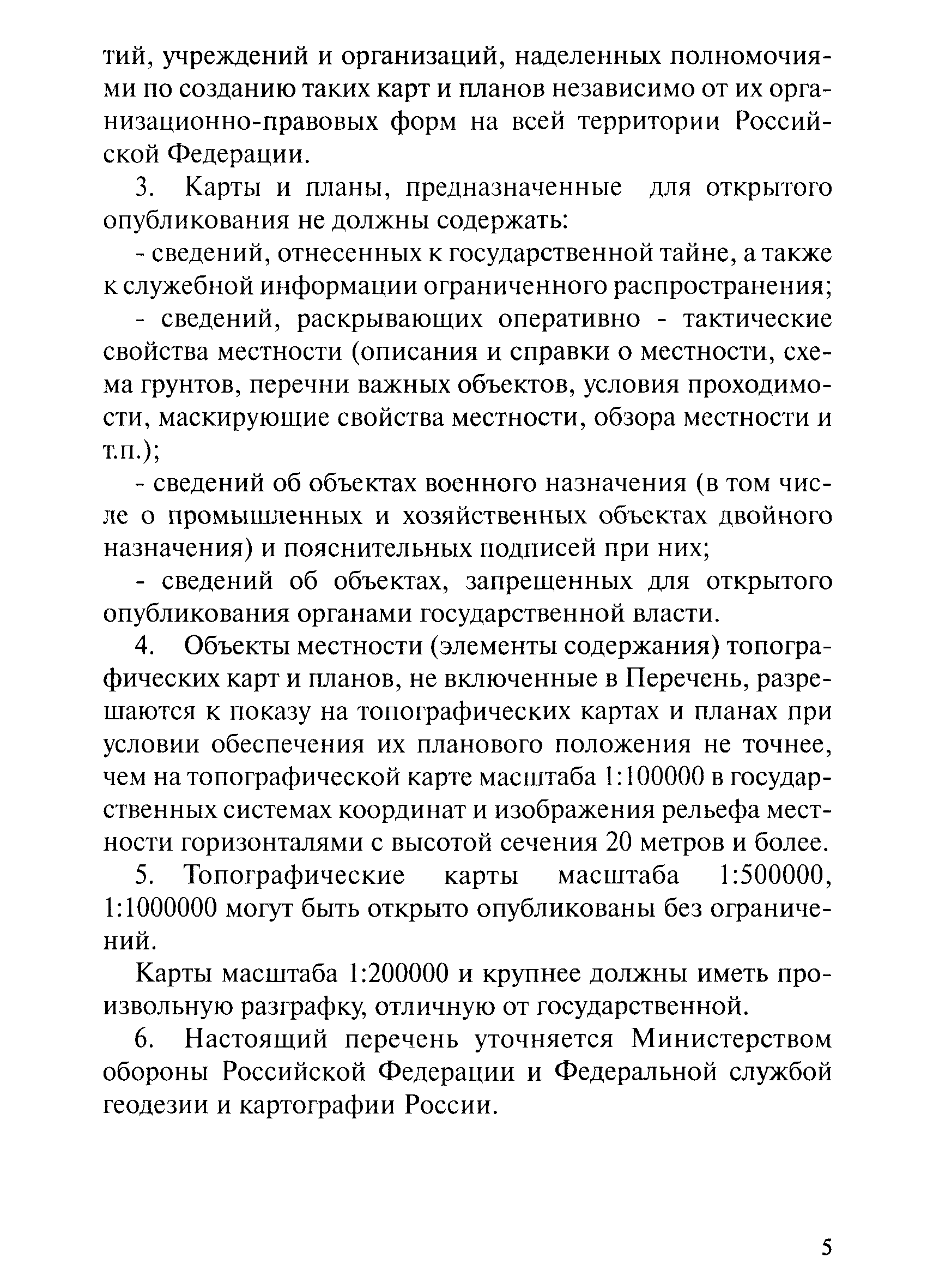 Перечень объектов местности и элементов содержания топографических карт и планов, запрещенных для открытого опубликования| Статус: | действует | | Название рус.: | Перечень объектов местности и элементов содержания топографических карт и планов, запрещенных для открытого опубликования | | Дата добавления в базу: | 01.09.2013 | | Дата актуализации: | 01.01.2021 | | Дата введения: | 14.12.2000 | | Область применения: | Действие Перечня распространяется на карты и планы открытого опубликования, созданные (создаваемые) на территорию Российской Федерации и стран Содружества Независимых Государств в графической, цифровой и иных формах. Требования Перечня обязательны для предприятий, учреждений и организаций, наделенных полномочиями по созданию таких карт и планов независимо от их организационно-правовых форм на всей территории Российской Федерации | | Оглавление: | I. Общие положения II. Объекты местности и элементы содержания топографических карт и планов, запрещенные для открытого опубликования | | Разработан: | Федеральная служба геодезии и картографии России