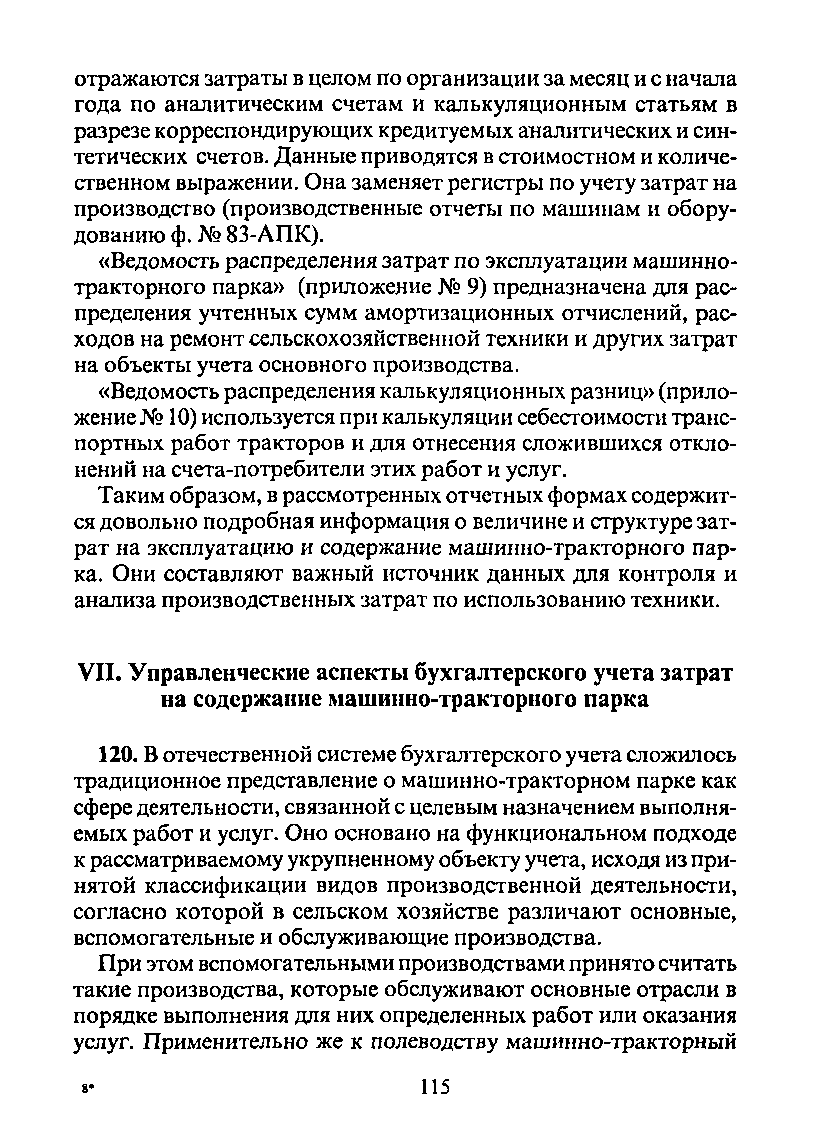 | Оглавление: | 1. Общие положения 2. Современные подходы к формированию и организации деятельности машинно-тракторного парка 3. Организация первичного учёта затрат на содержание машинно-тракторного парка 4. Организация сводного учёта затрат на содержание машинно-тракторного парка 5. Организация аналитического и синтетического учёта затрат на содержание машинно-тракторного парка 6. Калькулирование себестоимости работ, выполненных машинно-тракторным парком 7. Особенности автоматизации бухгалтерского учёта на содержание машинно-тракторного парка 8. Управленческие аспекты бухгалтерского учёта затрат на содержание машинно-тракторного парка Приложение 1. Коэффициенты перевода и сменная эталонная выработка тракторов основных марок Приложение 2. Ведомость начисления и распределения основной и дополнительной оплаты труда механизаторов в растениеводстве (первый вариант) Приложение 3. Ведомость начисления и распределения основной и дополнительной оплаты труда механизаторов в растениеводстве (второй вариант) Приложение 4. Ведомость учета эксплуатационных затрат машинно-тракторного парка по видам работ в растениеводстве Приложение 5. Ведомость выполнения норм выработки механизированных работ в растениеводстве Приложение 6. Ведомость эксплутационных показателей работы тракторов, комбайнов (по инвентарным номерам и маркам) Приложение 7. Ведомость эксплуатационных показателей работы тракторов, комбайнов (по табельным номерам) Приложение 8. Ведомость учета затрат, работ и услуг машинно-тракторного парка Приложение 9. Ведомость распределения затрат по эксплуатации машинно-тракторного парка Приложение 10. Ведомость распределения калькуляционных разниц транспортных работ МТП |