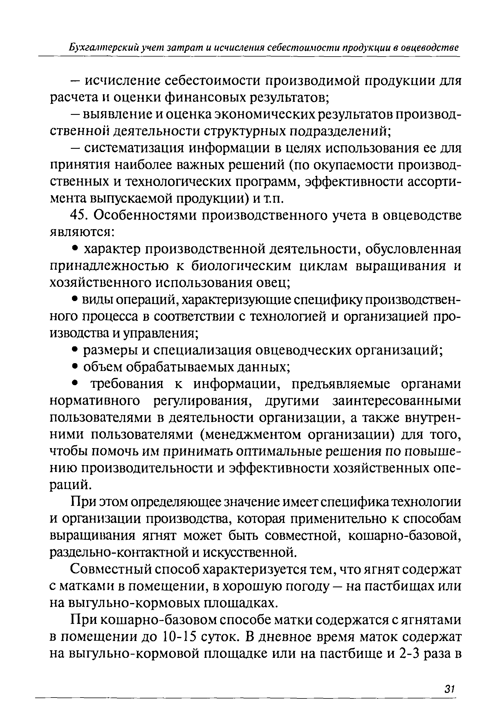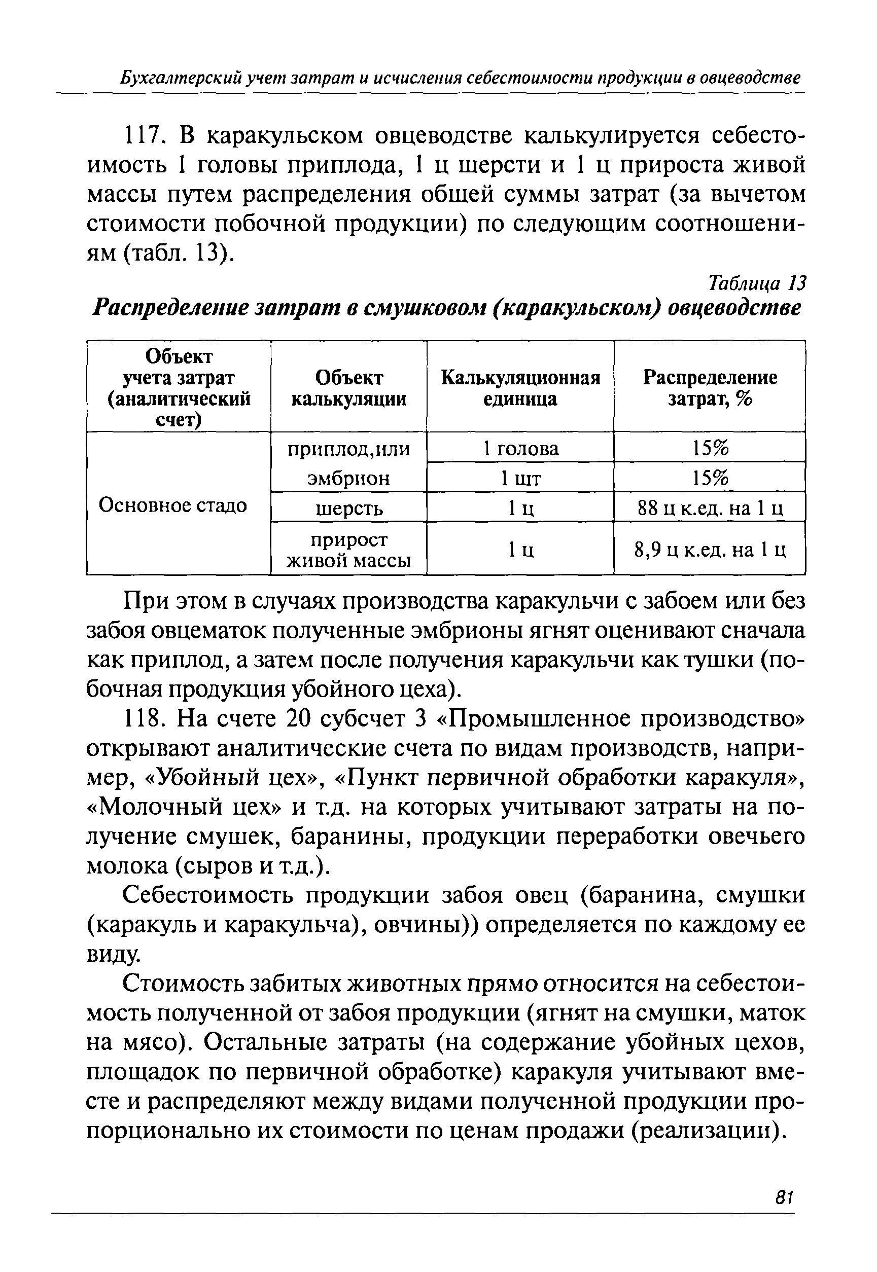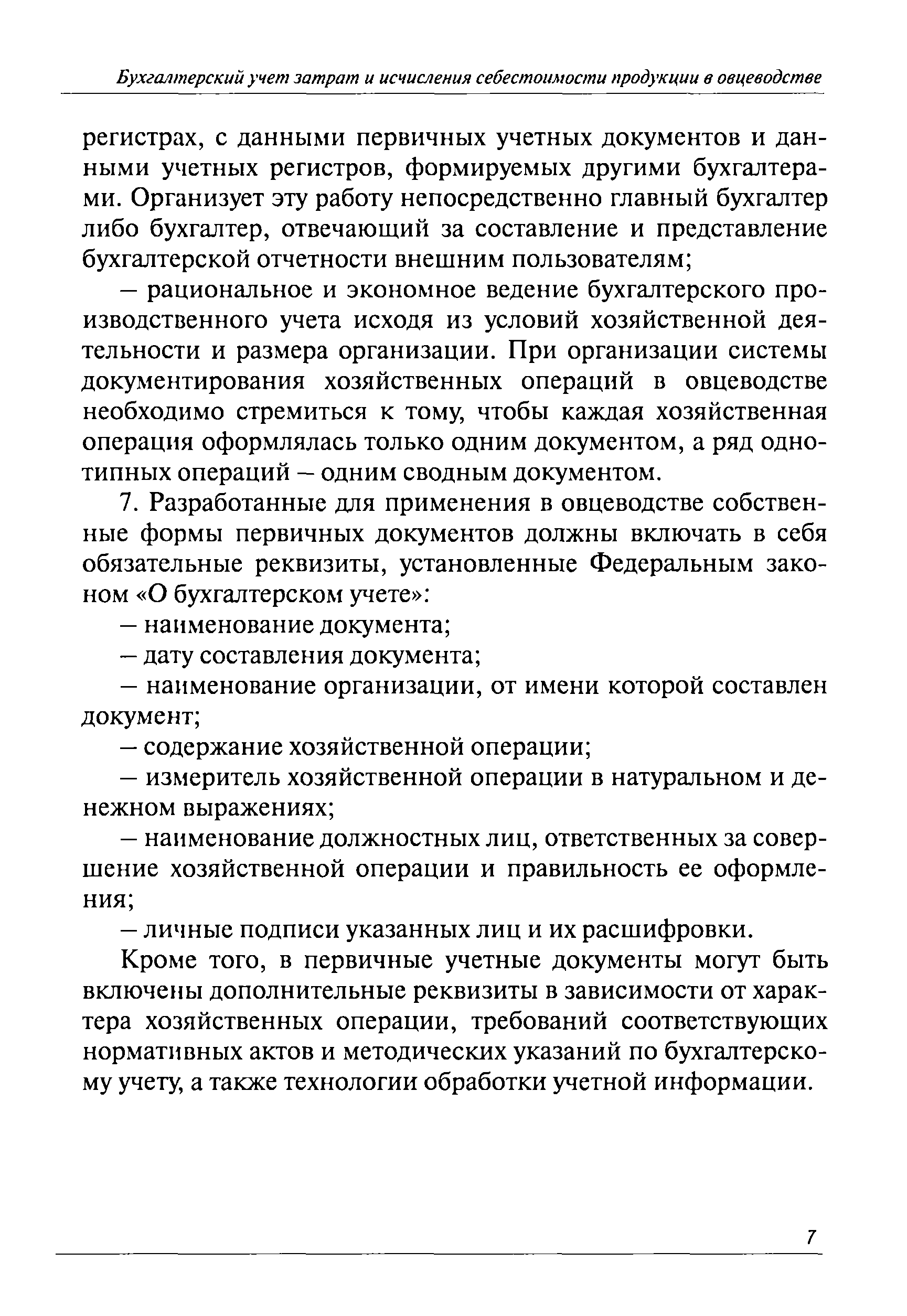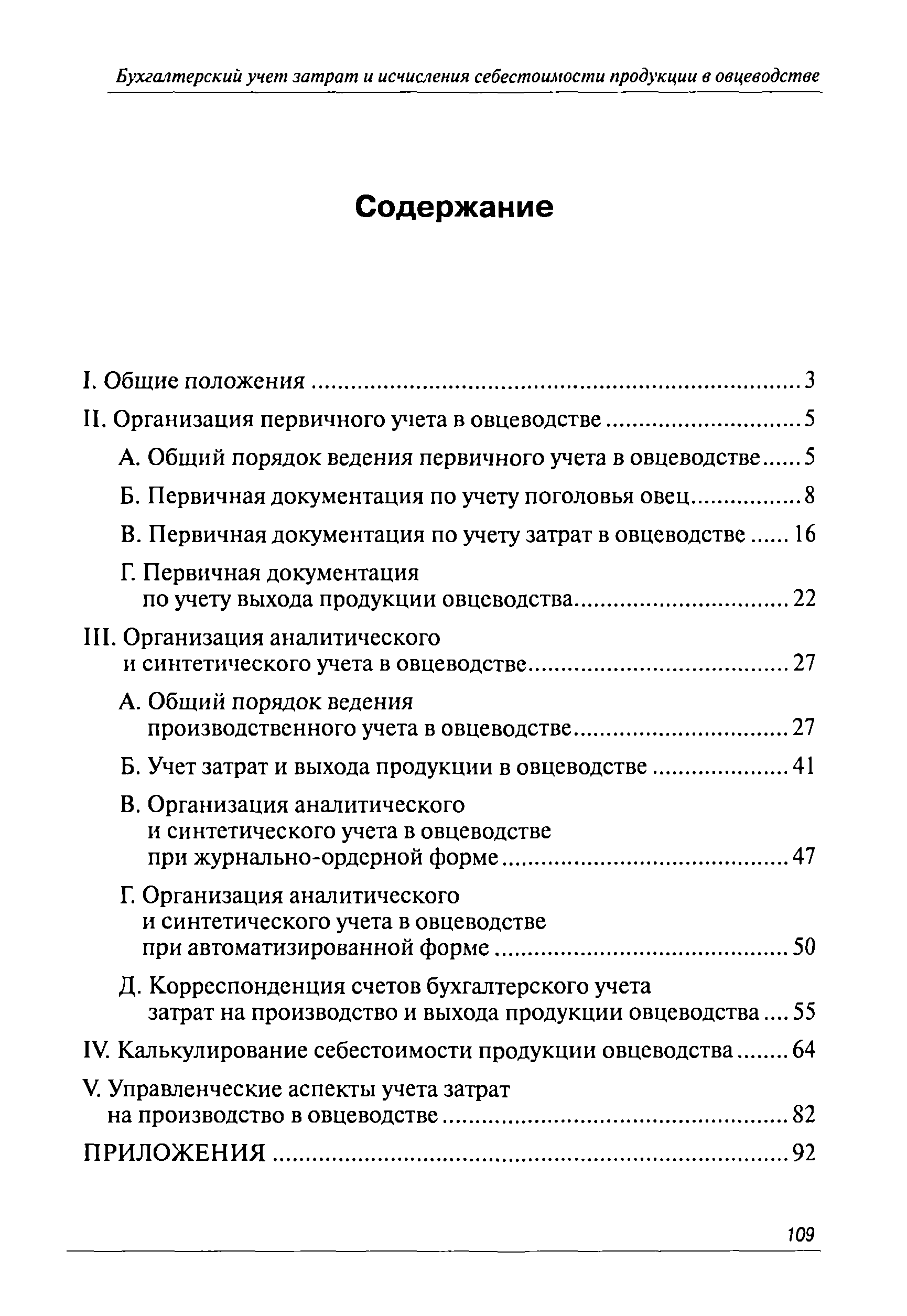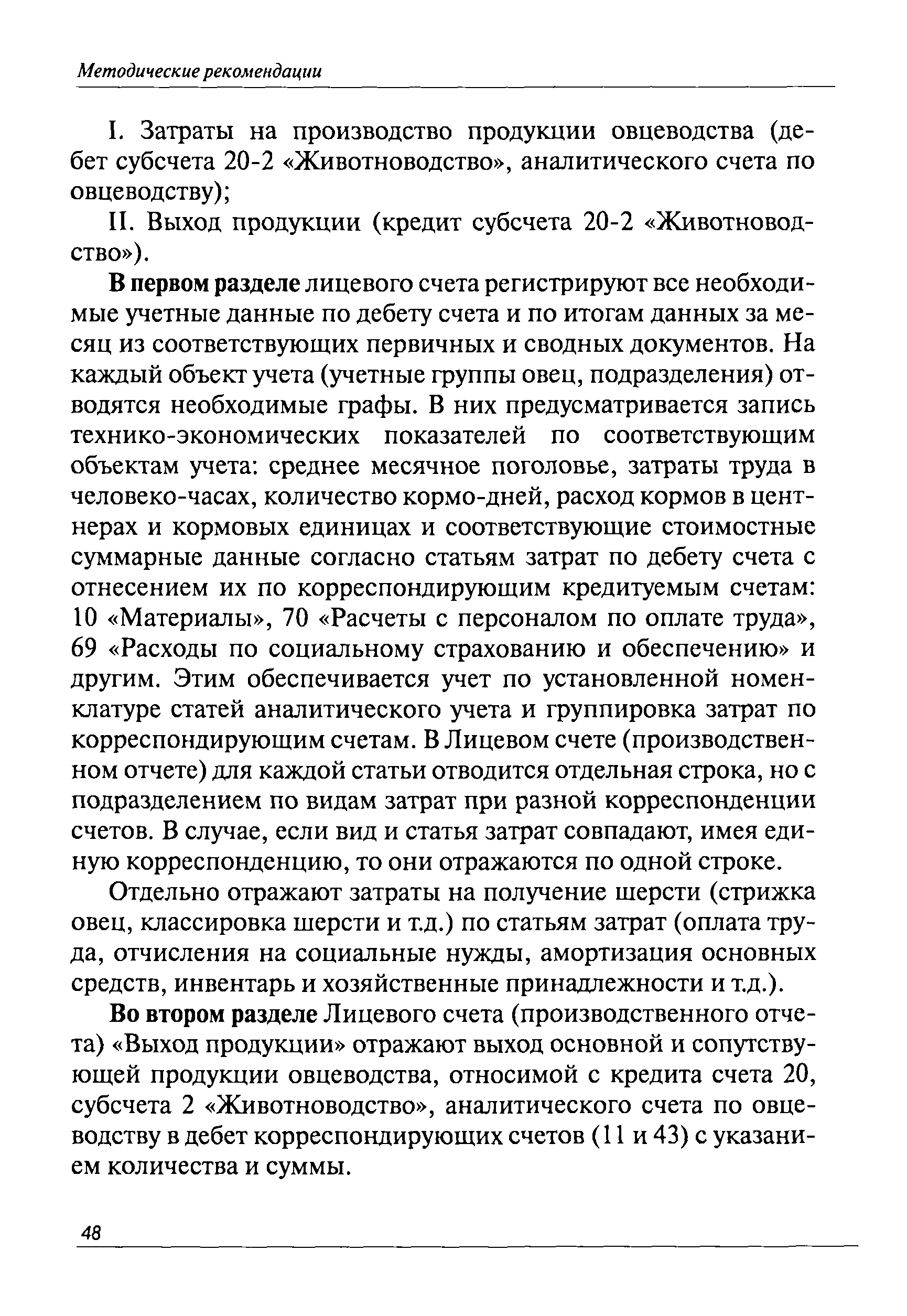 | Оглавление: | 1. Общие положения 2. Организация первичного учёта в овцеводстве А. Общий порядок ведения первичного учёта в овцеводстве Б. Первичная документация по учёту поголовья овец В. Первичная документация по учёту затрат в овцеводстве Г. Первичная документация по учёту выхода продукции овцеводства 3. Организация аналитического и синтетического учёта в овцеводстве А. Общий порядок ведения производственного учёта в овцеводстве Б. Учёт затрат и выхода продукции в овцеводстве В. Организация аналитического и синтетического учёта в овцеводстве при журнально-ордерной форме Г. Организация аналитического и синтетического учёта в овцеводстве при автоматизированной форме Д. Корреспонденция счетов бухгалтерского учета затрат на производство и выхода продукции овцеводства 4. Калькулирование себестоимости продукции овцеводства 5. Управленческие аспекты учёта затрат на производство в овцеводстве Приложения |