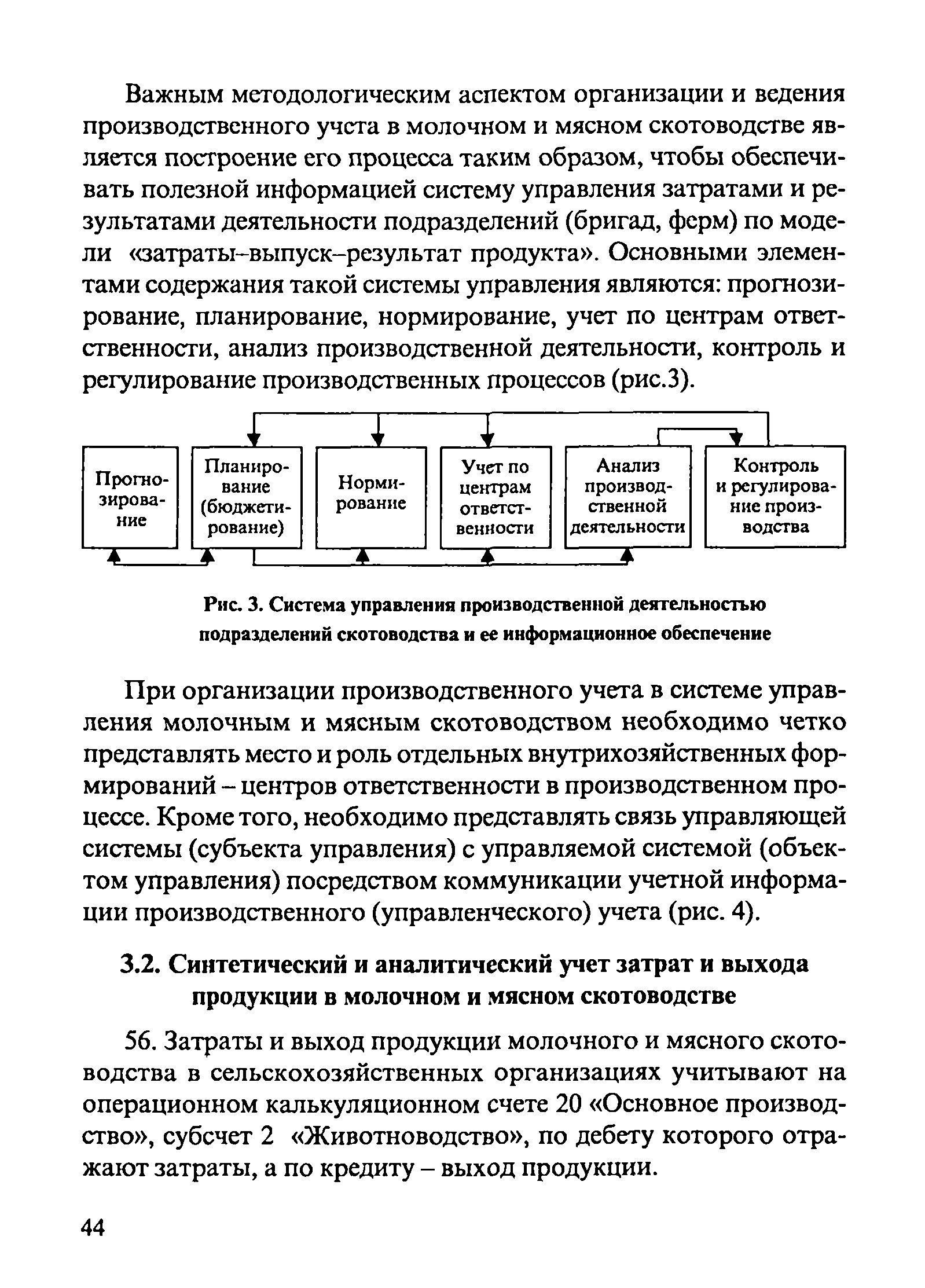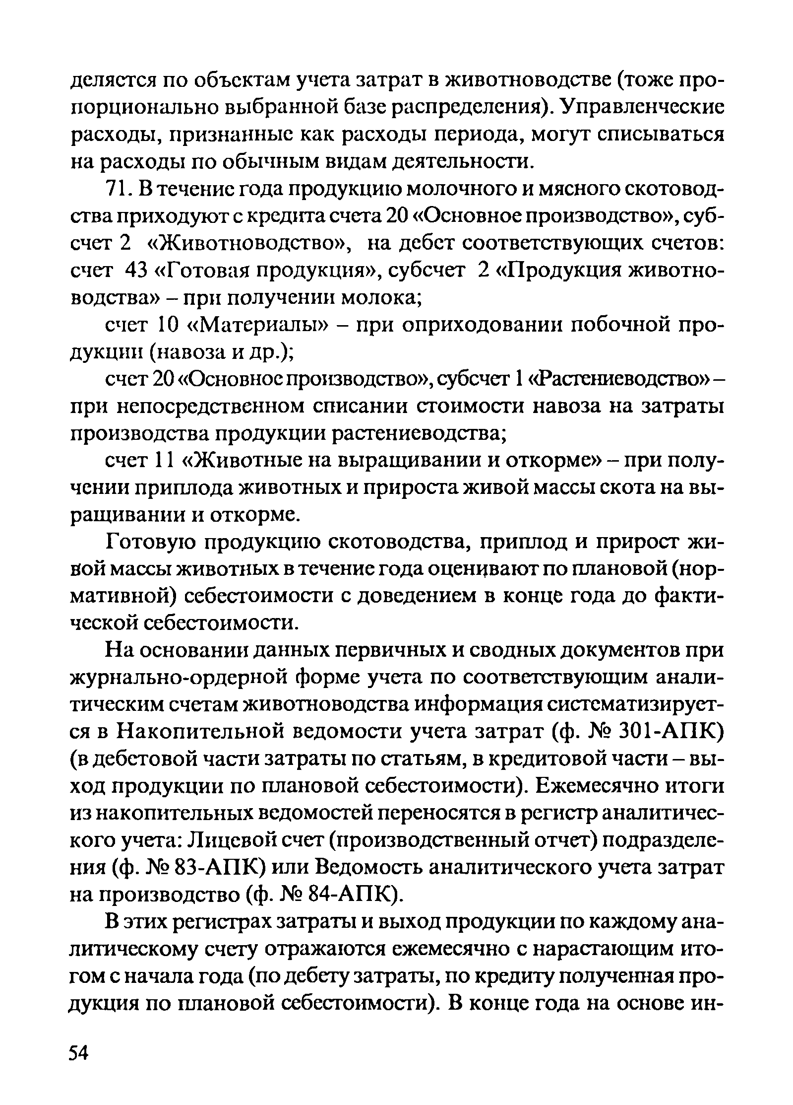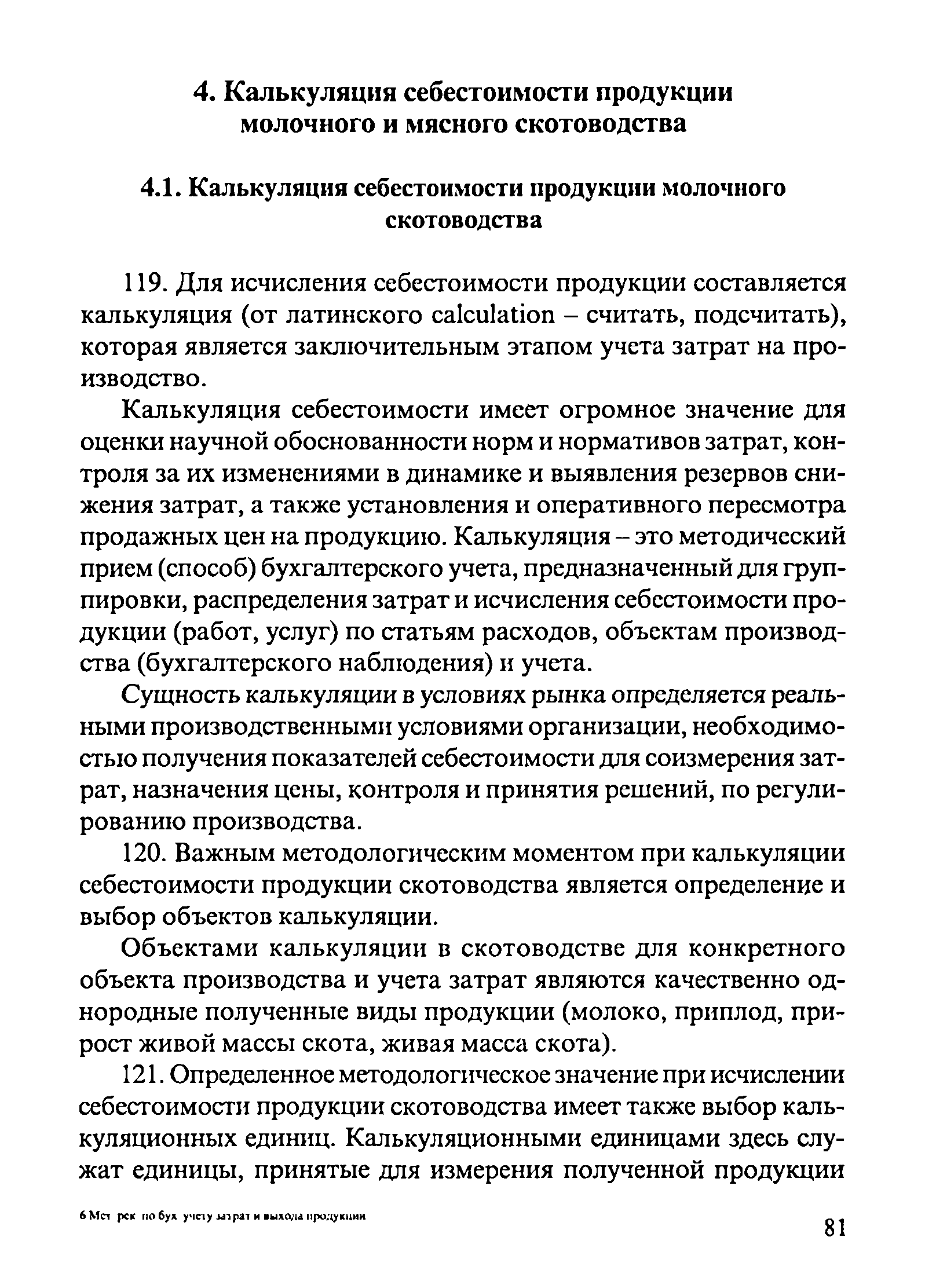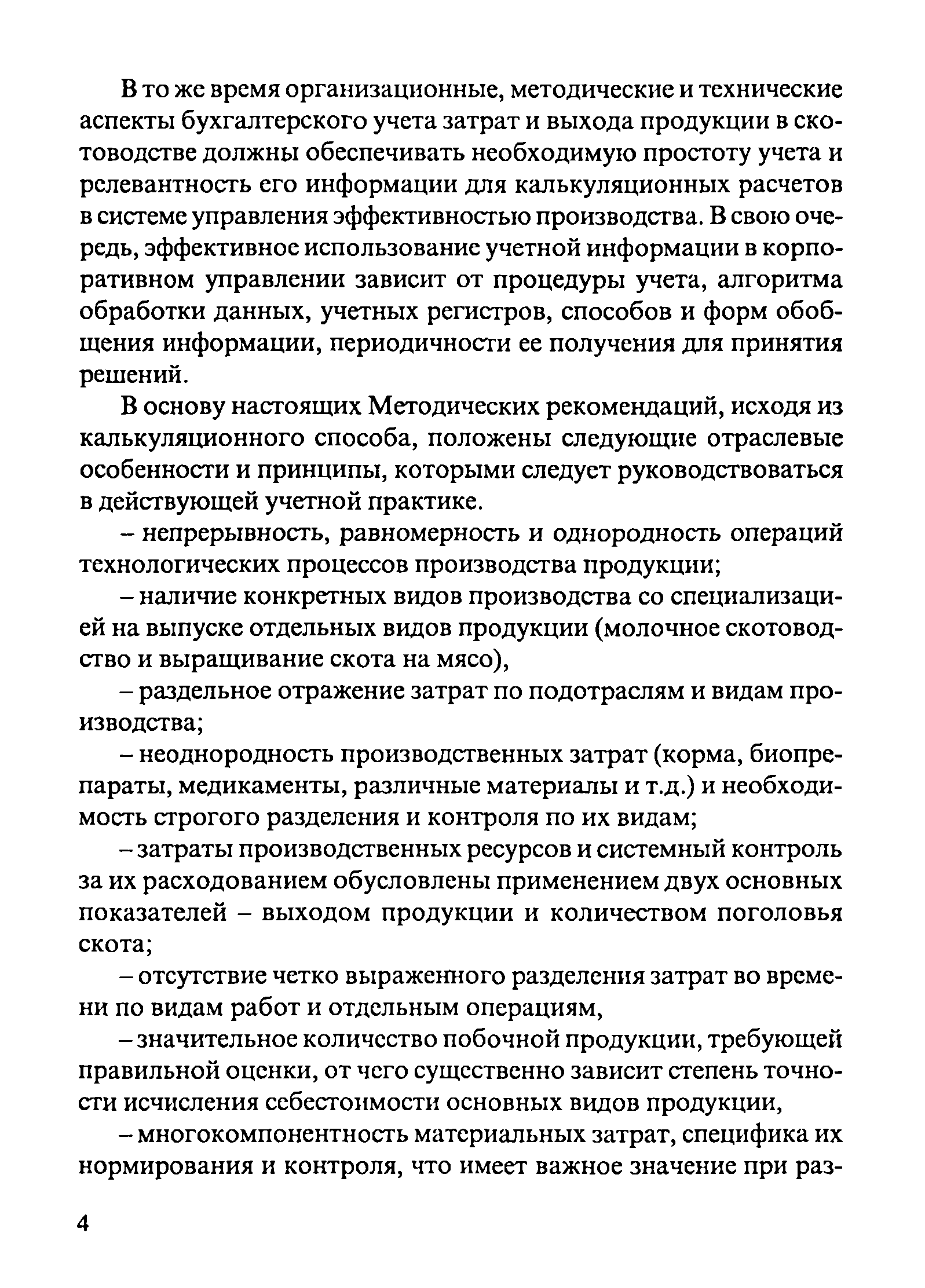 | Оглавление: | 1. Общие положения 2. Организация первичного учёта в молочном и мясном скотоводстве 2.1 Общий порядок ведения первичного учета в молочном и мясном скотоводстве 2.2 Первичная документация по учёту затрат в молочном и мясном скотоводстве 2.3 Первичная документация по учёту продукции молочного и мясного скотоводства 2.4 Первичная документация по учёту продукции переработки молока 2.3 Первичная учётная документация по учёту продукции переработки мясного скота 3. Организация аналитического и синтетического учёта затрат и выхода продукции в молочном и мясном скотоводстве 3.1 Общий порядок ведения производственного учёта в скотоводстве 3.2 Синтетический м аналитический учёт затрат и выхода продукции в молочном и мясном скотоводстве 3.3 Особенности учёта затрат в специализированных скотоводческих организациях с промышленной технологией производства 3.4 Учёт затрат и выхода продукции переработки молока и забоя мясного скота в цехах промышленного производства 3.5 Организация аналитического и синтетического учёта затрат и выхода продукции в молочном и мясном скотоводстве при журнально-ордерной форме 3.6 Организация аналитического и синтетического учёта затрат и выхода продукции в молочном и мясном скотоводстве при автоматизированной форме 3.7 Корреспонденция счетов по учёту затрат и выхода продукции в молочном и мясном скотоводстве 3.8 Корреспонденция счетов по учёту затрат и выхода продукции переработки молока и забоя мясного скота в цехах промышленного производства 4. Калькуляция себестоимости продукции молочного и мясного скотоводства 4.1 Калькуляция себестоимости продукции молочного скотоводства 4.2 Калькуляция себестоимости продукции мясного скотоводства 4.3 Калькуляция себестоимости продукции переработки молока и забоя скота в цехах промышленного производства 5. Управленческие аспекты учёта затрат и продукции в молочном и мясном скотоводстве |