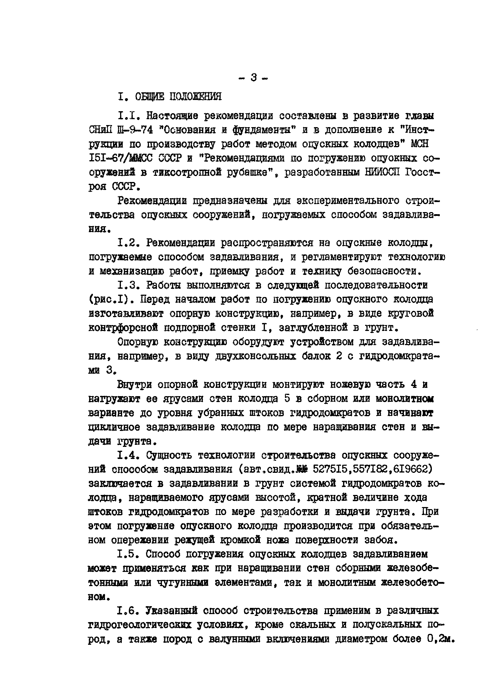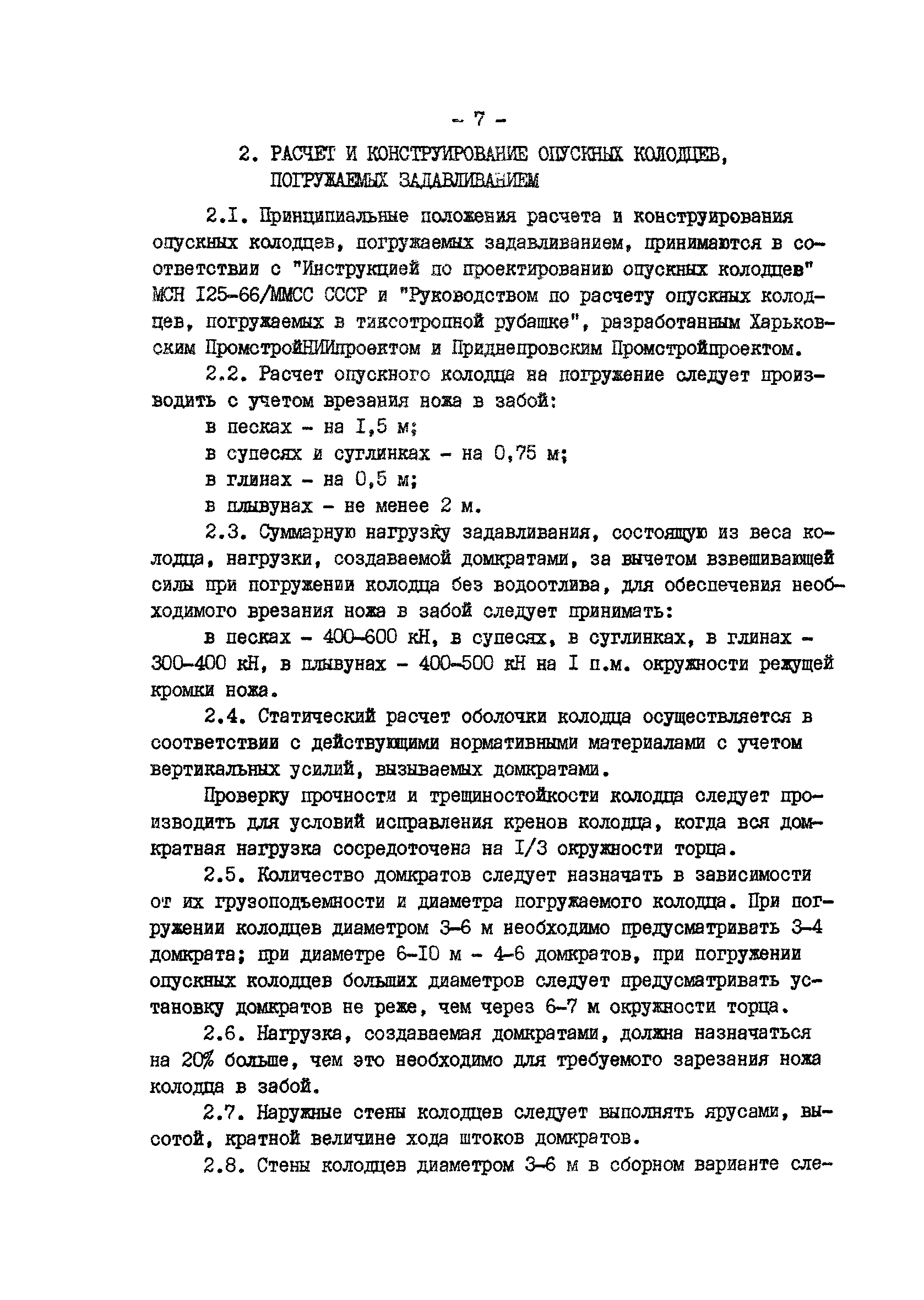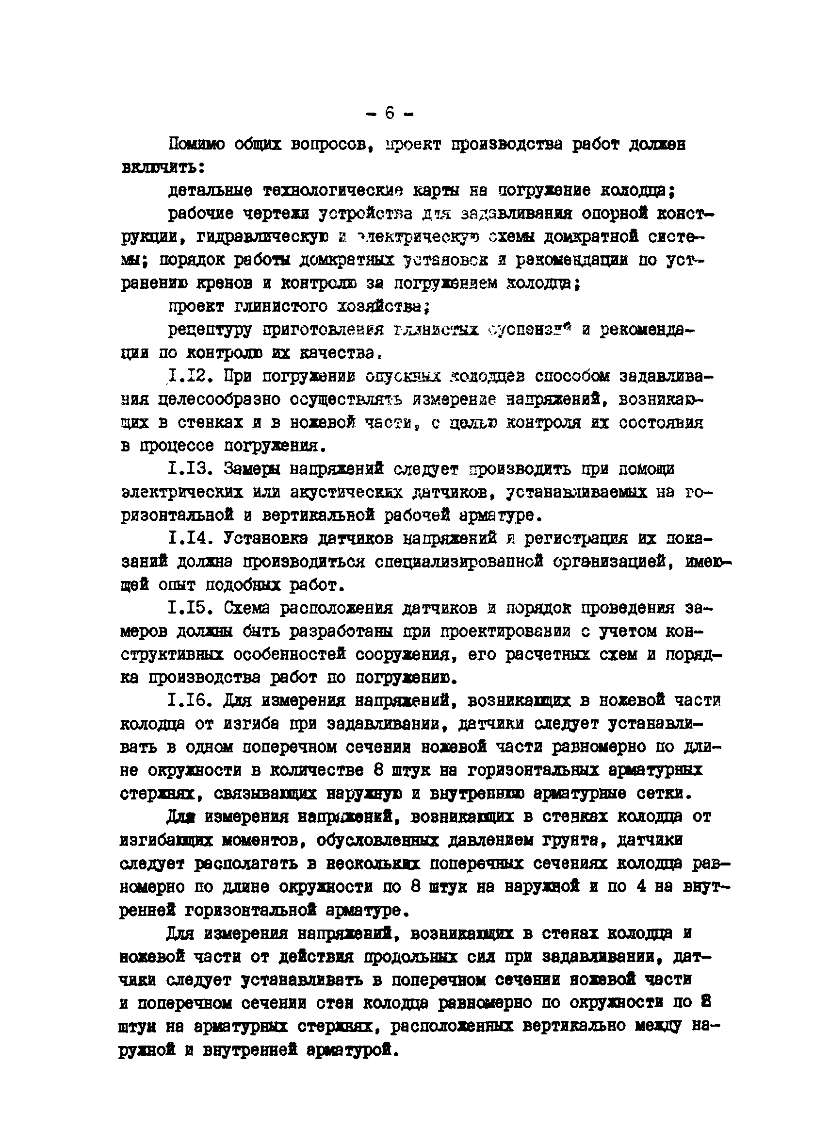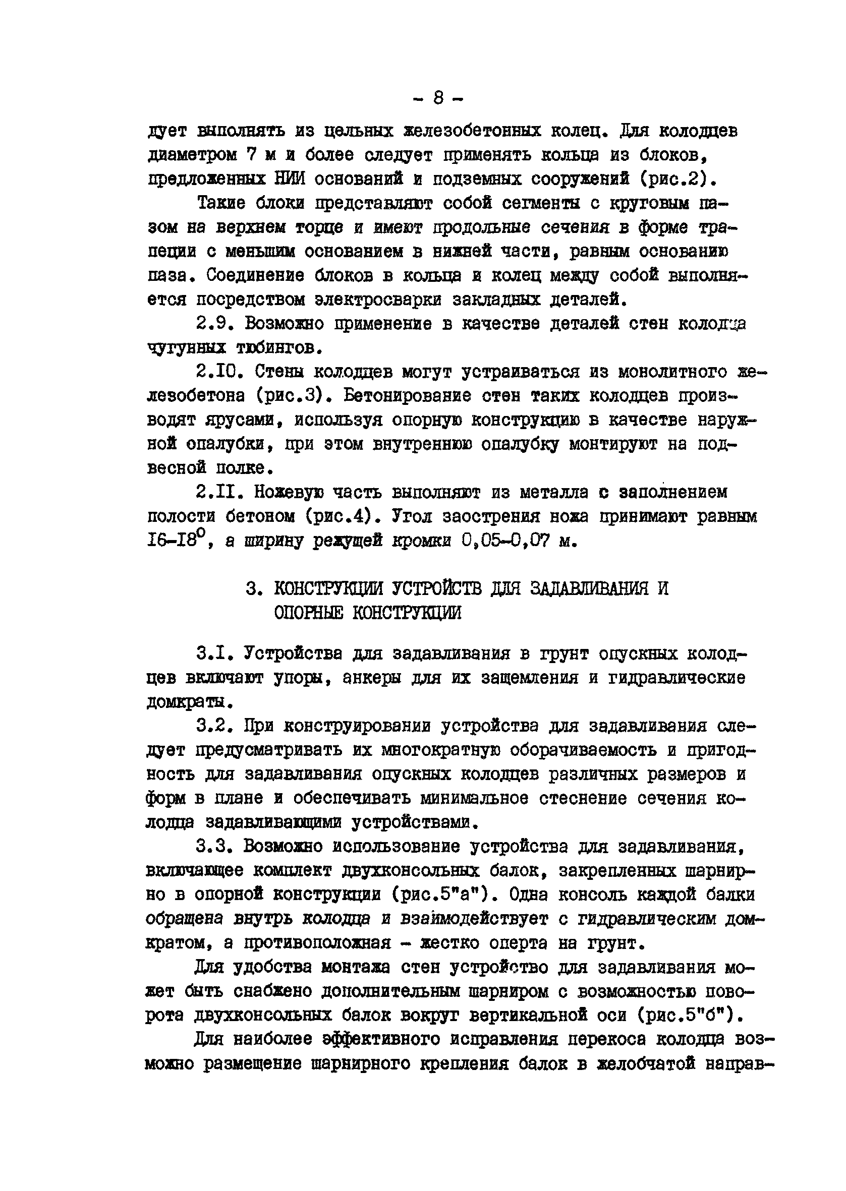 | Оглавление: | 1 Общие положения 2 Расчет и конструирование опускных колодцев, погружаемых задавливанием 3 Конструкции устройств задавливания и опорные конструкции 4 Оборудование для производства работ 5 Производство работ по погружению опускного колодца способом задавливания 6 Геодезический контроль за погружением колодцев 7 Техника безопасности |
