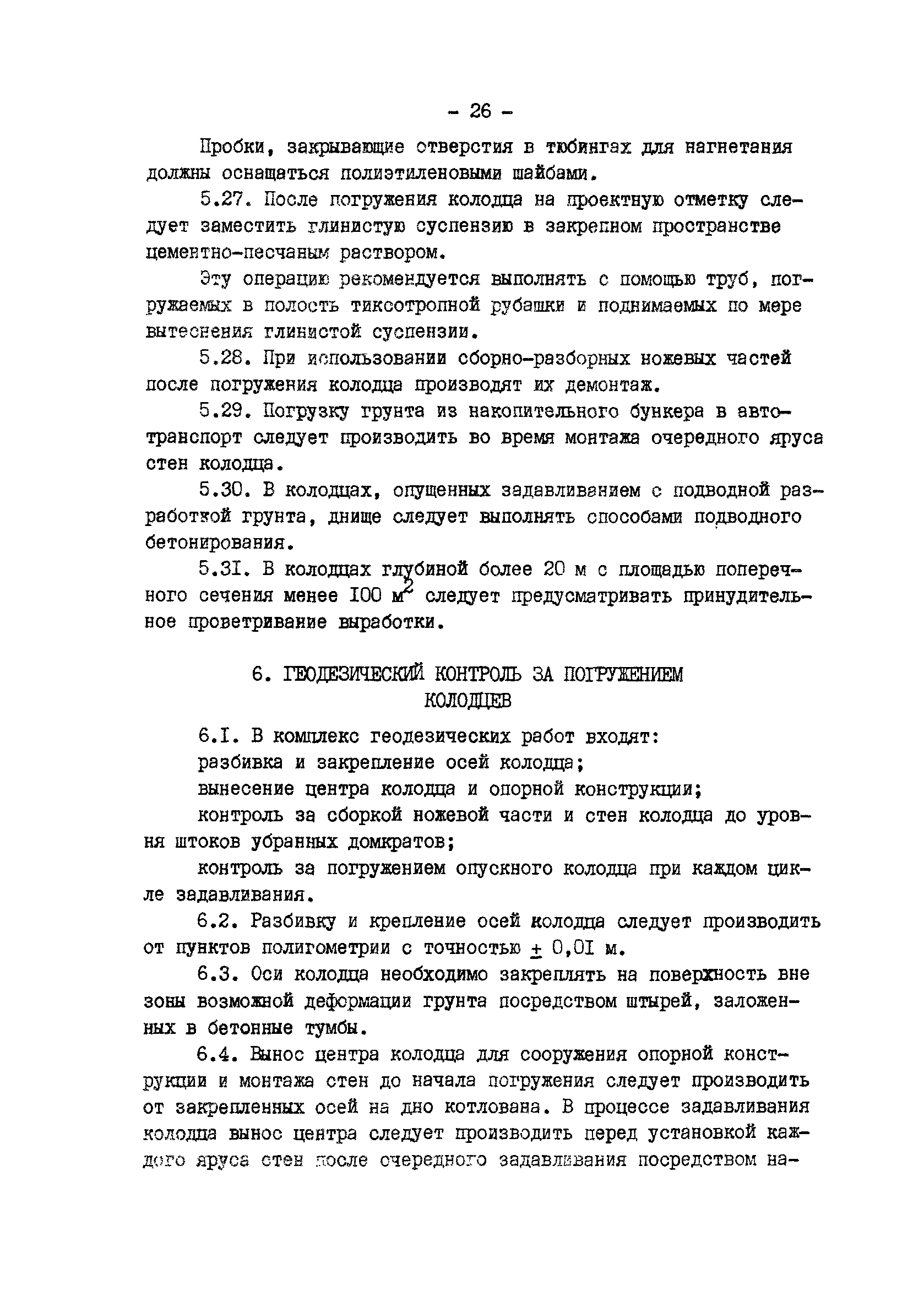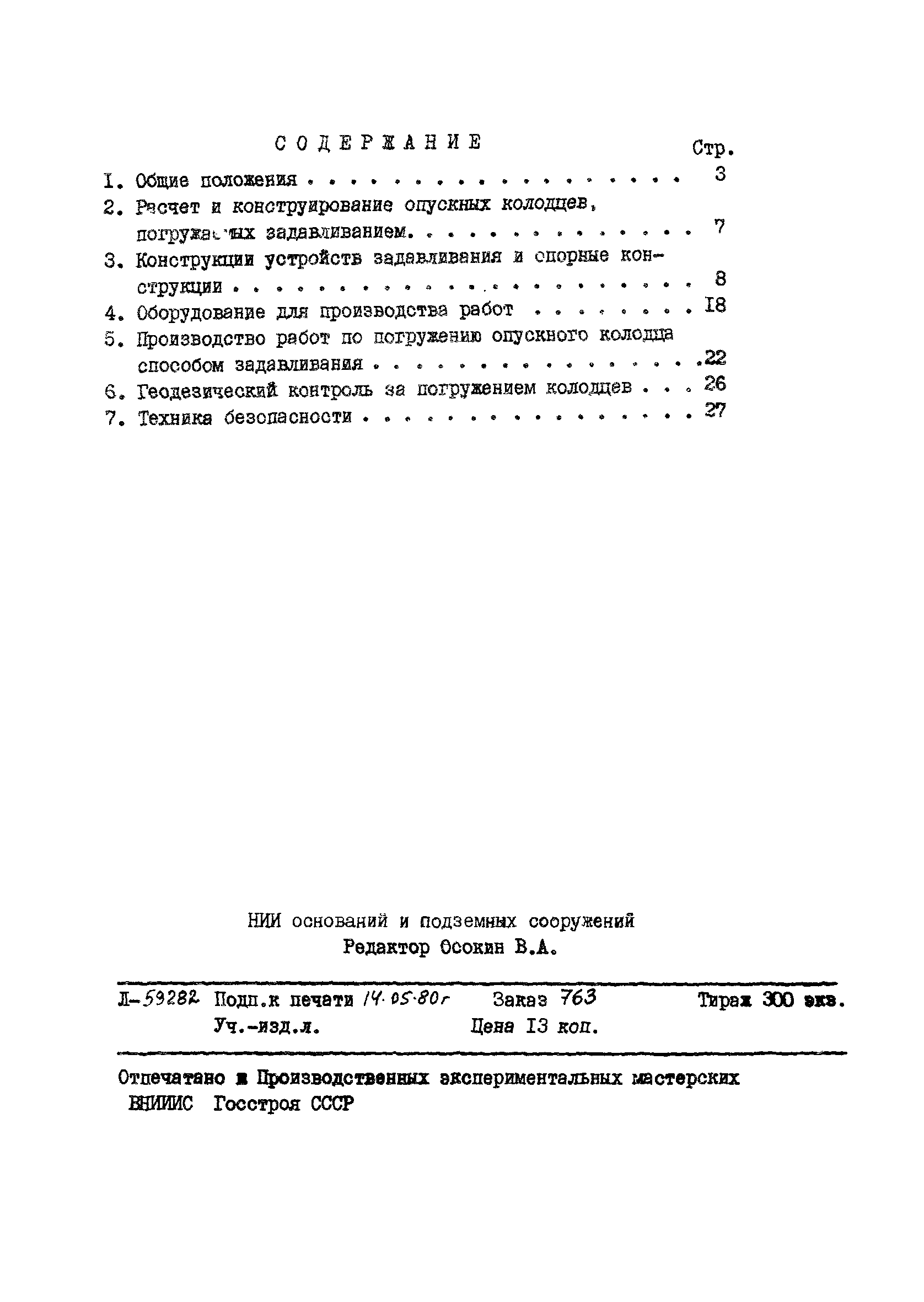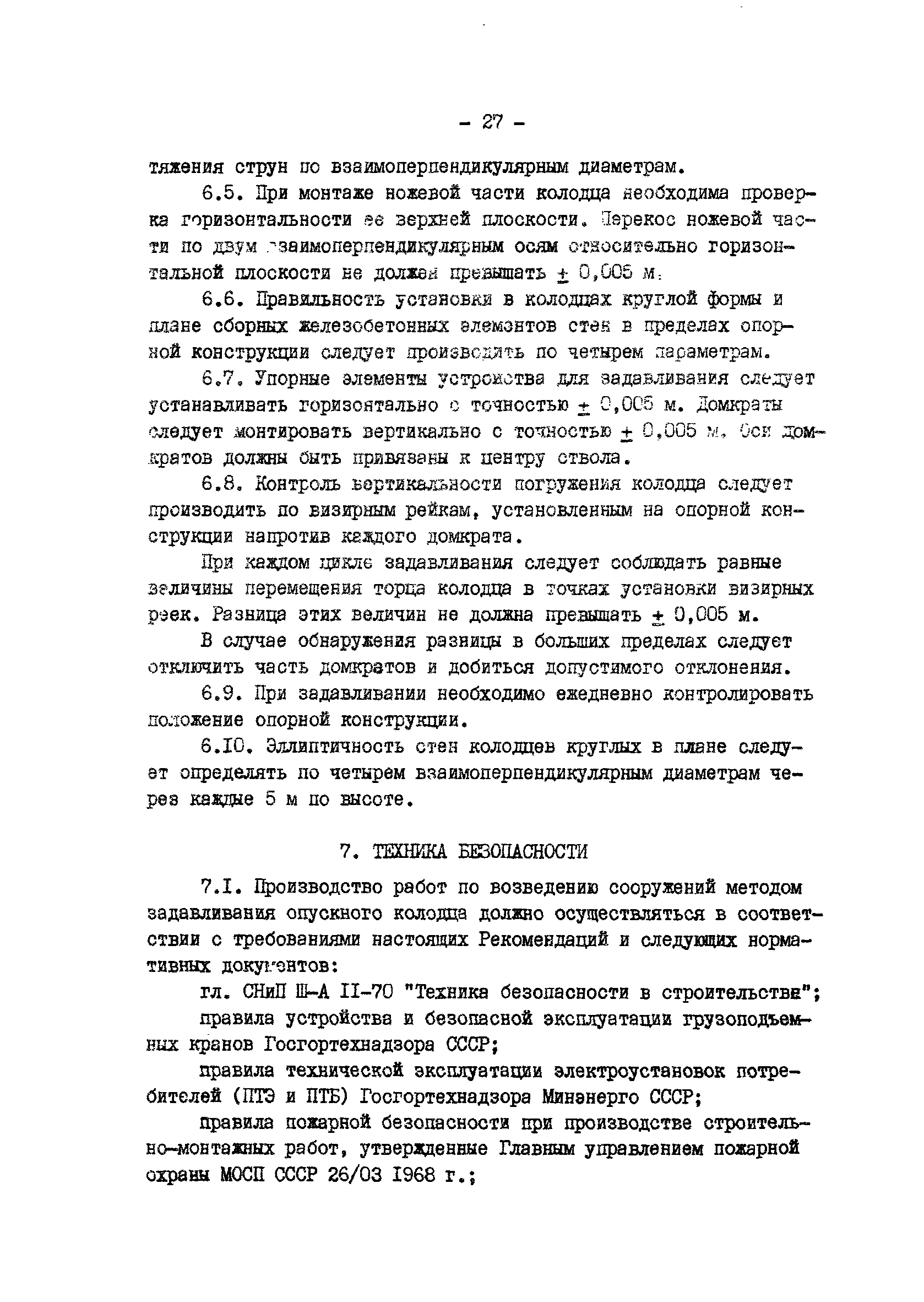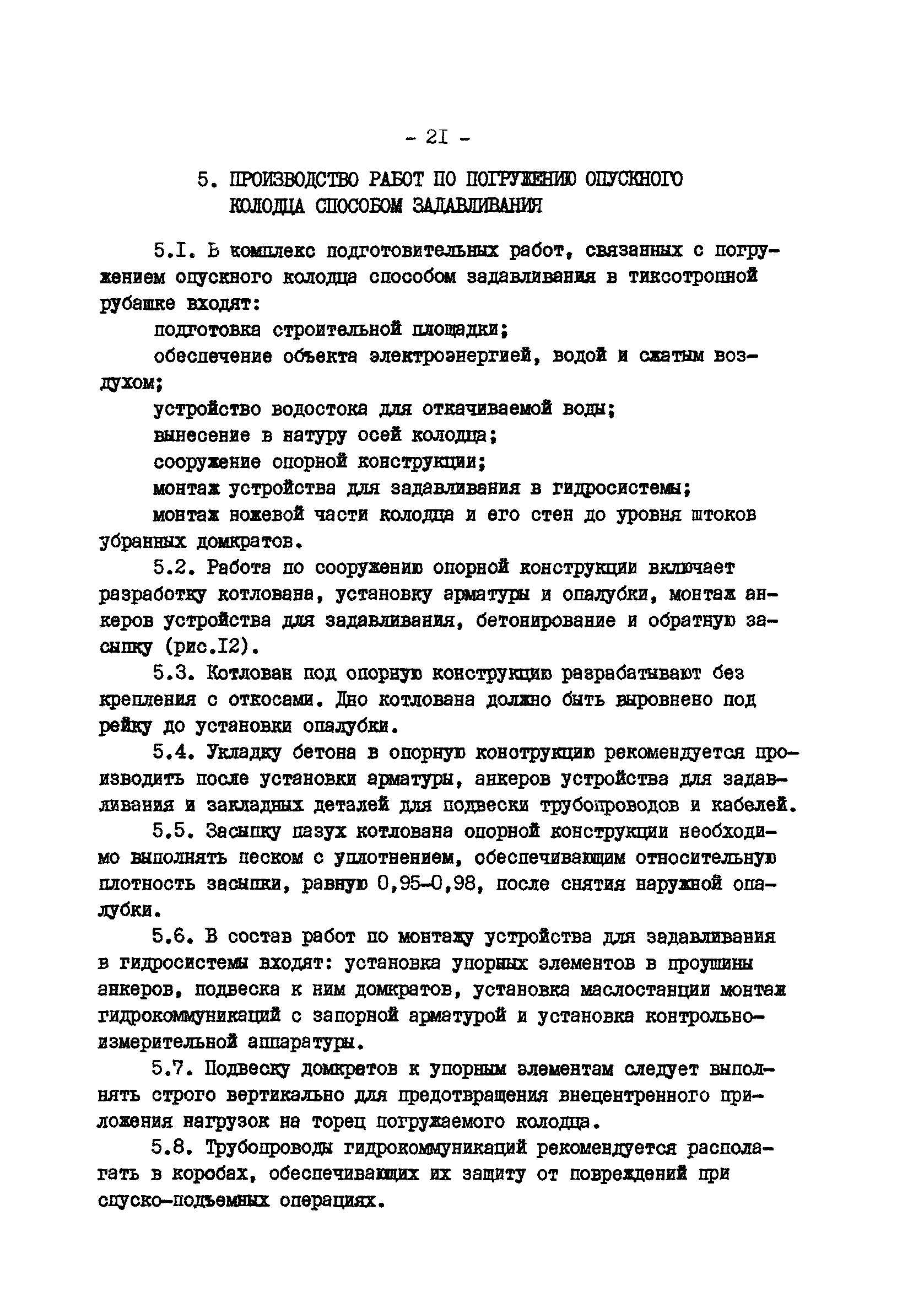 | Оглавление: | 1 Общие положения 2 Расчет и конструирование опускных колодцев, погружаемых задавливанием 3 Конструкции устройств задавливания и опорные конструкции 4 Оборудование для производства работ 5 Производство работ по погружению опускного колодца способом задавливания 6 Геодезический контроль за погружением колодцев 7 Техника безопасности |