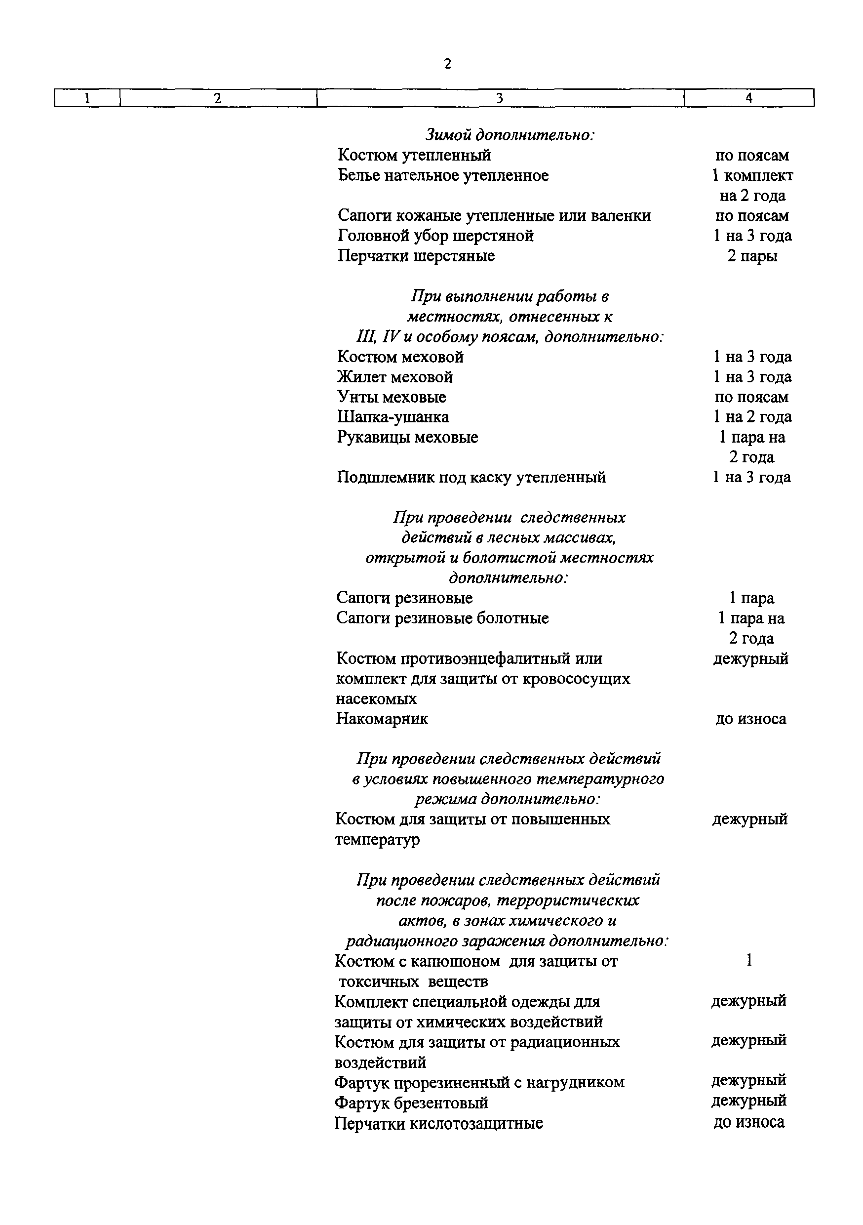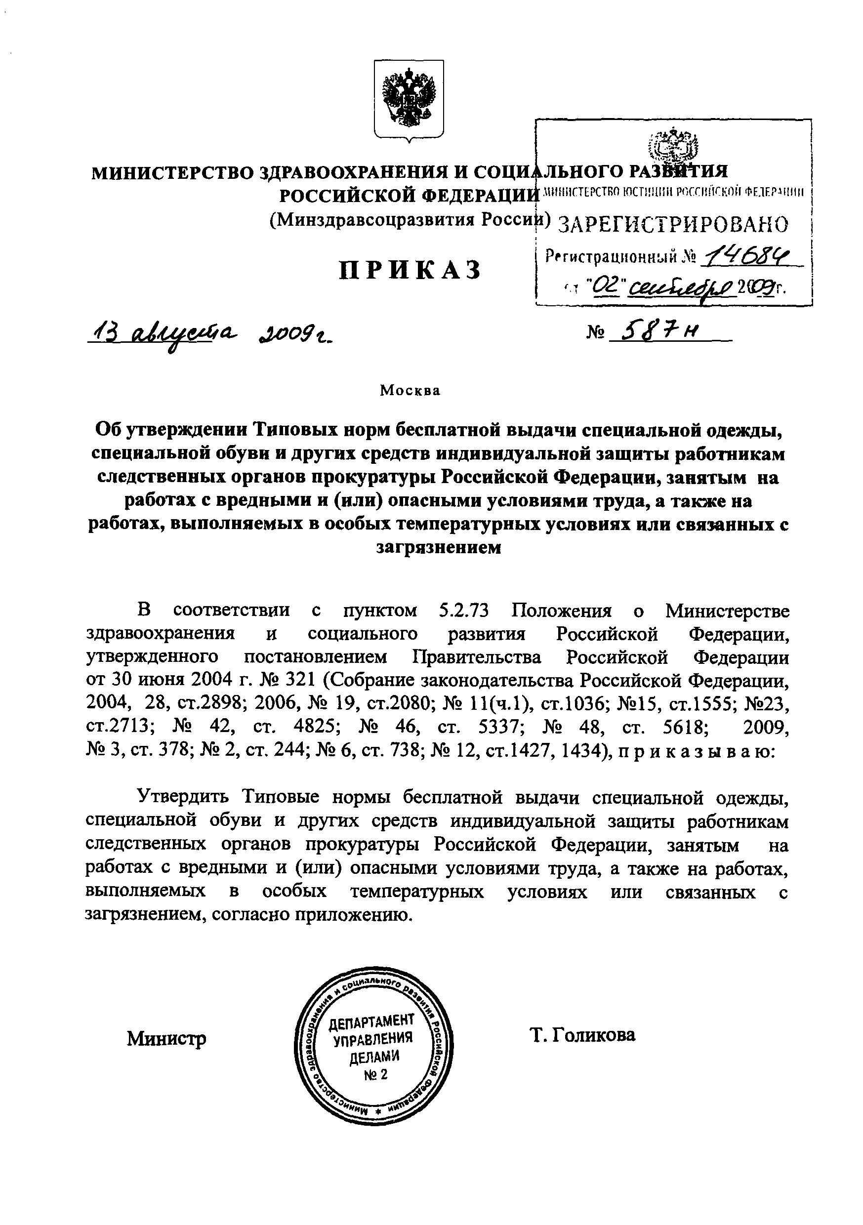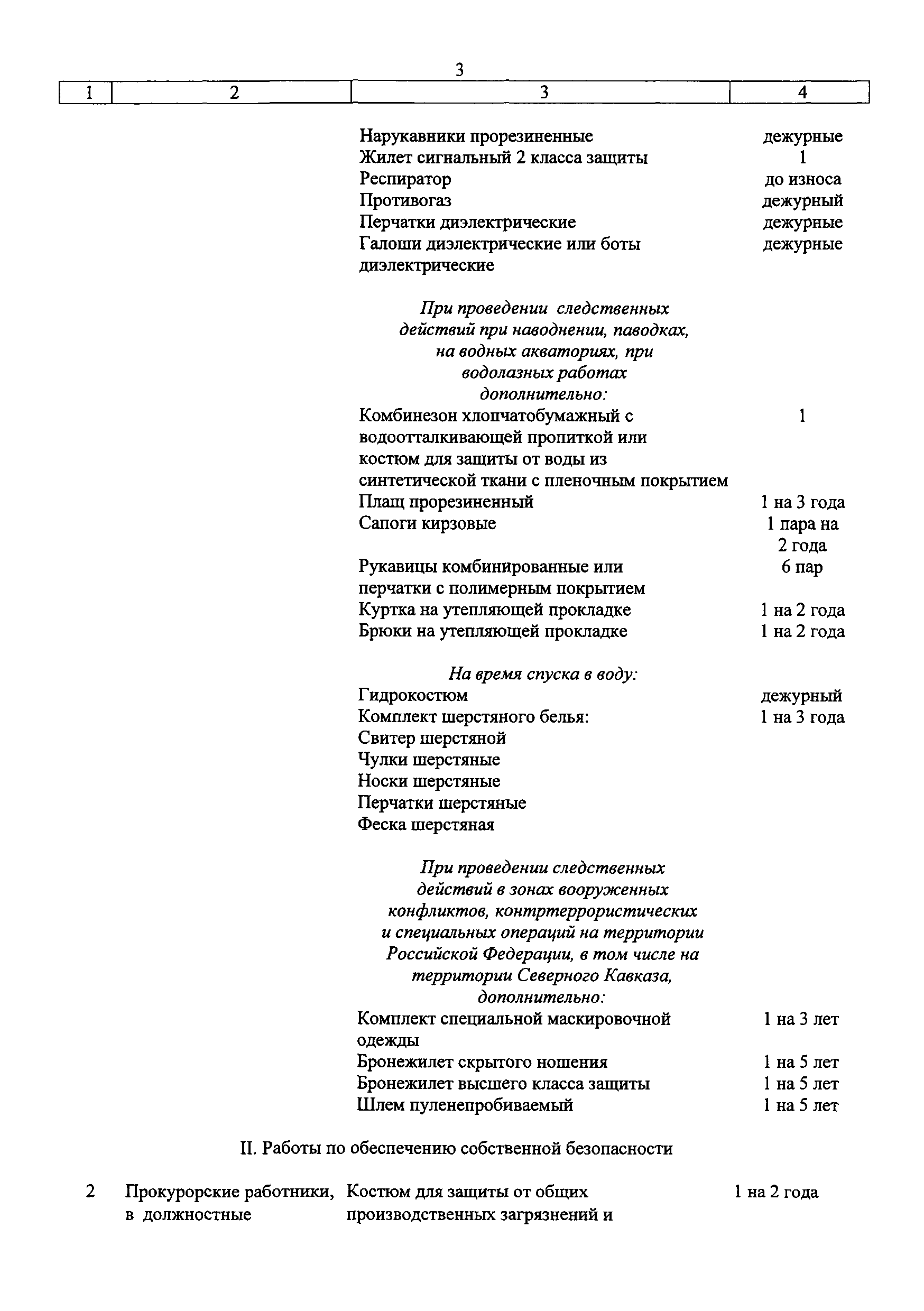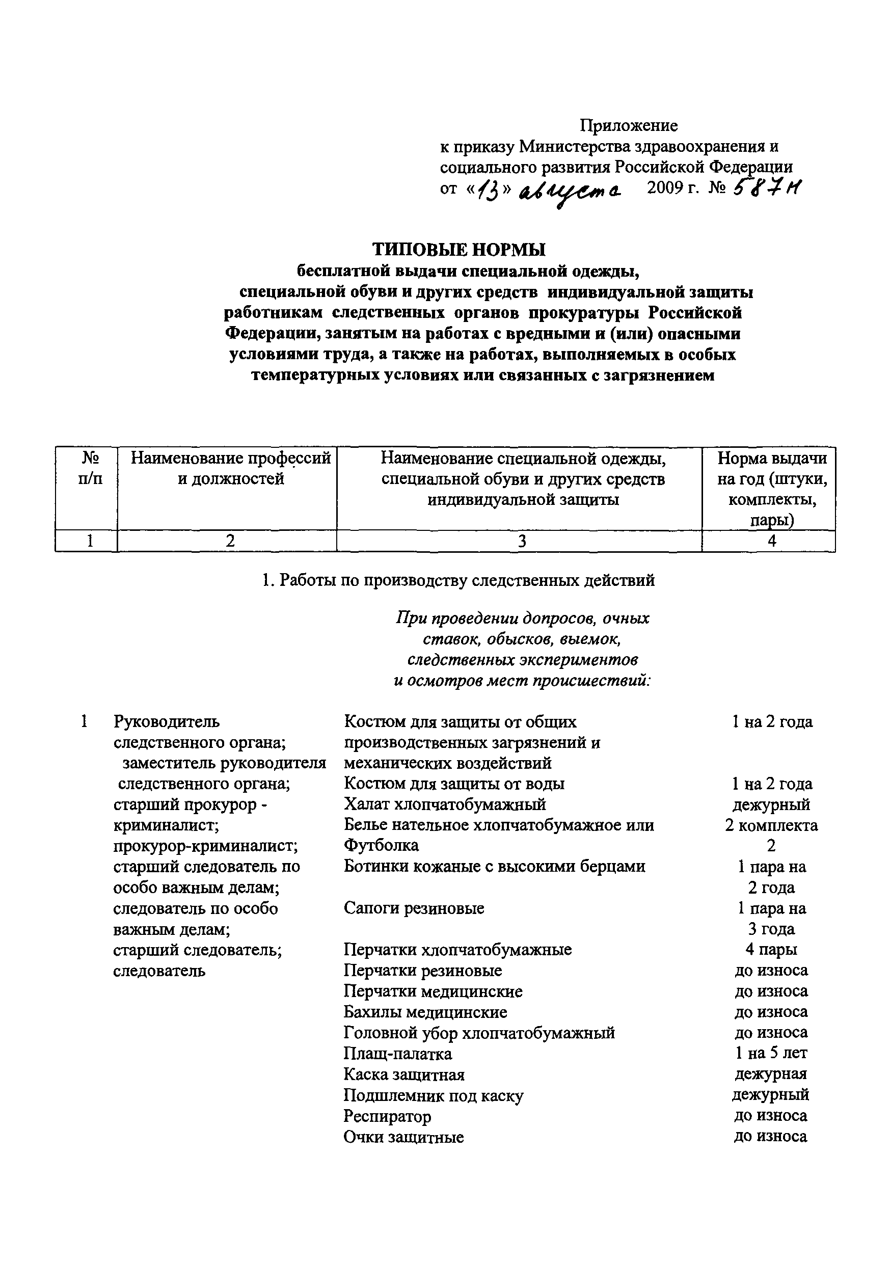 Типовые нормы бесплатной выдачи специальной одежды, специальной обуви и других средств индивидуальной защиты работникам следственных органов прокуратуры Российской Федерации, занятым на работах с вредными и (или) опасными условиями труда, а также на работах, выполняемых в особых температурных условиях или связанных с загрязнением| Статус: | действует | | Название рус.: | Типовые нормы бесплатной выдачи специальной одежды, специальной обуви и других средств индивидуальной защиты работникам следственных органов прокуратуры Российской Федерации, занятым на работах с вредными и (или) опасными условиями труда, а также на работах, выполняемых в особых температурных условиях или связанных с загрязнением | | Дата добавления в базу: | 01.09.2013 | | Дата актуализации: | 01.01.2021 | | Дата введения: | 04.12.2009 | | Оглавление: | Типовые нормы бесплатной выдачи специальной одежды, специальной обуви и других средств индивидуальной защиты работникам следственных органов прокуратуры Российской Федерации, занятым на работах с вредными и (или) опасными условиями труда, а также на работах, выполняемых в особых температурных условиях или связанных с загрязнением | | Утверждён: | 13.08.2009 Минздравсоцразвития России (587н)