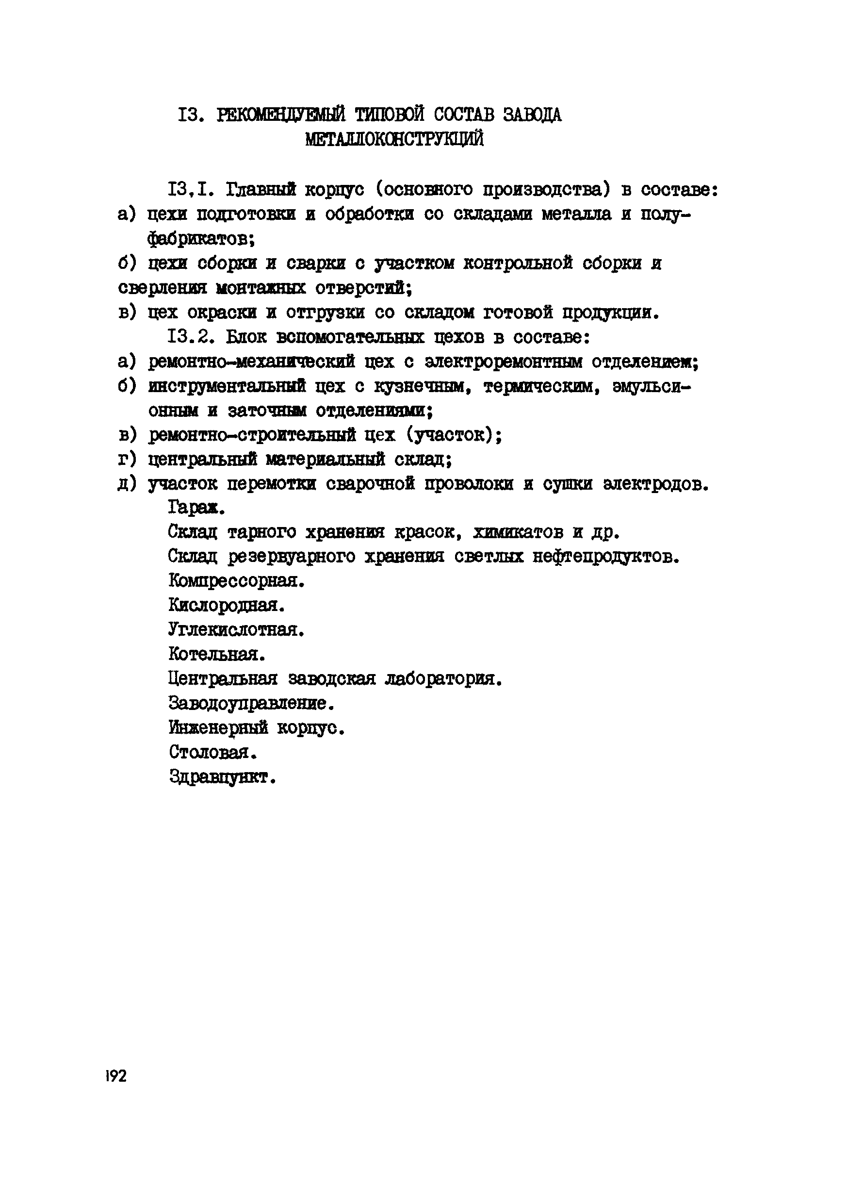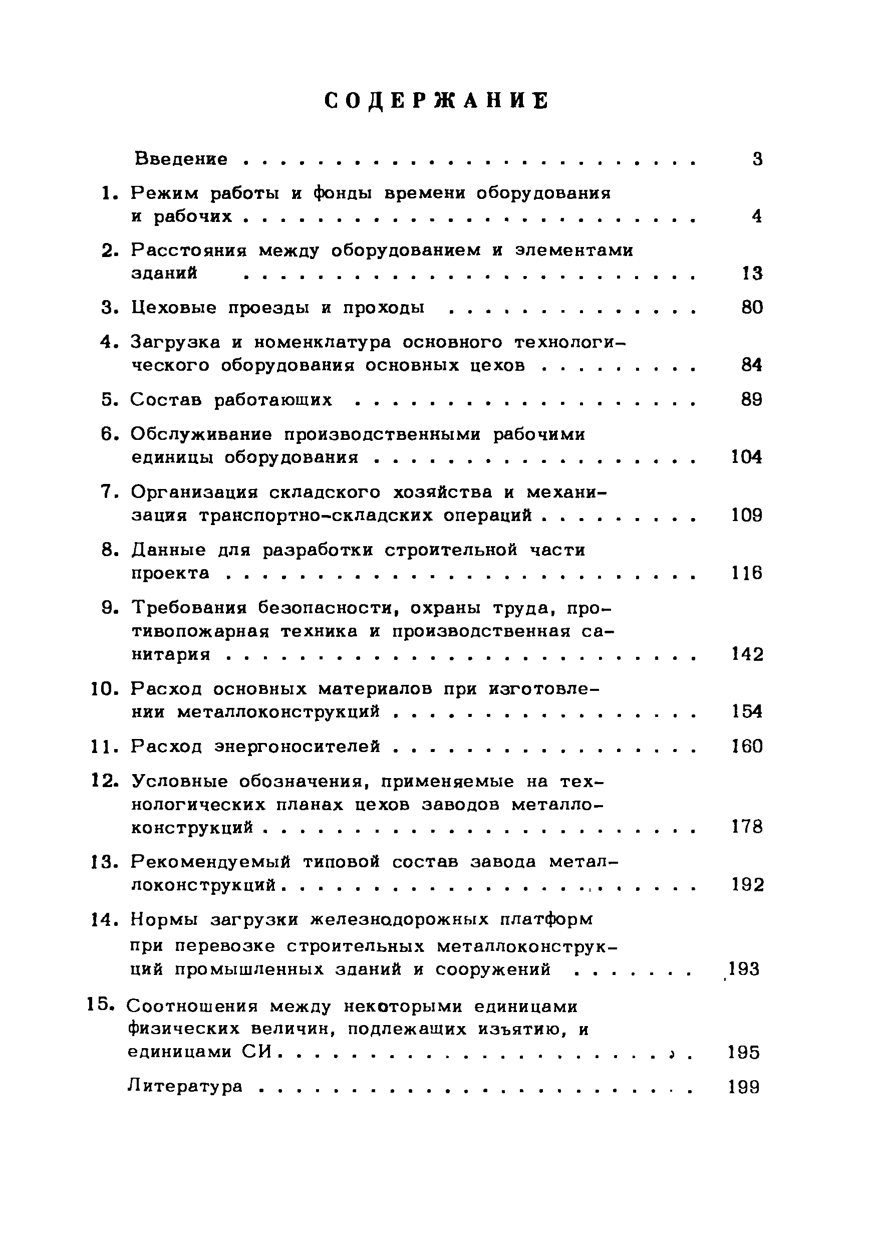 | Оглавление: | Введение 1 Режим работы и фонды времени оборудования и рабочих 2 Расстояния между оборудованием и элементами зданий 3 Цеховые проезды и проходы 4 Загрузка и номенклатура основного технологического оборудования основных цехов 5 Состав работающих 6 Обслуживание производственными рабочими единицы оборудования 7 Организация складского хозяйства и механизация транспортно-складских операций 8 Данные для разработки строительной части проекта 9 Требования безопасности, охраны труда, противопожарная техника и производственная санитария 10 Расход основных материалов при изготовлении металлоконструкций 11 Расход энергоносителей 12 Условные обозначения, применяемые на технологических планах цехов заводов металлоконструкций 13 Рекомендуемый типовой состав завода металлоконструкций 14 Нормы загрузки железнодорожных платформ при перевозке строительных металлоконструкций промышленных зданий и сооружений 15 Соотношения между некоторыми единицами физических величин, подлежащих изъятию, и единицами СИ Литература |