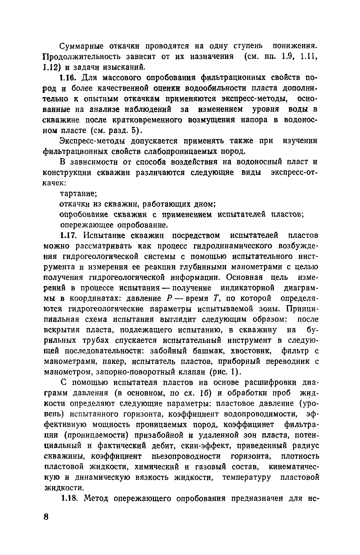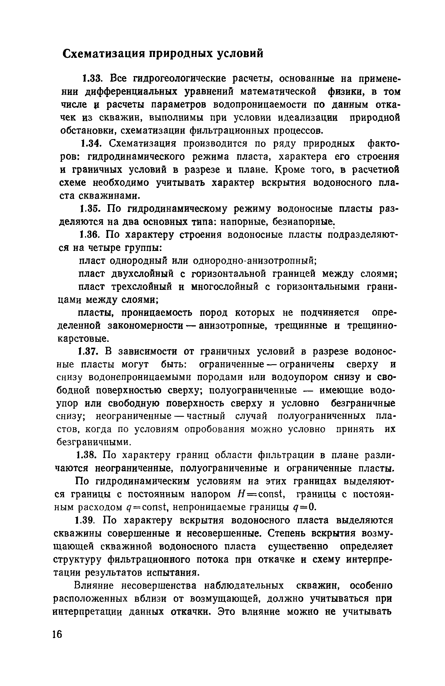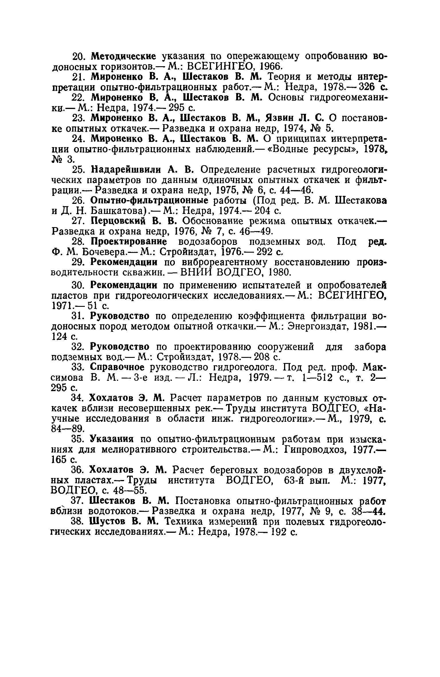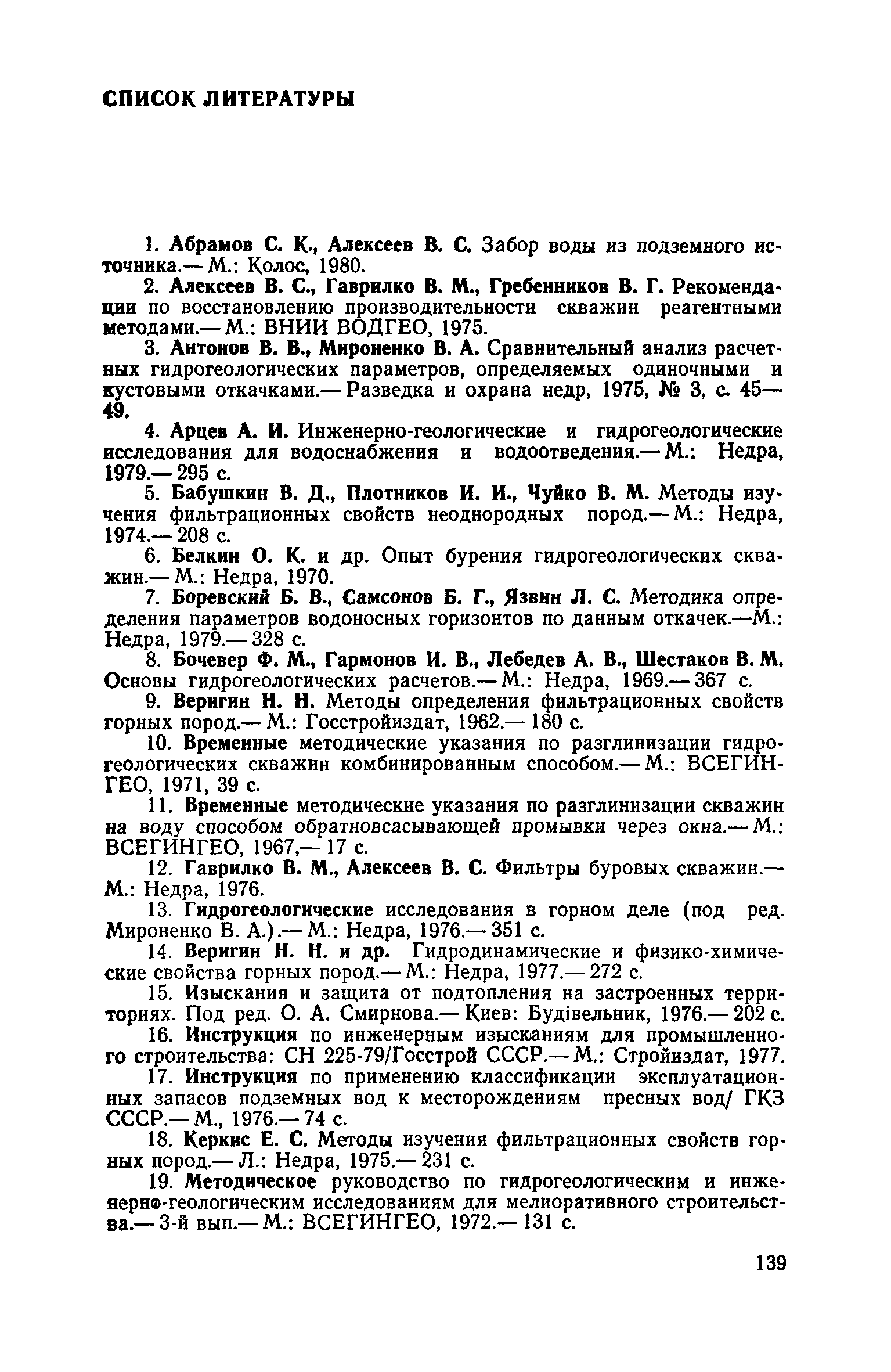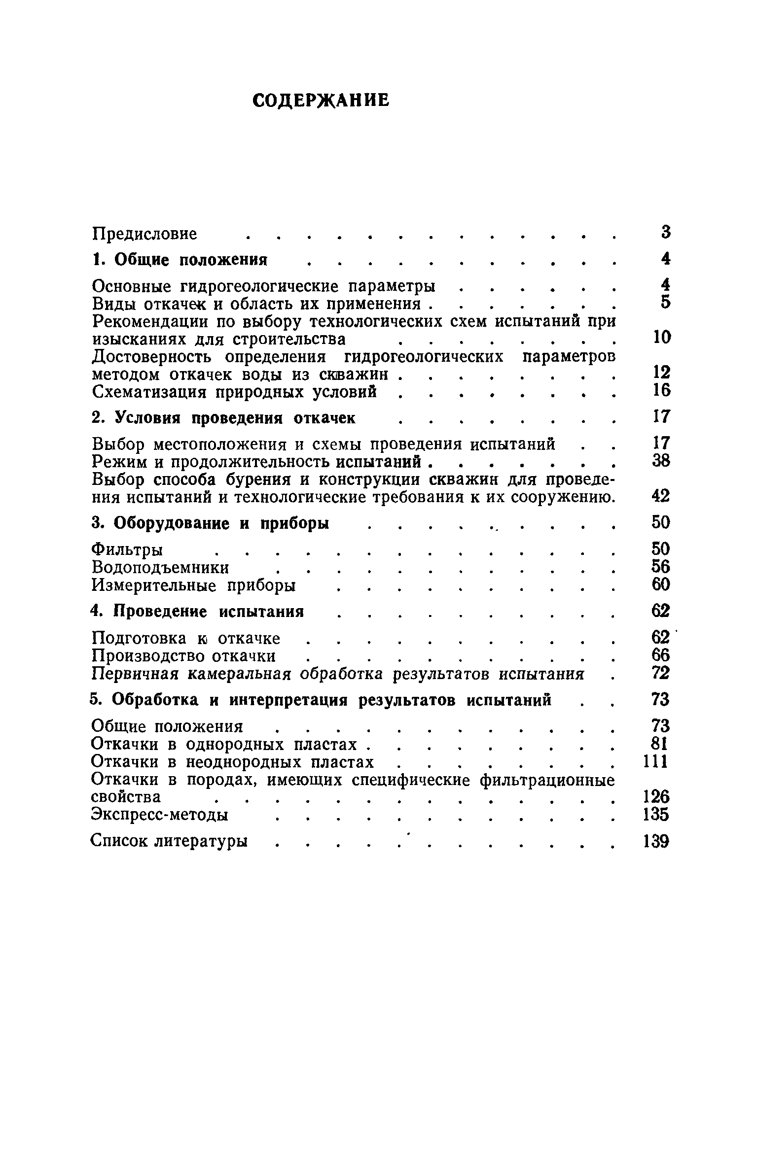 | Оглавление: | Предисловие 1. Общие положения Основные гидрологические параметры Виды откачек и область их применения Рекомендации по выбору технологических схем испытаний при изысканиях для строительства Достоверность определения гидрологических параметров методом откачек воды из скважин Схематизация природных условий 2. Условия проведения откачек Выбор местоположения и схемы проведения испытаний Режим и продолжительность испытаний Выбор способа бурения и конструкции скважин для проведения испытаний и технологические требования к их сооружению 3. Оборудование и приборы Фильтры Водоподъемники Измерительные приборы 4. Проведение испытания Подготовка к откачке Производство откачки Первичная камеральная обработка результатов испытания 5. Обработка и интерпретация результатов испытаний Общие положения Откачки в однородных пластах Откачки в неоднородных пластах Откачки в породах, имеющих специфические фильтрационные свойства Экспресс методы Список литературы |