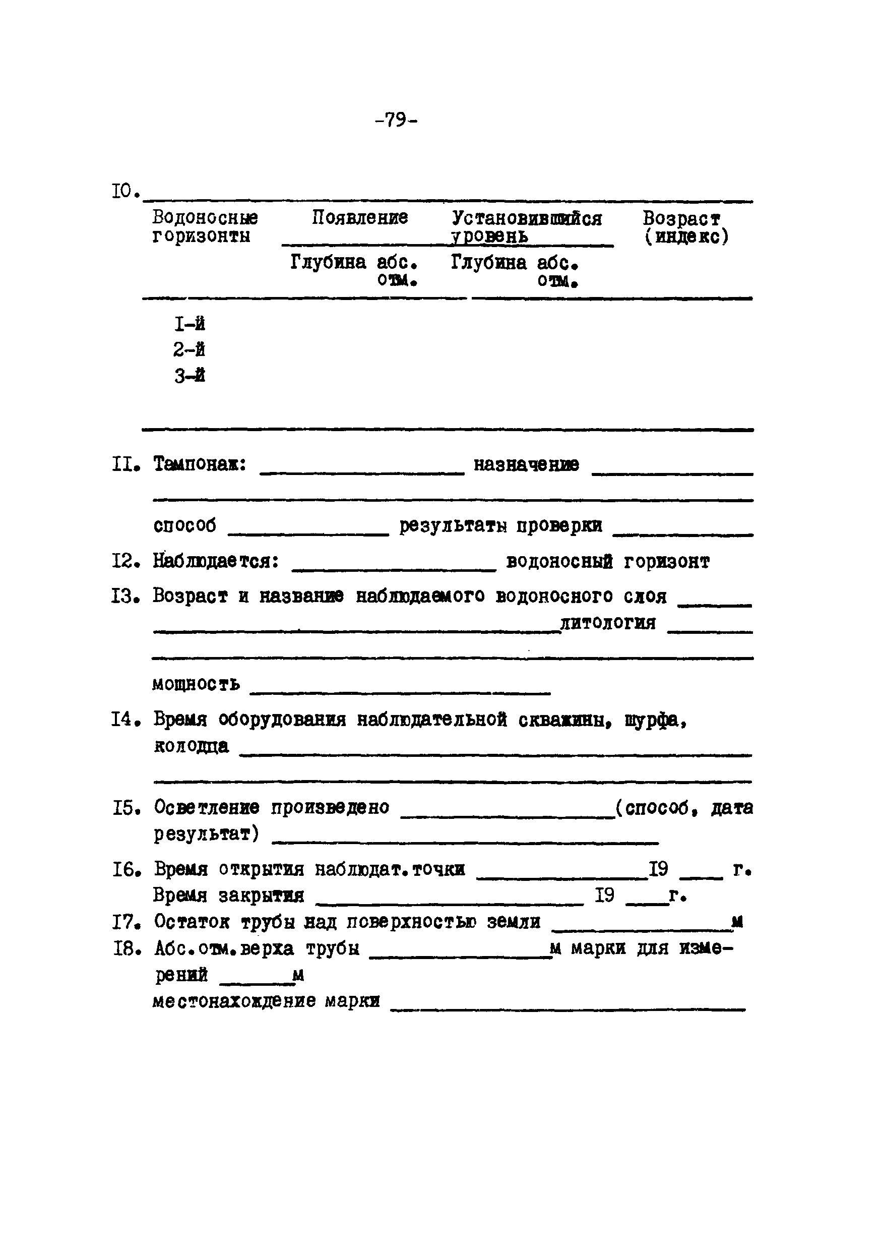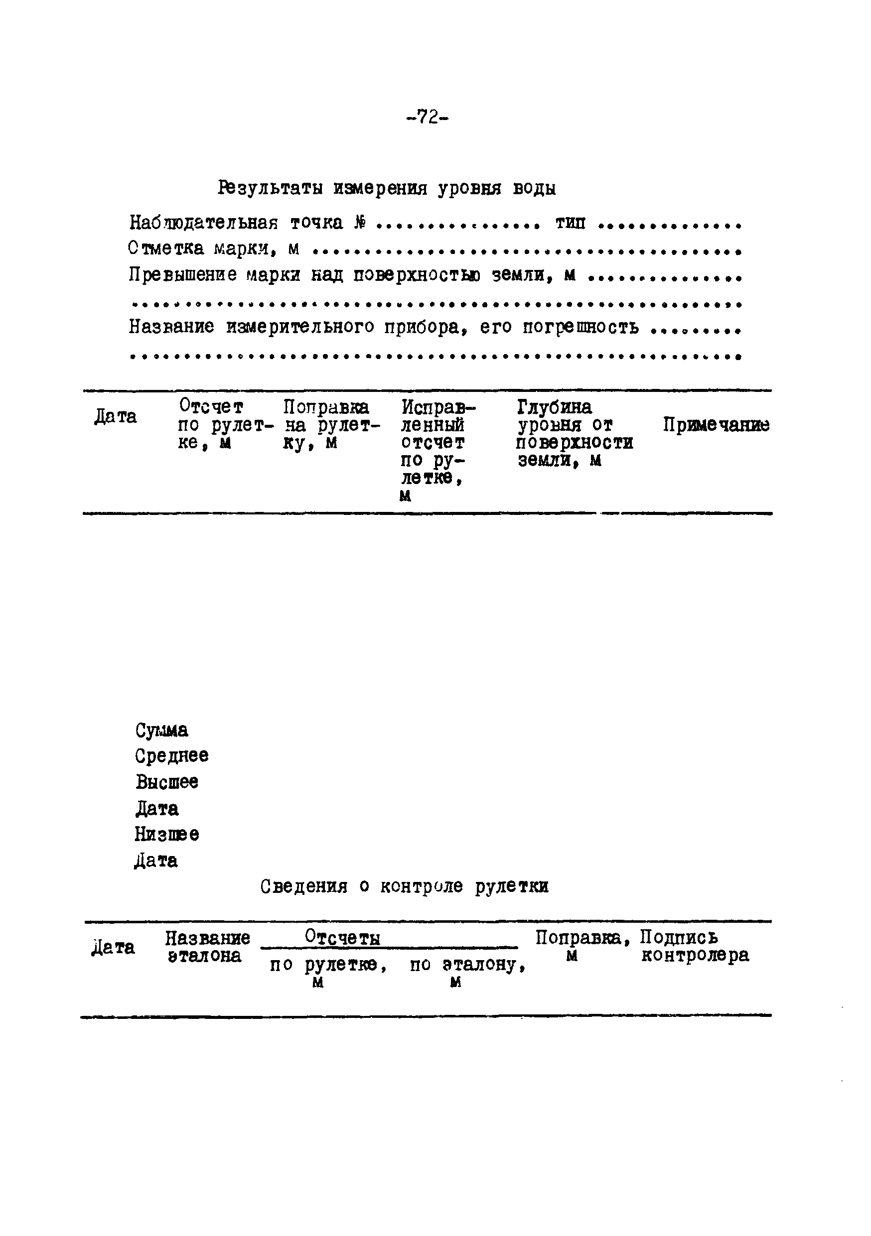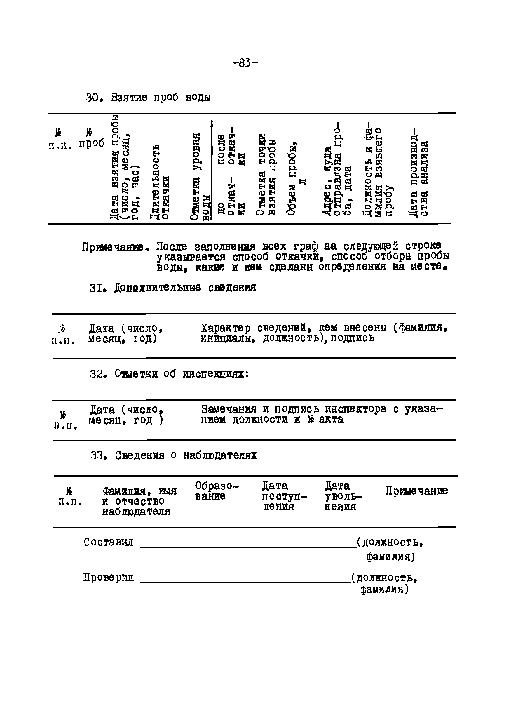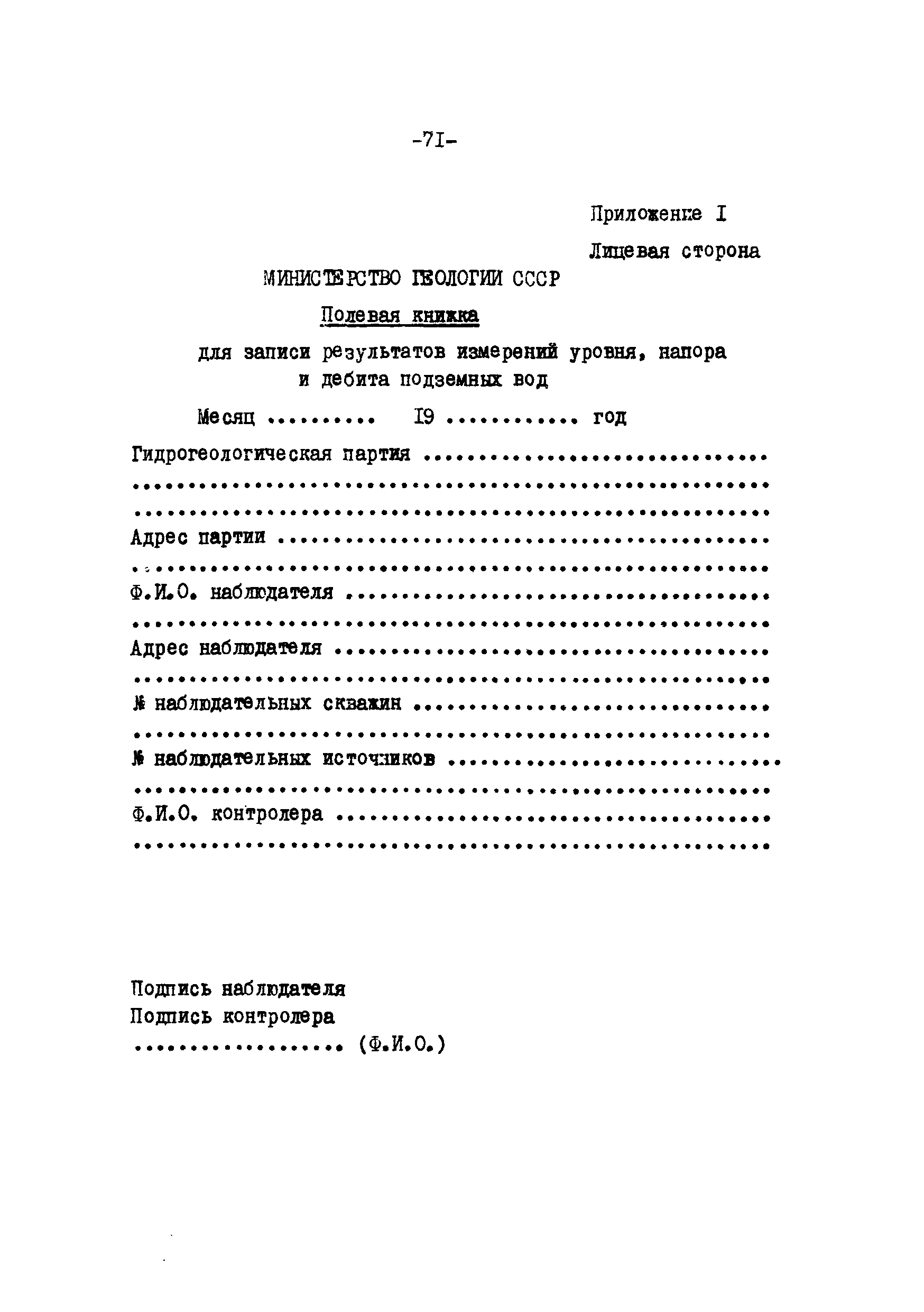 | Оглавление: | Введение 1. Назначение и задачи наблюдений 2. Требования к составу и размещению сети наблюдательных пунктов 3. Оборудование и конструкции наблюдательных скважин 4. Особенности изучения режима уровня, напора и дебита подземных вод для различных целей 5. Методика производства наблюдений 6. Контроль работы наблюдательной сети 7. Документация и обработка данных наблюдений 8. Приборы и оборудование для наблюдений Список литературы Приложение 1 Приложение 2 Приложение 3 |