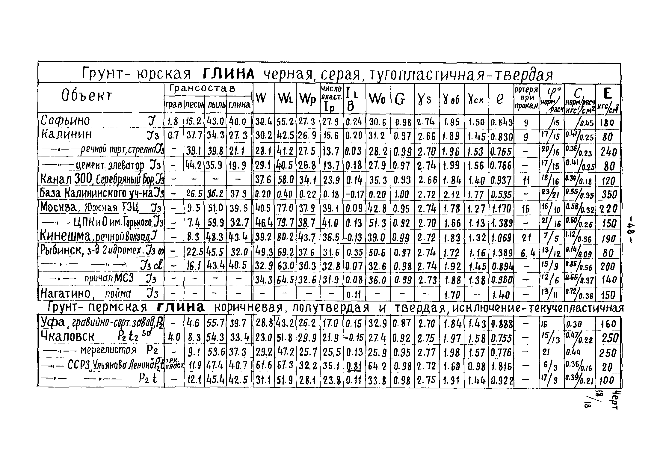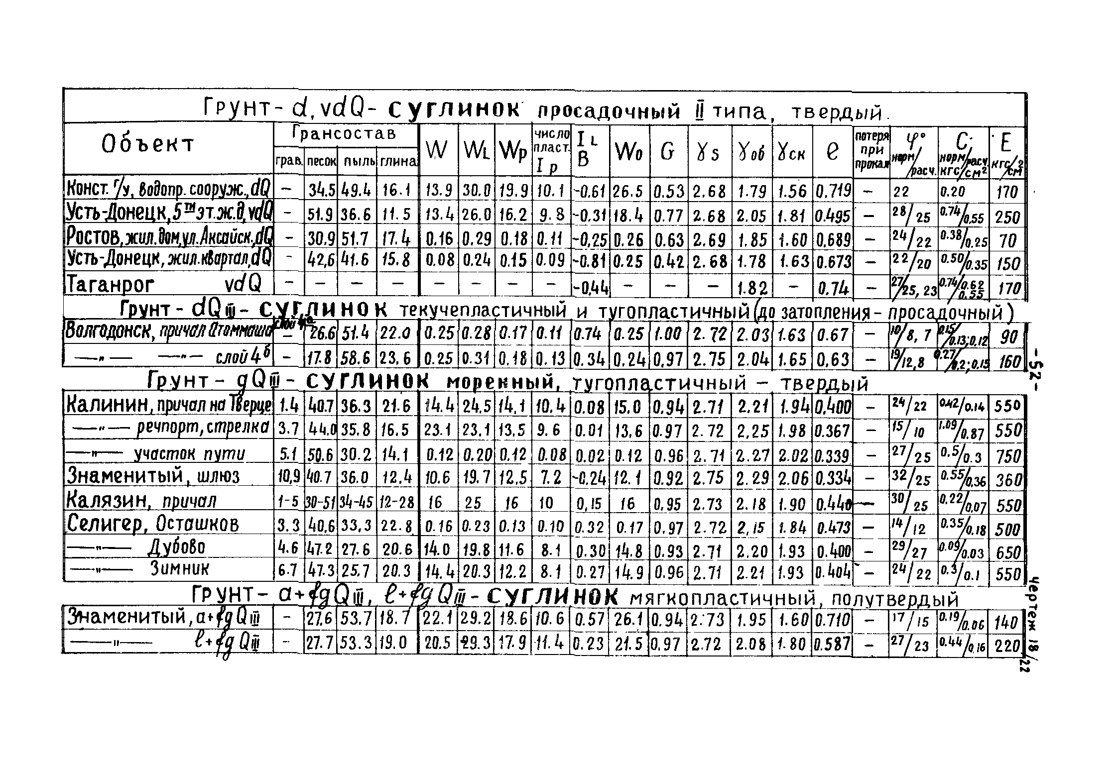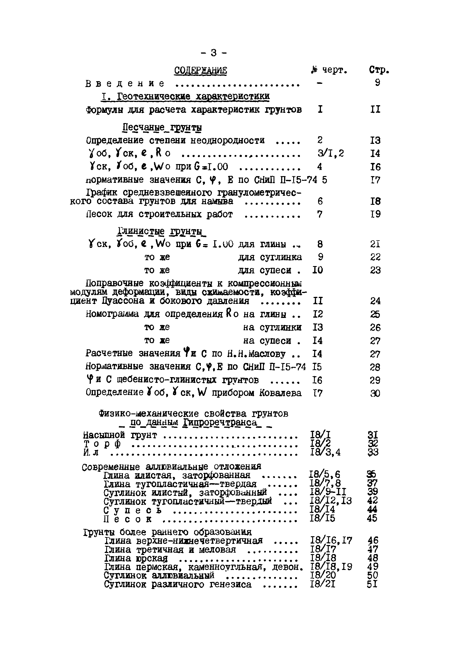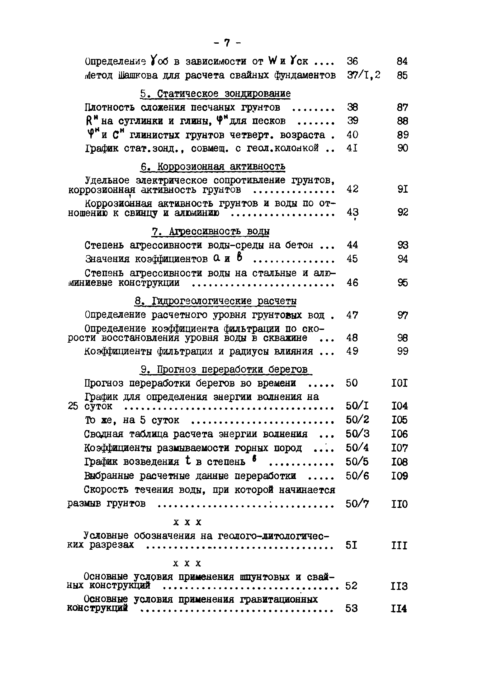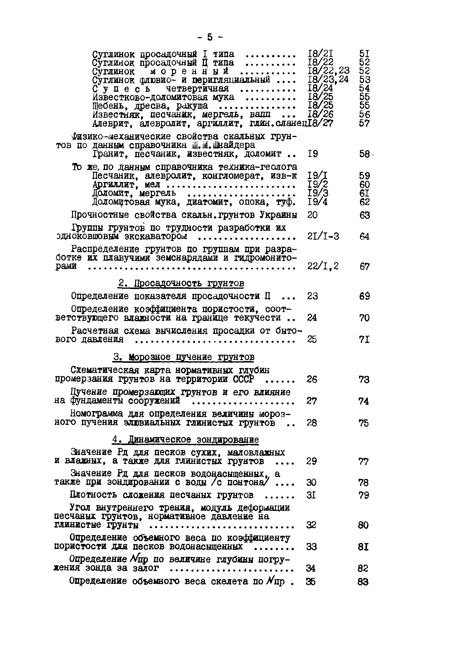 | Оглавление: | Введение 1. Геотехнические характеристики Формулы для расчета характеристик грунтов Песчаные грунты Глинистые грунты Физико-механические свойства грунтов по данным Гипроречтранса Насыпной грунт Торф Ил Современные аллювиальные отложения Грунты более раннего образования Физико-механические свойства скальных грунтов по данным справочника Ш.М.Шнайдера То же, по данным справочника техника-геолога Прочностные свойства скальных грунтов Украины Группы грунтов по трудности разработки их одноковшовым экскаватором Распределение грунтов по группам при разработке их плавучими земснарядами и гидромониторами 2. Просадочность грунтов Определение показателя просадочности П Определение коэффициента пористости, соответствующего влажности на границе текучести Расчетная схема вычисления просадки от бытового давления 3. Морозное пучение грунтов Схематическая карта нормативных глубин промерзания грунтов на территории СССР Пучение промерзающих грунтов и его влияние на фундаменты сооружений Номограмма для определения величины морозного пучения элювиальных глинистых грунтов 4. Динамическое зондирование 5. Статическое зондирование 6. Коррозионная активность 7. Агрессивность среды 8. Гидрогеологические расчеты 9. Прогноз переработки берегов Условные обозначения на геолого-литологических разрезах Основные условия применения шпунтовых и свайных конструкций Основные условия применения гравитационных конструкций |