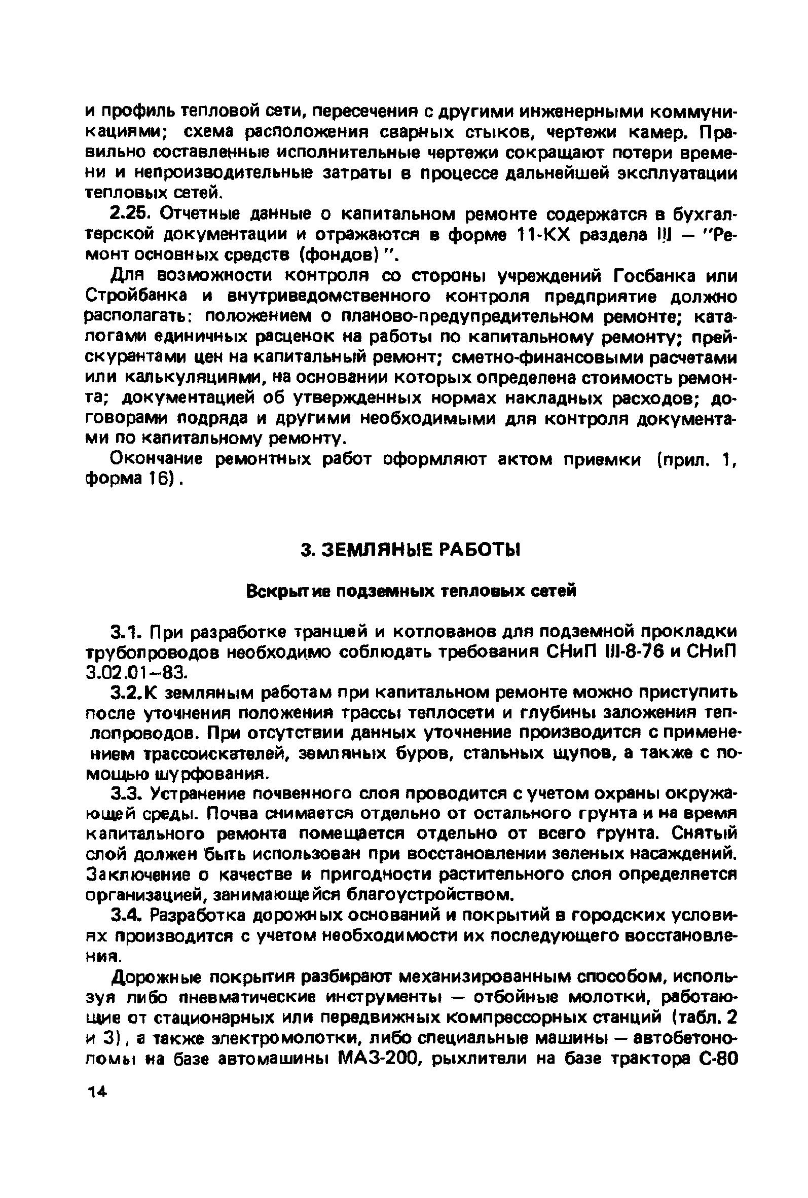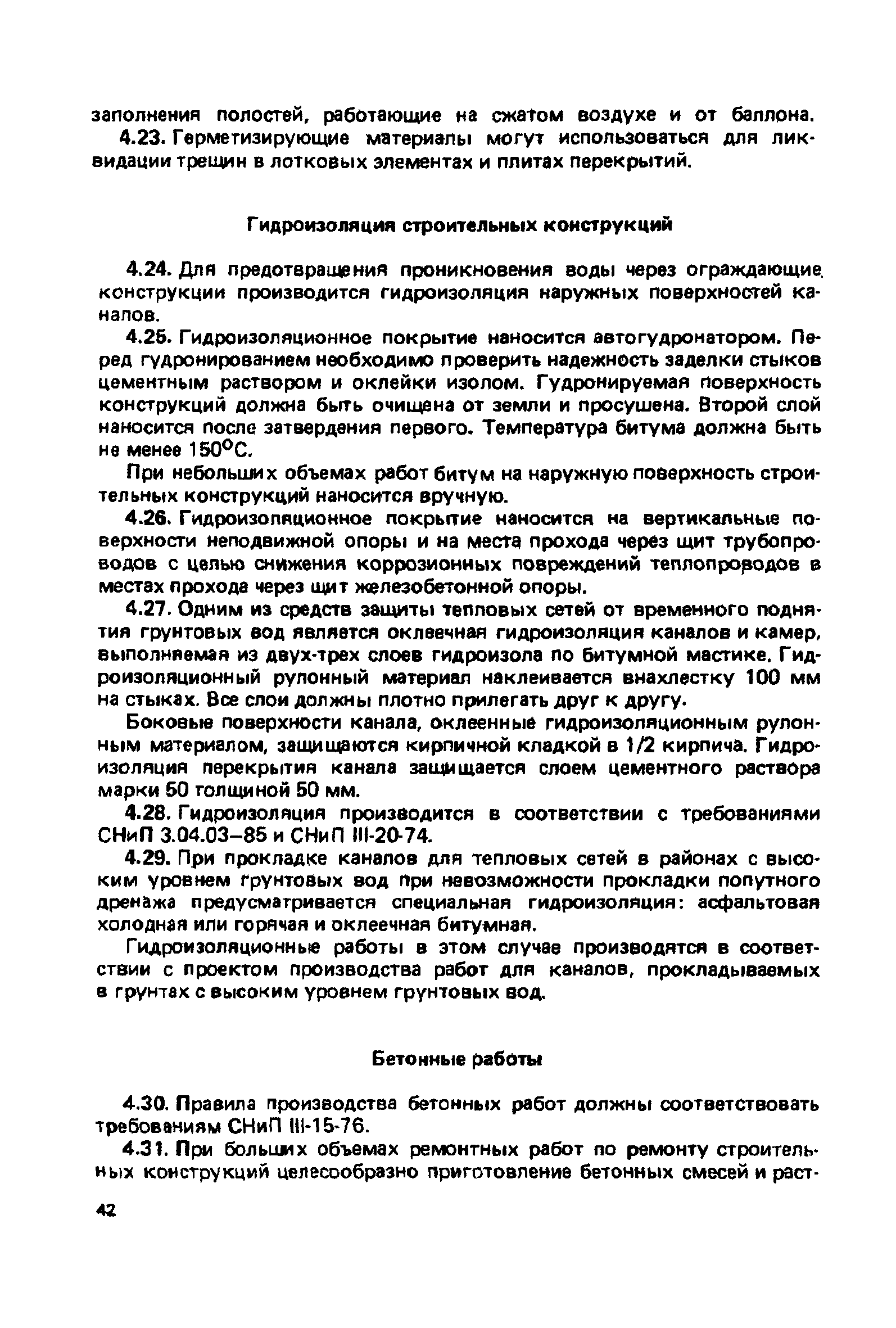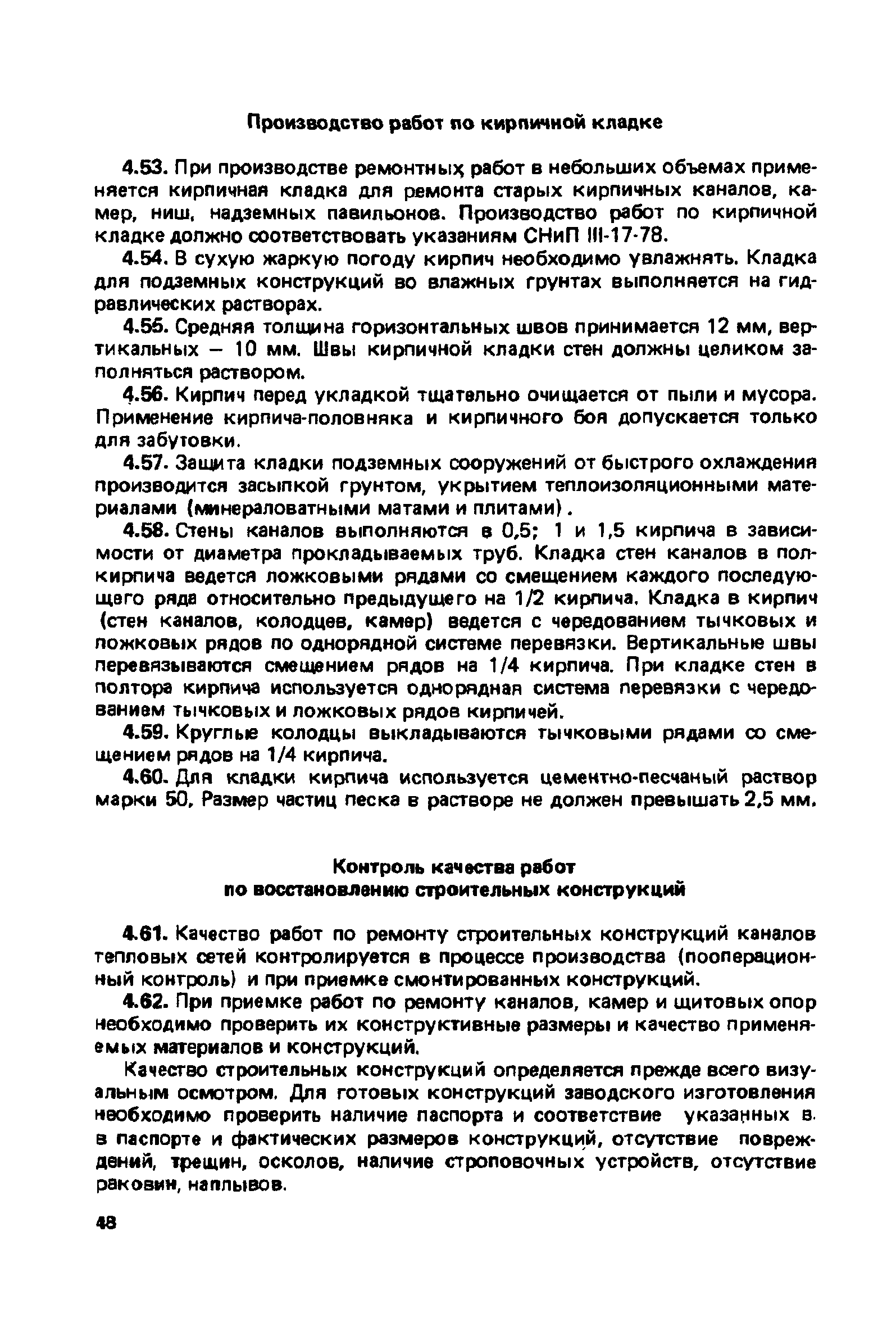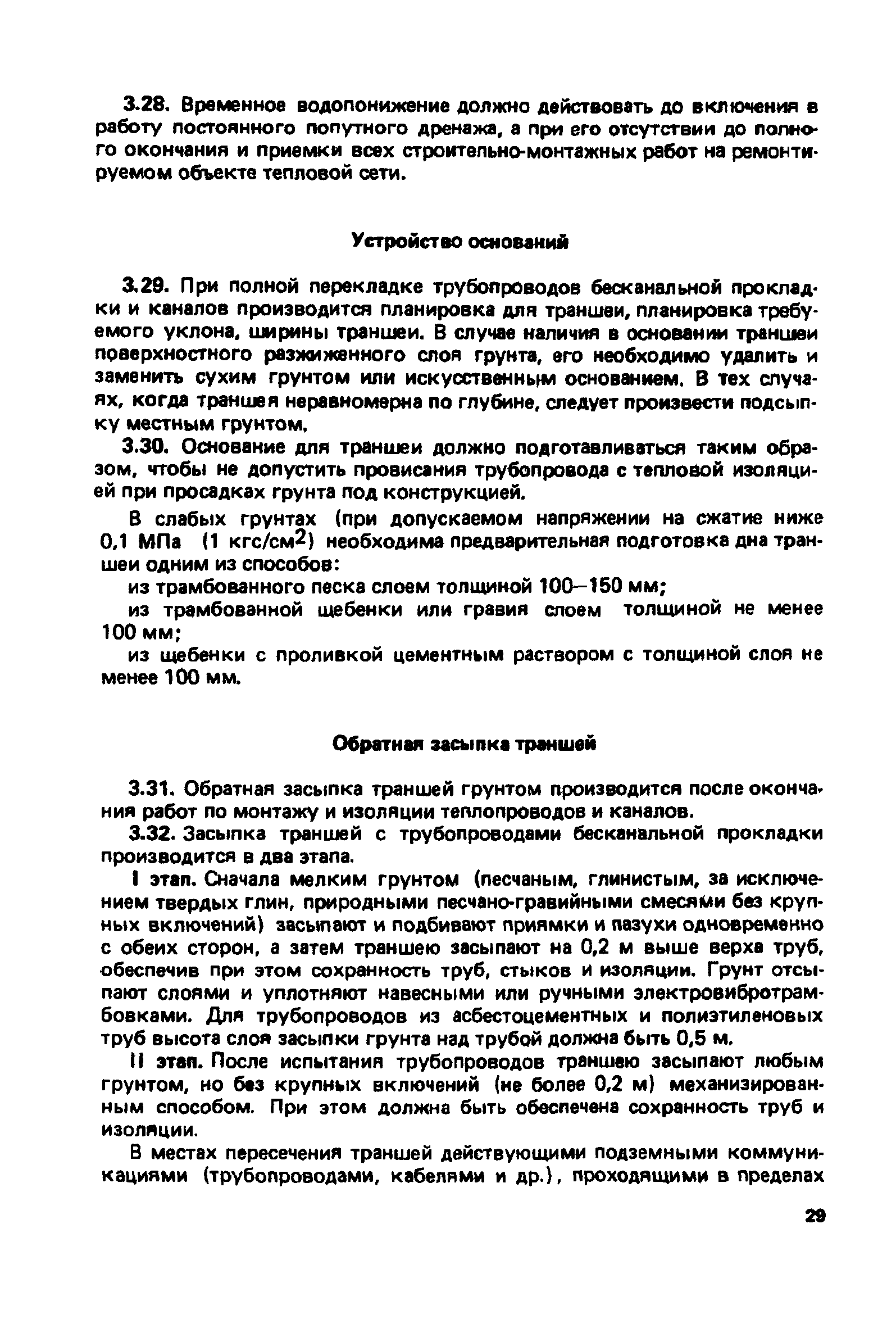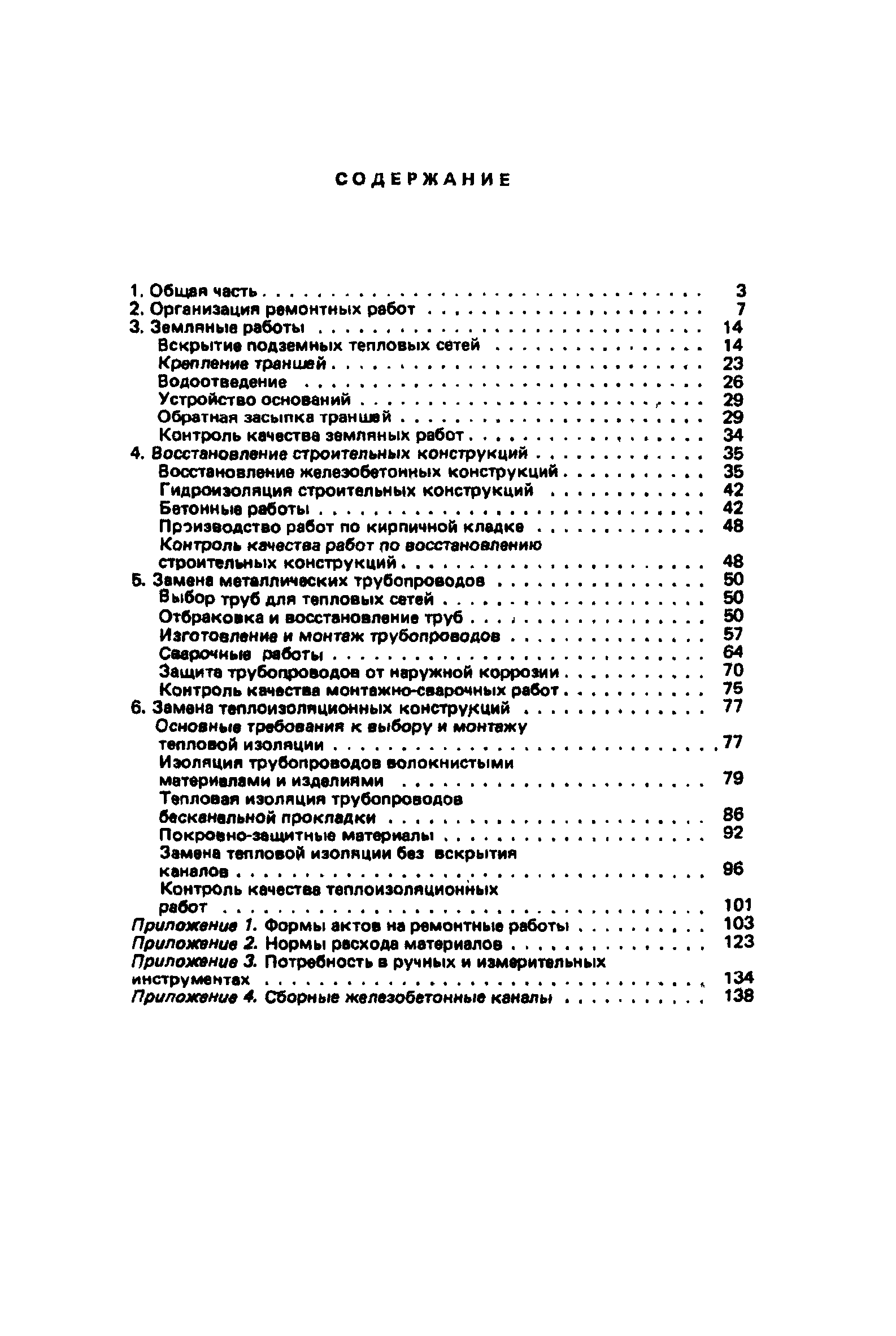 | Оглавление: | 1. Общая часть 2. Организация ремонтных работ 3. Земляные работы Вскрытие подземных тепловых сетей Крепление траншей Водоотведение Устройство оснований Обратная засыпка траншей Контроль качества земляных работ 4. Восстановление строительных конструкций Восстановление железобетонных конструкций Гидроизоляция строительных конструкций Бетонные работы Производство работ по кирпичной кладке контроль качества работ по восстановлению строительных конструкций 5. Замена металлических трубопроводов Выбор труб для тепловых сетей Отбраковка и восстановление труб Изготовление и монтаж трубопроводов Сварочные работы Защита трубопроводов от наружной коррозии Контроль качества монтажно-сварочных работ 6. Замена теплоизоляционных конструкций Основные требования к выбору и монтажу тепловой изоляции Изоляция трубопроводов волокнистыми материалами и изделиями Тепловая изоляция трубопроводов бесканальной прокладки Покровно-защитные материалы Замена тепловой изоляции без вскрытия каналов Контроль качества теплоизоляционных работ Приложение 1. Формы актов на ремонтные работы Приложение 2. Нормы расхода материалов Приложение 3. Потребность в ручных и измерительных инструментах Приложение 4. Сборные железобетонные каналы |