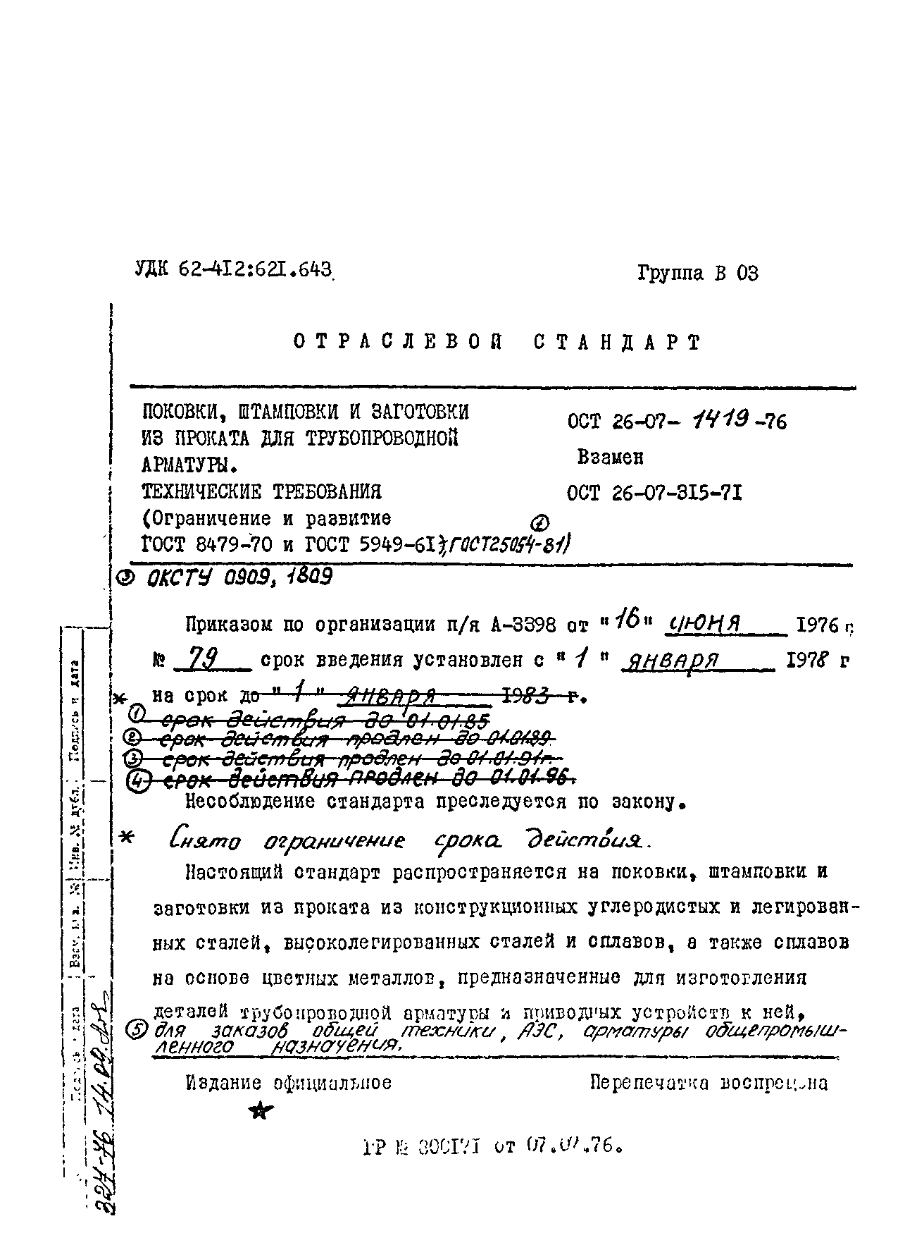 | | Список изменений: | | | Заменяет собой: | - ОСТ 26-07-315-71 «Поковки, штамповки и заготовки из проката для трубопроводной арматуры. Технические требования»