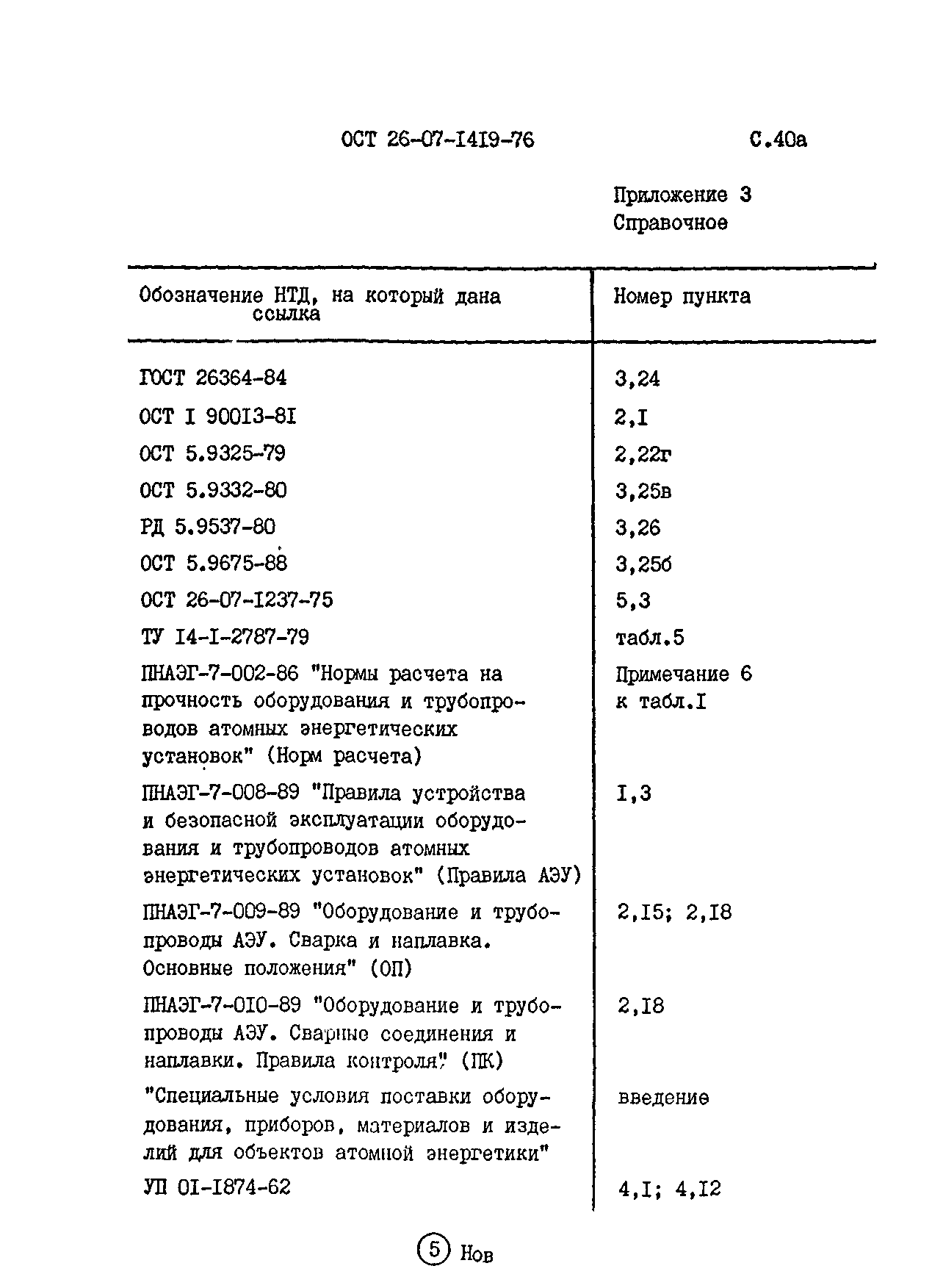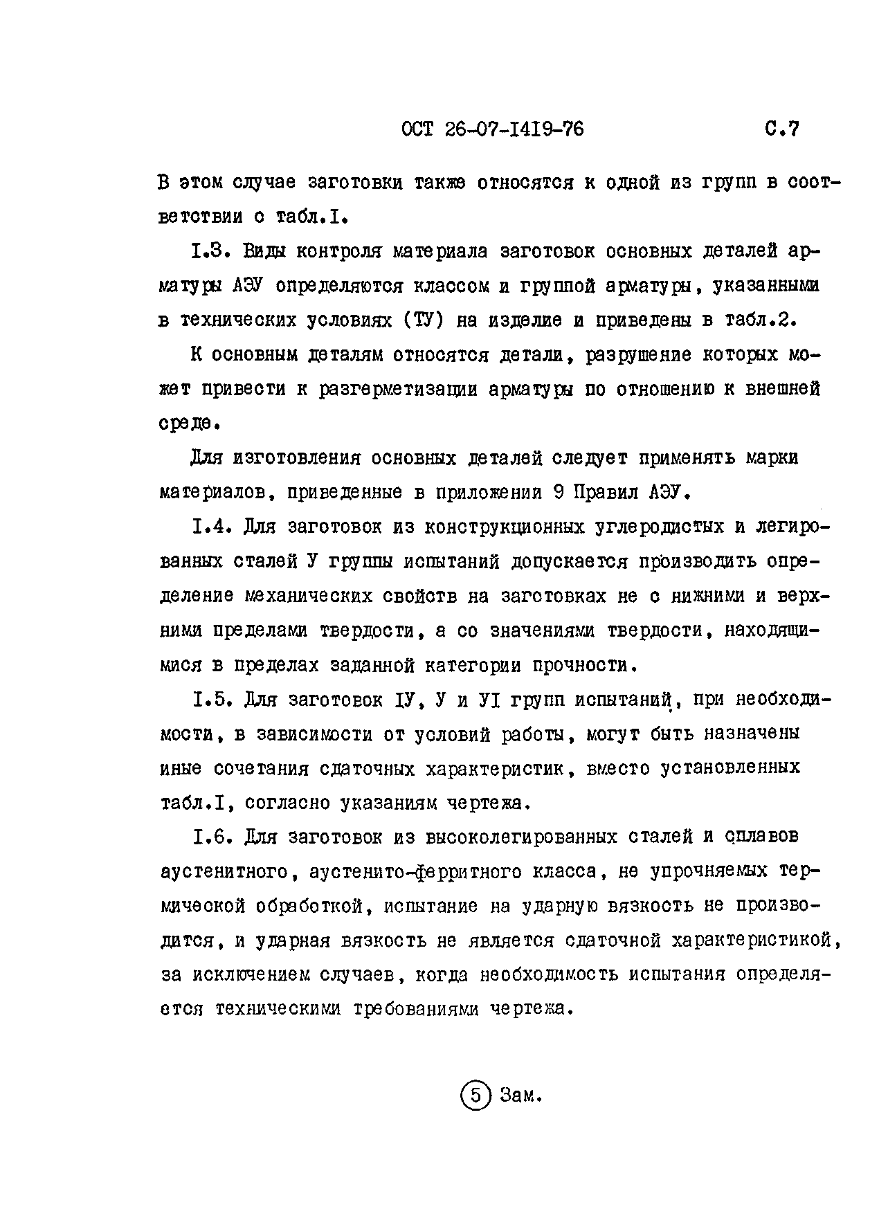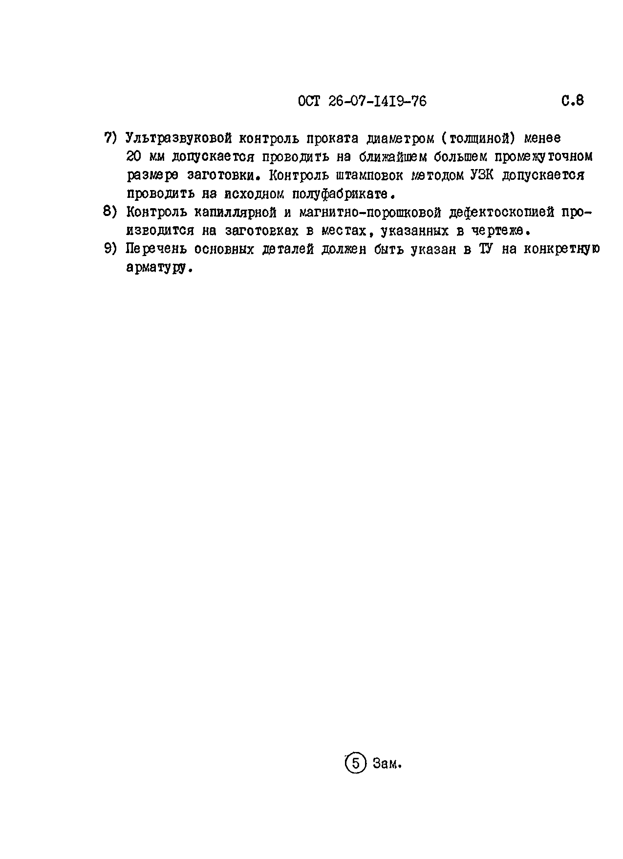 Поковки, штамповки и заготовки из проката для трубопроводной арматуры. Технические требования| Обозначение: | ОСТ 26-07-1419-76 | | Обозначение англ: | OST 26-07-1419-76 | | Статус: | не действует | | Название рус.: | Поковки, штамповки и заготовки из проката для трубопроводной арматуры. Технические требования | | Дата добавления в базу: | 01.09.2013 | | Дата актуализации: | 01.01.2021 | | Дата введения: | 01.01.1978 | | Дата окончания срока действия: | 01.10.2005 | | Область применения: | Стандарт распространяется на поковки, штамповки и заготовки из проката из конструкционных углеродистых и легированных сталей, высоколегированных сталей и сплавов, а также сплавов на основе цветных металлов, предназначенные для изготовления деталей трубопроводной арматуры и приводных устройств к ней, для заказов общей техники. АЭС, арматуры общепромышленного назначения. | | Оглавление: | 1. Классификация 2. Технические требования 3. Методы испытаний 4. Правила приёмки 5. Порядок оформления в чертеже технических требований, предъявляемых к деталям, изготовляемым из заготовок Приложение 1 Приложение 2 | | Утверждён: | 16.06.1976 П/я А-3398 (79)