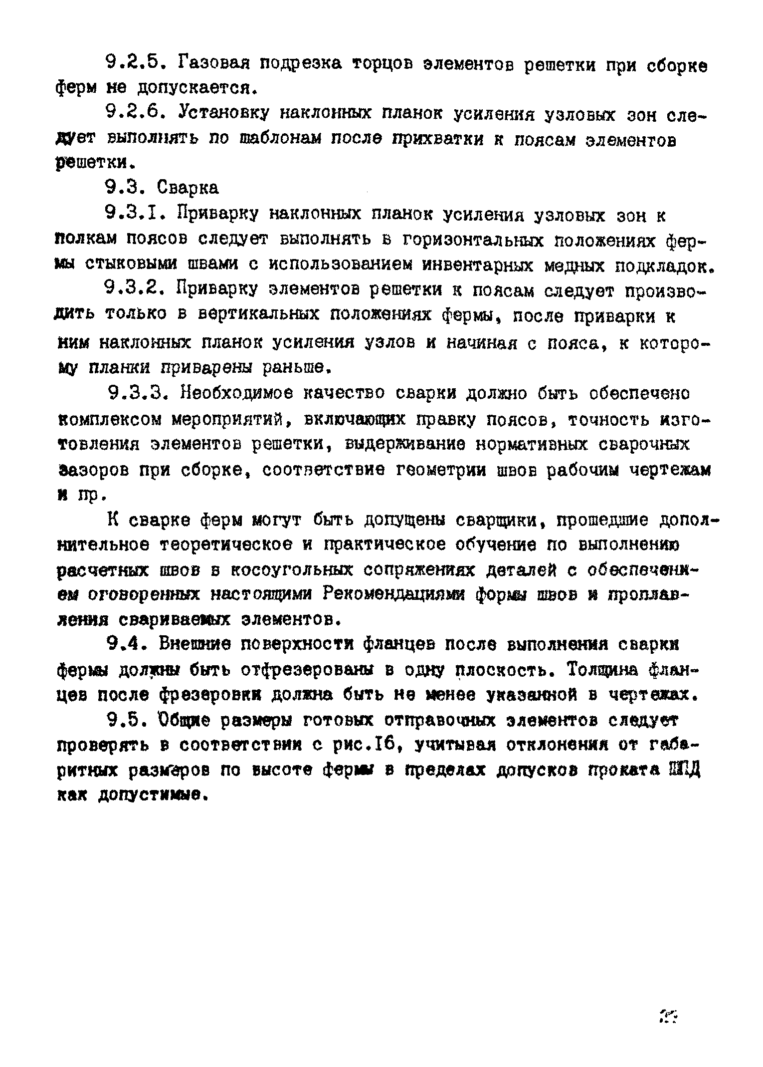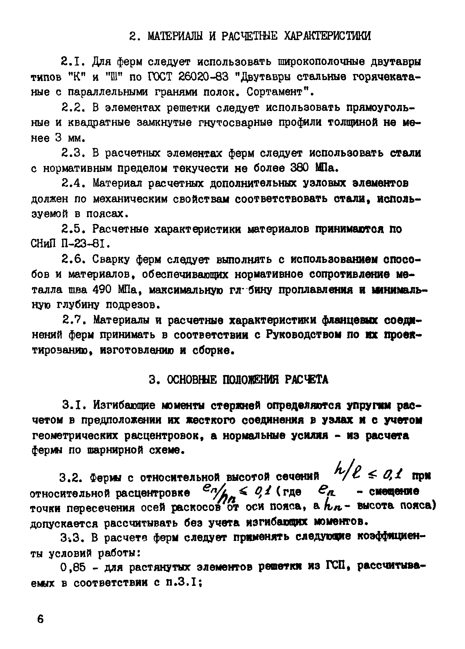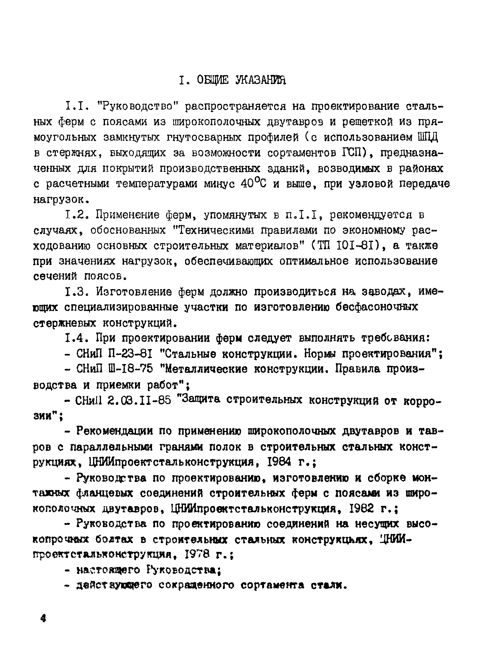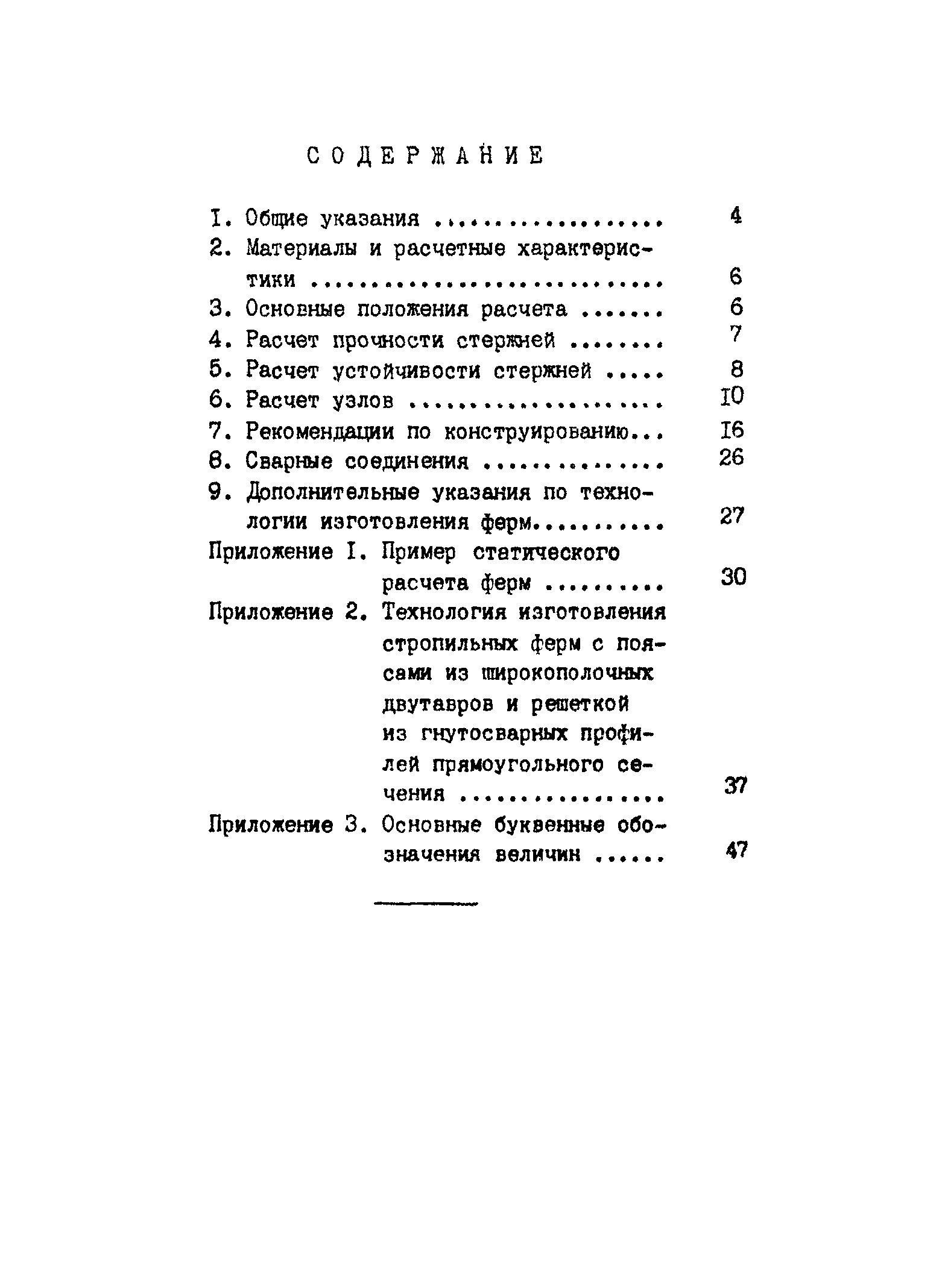 | Оглавление: | 1. Общие указания 2. Материалы и расчетные характеристики 3. Основные положения расчета 4. Расчет прочности стержней 5. Расчет устойчивости стержней 6. Расчет узлов 7. Рекомендации по конструированию 8. Сварные соединения 9. Дополнительные указания по технологии изготовления ферм Приложение 1. Пример статического расчета ферм Приложение 2. Технология изготовления стропильных ферм с поясами из широкополочных двутавров и решеткой из гнутосварных профилей прямоугольного сечения Приложение 3. Основные буквенные обозначения величин |