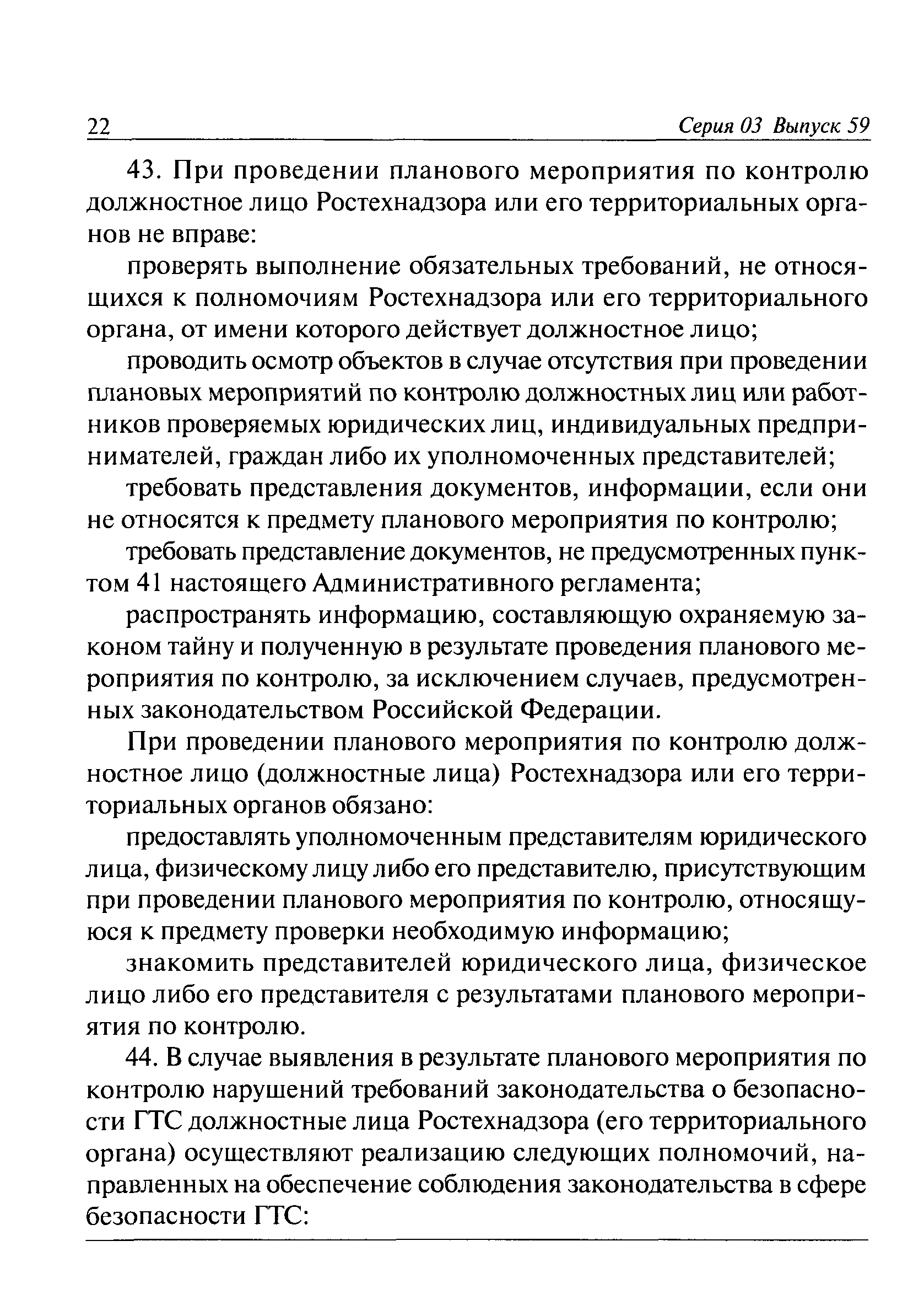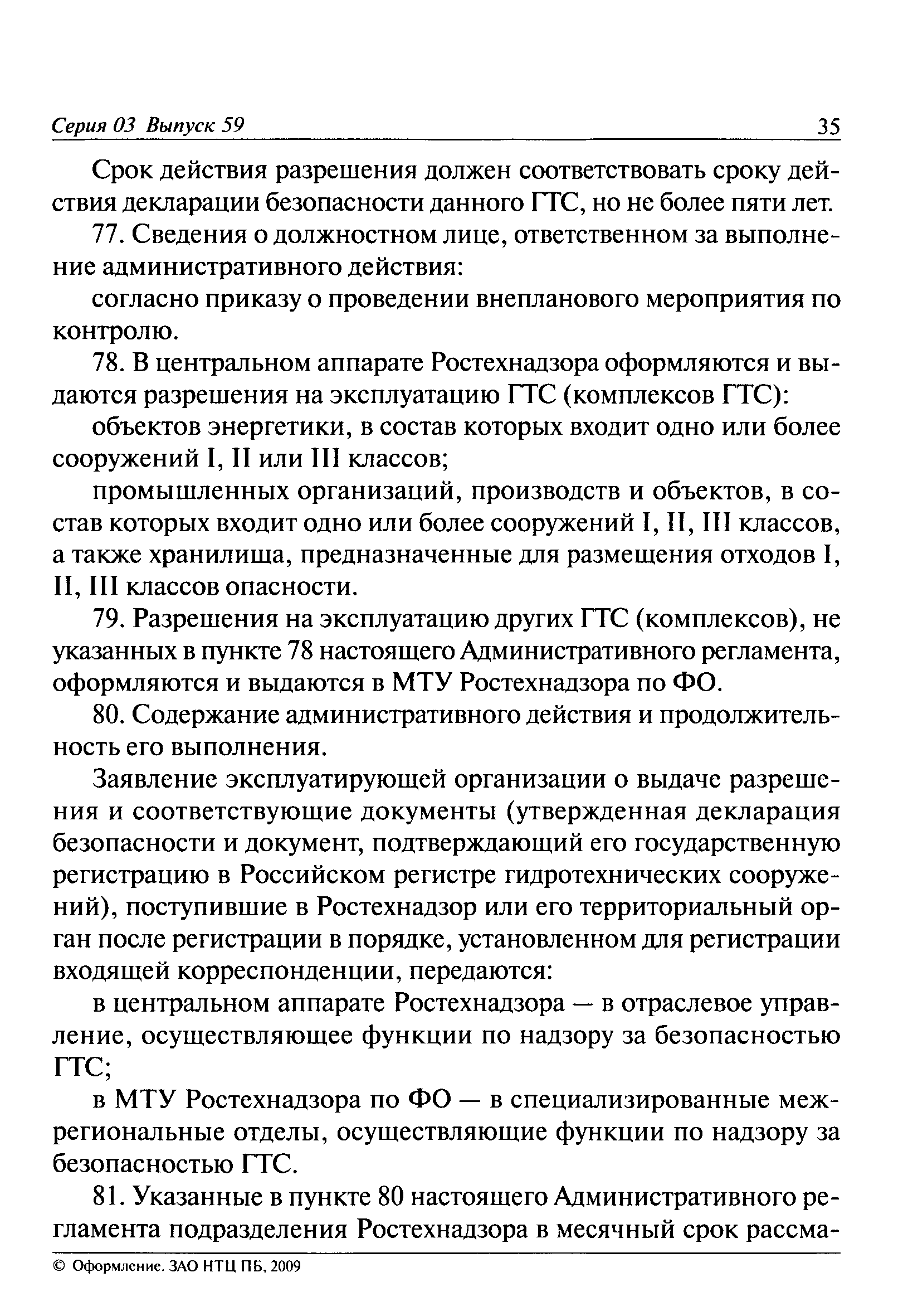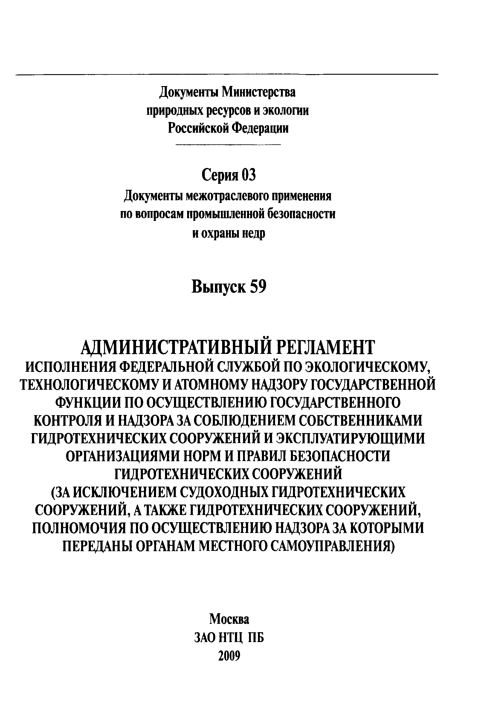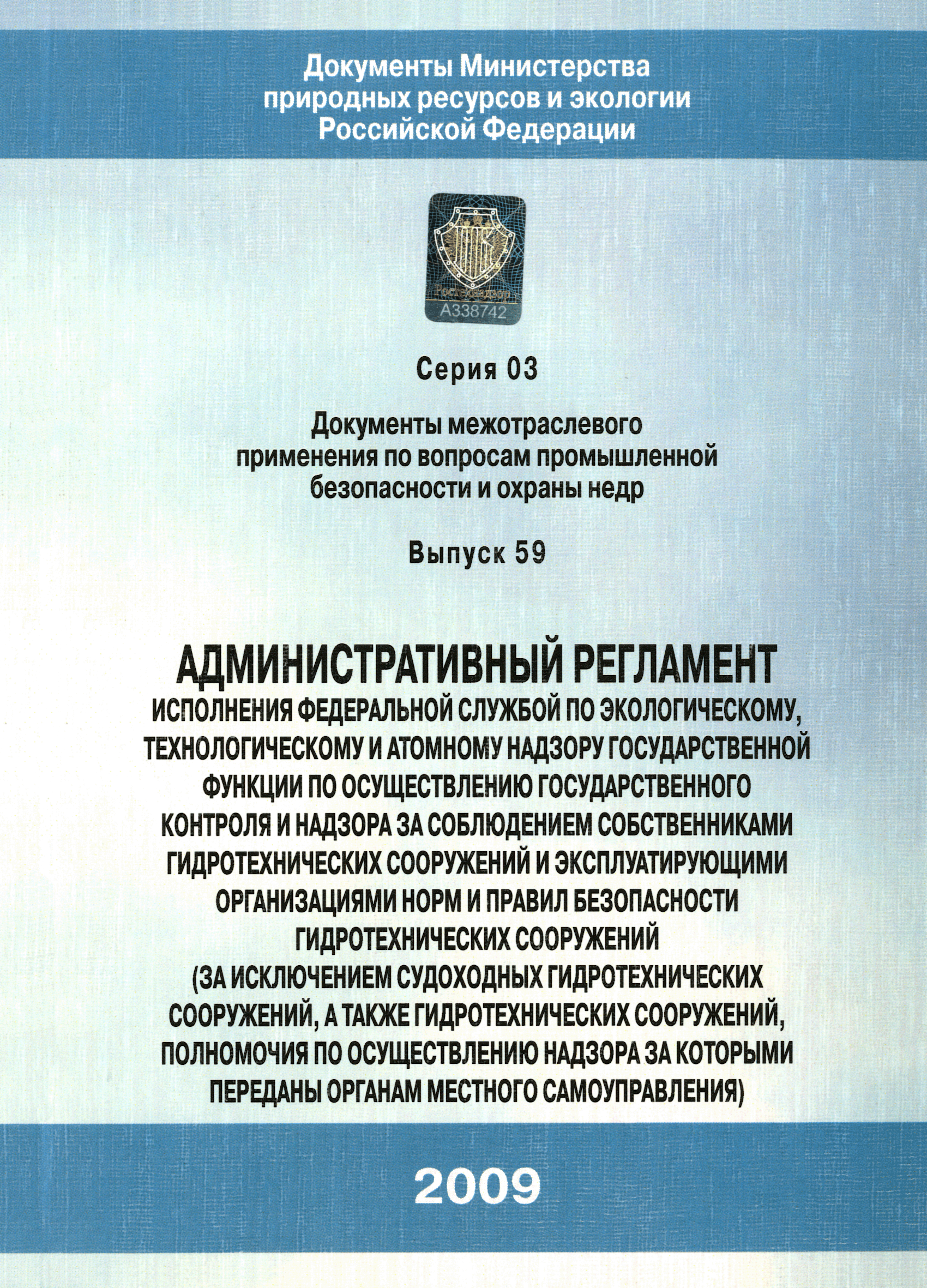 | Название рус.: | Административный регламент исполнения Федеральной службой по экологическому, технологическому и атомному надзору государственной функции по осуществлению государственного контроля и надзора за соблюдением собственниками гидротехнических сооружений и эксплуатирующими организациями норм и правил безопасности гидротехнических сооружений (за исключением судоходных гидротехнических сооружений, а также гидротехнических сооружений, полномочия по осуществлению надзора за которыми переданы органам местного самоуправления) |