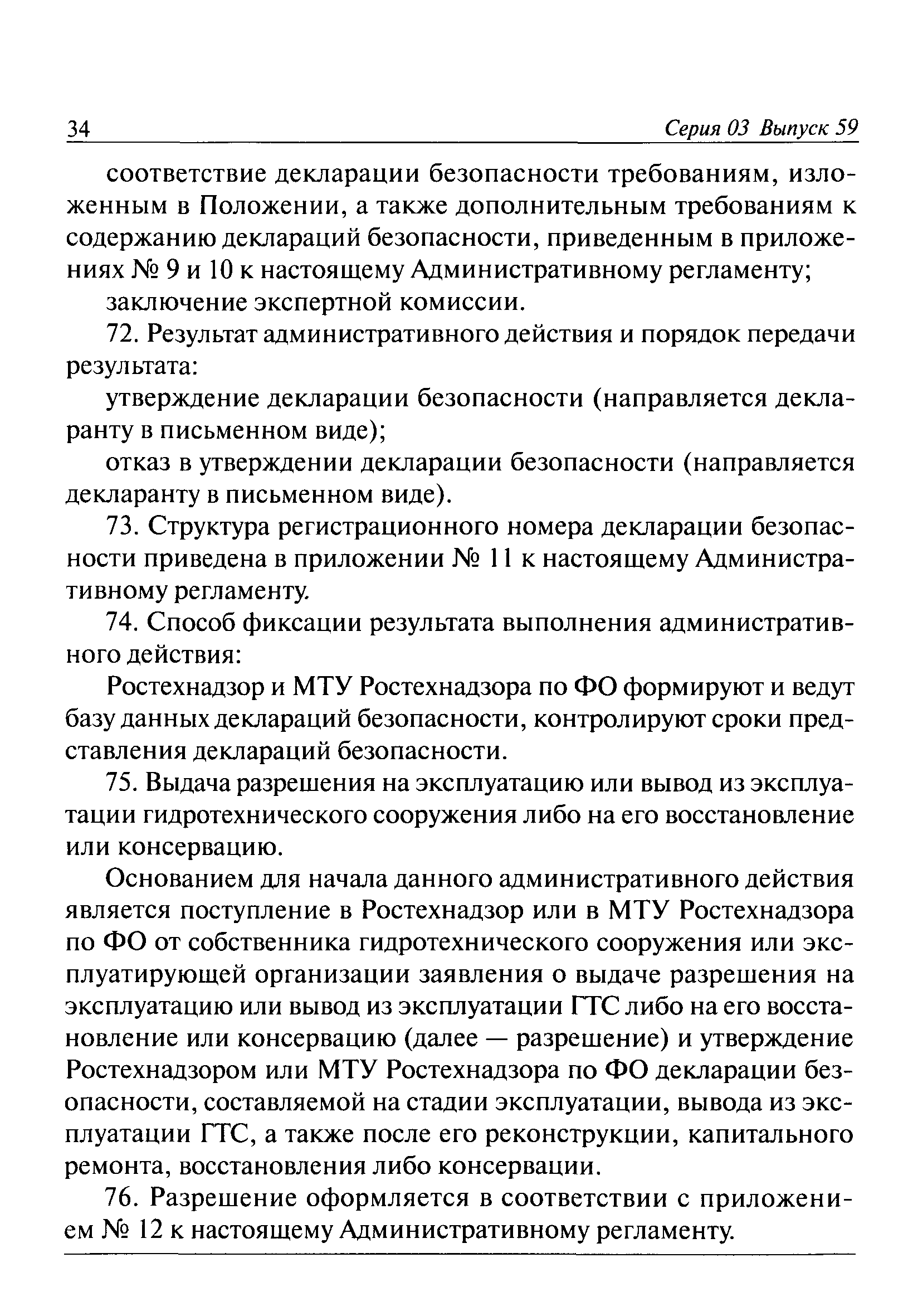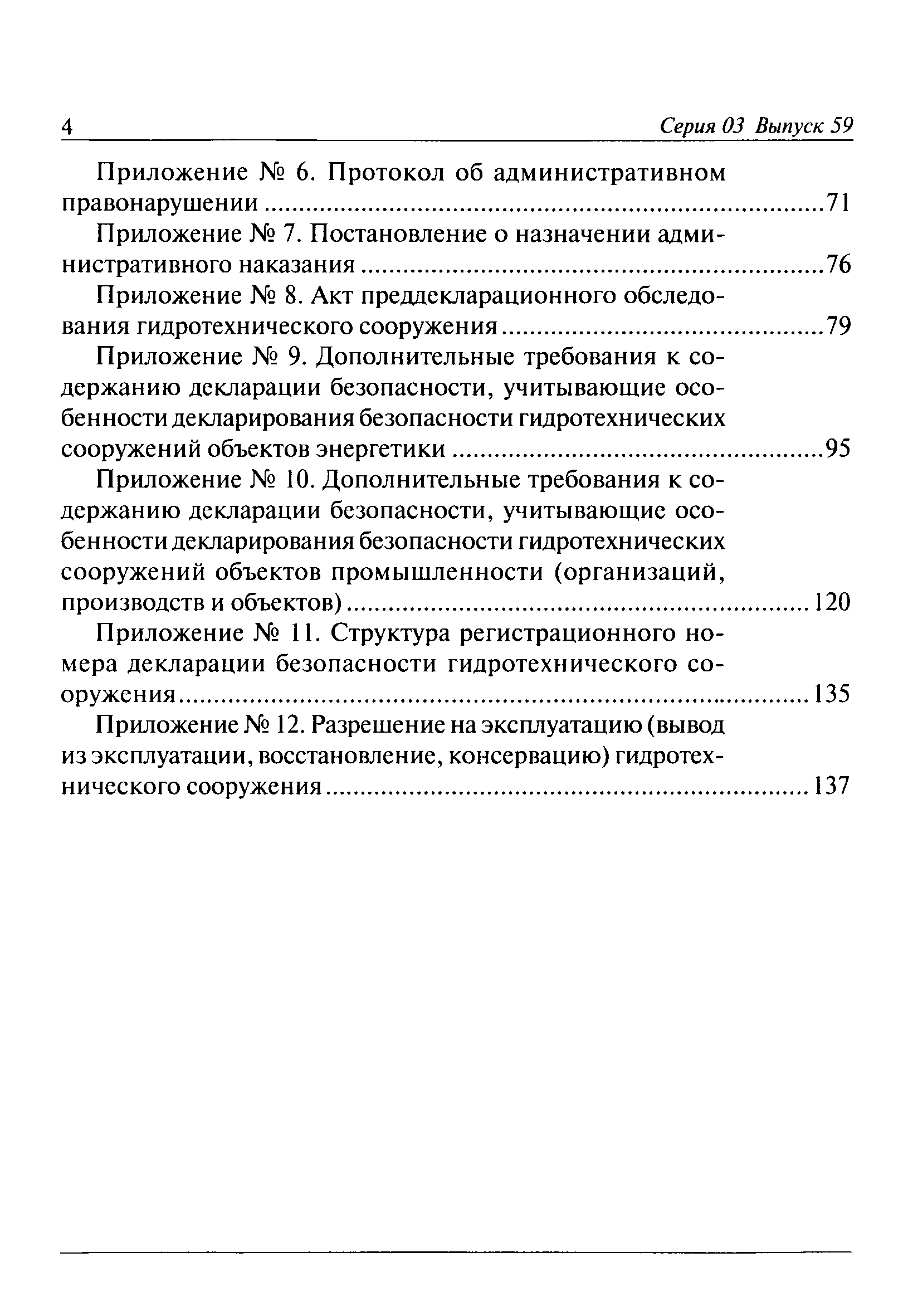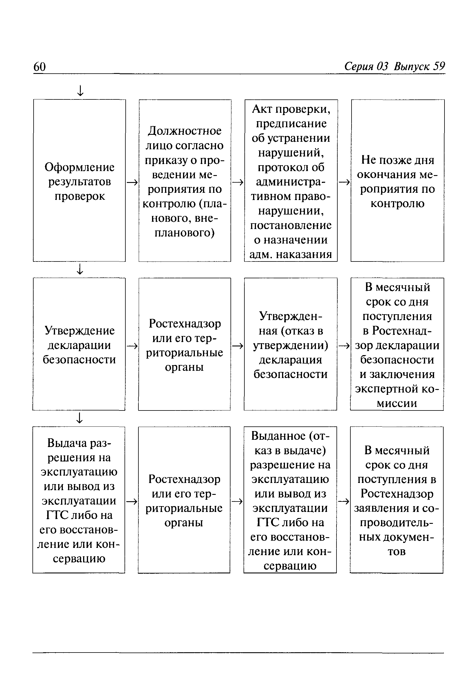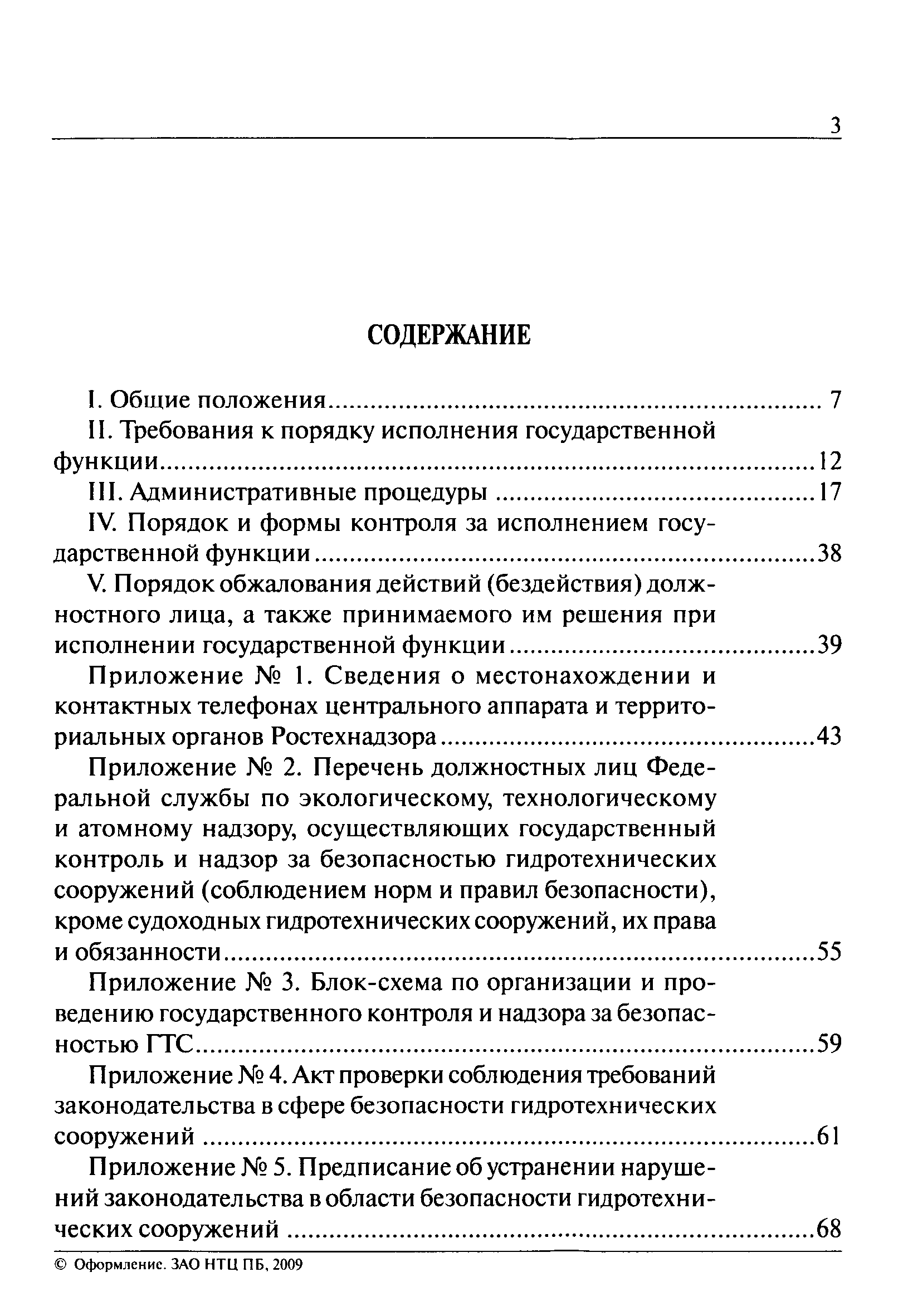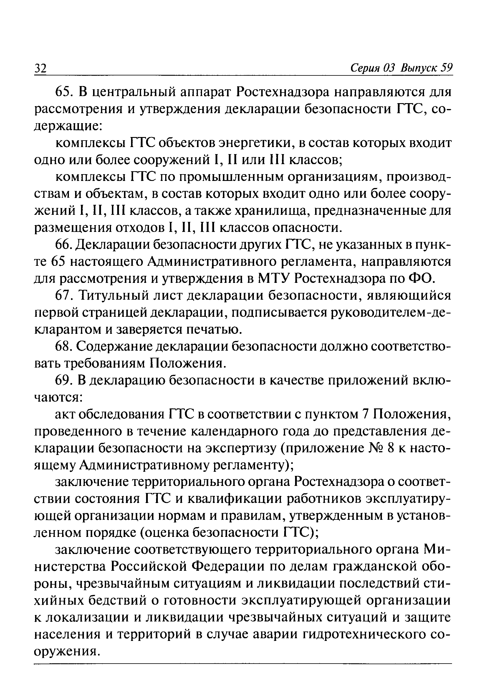| Оглавление: | I. Общие положения II. Требования к порядку исполнения государственной функции III. Административные процедуры IV. Порядок и формы контроля за исполнением государственной функции V. Порядок обжалования действий (бездействий) должностного лица, а также принимаемого им решения при исполнении государственной функции Приложение № 1 Сведения о местонахождении и контактных телефонах центрального аппарата и территориальных органов Ростехнадзора Приложение № 2 Перечень должностных лиц Федеральной службы по экологическому, технологическому и атомному надзору, осуществляющих государственный контроль и надзор за безопасностью гидротехнических сооружений (соблюдением норм и правил безопасности), кроме судоходных гидротехнических сооружений, их права и обязанности Приложение № 3 Блок-схема по организации и проведению государственного контроля и надзора за безопасностью ГТС Приложение № 4 Форма акта проверки соблюдения требований законодательства в сфере безопасности гидротехнических сооружений Приложение № 5 Форма предписания об устранении нарушений законодательства в области безопасности гидротехнических сооружений Приложение № 6 Форма протокола об административном правонарушении Приложение № 7 Форма постановления о назначении административного наказания Приложение № 8 Форма Акта преддекларационного обследования гидротехнического сооружения Приложение № 9 Дополнительные требования к содержанию декларации безопасности, учитывающие особенности декларирования безопасности гидротехнических сооружений объектов энергетики I. Общая информация II. Анализ безопасности гидротехнических сооружений III. Обеспечение готовности объекта к локализации и ликвидации опасных повреждений и аварий гидротехнических сооружений и действиям в условиях возникновения чрезвычайной ситуации IV. Информирование населения и органов исполнительной власти V. Заключение VI. Список источников информации, использованных при разработке декларации безопасности гидротехнических сооружений VII. Приложения к декларации безопасности Дополнительные требования к содержанию декларации безопасности проектируемого гидротехнического сооружения Дополнительные требования к содержанию декларации безопасности строящегося гидротехнического сооружения Дополнительные требования к содержанию декларации безопасности гидротехнических сооружений тепловых электростанций при наличии в составе сооружений золошлакоотвалов Приложение № 10 Дополнительные требования к содержанию декларации безопасности, учитывающие особенности декларирования безопасности гидротехнических сооружений объектов промышленности (организаций, производств и объектов) I. Аннотация II. Список разработчиков декларации III. Оглавление IV. Общая информация V. Анализ безопасности ГТС VI. Обеспечение готовности ГТС к локализации и ликвидации опасных повреждений и аварийных ситуаций VII. Информировании общественности VIII. Заключение IX. Приложения к декларации безопасности Дополнительные требования к содержанию декларации безопасности проектируемого гидротехнического сооружения Дополнительные требования к содержанию декларации безопасности строящегося гидротехнического сооружения Дополнительные требования к содержанию декларации безопасности гидротехн