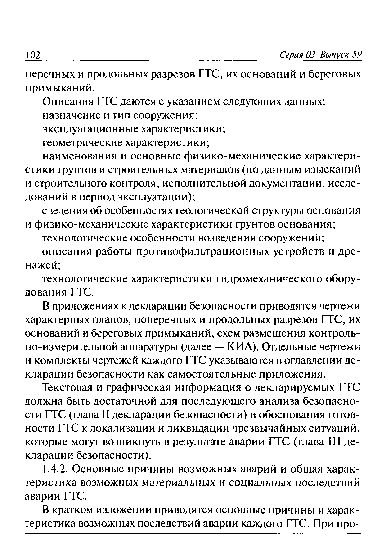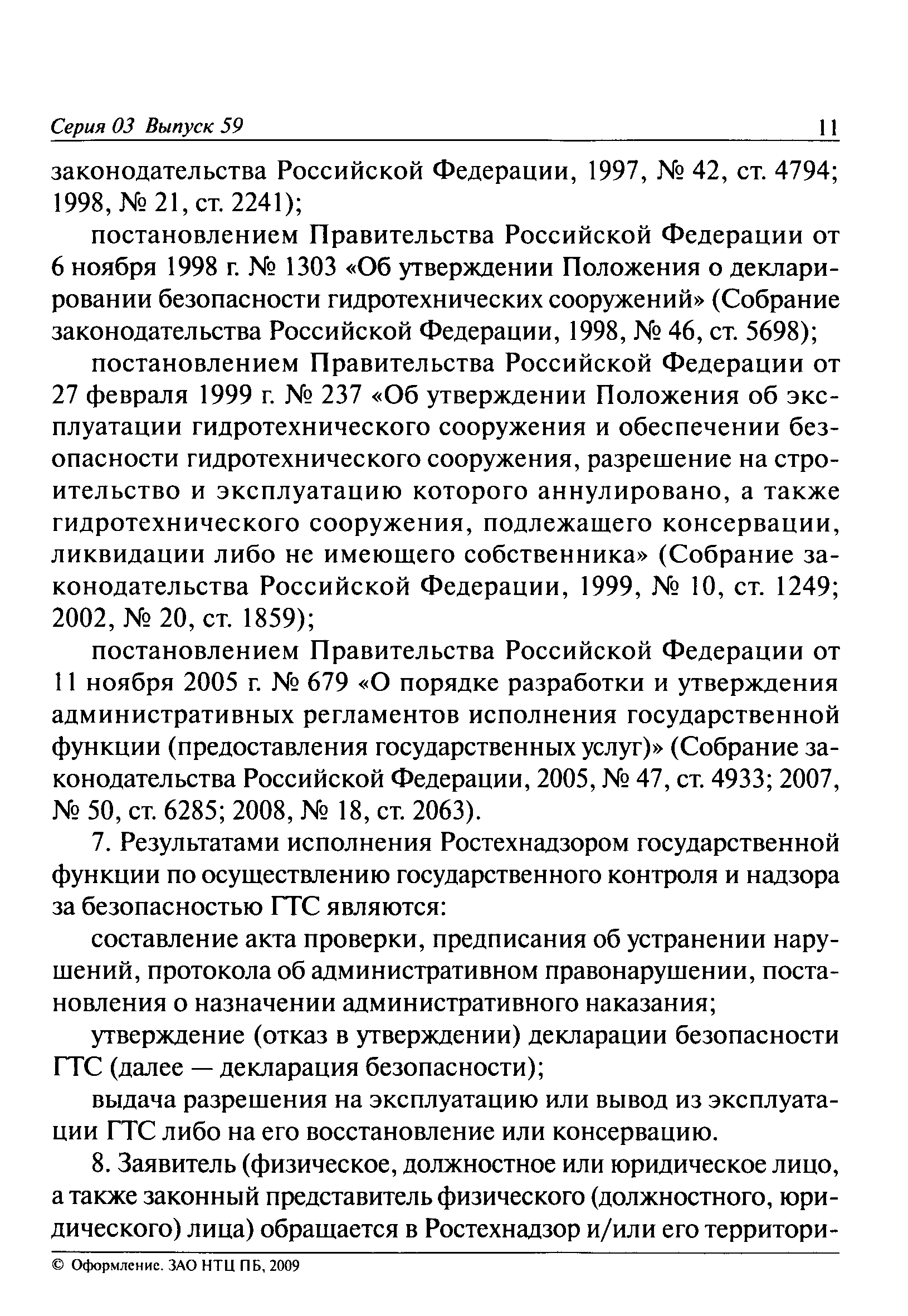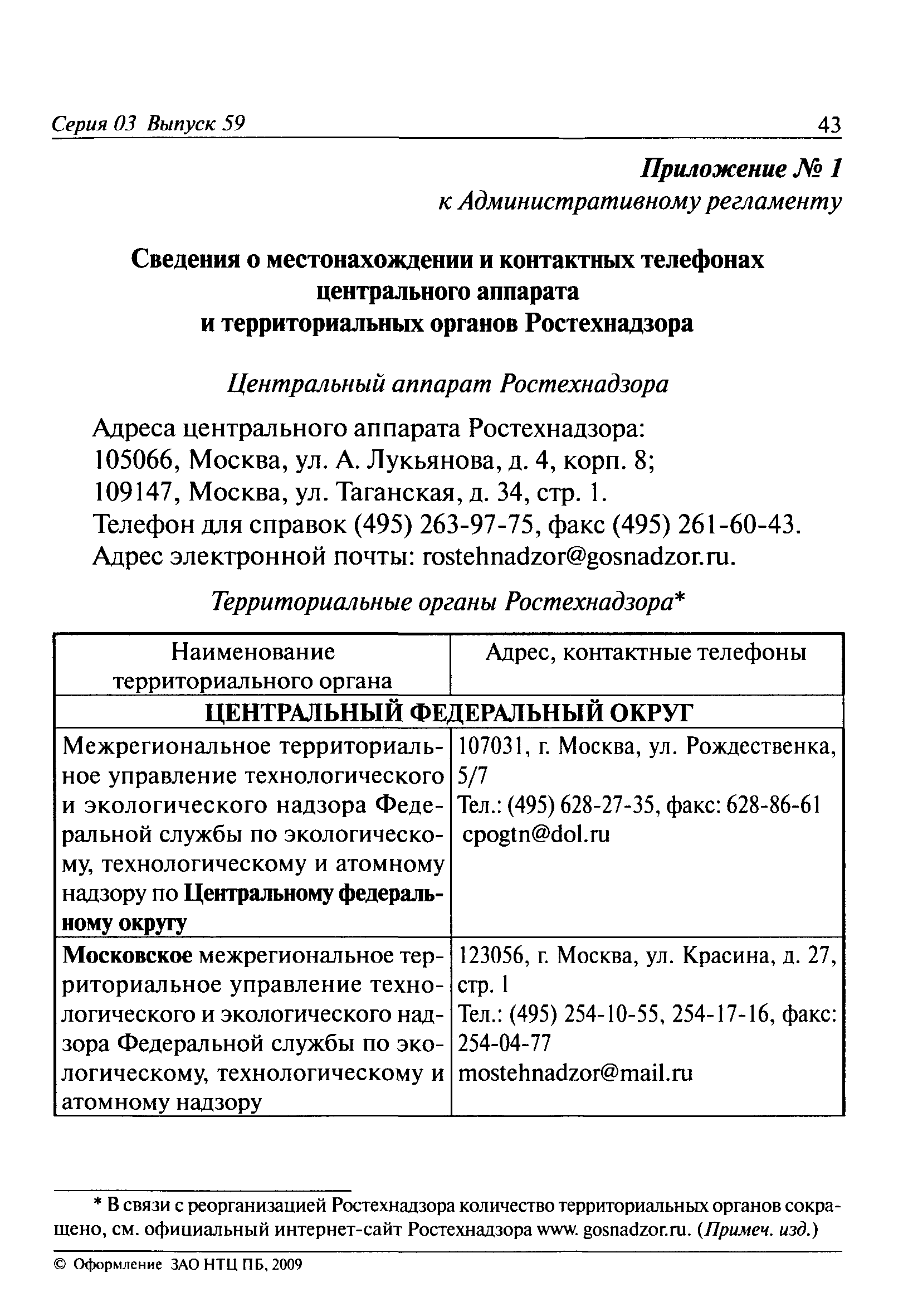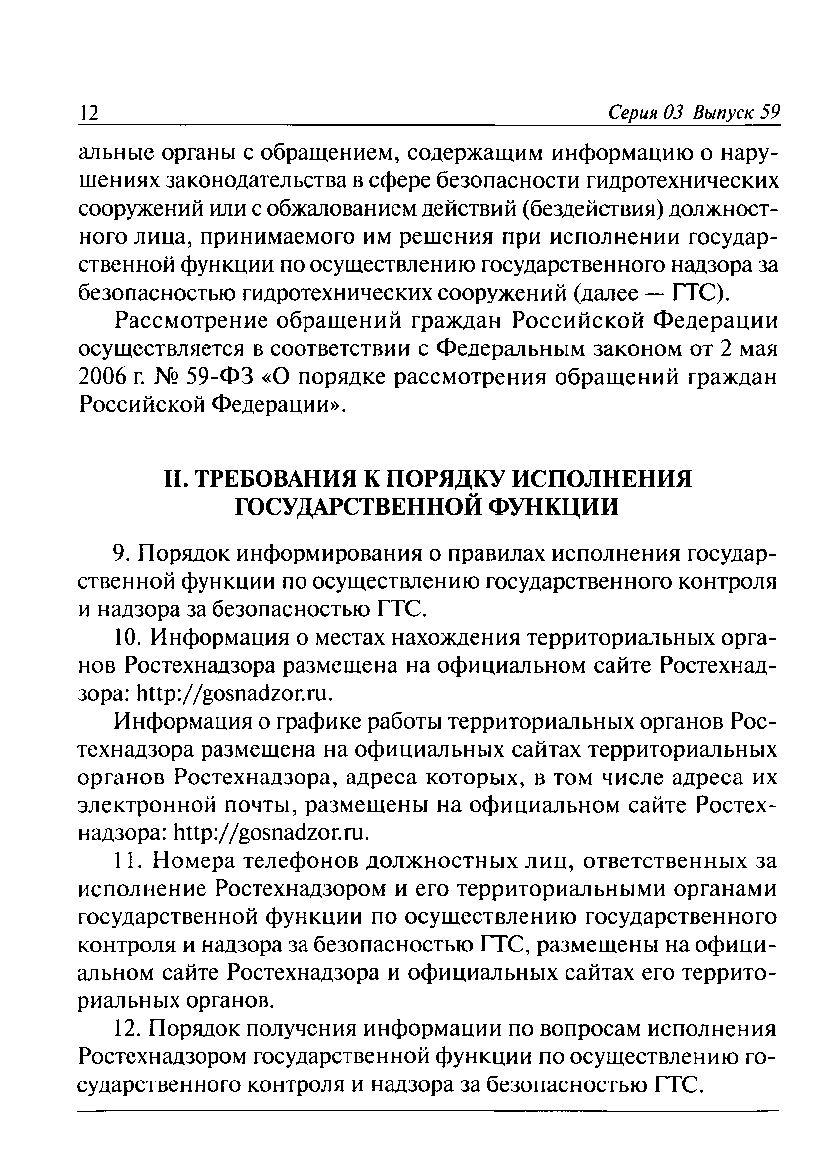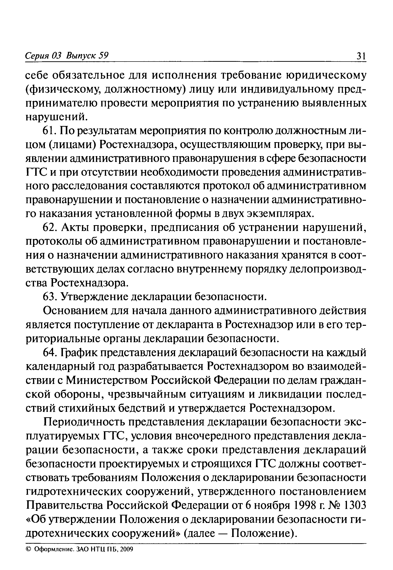 | Оглавление: | I. Общие положения II. Требования к порядку исполнения государственной функции III. Административные процедуры IV. Порядок и формы контроля за исполнением государственной функции V. Порядок обжалования действий (бездействий) должностного лица, а также принимаемого им решения при исполнении государственной функции Приложение № 1 Сведения о местонахождении и контактных телефонах центрального аппарата и территориальных органов Ростехнадзора Приложение № 2 Перечень должностных лиц Федеральной службы по экологическому, технологическому и атомному надзору, осуществляющих государственный контроль и надзор за безопасностью гидротехнических сооружений (соблюдением норм и правил безопасности), кроме судоходных гидротехнических сооружений, их права и обязанности Приложение № 3 Блок-схема по организации и проведению государственного контроля и надзора за безопасностью ГТС Приложение № 4 Форма акта проверки соблюдения требований законодательства в сфере безопасности гидротехнических сооружений Приложение № 5 Форма предписания об устранении нарушений законодательства в области безопасности гидротехнических сооружений Приложение № 6 Форма протокола об административном правонарушении Приложение № 7 Форма постановления о назначении административного наказания Приложение № 8 Форма Акта преддекларационного обследования гидротехнического сооружения Приложение № 9 Дополнительные требования к содержанию декларации безопасности, учитывающие особенности декларирования безопасности гидротехнических сооружений объектов энергетики I. Общая информация II. Анализ безопасности гидротехнических сооружений III. Обеспечение готовности объекта к локализации и ликвидации опасных повреждений и аварий гидротехнических сооружений и действиям в условиях возникновения чрезвычайной ситуации IV. Информирование населения и органов исполнительной власти V. Заключение VI. Список источников информации, использованных при разработке декларации безопасности гидротехнических сооружений VII. Приложения к декларации безопасности Дополнительные требования к содержанию декларации безопасности проектируемого гидротехнического сооружения Дополнительные требования к содержанию декларации безопасности строящегося гидротехнического сооружения Дополнительные требования к содержанию декларации безопасности гидротехнических сооружений тепловых электростанций при наличии в составе сооружений золошлакоотвалов Приложение № 10 Дополнительные требования к содержанию декларации безопасности, учитывающие особенности декларирования безопасности гидротехнических сооружений объектов промышленности (организаций, производств и объектов) I. Аннотация II. Список разработчиков декларации III. Оглавление IV. Общая информация V. Анализ безопасности ГТС VI. Обеспечение готовности ГТС к локализации и ликвидации опасных повреждений и аварийных ситуаций VII. Информировании общественности VIII. Заключение IX. Приложения к декларации безопасности Дополнительные требования к содержанию декларации безопасности проектируемого гидротехнического сооружения Дополнительные требования к содержанию декларации безопасности строящегося гидротехнического сооружения Дополнительные требования к содержанию декларации безопасности гидротехн