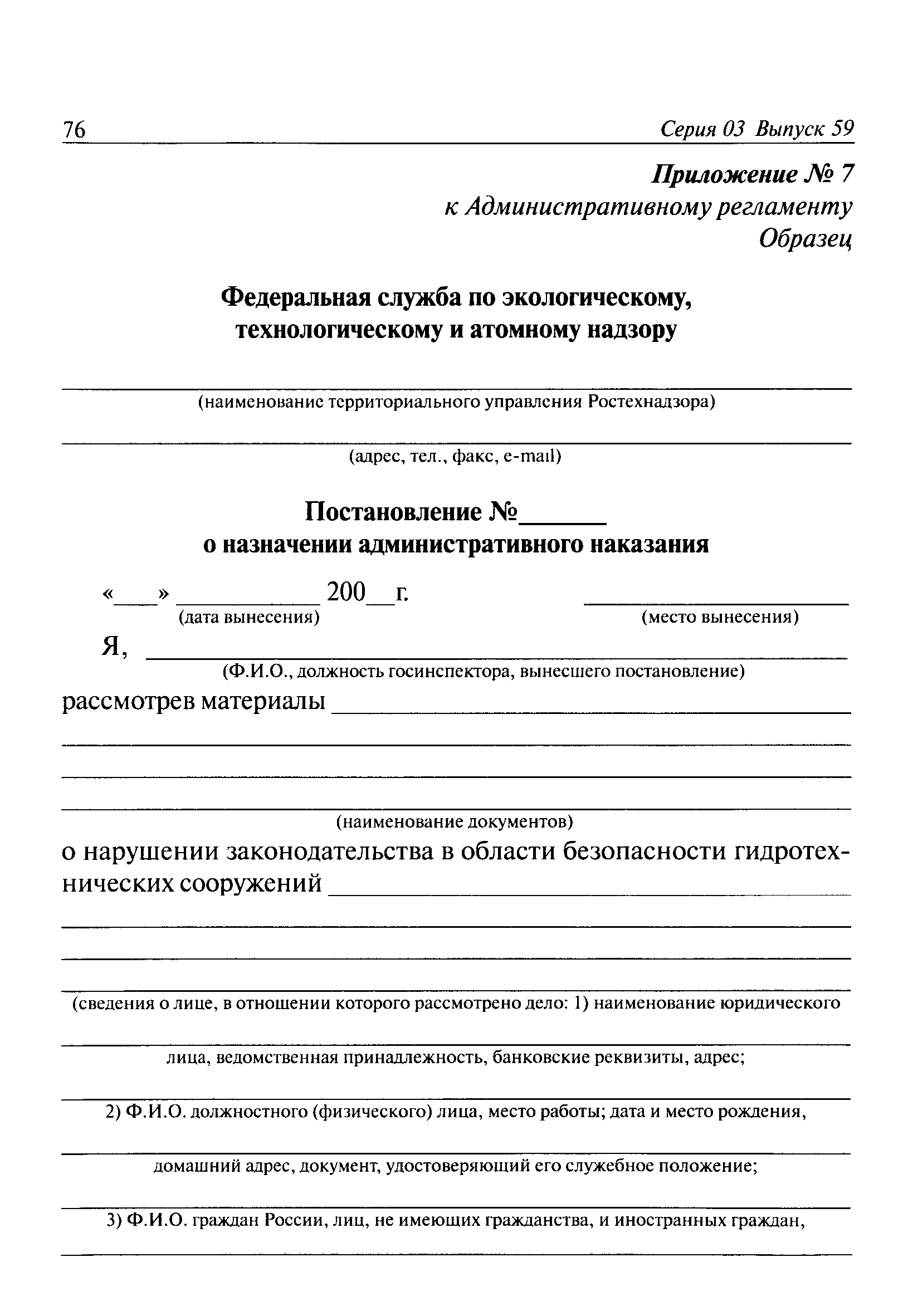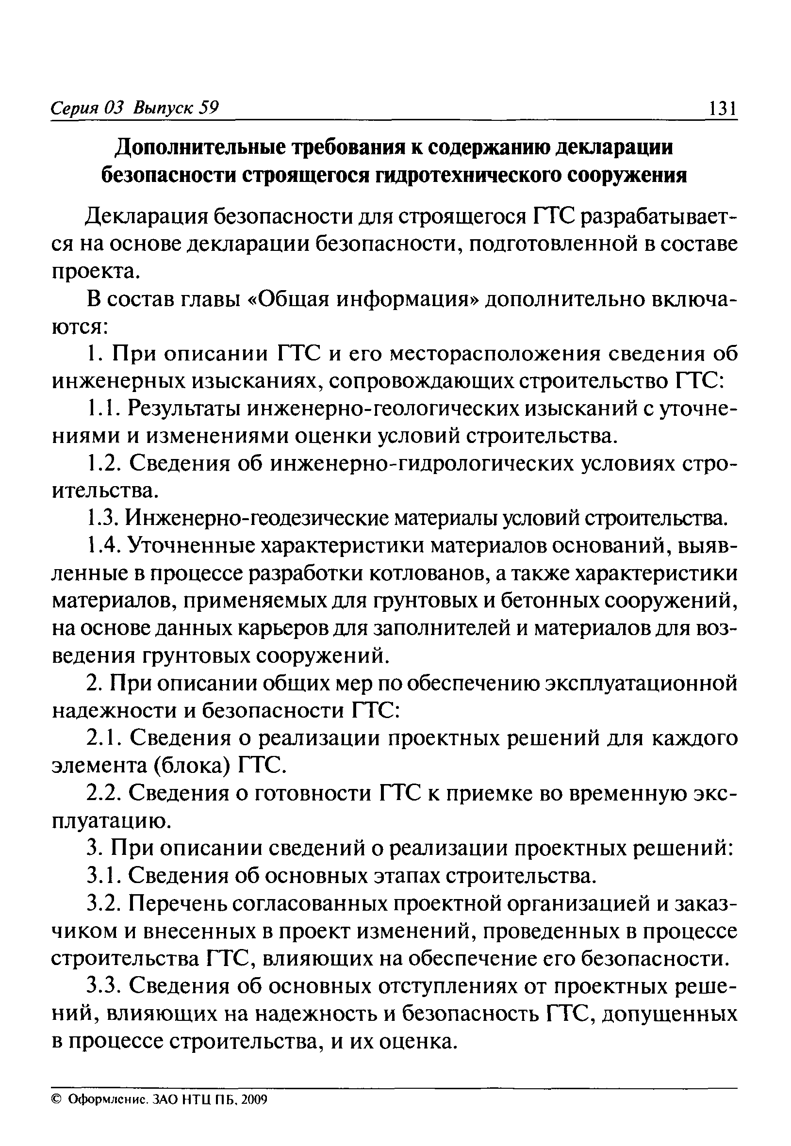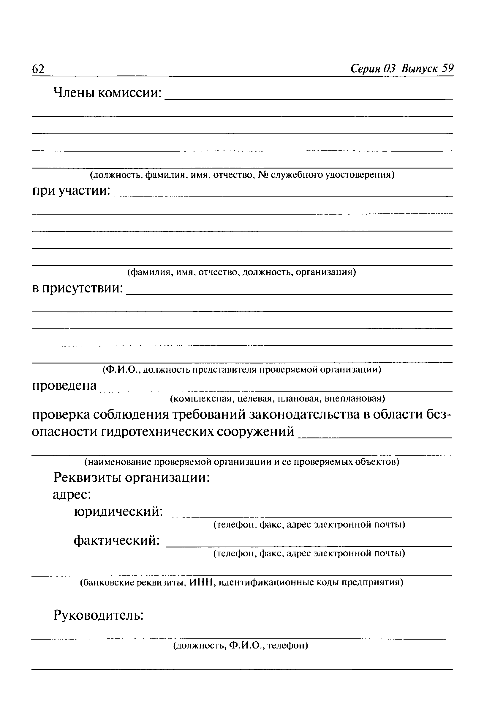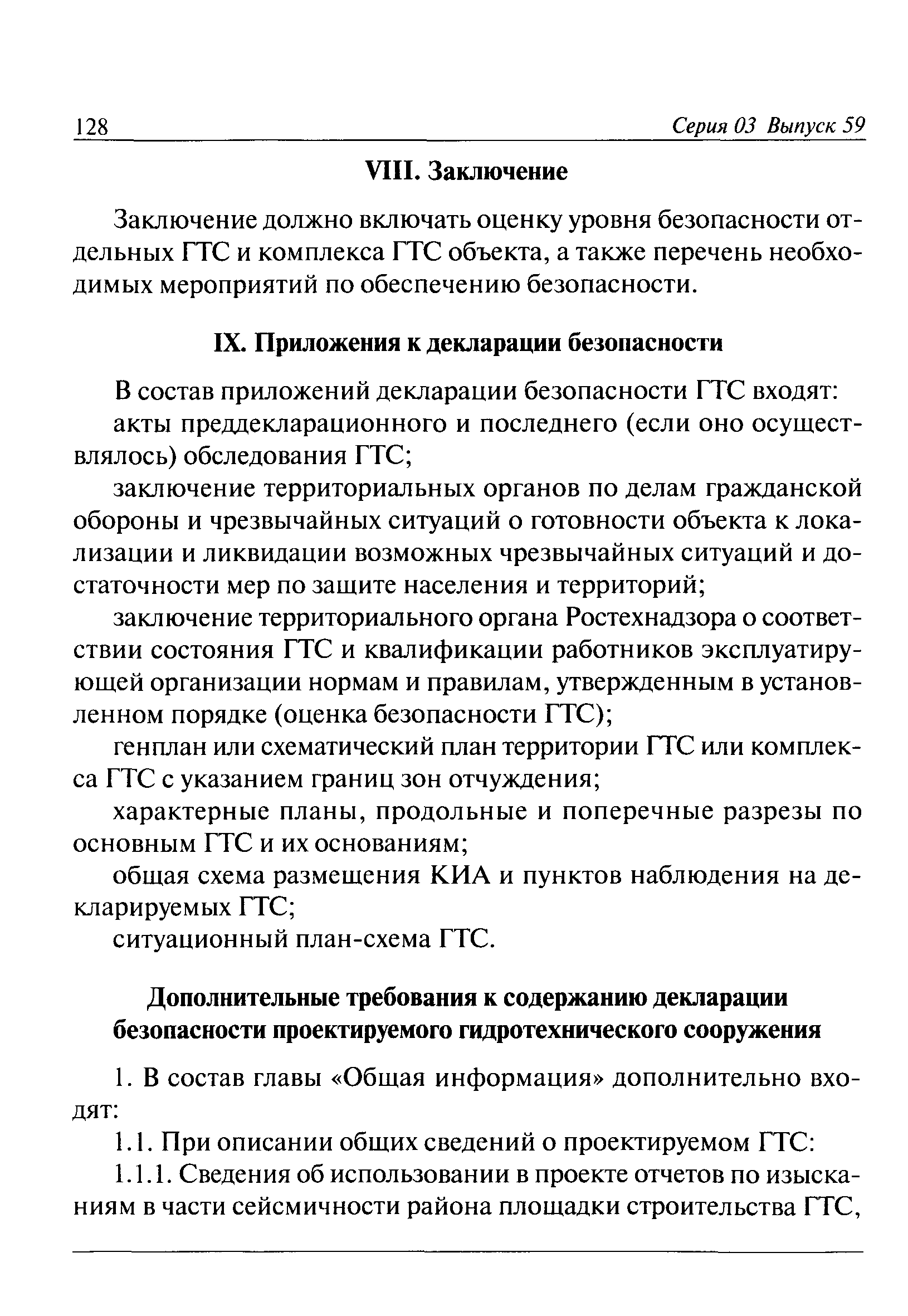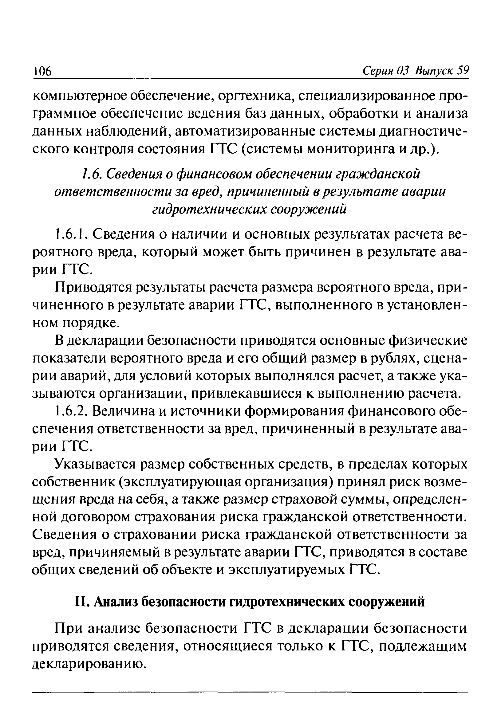 | Оглавление: | I. Общие положения II. Требования к порядку исполнения государственной функции III. Административные процедуры IV. Порядок и формы контроля за исполнением государственной функции V. Порядок обжалования действий (бездействий) должностного лица, а также принимаемого им решения при исполнении государственной функции Приложение № 1 Сведения о местонахождении и контактных телефонах центрального аппарата и территориальных органов Ростехнадзора Приложение № 2 Перечень должностных лиц Федеральной службы по экологическому, технологическому и атомному надзору, осуществляющих государственный контроль и надзор за безопасностью гидротехнических сооружений (соблюдением норм и правил безопасности), кроме судоходных гидротехнических сооружений, их права и обязанности Приложение № 3 Блок-схема по организации и проведению государственного контроля и надзора за безопасностью ГТС Приложение № 4 Форма акта проверки соблюдения требований законодательства в сфере безопасности гидротехнических сооружений Приложение № 5 Форма предписания об устранении нарушений законодательства в области безопасности гидротехнических сооружений Приложение № 6 Форма протокола об административном правонарушении Приложение № 7 Форма постановления о назначении административного наказания Приложение № 8 Форма Акта преддекларационного обследования гидротехнического сооружения Приложение № 9 Дополнительные требования к содержанию декларации безопасности, учитывающие особенности декларирования безопасности гидротехнических сооружений объектов энергетики I. Общая информация II. Анализ безопасности гидротехнических сооружений III. Обеспечение готовности объекта к локализации и ликвидации опасных повреждений и аварий гидротехнических сооружений и действиям в условиях возникновения чрезвычайной ситуации IV. Информирование населения и органов исполнительной власти V. Заключение VI. Список источников информации, использованных при разработке декларации безопасности гидротехнических сооружений VII. Приложения к декларации безопасности Дополнительные требования к содержанию декларации безопасности проектируемого гидротехнического сооружения Дополнительные требования к содержанию декларации безопасности строящегося гидротехнического сооружения Дополнительные требования к содержанию декларации безопасности гидротехнических сооружений тепловых электростанций при наличии в составе сооружений золошлакоотвалов Приложение № 10 Дополнительные требования к содержанию декларации безопасности, учитывающие особенности декларирования безопасности гидротехнических сооружений объектов промышленности (организаций, производств и объектов) I. Аннотация II. Список разработчиков декларации III. Оглавление IV. Общая информация V. Анализ безопасности ГТС VI. Обеспечение готовности ГТС к локализации и ликвидации опасных повреждений и аварийных ситуаций VII. Информировании общественности VIII. Заключение IX. Приложения к декларации безопасности Дополнительные требования к содержанию декларации безопасности проектируемого гидротехнического сооружения Дополнительные требования к содержанию декларации безопасности строящегося гидротехнического сооружения Дополнительные требования к содержанию декларации безопасности гидротехн