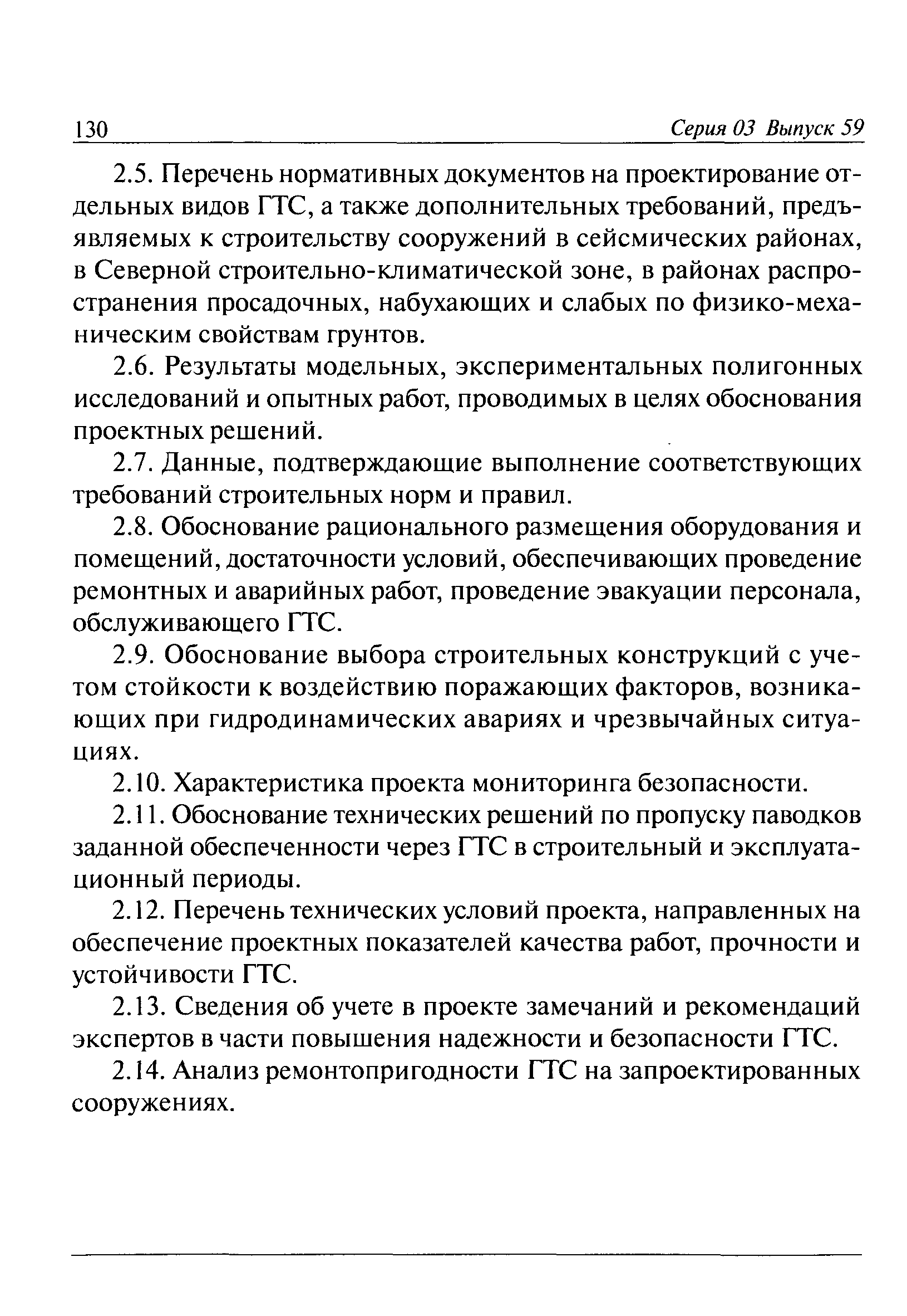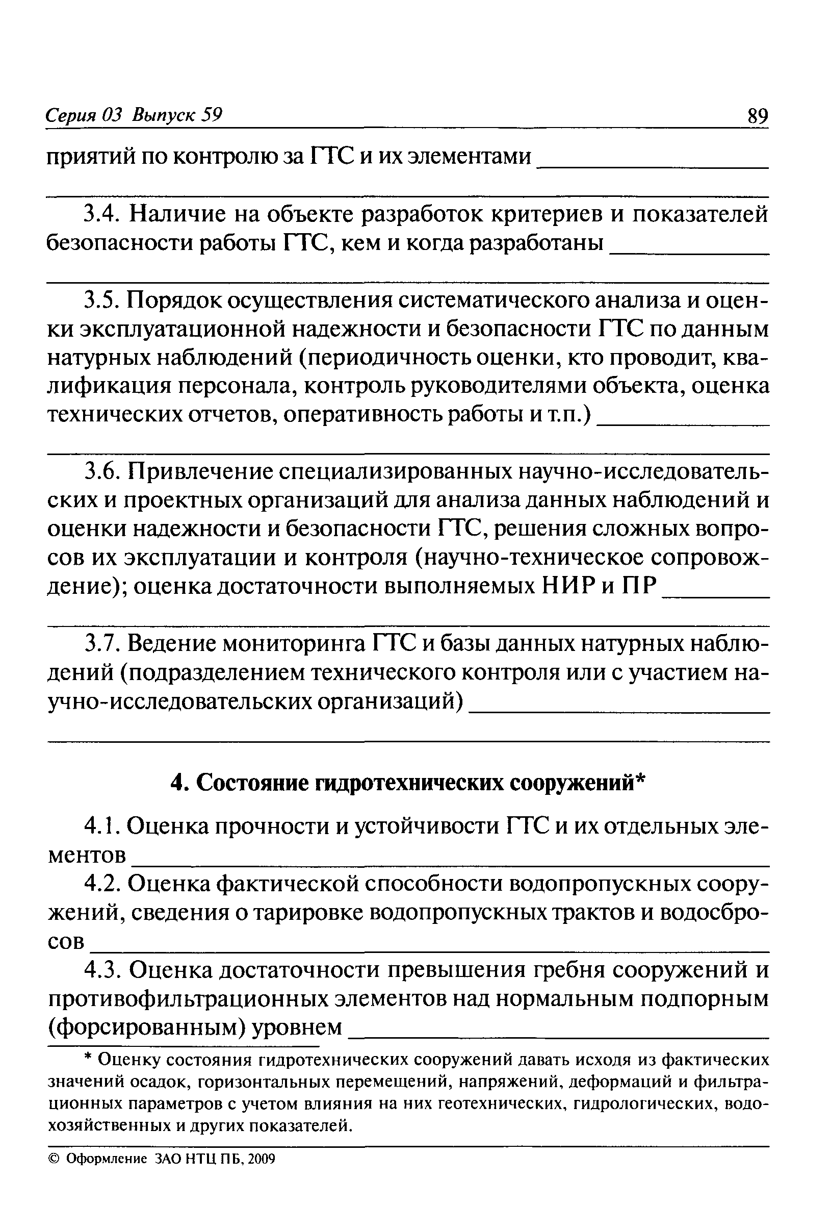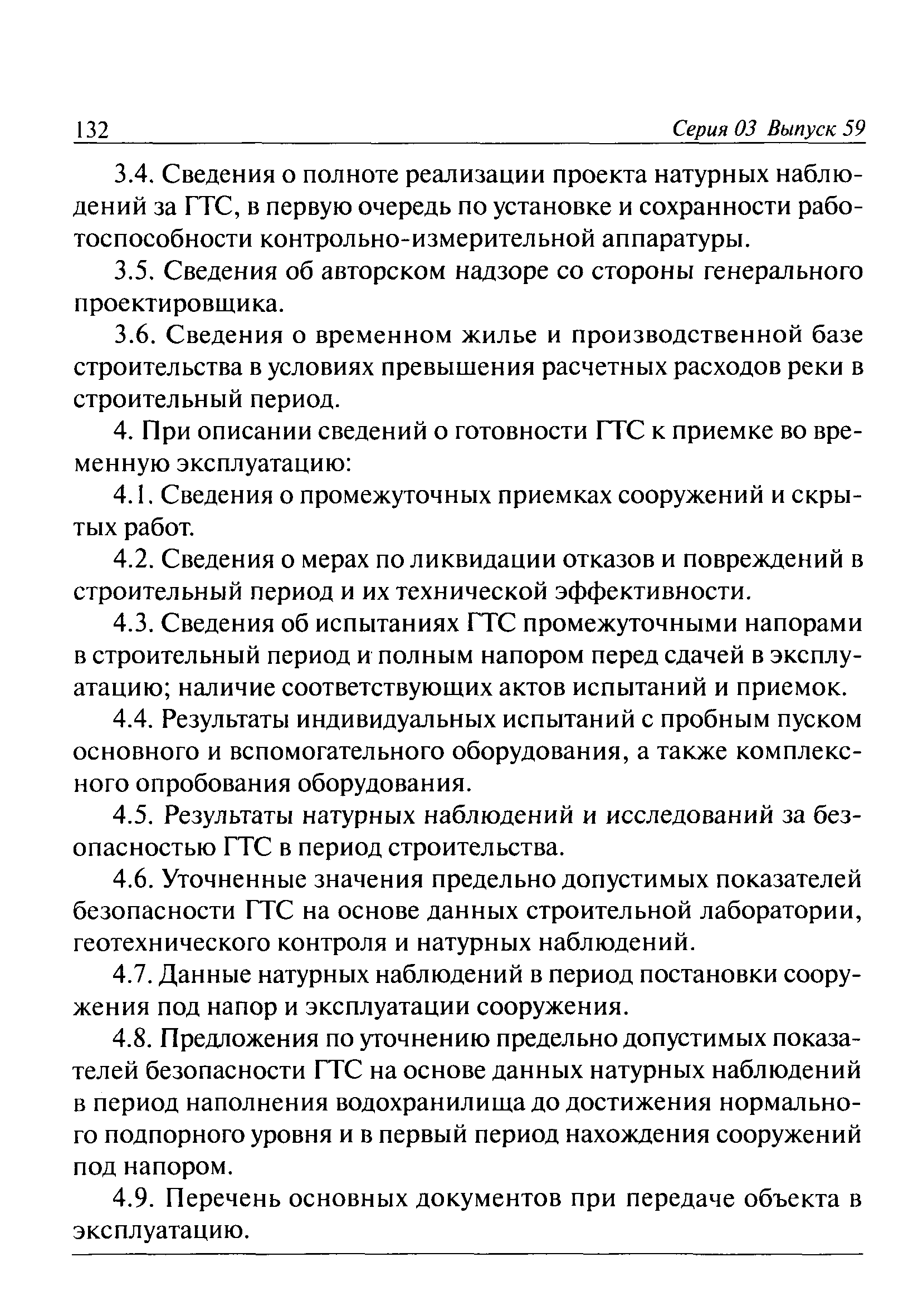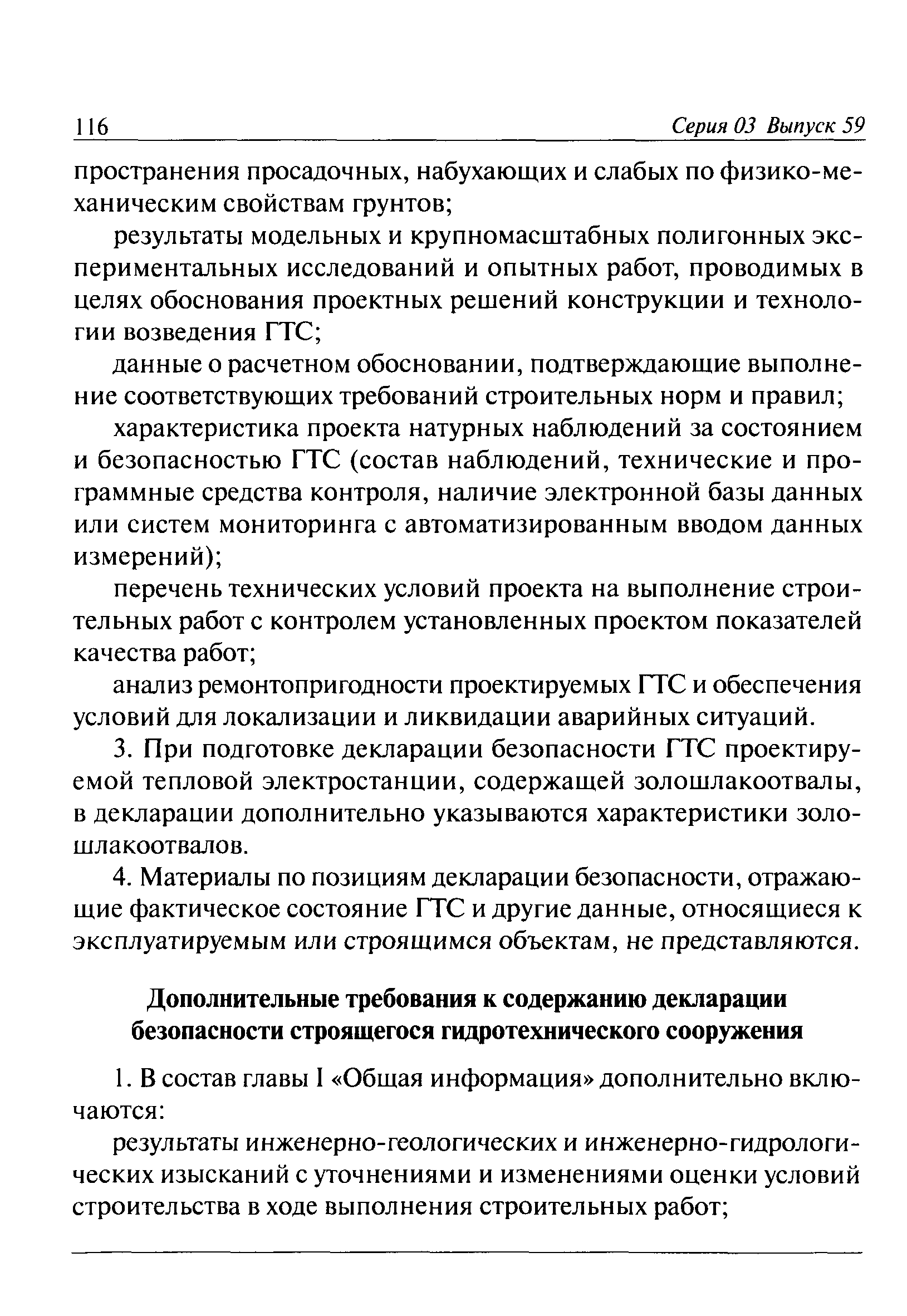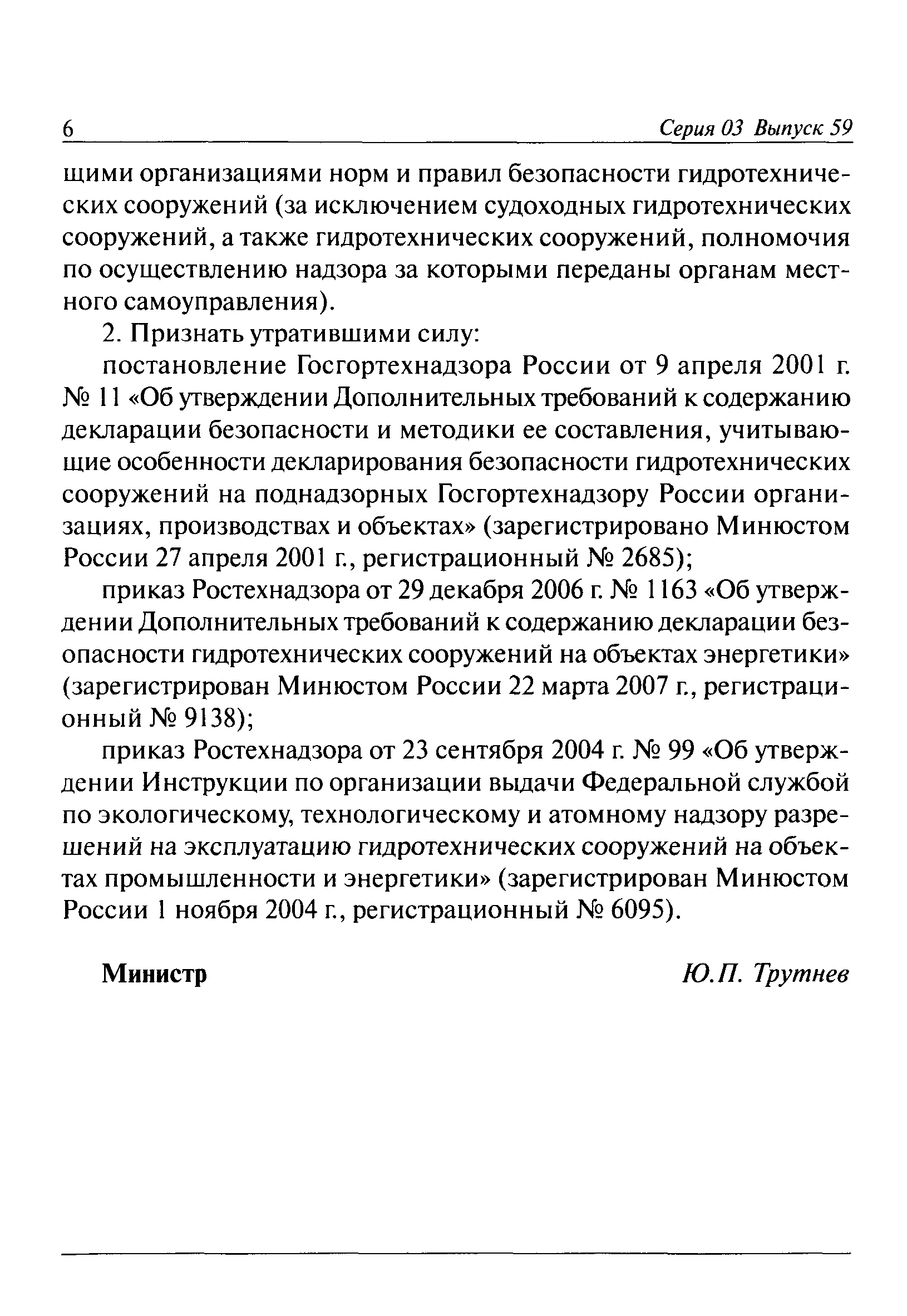 | Оглавление: | I. Общие положения II. Требования к порядку исполнения государственной функции III. Административные процедуры IV. Порядок и формы контроля за исполнением государственной функции V. Порядок обжалования действий (бездействий) должностного лица, а также принимаемого им решения при исполнении государственной функции Приложение № 1 Сведения о местонахождении и контактных телефонах центрального аппарата и территориальных органов Ростехнадзора Приложение № 2 Перечень должностных лиц Федеральной службы по экологическому, технологическому и атомному надзору, осуществляющих государственный контроль и надзор за безопасностью гидротехнических сооружений (соблюдением норм и правил безопасности), кроме судоходных гидротехнических сооружений, их права и обязанности Приложение № 3 Блок-схема по организации и проведению государственного контроля и надзора за безопасностью ГТС Приложение № 4 Форма акта проверки соблюдения требований законодательства в сфере безопасности гидротехнических сооружений Приложение № 5 Форма предписания об устранении нарушений законодательства в области безопасности гидротехнических сооружений Приложение № 6 Форма протокола об административном правонарушении Приложение № 7 Форма постановления о назначении административного наказания Приложение № 8 Форма Акта преддекларационного обследования гидротехнического сооружения Приложение № 9 Дополнительные требования к содержанию декларации безопасности, учитывающие особенности декларирования безопасности гидротехнических сооружений объектов энергетики I. Общая информация II. Анализ безопасности гидротехнических сооружений III. Обеспечение готовности объекта к локализации и ликвидации опасных повреждений и аварий гидротехнических сооружений и действиям в условиях возникновения чрезвычайной ситуации IV. Информирование населения и органов исполнительной власти V. Заключение VI. Список источников информации, использованных при разработке декларации безопасности гидротехнических сооружений VII. Приложения к декларации безопасности Дополнительные требования к содержанию декларации безопасности проектируемого гидротехнического сооружения Дополнительные требования к содержанию декларации безопасности строящегося гидротехнического сооружения Дополнительные требования к содержанию декларации безопасности гидротехнических сооружений тепловых электростанций при наличии в составе сооружений золошлакоотвалов Приложение № 10 Дополнительные требования к содержанию декларации безопасности, учитывающие особенности декларирования безопасности гидротехнических сооружений объектов промышленности (организаций, производств и объектов) I. Аннотация II. Список разработчиков декларации III. Оглавление IV. Общая информация V. Анализ безопасности ГТС VI. Обеспечение готовности ГТС к локализации и ликвидации опасных повреждений и аварийных ситуаций VII. Информировании общественности VIII. Заключение IX. Приложения к декларации безопасности Дополнительные требования к содержанию декларации безопасности проектируемого гидротехнического сооружения Дополнительные требования к содержанию декларации безопасности строящегося гидротехнического сооружения Дополнительные требования к содержанию декларации безопасности гидротехн
