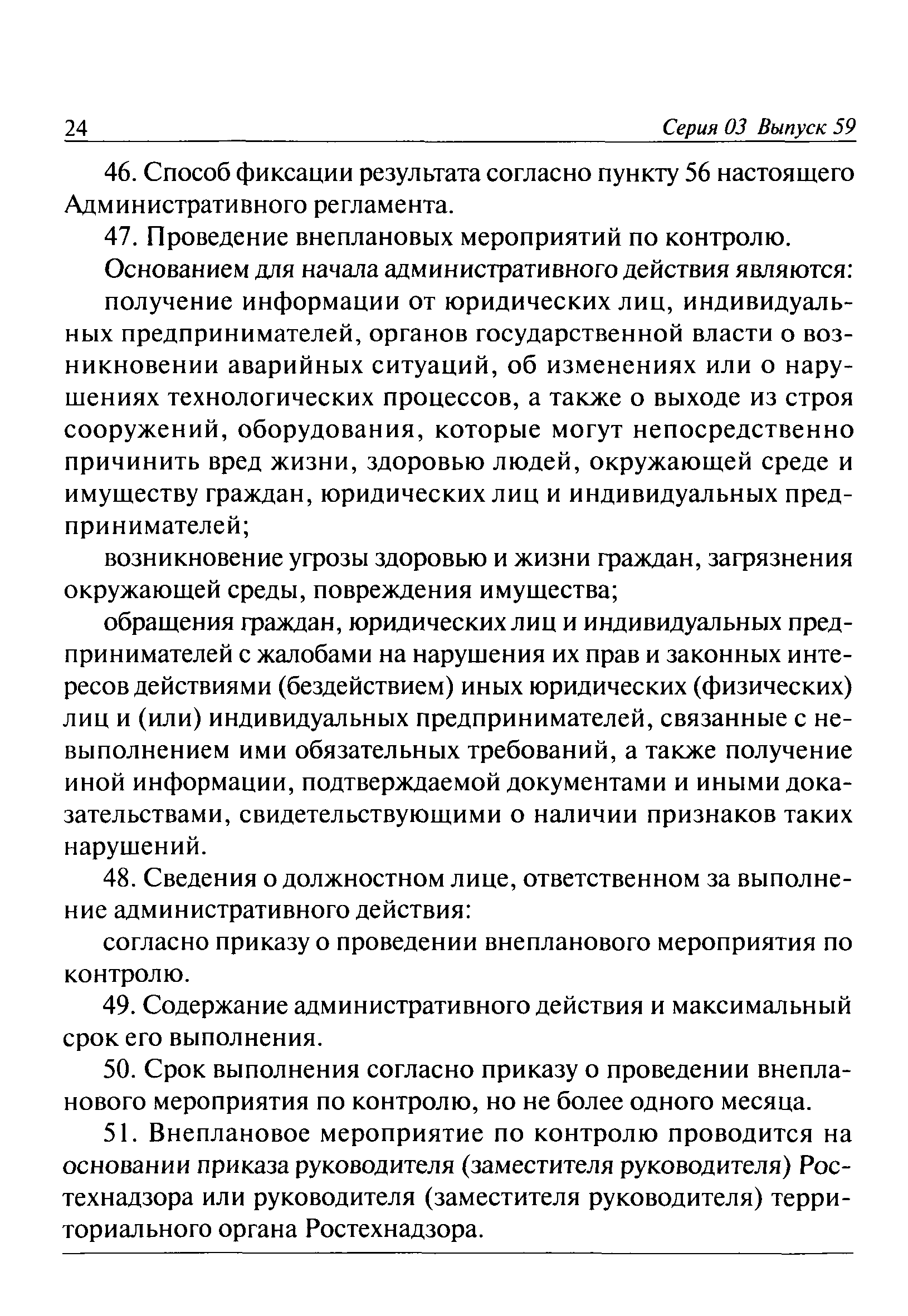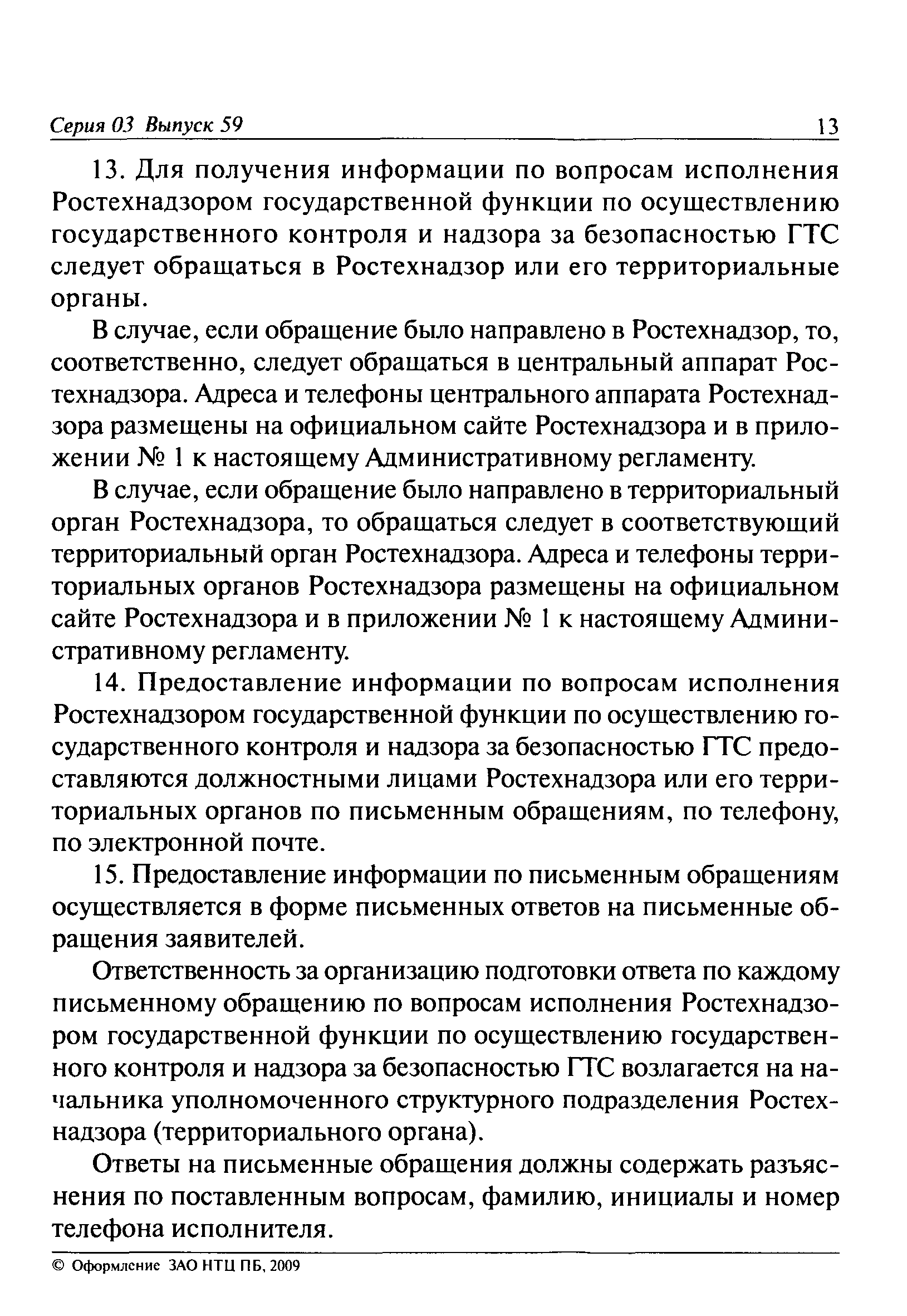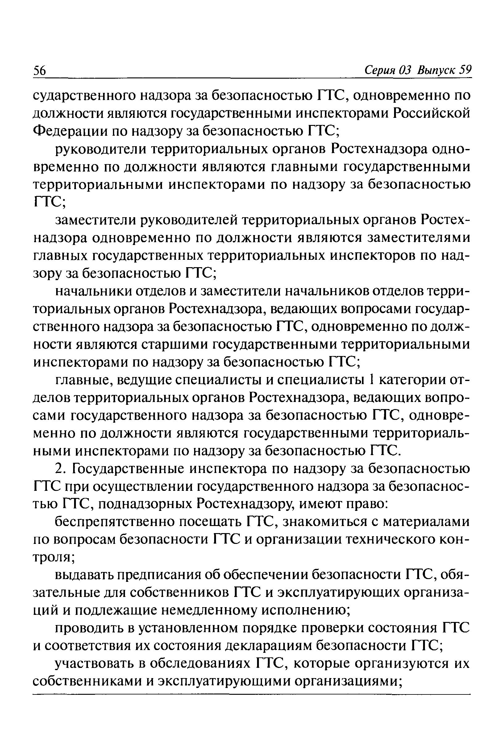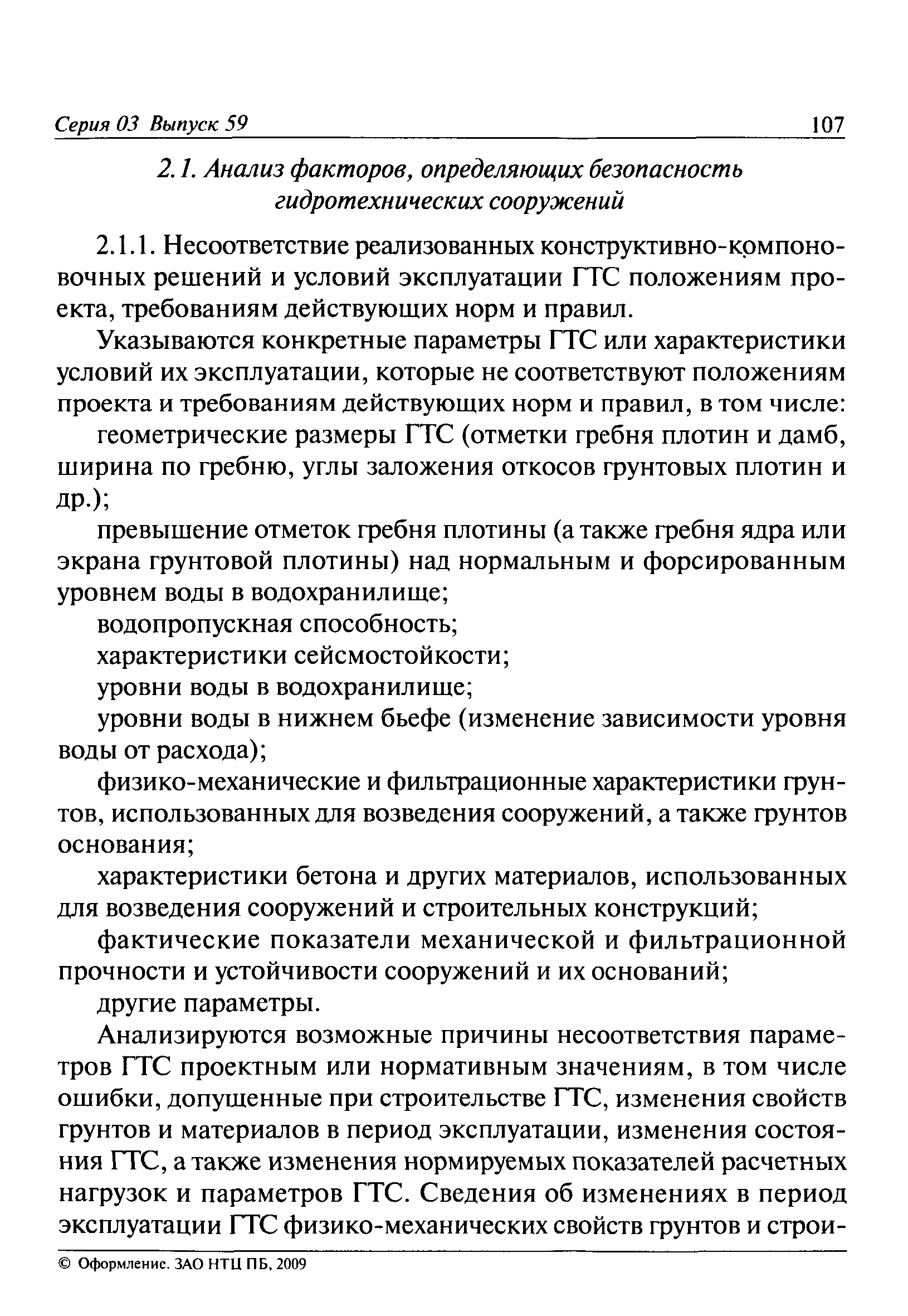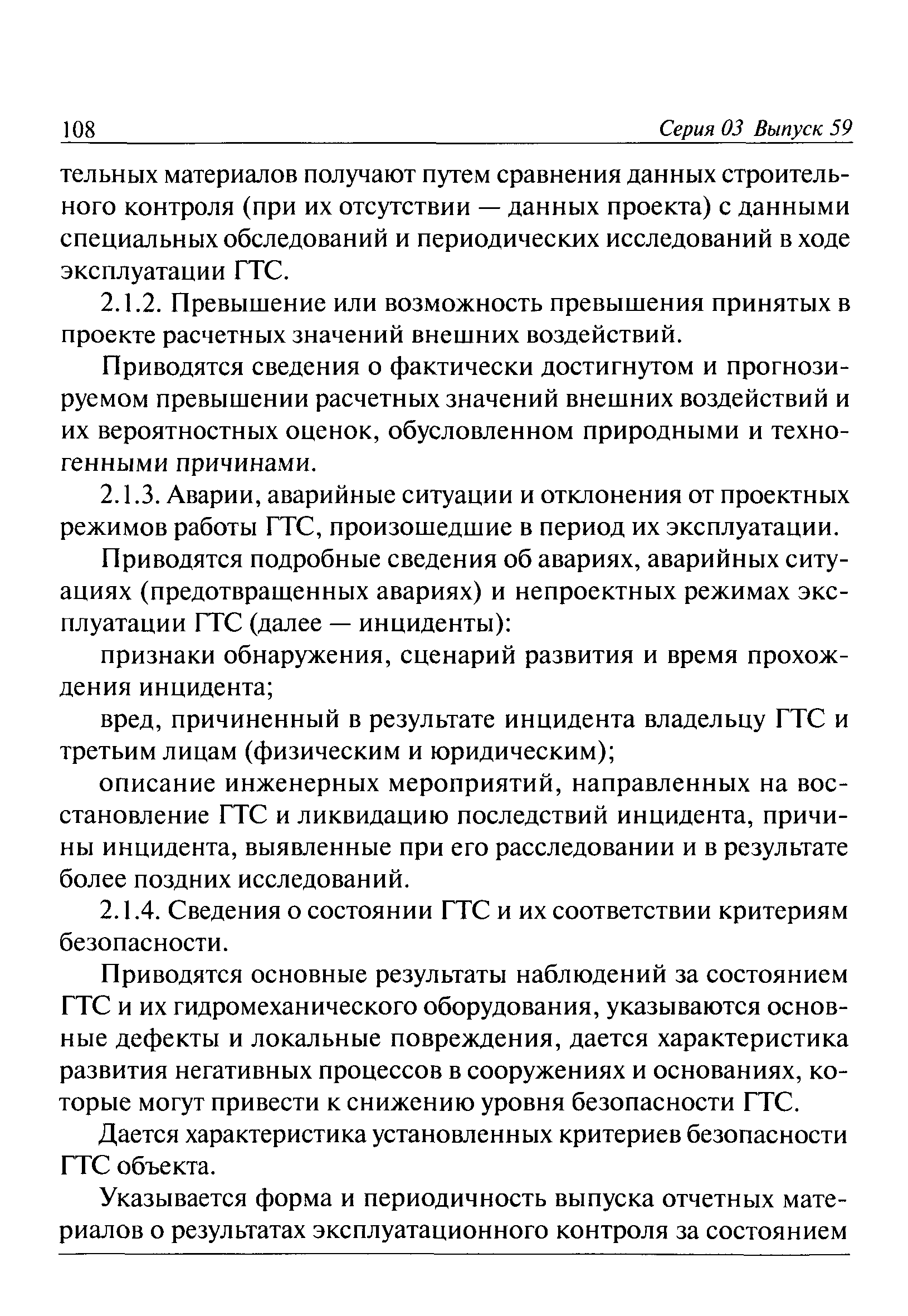 | Оглавление: | I. Общие положения II. Требования к порядку исполнения государственной функции III. Административные процедуры IV. Порядок и формы контроля за исполнением государственной функции V. Порядок обжалования действий (бездействий) должностного лица, а также принимаемого им решения при исполнении государственной функции Приложение № 1 Сведения о местонахождении и контактных телефонах центрального аппарата и территориальных органов Ростехнадзора Приложение № 2 Перечень должностных лиц Федеральной службы по экологическому, технологическому и атомному надзору, осуществляющих государственный контроль и надзор за безопасностью гидротехнических сооружений (соблюдением норм и правил безопасности), кроме судоходных гидротехнических сооружений, их права и обязанности Приложение № 3 Блок-схема по организации и проведению государственного контроля и надзора за безопасностью ГТС Приложение № 4 Форма акта проверки соблюдения требований законодательства в сфере безопасности гидротехнических сооружений Приложение № 5 Форма предписания об устранении нарушений законодательства в области безопасности гидротехнических сооружений Приложение № 6 Форма протокола об административном правонарушении Приложение № 7 Форма постановления о назначении административного наказания Приложение № 8 Форма Акта преддекларационного обследования гидротехнического сооружения Приложение № 9 Дополнительные требования к содержанию декларации безопасности, учитывающие особенности декларирования безопасности гидротехнических сооружений объектов энергетики I. Общая информация II. Анализ безопасности гидротехнических сооружений III. Обеспечение готовности объекта к локализации и ликвидации опасных повреждений и аварий гидротехнических сооружений и действиям в условиях возникновения чрезвычайной ситуации IV. Информирование населения и органов исполнительной власти V. Заключение VI. Список источников информации, использованных при разработке декларации безопасности гидротехнических сооружений VII. Приложения к декларации безопасности Дополнительные требования к содержанию декларации безопасности проектируемого гидротехнического сооружения Дополнительные требования к содержанию декларации безопасности строящегося гидротехнического сооружения Дополнительные требования к содержанию декларации безопасности гидротехнических сооружений тепловых электростанций при наличии в составе сооружений золошлакоотвалов Приложение № 10 Дополнительные требования к содержанию декларации безопасности, учитывающие особенности декларирования безопасности гидротехнических сооружений объектов промышленности (организаций, производств и объектов) I. Аннотация II. Список разработчиков декларации III. Оглавление IV. Общая информация V. Анализ безопасности ГТС VI. Обеспечение готовности ГТС к локализации и ликвидации опасных повреждений и аварийных ситуаций VII. Информировании общественности VIII. Заключение IX. Приложения к декларации безопасности Дополнительные требования к содержанию декларации безопасности проектируемого гидротехнического сооружения Дополнительные требования к содержанию декларации безопасности строящегося гидротехнического сооружения Дополнительные требования к содержанию декларации безопасности гидротехн