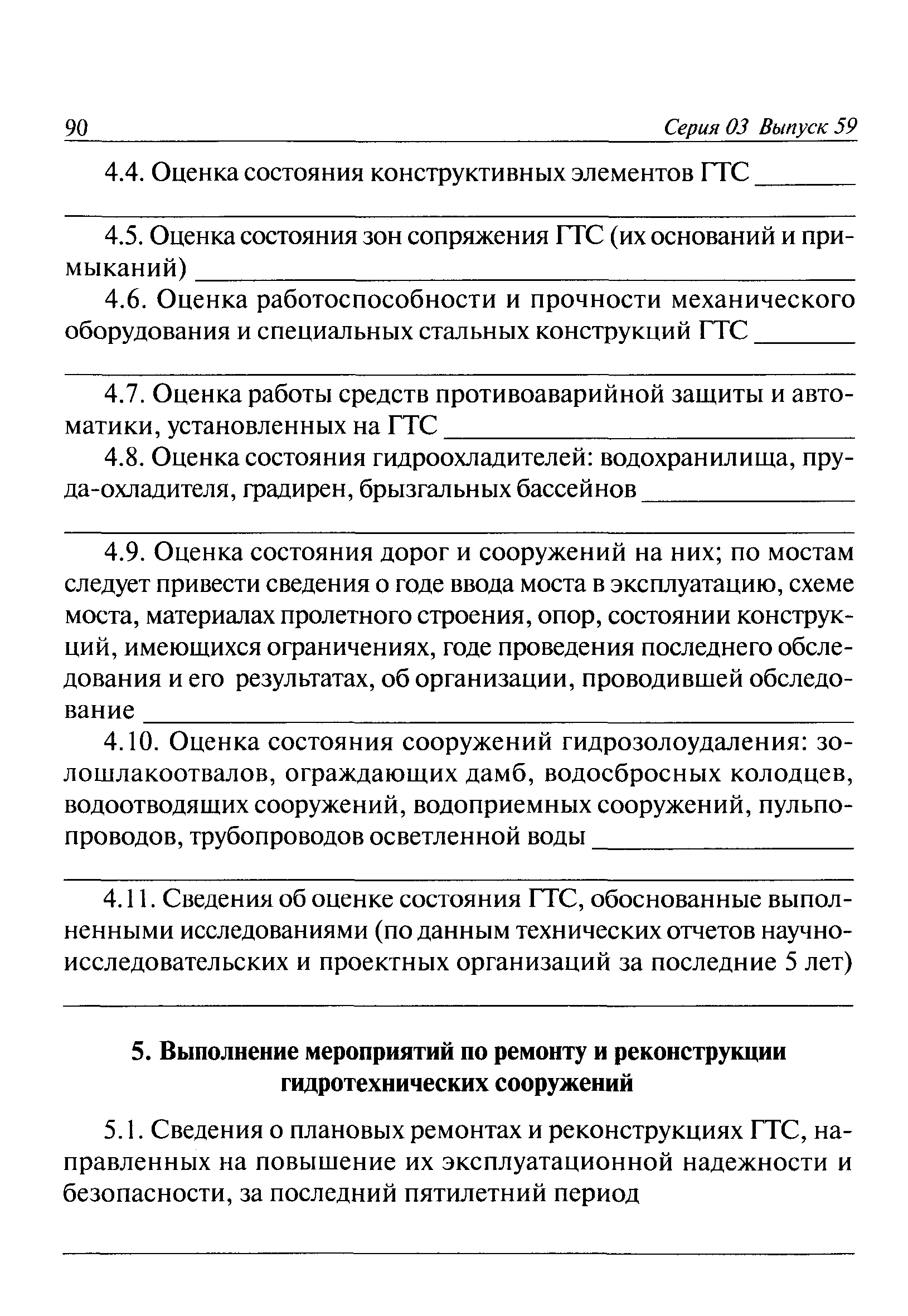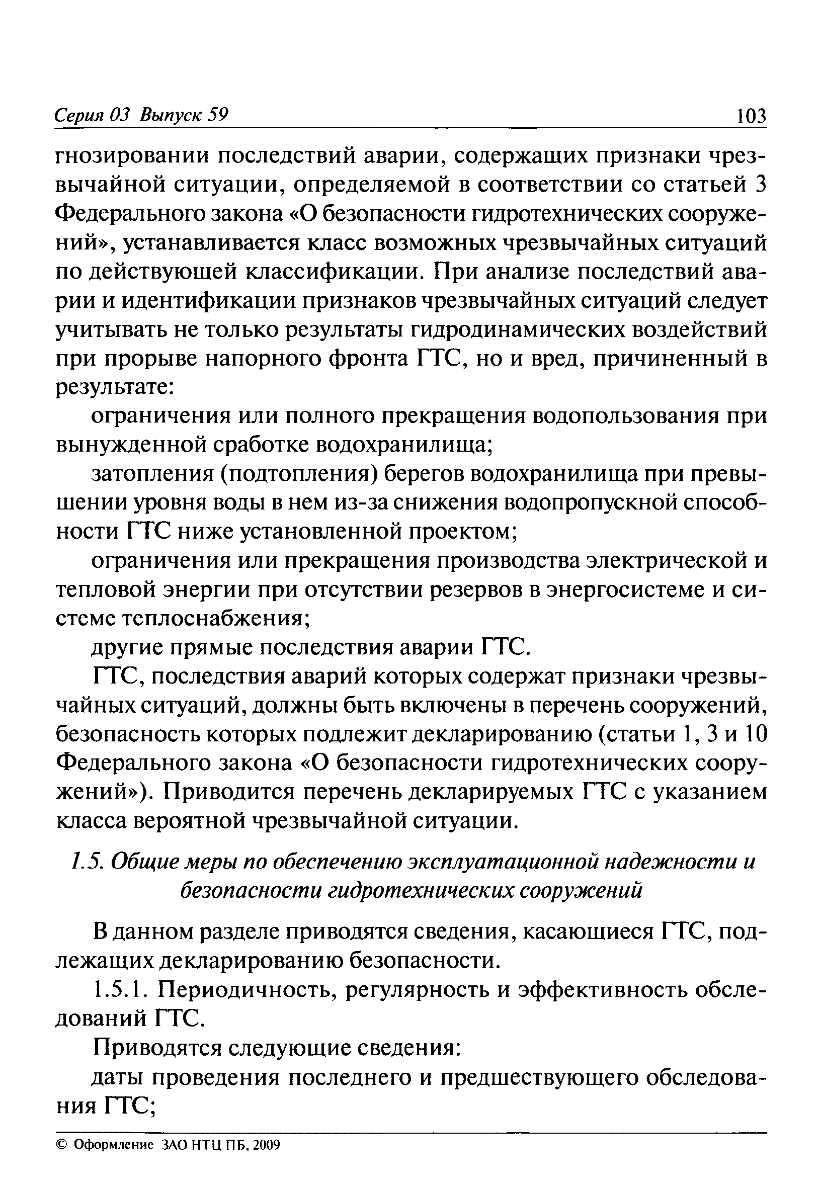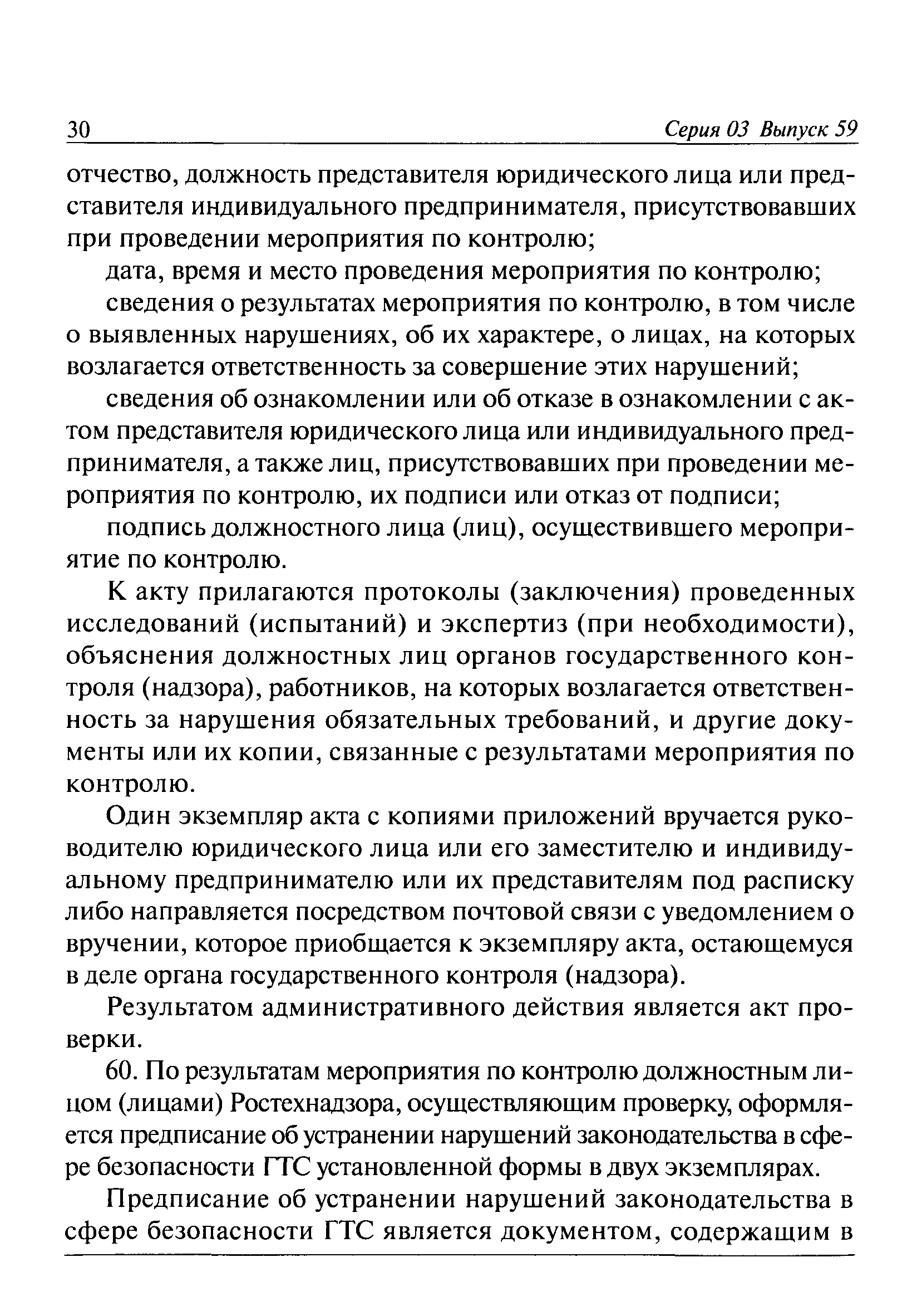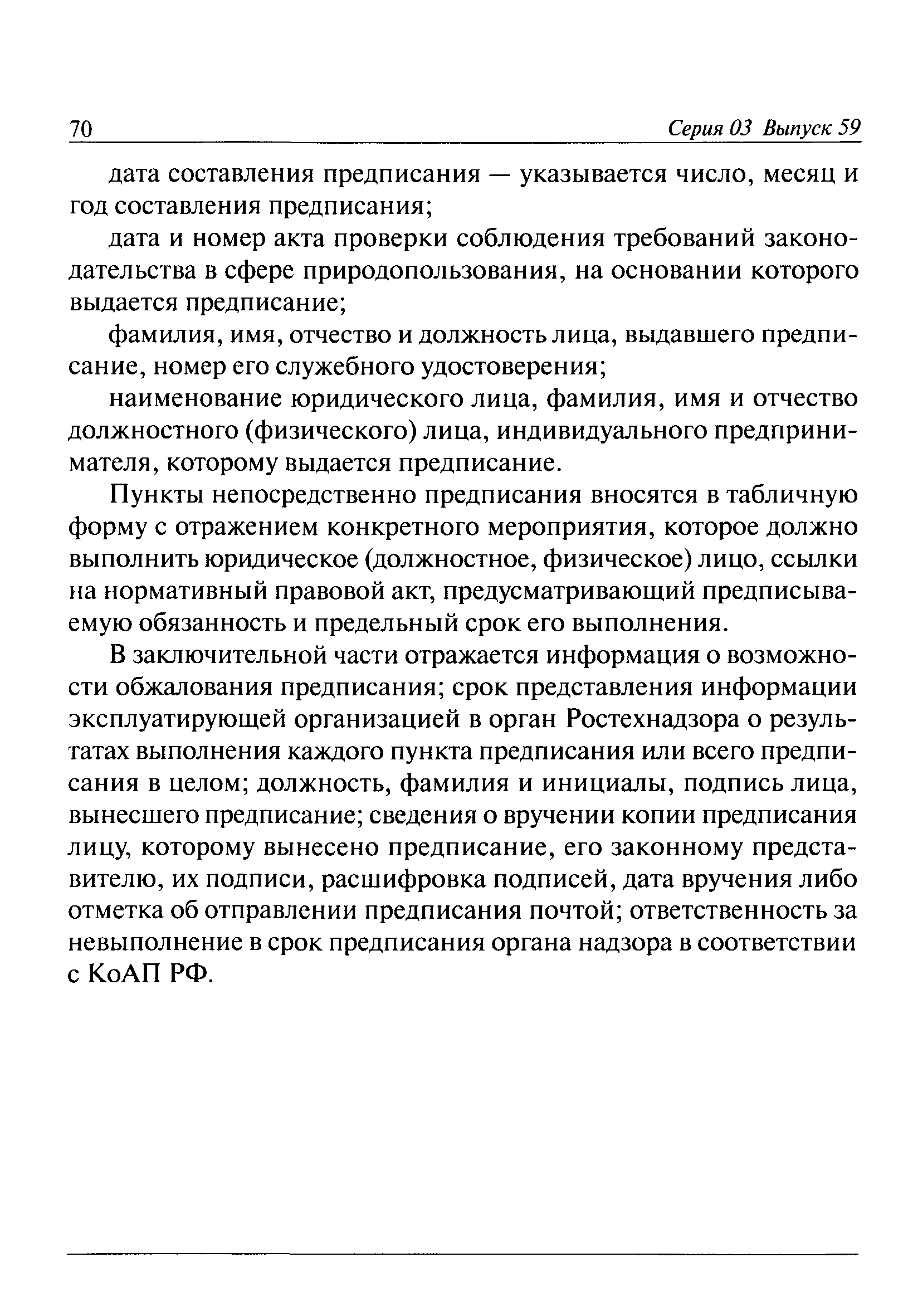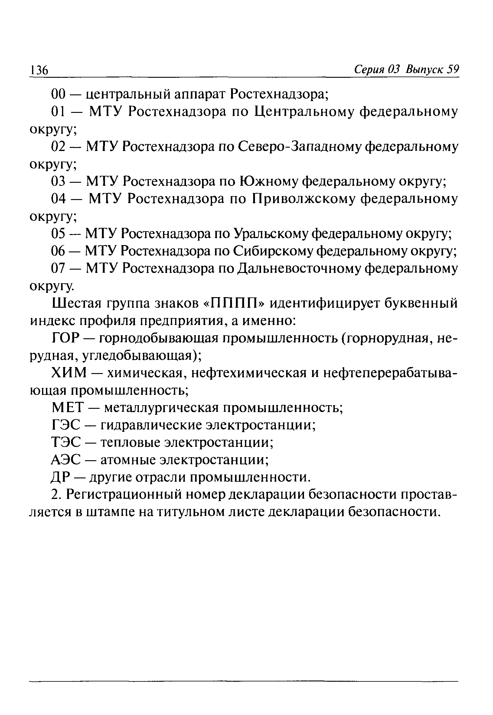 | Оглавление: | I. Общие положения II. Требования к порядку исполнения государственной функции III. Административные процедуры IV. Порядок и формы контроля за исполнением государственной функции V. Порядок обжалования действий (бездействий) должностного лица, а также принимаемого им решения при исполнении государственной функции Приложение № 1 Сведения о местонахождении и контактных телефонах центрального аппарата и территориальных органов Ростехнадзора Приложение № 2 Перечень должностных лиц Федеральной службы по экологическому, технологическому и атомному надзору, осуществляющих государственный контроль и надзор за безопасностью гидротехнических сооружений (соблюдением норм и правил безопасности), кроме судоходных гидротехнических сооружений, их права и обязанности Приложение № 3 Блок-схема по организации и проведению государственного контроля и надзора за безопасностью ГТС Приложение № 4 Форма акта проверки соблюдения требований законодательства в сфере безопасности гидротехнических сооружений Приложение № 5 Форма предписания об устранении нарушений законодательства в области безопасности гидротехнических сооружений Приложение № 6 Форма протокола об административном правонарушении Приложение № 7 Форма постановления о назначении административного наказания Приложение № 8 Форма Акта преддекларационного обследования гидротехнического сооружения Приложение № 9 Дополнительные требования к содержанию декларации безопасности, учитывающие особенности декларирования безопасности гидротехнических сооружений объектов энергетики I. Общая информация II. Анализ безопасности гидротехнических сооружений III. Обеспечение готовности объекта к локализации и ликвидации опасных повреждений и аварий гидротехнических сооружений и действиям в условиях возникновения чрезвычайной ситуации IV. Информирование населения и органов исполнительной власти V. Заключение VI. Список источников информации, использованных при разработке декларации безопасности гидротехнических сооружений VII. Приложения к декларации безопасности Дополнительные требования к содержанию декларации безопасности проектируемого гидротехнического сооружения Дополнительные требования к содержанию декларации безопасности строящегося гидротехнического сооружения Дополнительные требования к содержанию декларации безопасности гидротехнических сооружений тепловых электростанций при наличии в составе сооружений золошлакоотвалов Приложение № 10 Дополнительные требования к содержанию декларации безопасности, учитывающие особенности декларирования безопасности гидротехнических сооружений объектов промышленности (организаций, производств и объектов) I. Аннотация II. Список разработчиков декларации III. Оглавление IV. Общая информация V. Анализ безопасности ГТС VI. Обеспечение готовности ГТС к локализации и ликвидации опасных повреждений и аварийных ситуаций VII. Информировании общественности VIII. Заключение IX. Приложения к декларации безопасности Дополнительные требования к содержанию декларации безопасности проектируемого гидротехнического сооружения Дополнительные требования к содержанию декларации безопасности строящегося гидротехнического сооружения Дополнительные требования к содержанию декларации безопасности гидротехн