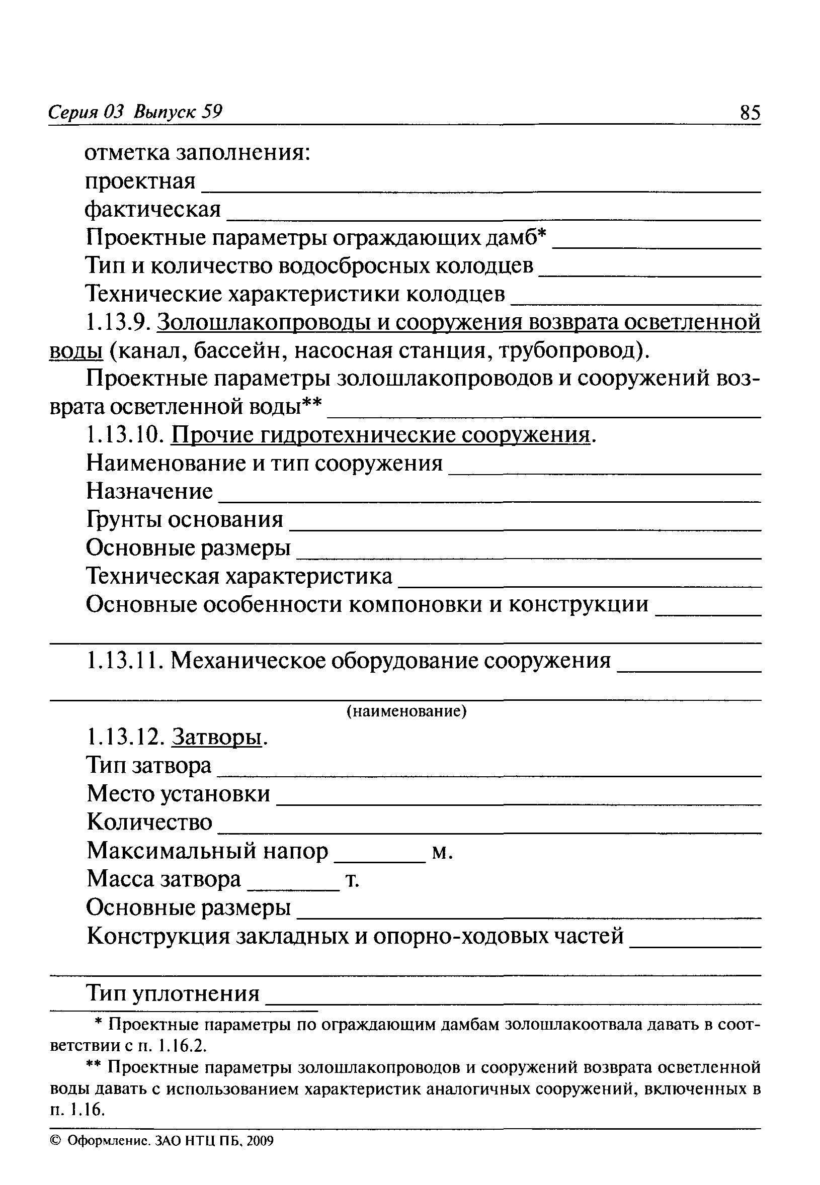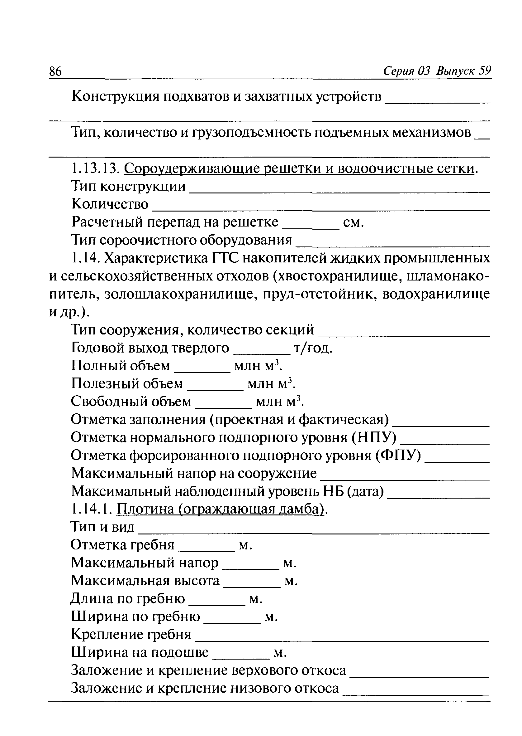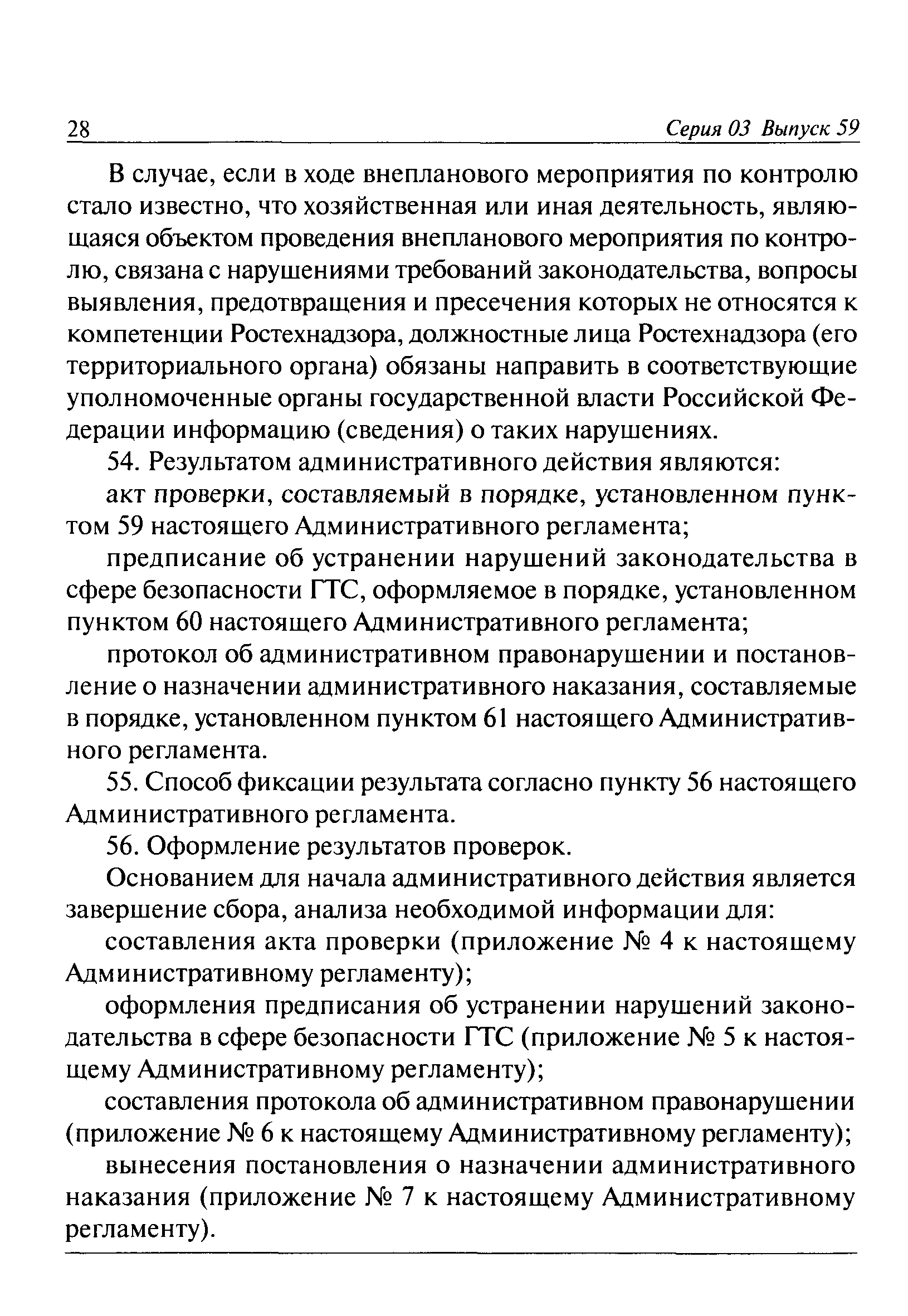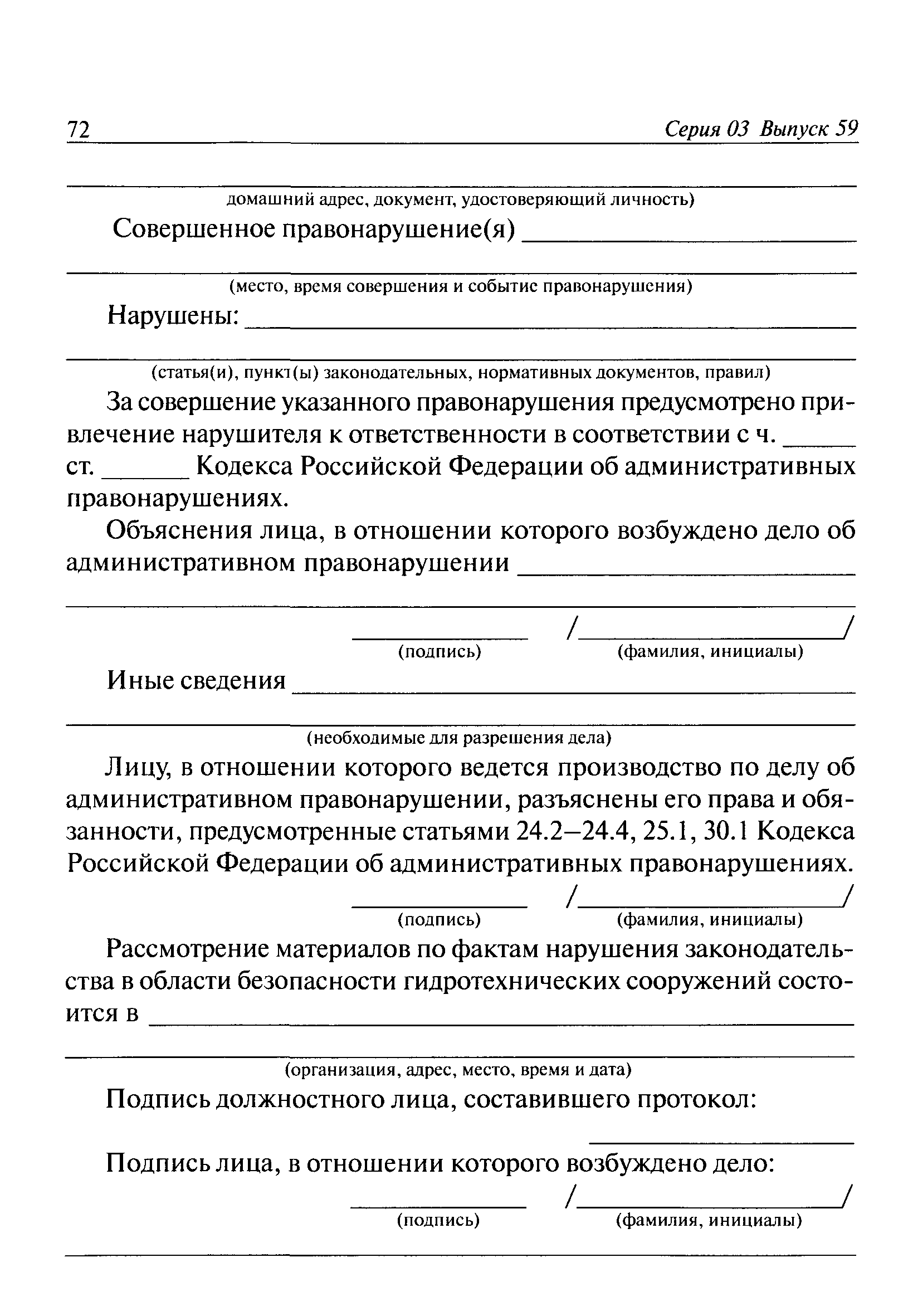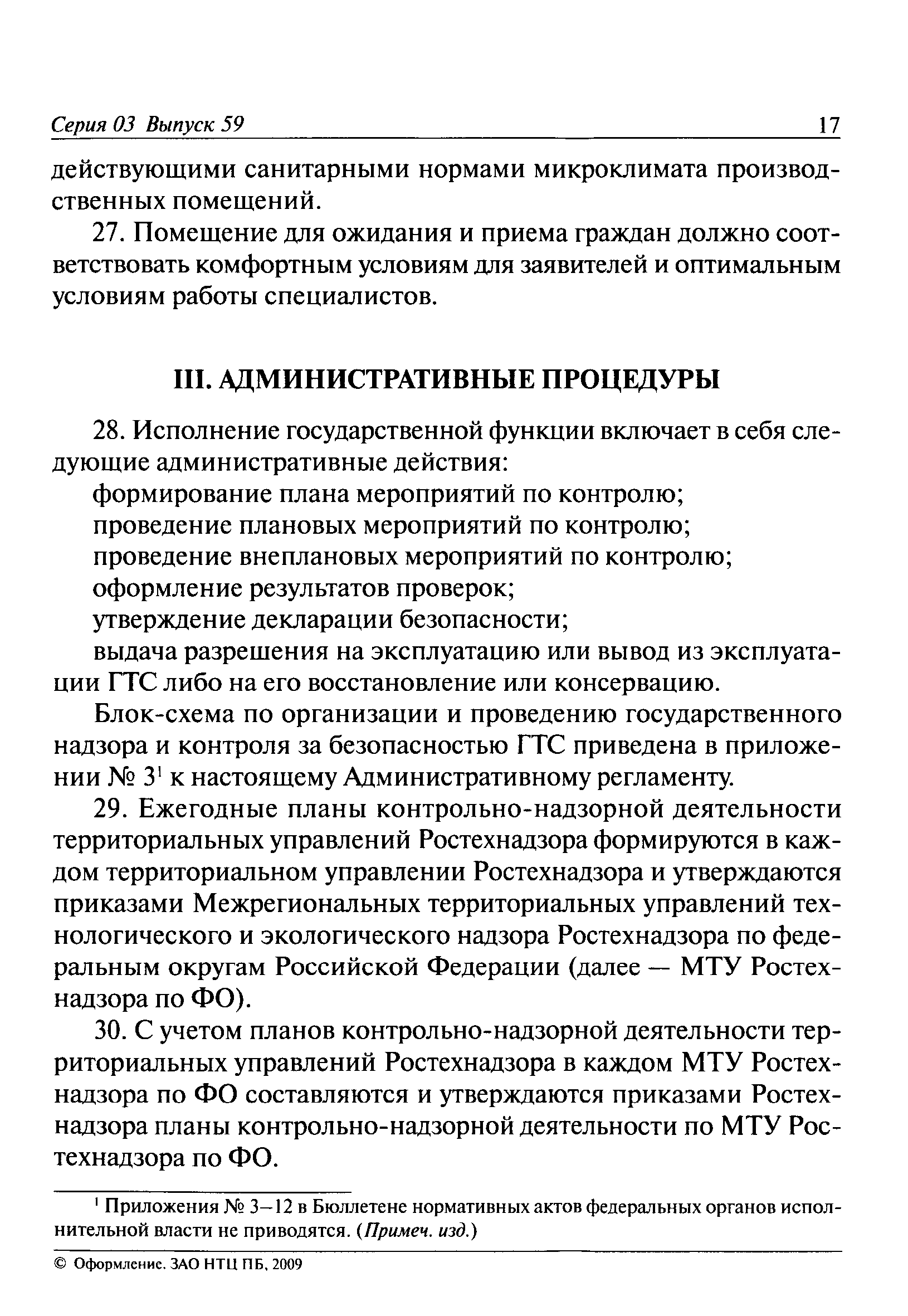 | Оглавление: | I. Общие положения II. Требования к порядку исполнения государственной функции III. Административные процедуры IV. Порядок и формы контроля за исполнением государственной функции V. Порядок обжалования действий (бездействий) должностного лица, а также принимаемого им решения при исполнении государственной функции Приложение № 1 Сведения о местонахождении и контактных телефонах центрального аппарата и территориальных органов Ростехнадзора Приложение № 2 Перечень должностных лиц Федеральной службы по экологическому, технологическому и атомному надзору, осуществляющих государственный контроль и надзор за безопасностью гидротехнических сооружений (соблюдением норм и правил безопасности), кроме судоходных гидротехнических сооружений, их права и обязанности Приложение № 3 Блок-схема по организации и проведению государственного контроля и надзора за безопасностью ГТС Приложение № 4 Форма акта проверки соблюдения требований законодательства в сфере безопасности гидротехнических сооружений Приложение № 5 Форма предписания об устранении нарушений законодательства в области безопасности гидротехнических сооружений Приложение № 6 Форма протокола об административном правонарушении Приложение № 7 Форма постановления о назначении административного наказания Приложение № 8 Форма Акта преддекларационного обследования гидротехнического сооружения Приложение № 9 Дополнительные требования к содержанию декларации безопасности, учитывающие особенности декларирования безопасности гидротехнических сооружений объектов энергетики I. Общая информация II. Анализ безопасности гидротехнических сооружений III. Обеспечение готовности объекта к локализации и ликвидации опасных повреждений и аварий гидротехнических сооружений и действиям в условиях возникновения чрезвычайной ситуации IV. Информирование населения и органов исполнительной власти V. Заключение VI. Список источников информации, использованных при разработке декларации безопасности гидротехнических сооружений VII. Приложения к декларации безопасности Дополнительные требования к содержанию декларации безопасности проектируемого гидротехнического сооружения Дополнительные требования к содержанию декларации безопасности строящегося гидротехнического сооружения Дополнительные требования к содержанию декларации безопасности гидротехнических сооружений тепловых электростанций при наличии в составе сооружений золошлакоотвалов Приложение № 10 Дополнительные требования к содержанию декларации безопасности, учитывающие особенности декларирования безопасности гидротехнических сооружений объектов промышленности (организаций, производств и объектов) I. Аннотация II. Список разработчиков декларации III. Оглавление IV. Общая информация V. Анализ безопасности ГТС VI. Обеспечение готовности ГТС к локализации и ликвидации опасных повреждений и аварийных ситуаций VII. Информировании общественности VIII. Заключение IX. Приложения к декларации безопасности Дополнительные требования к содержанию декларации безопасности проектируемого гидротехнического сооружения Дополнительные требования к содержанию декларации безопасности строящегося гидротехнического сооружения Дополнительные требования к содержанию декларации безопасности гидротехн