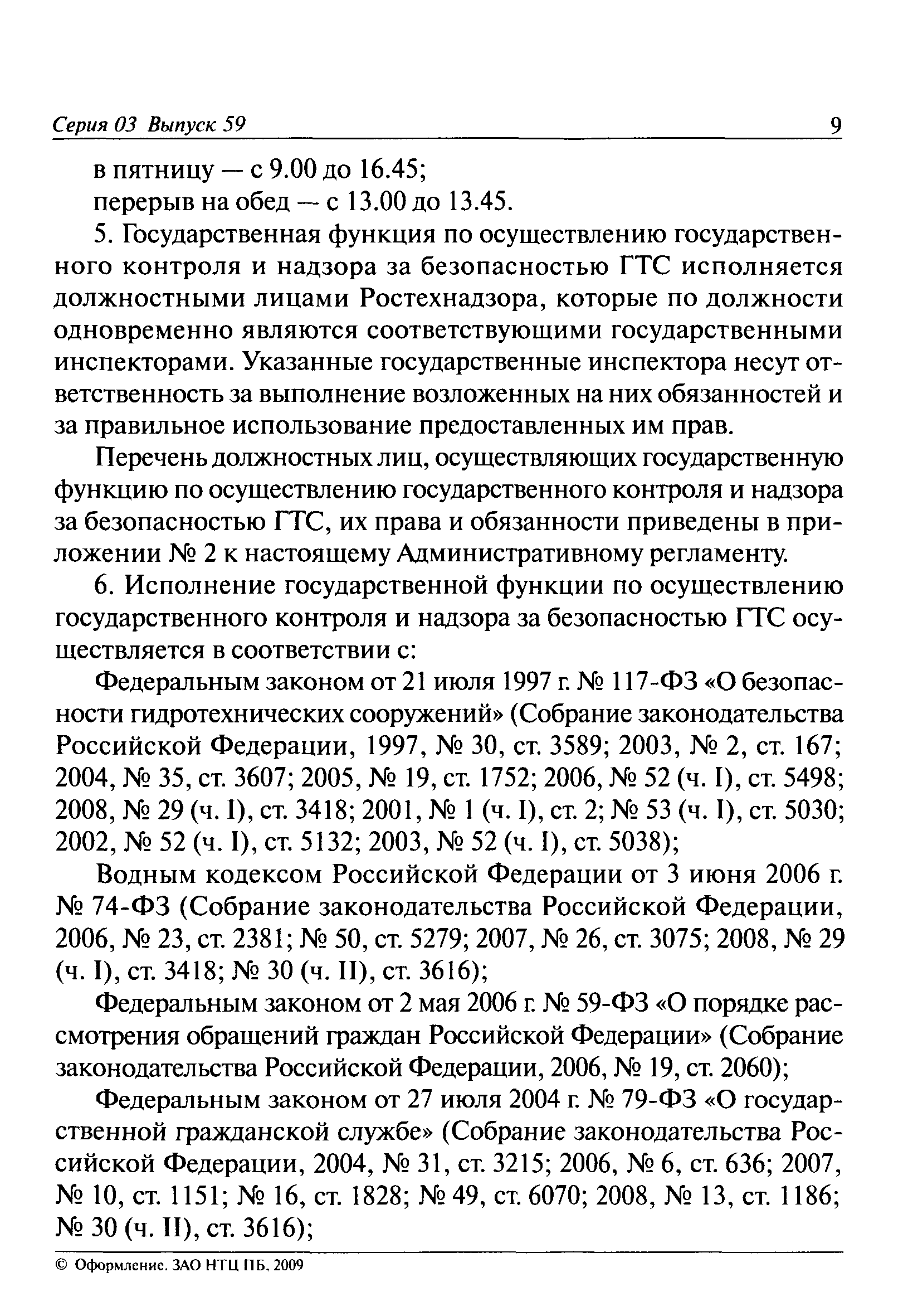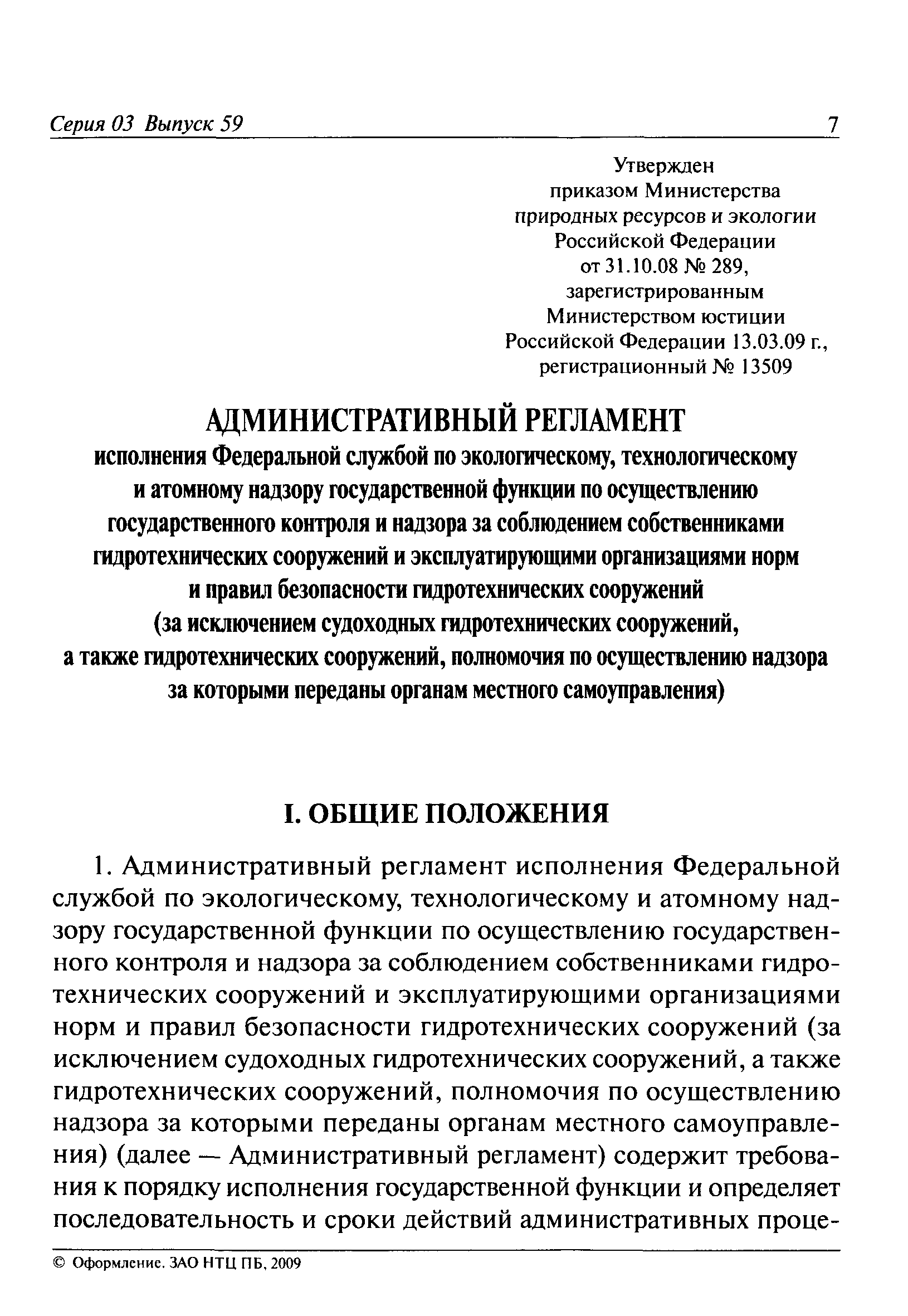| Область применения: | Административный регламент содержит требования к порядку исполнения государственной функции и определяет последовательность и сроки действий административных процедур по исполнению государственной функции, порядок и формы контроля за исполнением государственной функции, порядок обжалования действий (бездействий) должностного лица, а также принимаемого им решения при исполнении государственной функции по осуществлению контроля и надзора за соблюдением собственниками гидротехнических сооружений и эксплуатирующими организациями норм и правил безопасности гидротехнических сооружений, кроме судоходных гидротехнических сооружений, а также гидротехнических сооружений, полномочия по осуществлению надзора за которыми переданы органам местного самоуправления. |