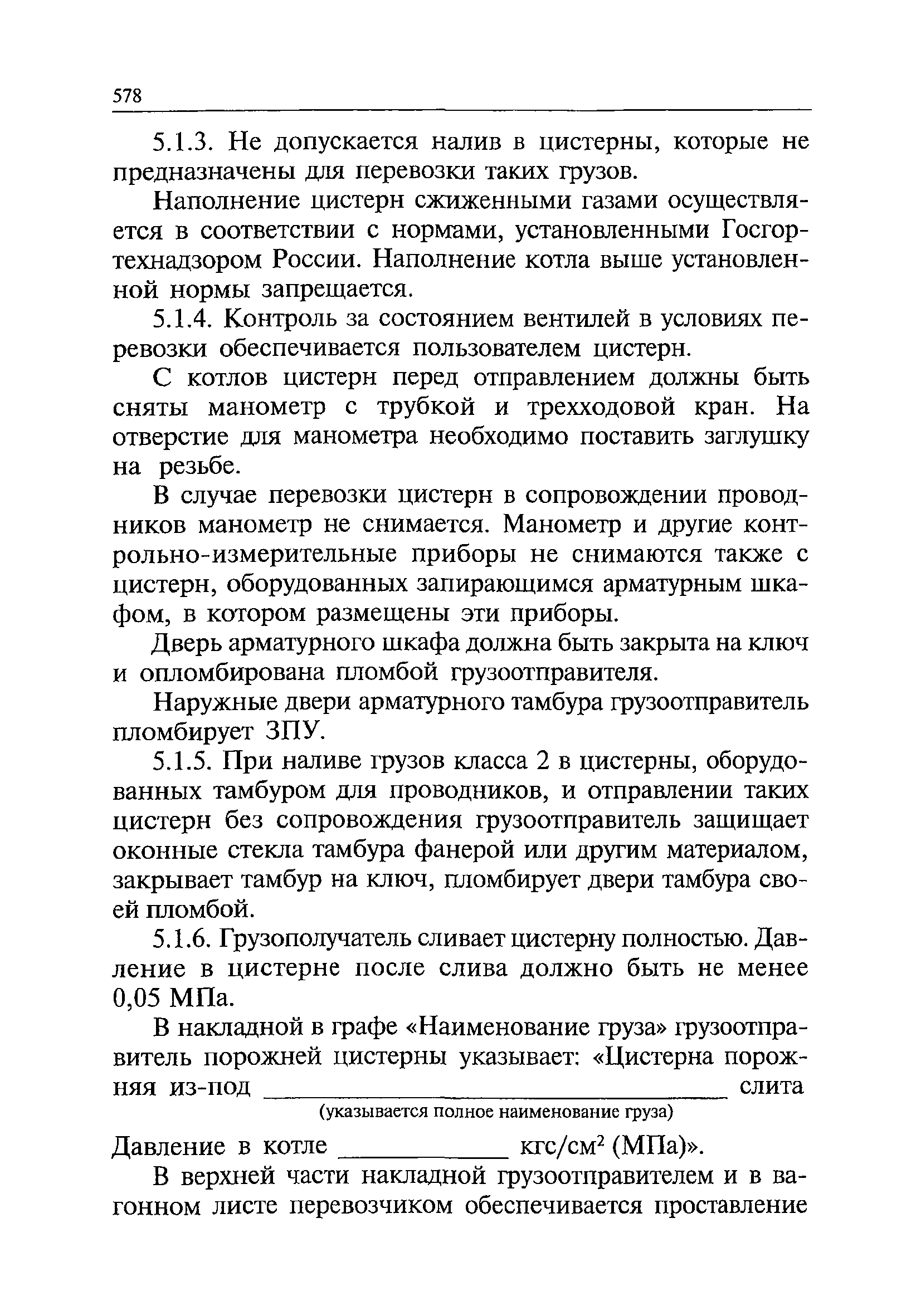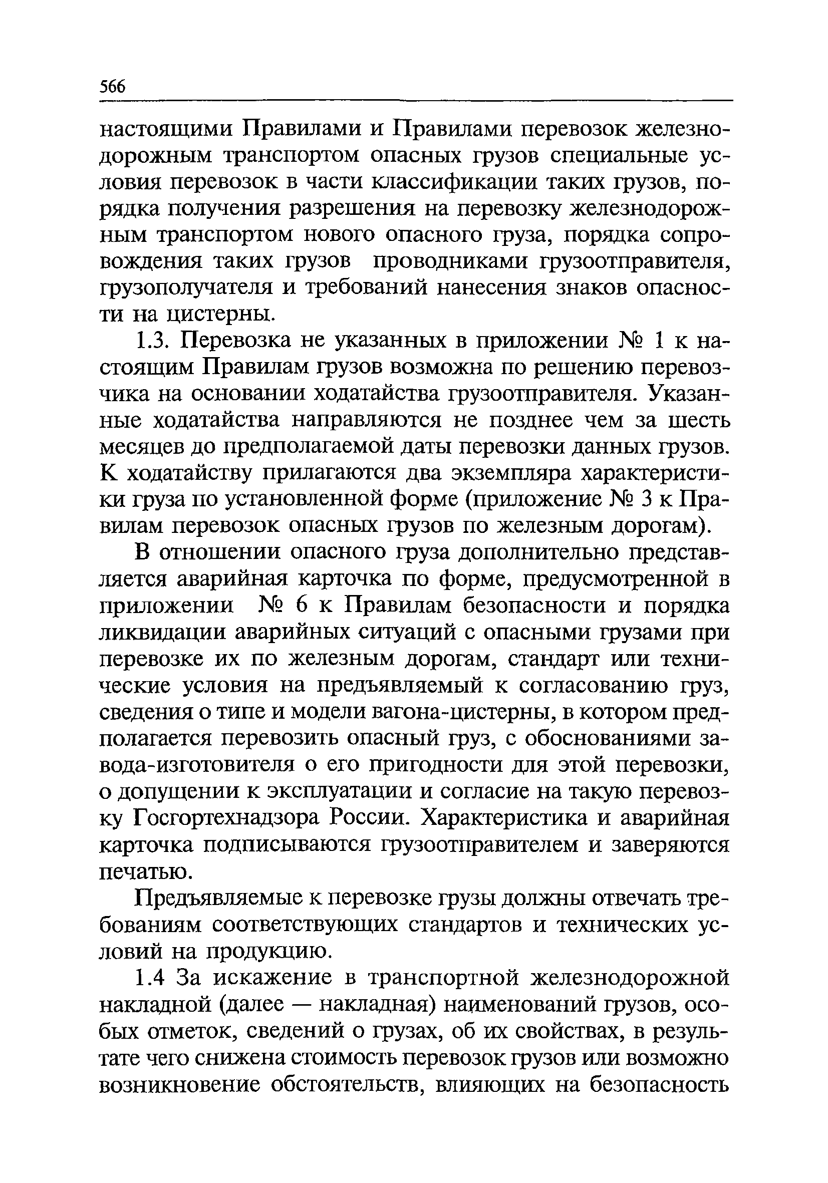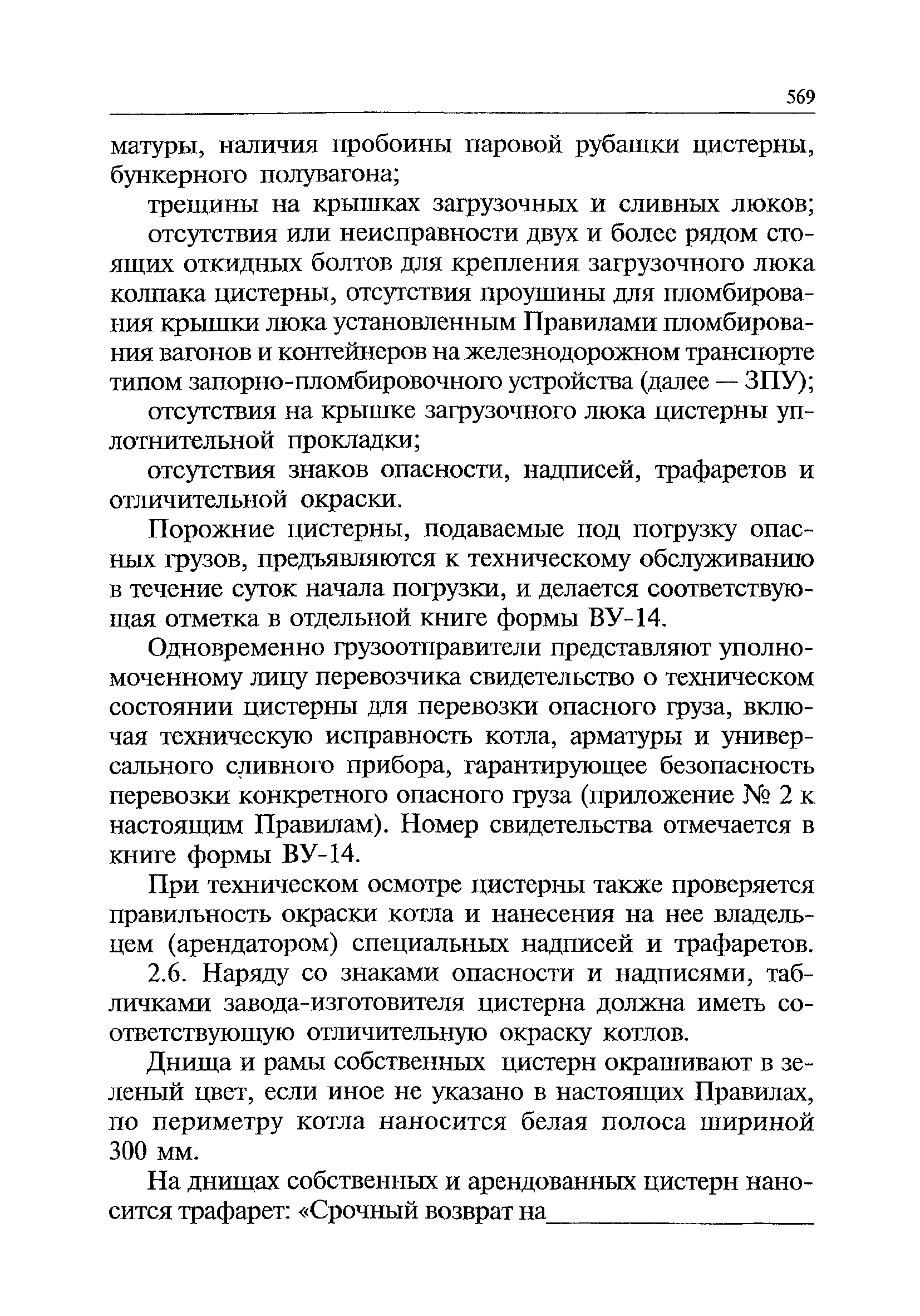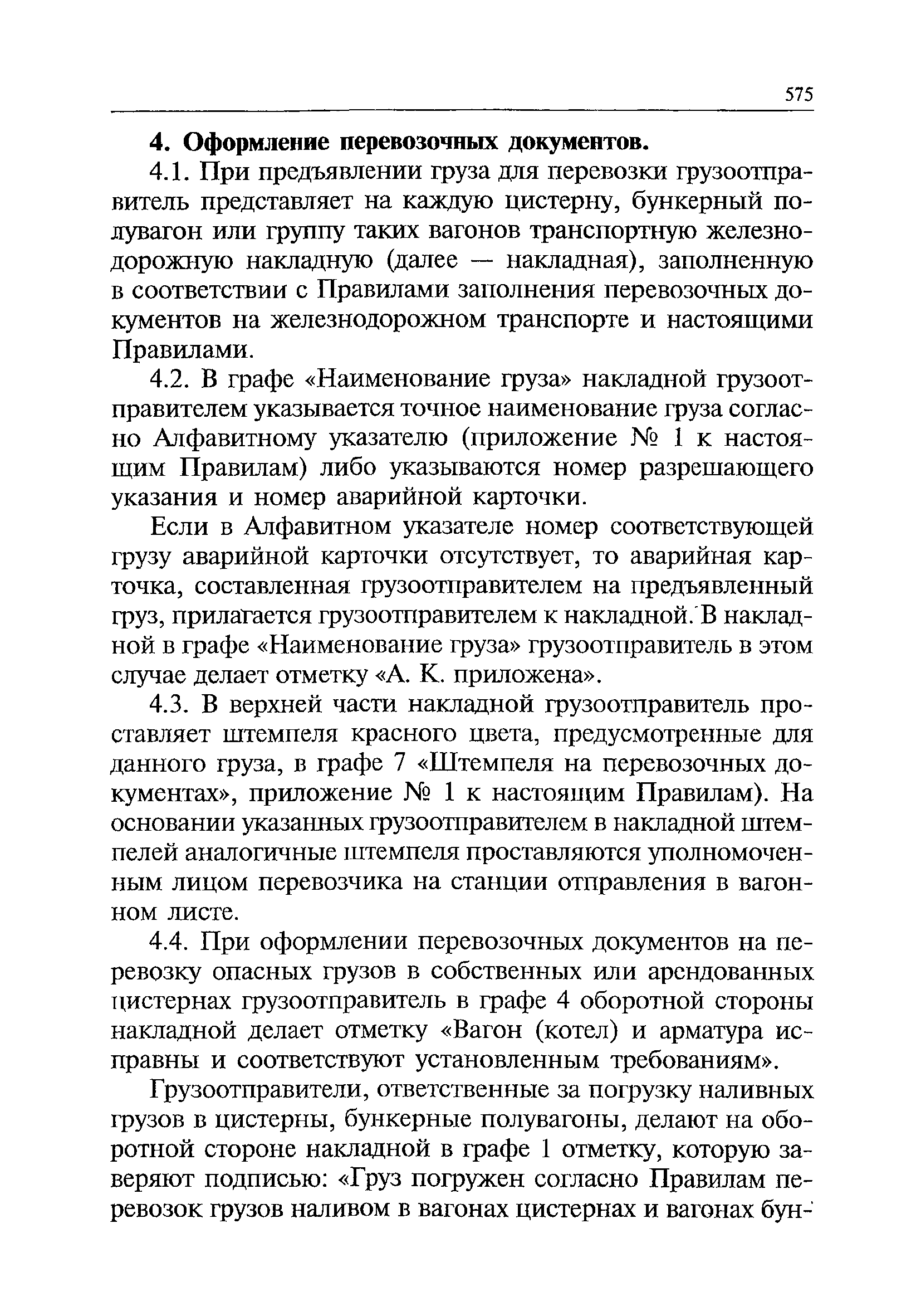 | Оглавление: | 1. Общие положения 2. Требования к цистернам и бункерным полувагонам 3. Налив и слив грузов 4. Оформление перевозочных документов 5. Специальные условия перевозок опасных грузов наливом в цистернах 6. Порядок действий при обнаружении неисправности цистерн Приложение № 1. Алфавитный указатель перевозимых грузов наливом в вагонах- цистернах и в вагонах бункерного типа для перевозки нефтебитума (кроме скоропортящихся) Приложение № 2 Свидетельство о техническом состоянии вагона-цистерны для перевозки опасного груза Приложение № 3 Расчет степени заполнения цистерн грузами, перевозимыми наливом Приложение № 4 Образцы накладных |