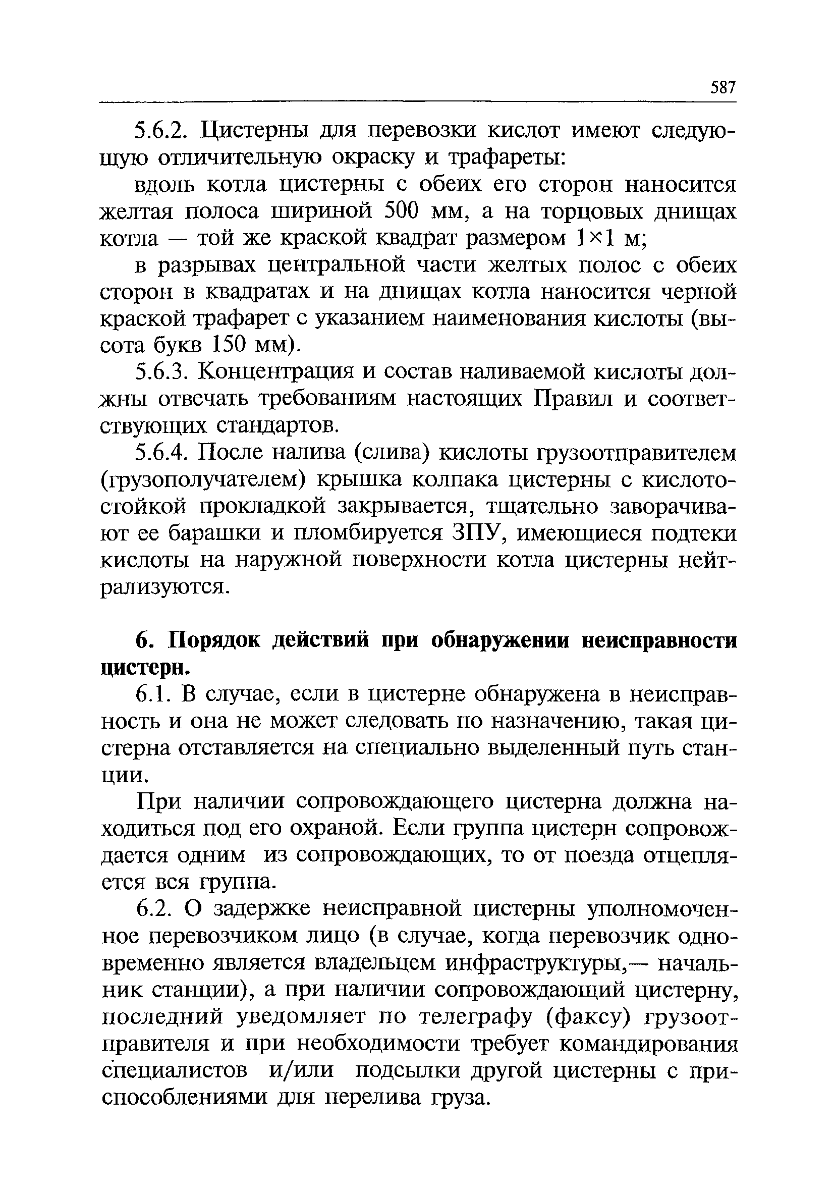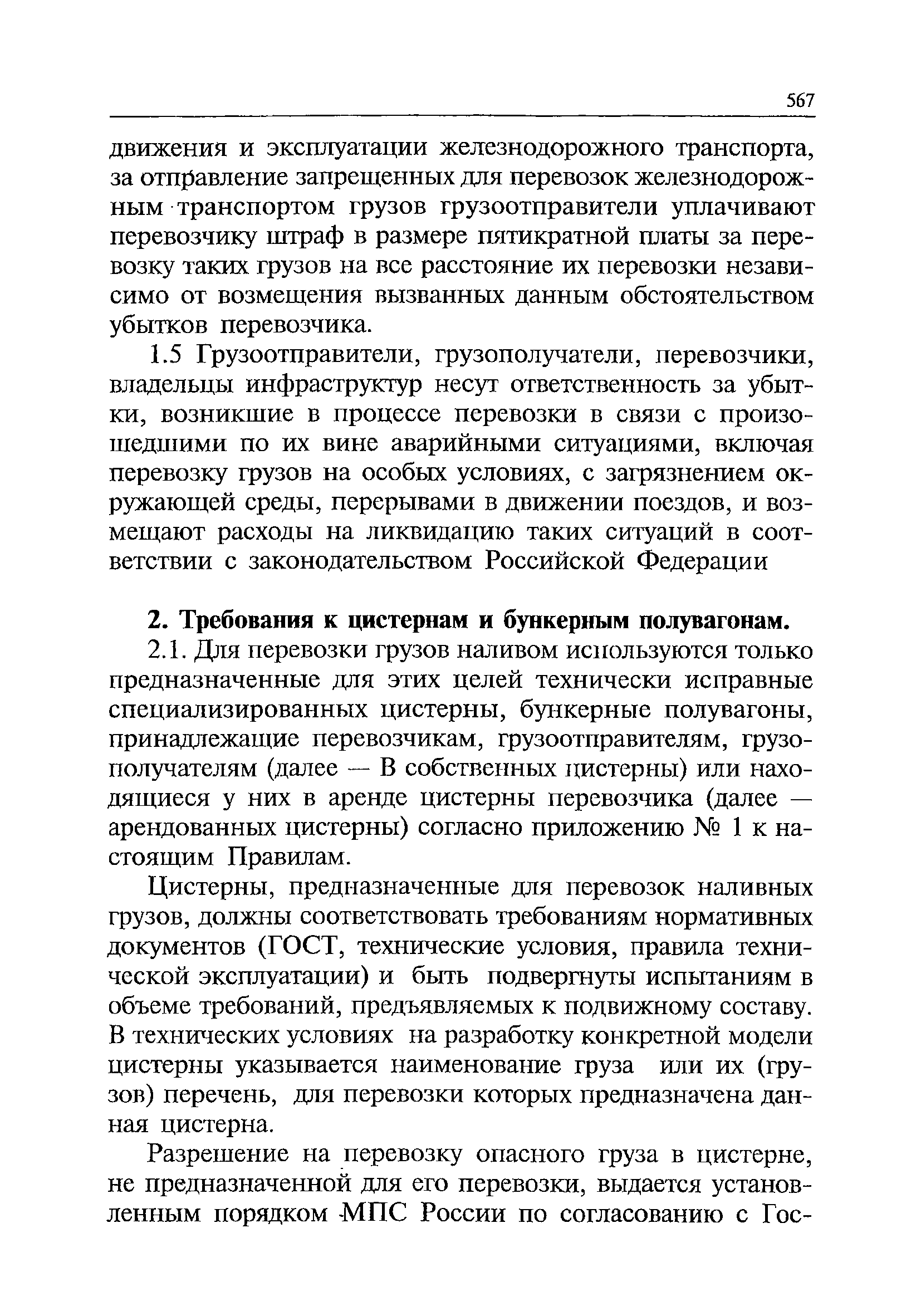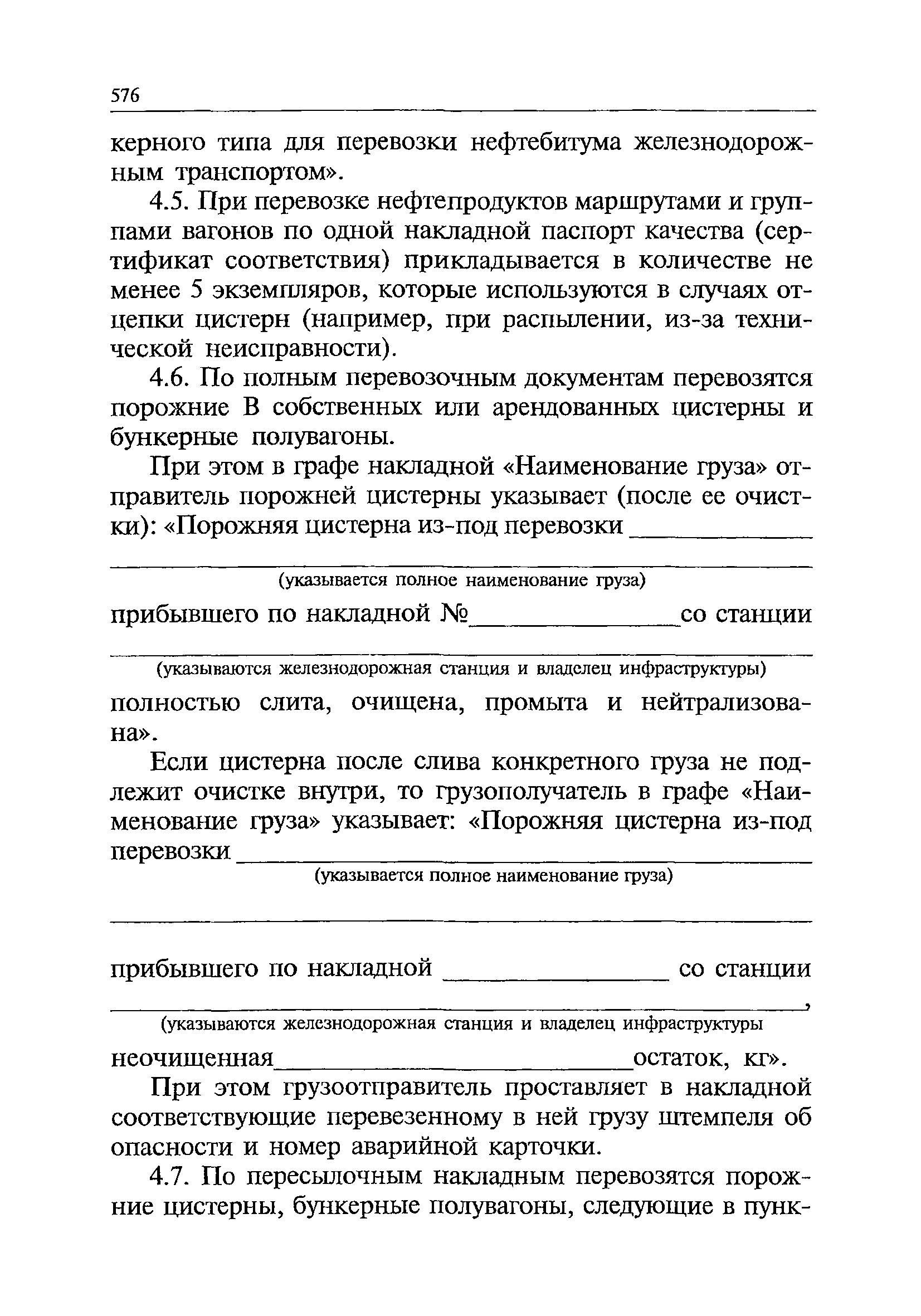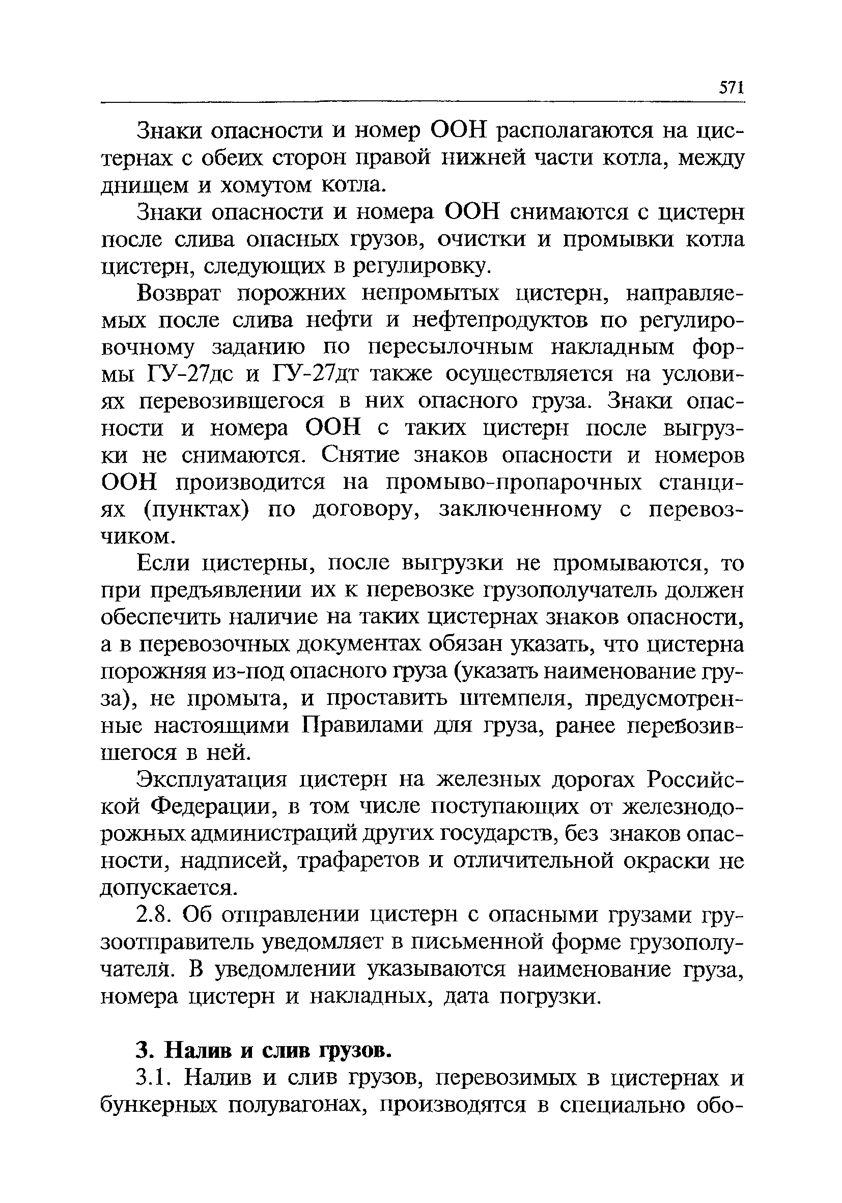| Оглавление: | 1. Общие положения 2. Требования к цистернам и бункерным полувагонам 3. Налив и слив грузов 4. Оформление перевозочных документов 5. Специальные условия перевозок опасных грузов наливом в цистернах 6. Порядок действий при обнаружении неисправности цистерн Приложение № 1. Алфавитный указатель перевозимых грузов наливом в вагонах- цистернах и в вагонах бункерного типа для перевозки нефтебитума (кроме скоропортящихся) Приложение № 2 Свидетельство о техническом состоянии вагона-цистерны для перевозки опасного груза Приложение № 3 Расчет степени заполнения цистерн грузами, перевозимыми наливом Приложение № 4 Образцы накладных |