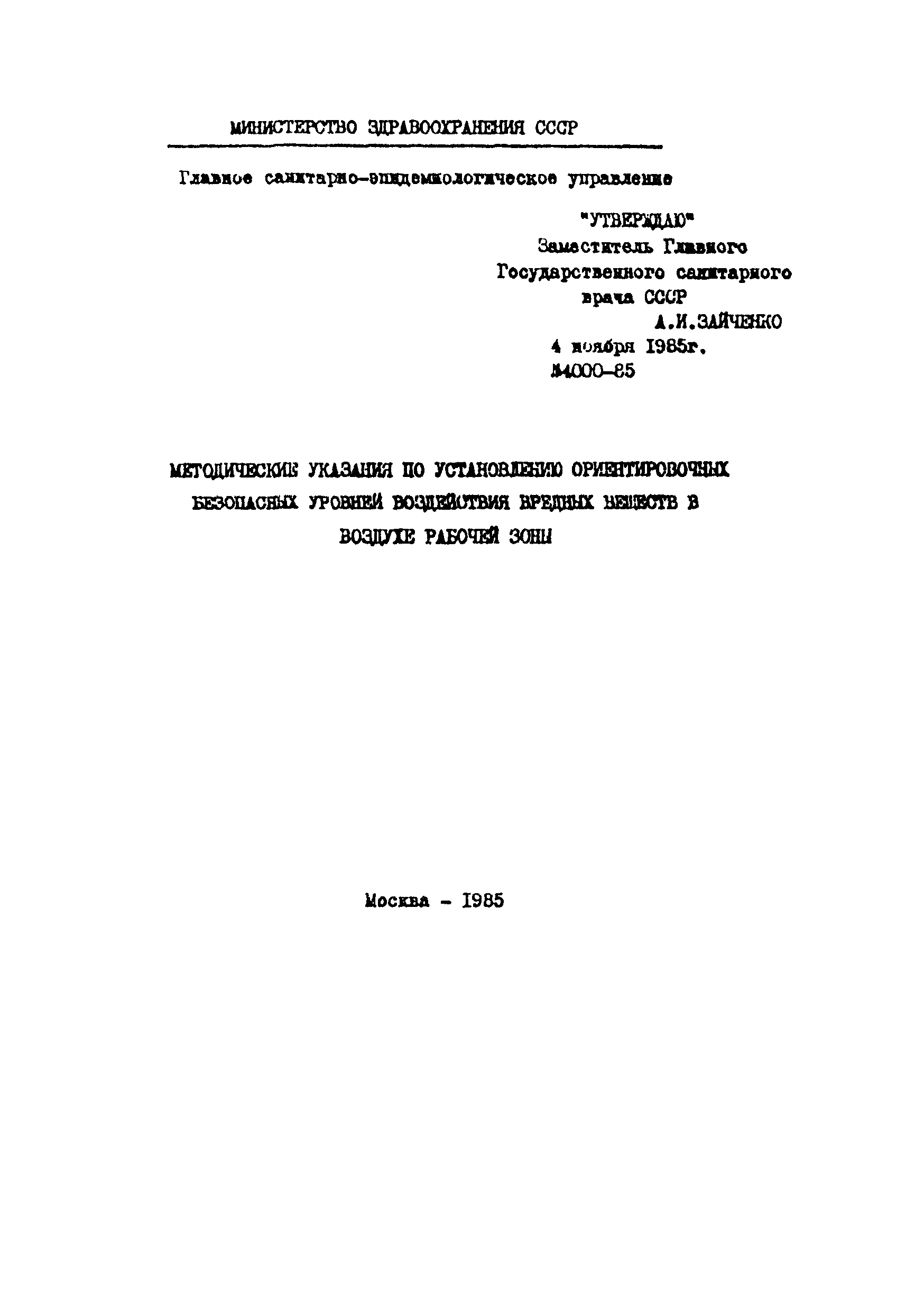 | Утверждён: | 04.11.1985 Заместитель Главного государственного санитарного врача РФ по объектам и территориям, обслуживаемым ФУ Медбиоэкстрем (54000-85)