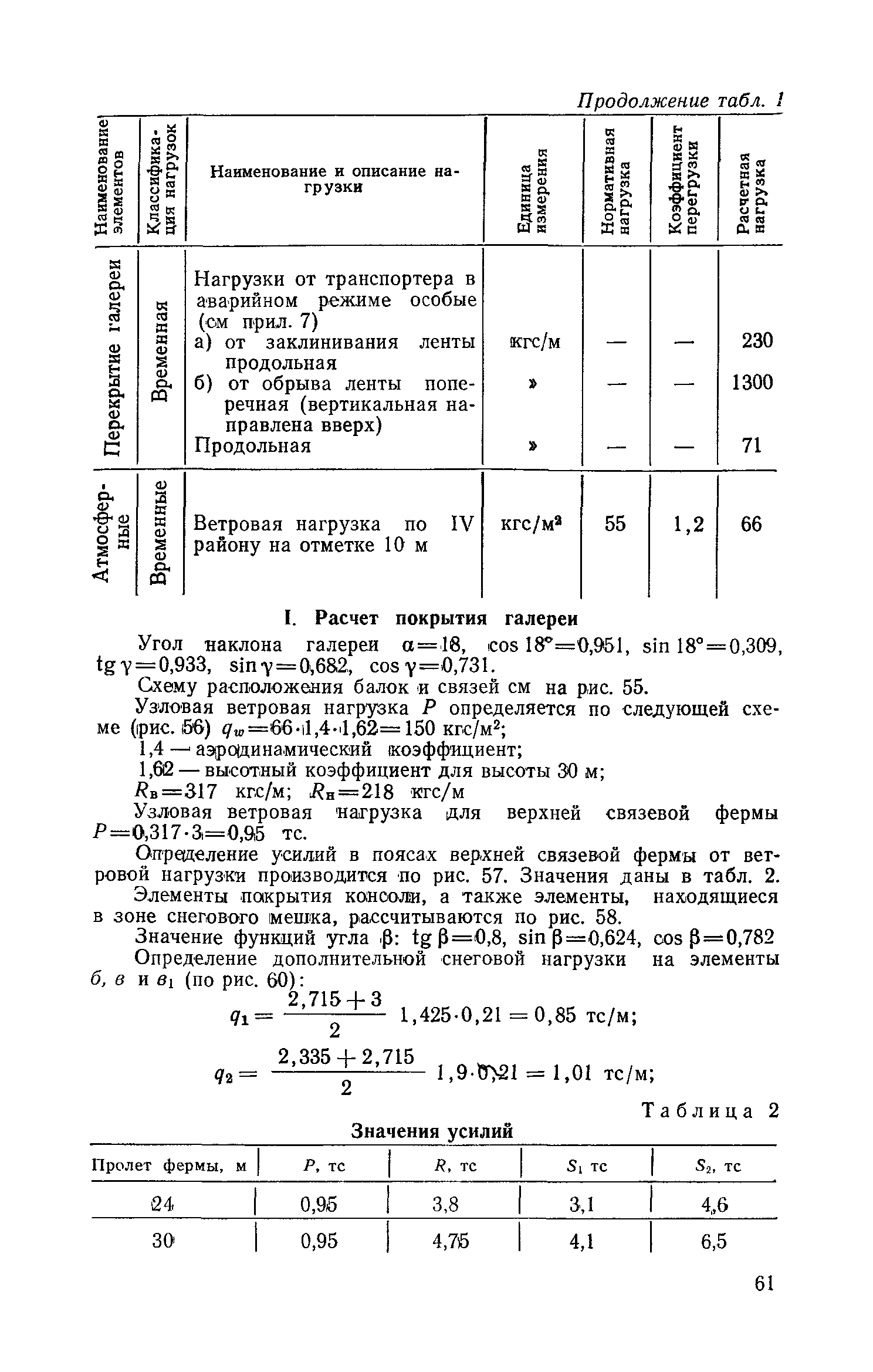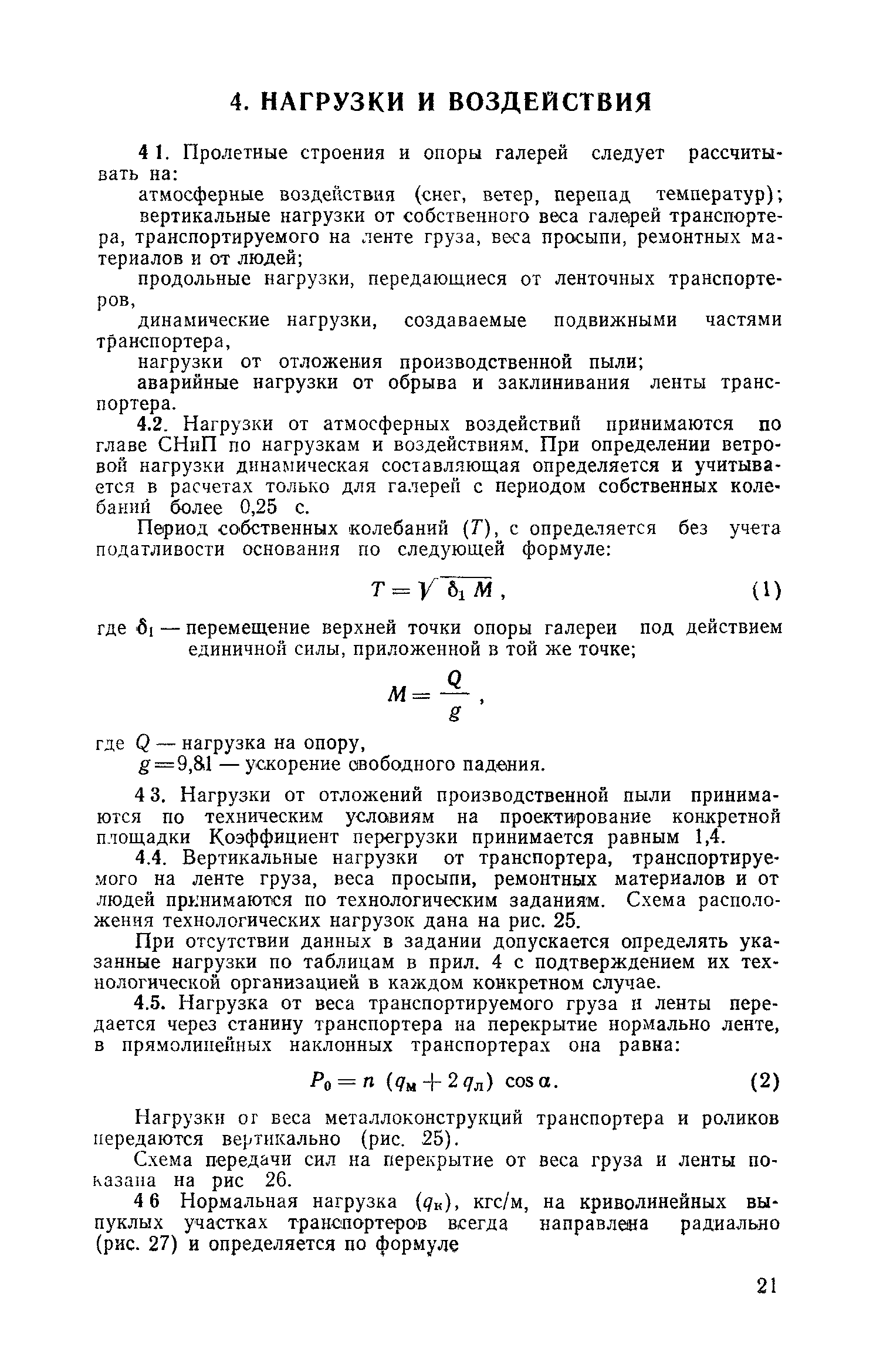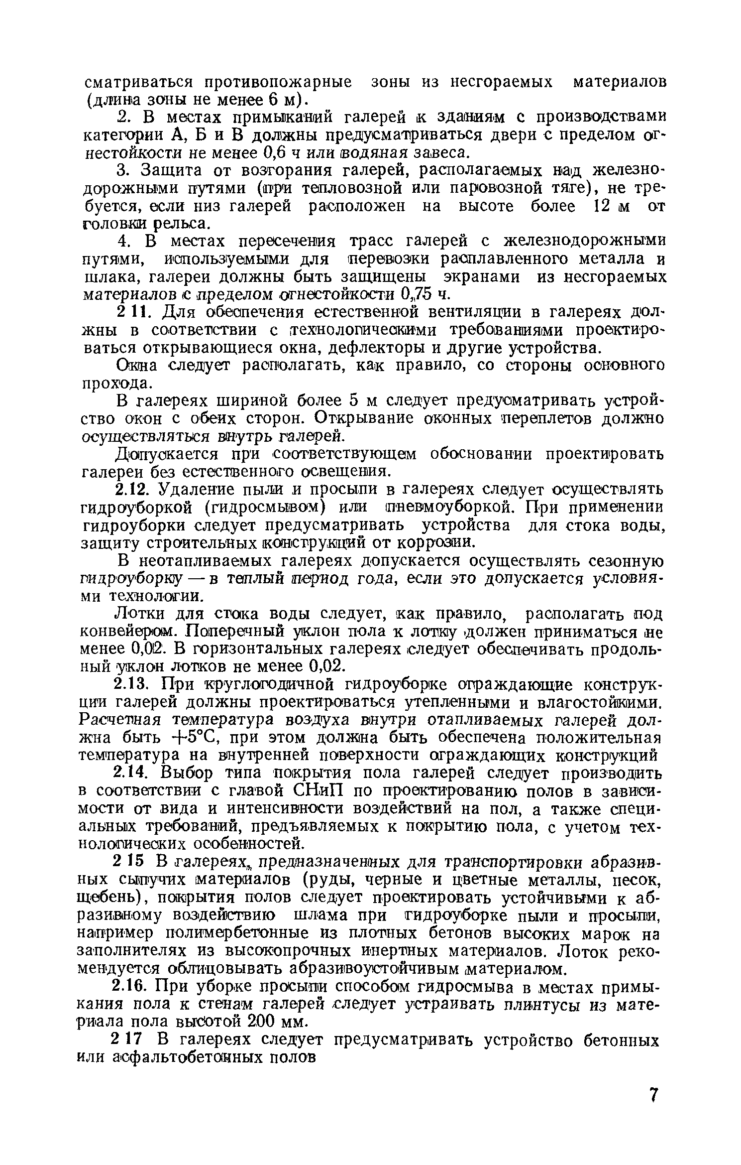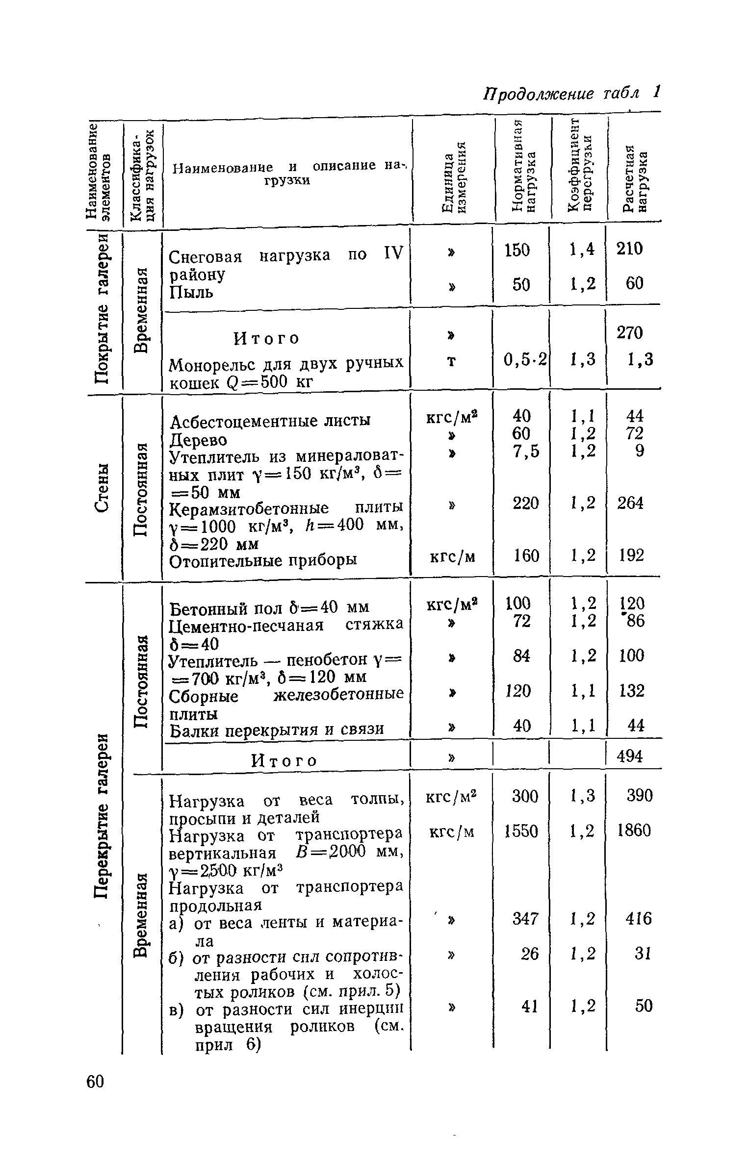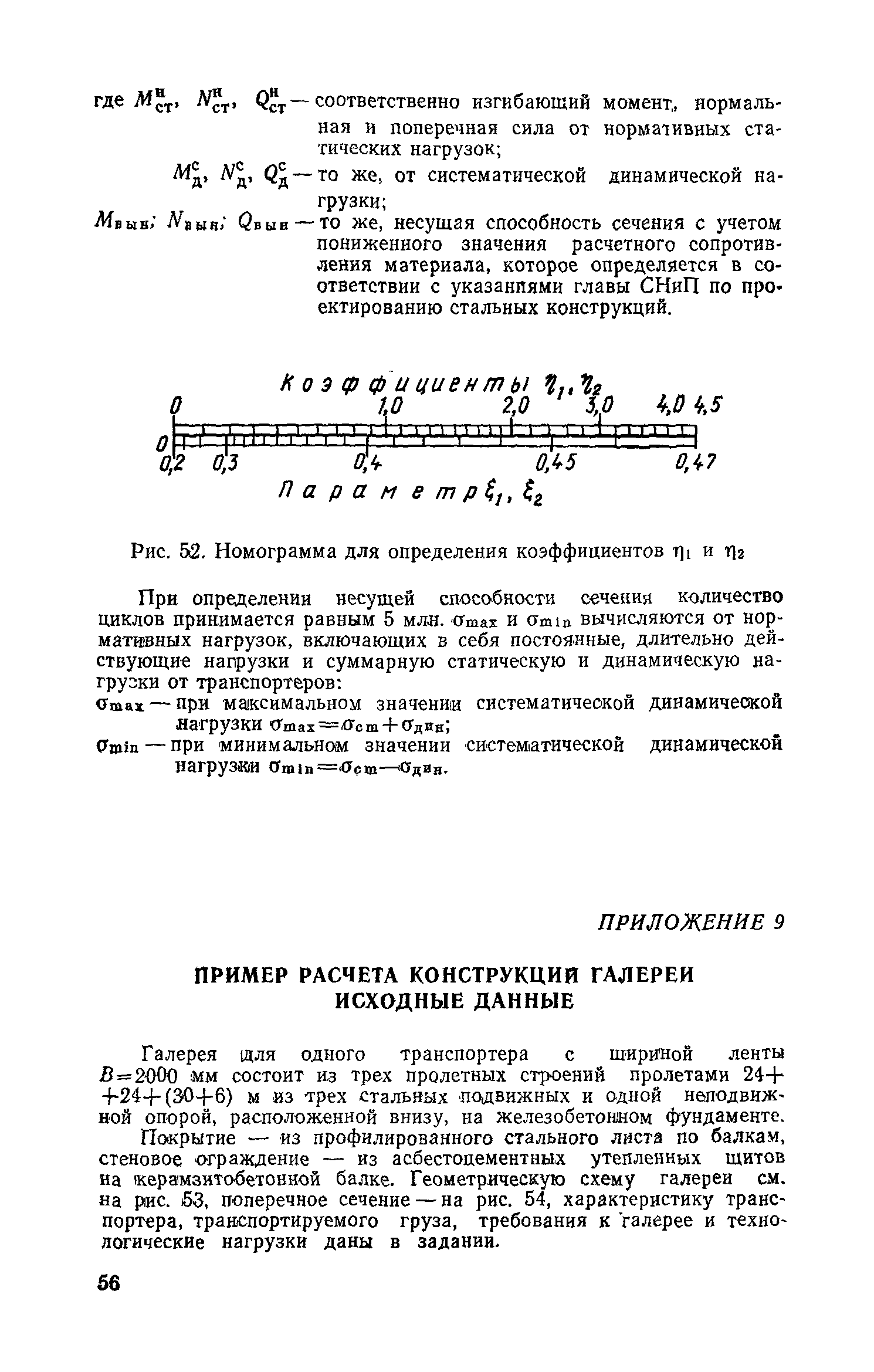 | Оглавление: | 1 Общие положения 2 Объемно-планировочные решения и ограждающие конструкции 3 Конструктивные решения 4 Нагрузки и воздействия 5 Расчет строительных конструкций Приложение 1 Примеры решений галерей с различными конструктивными схемами Приложение 2 Габариты транспортеров и внутренние габариты галерей, рекомендуемые для обогатительных и агломерационных фабрик цветной и черной металлургии Приложение 3 Форма задания (образец) на проектирование строительной части галереи Приложение 4 Унифицированные технологические статические нагрузки от веса транспортируемого груза, ленты, роликоопор, металлоконструкций и просыпи на настиле средней части транспортера и нагрузки от подъемно-транспортных устройств Приложение 5 Определение продольных нагрузок от разности сил сопротивления рабочих и холостых роликов Приложение 6 Определение продольных нагрузок вызываемых разностью сил инерции вращения рабочих и холостых роликов Приложение 7 Определение экстренных (аварийных) нагрузок, вызываемых заклиниванием или обрывом ленты транспортера Приложение 8 Определение динамических нагрузок и расчет пролетных строений галерей на динамические нагрузки Приложение 9 Пример расчета конструкций галереи |