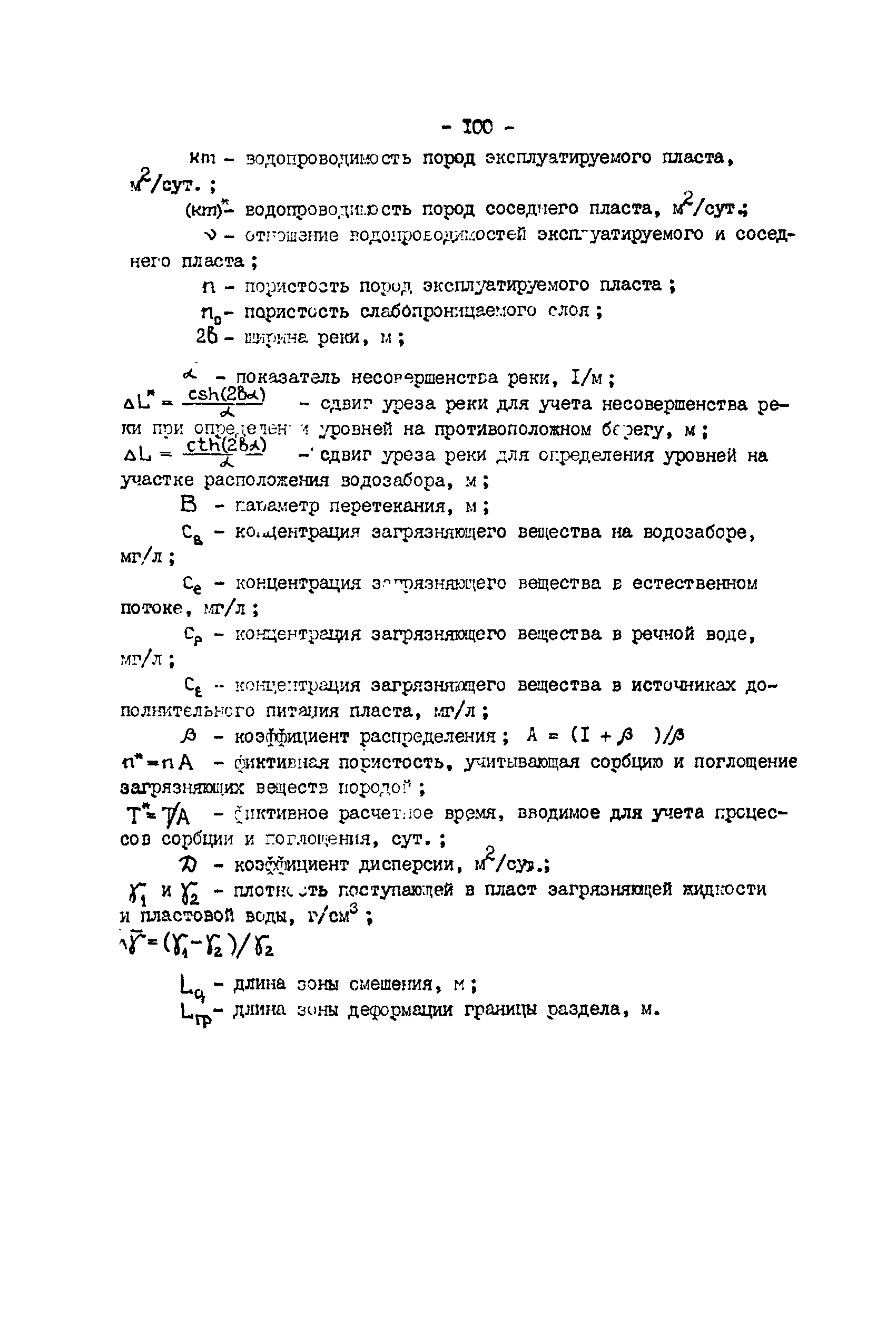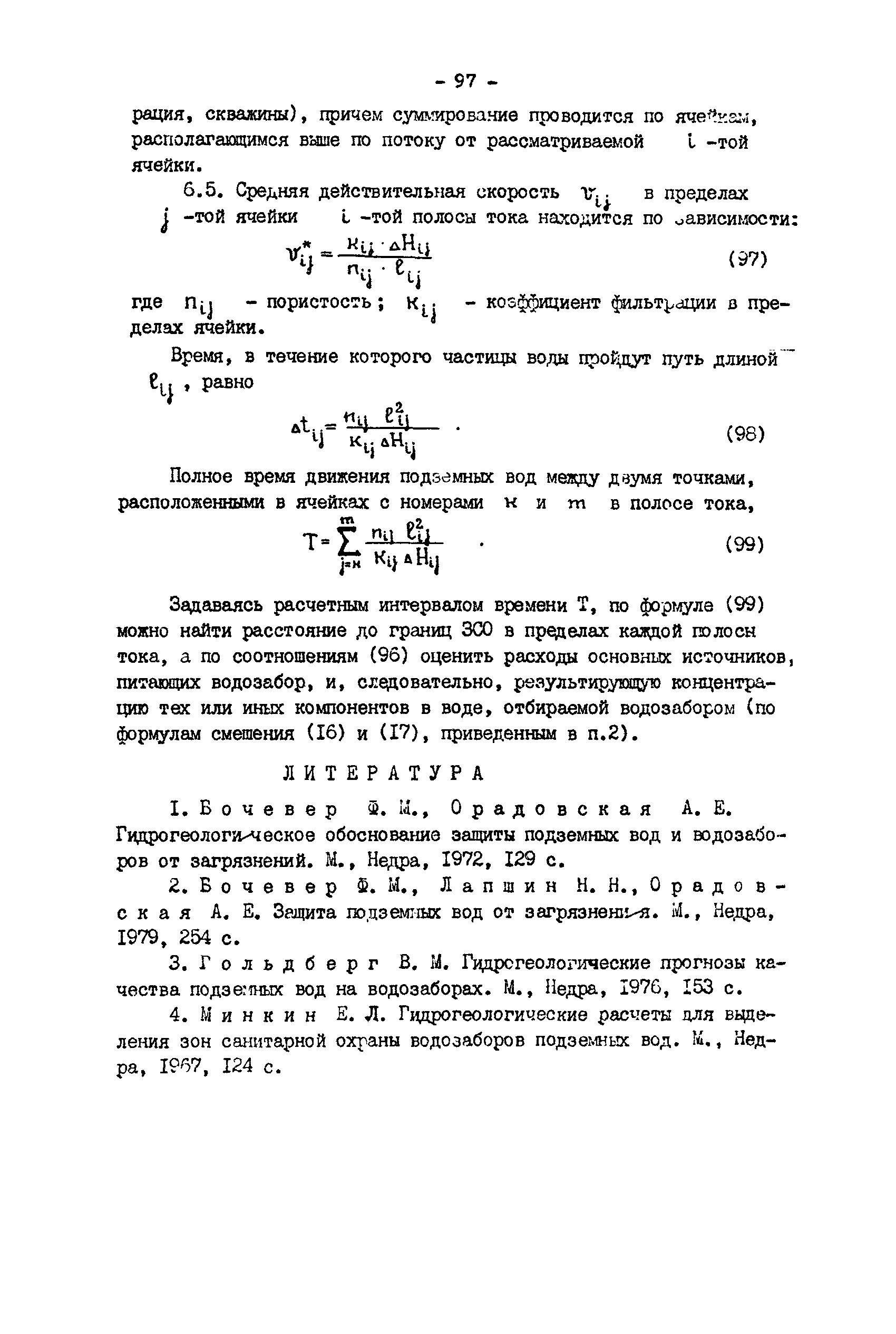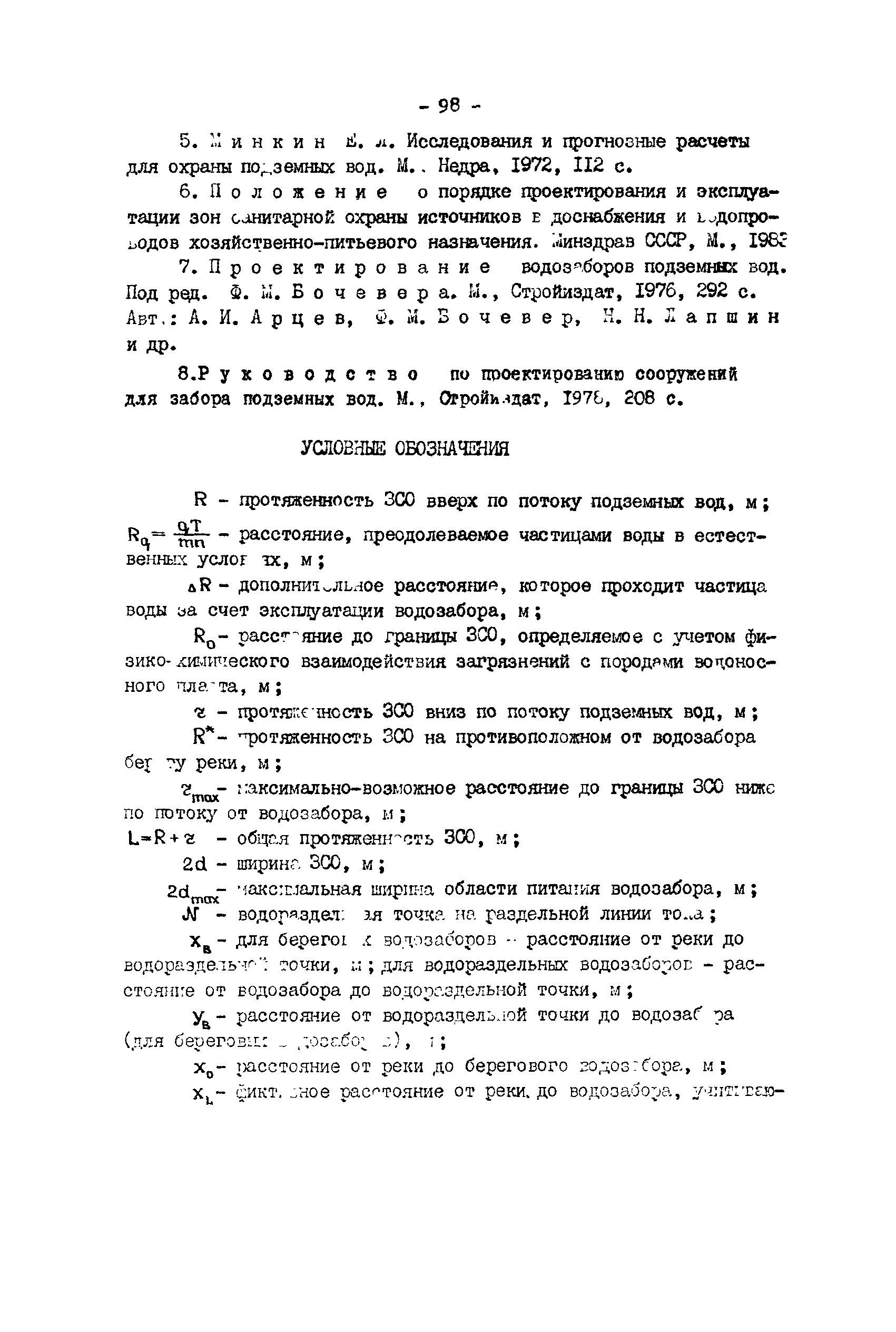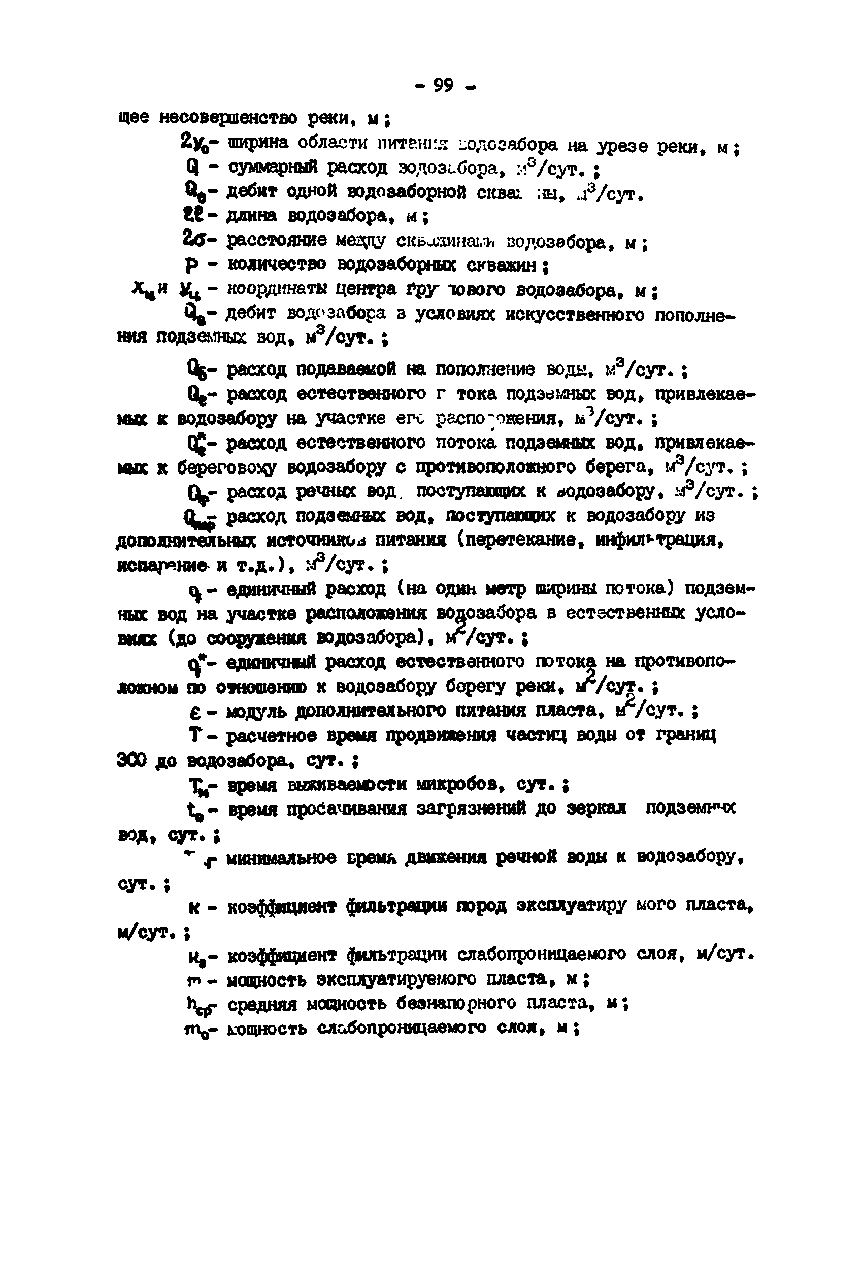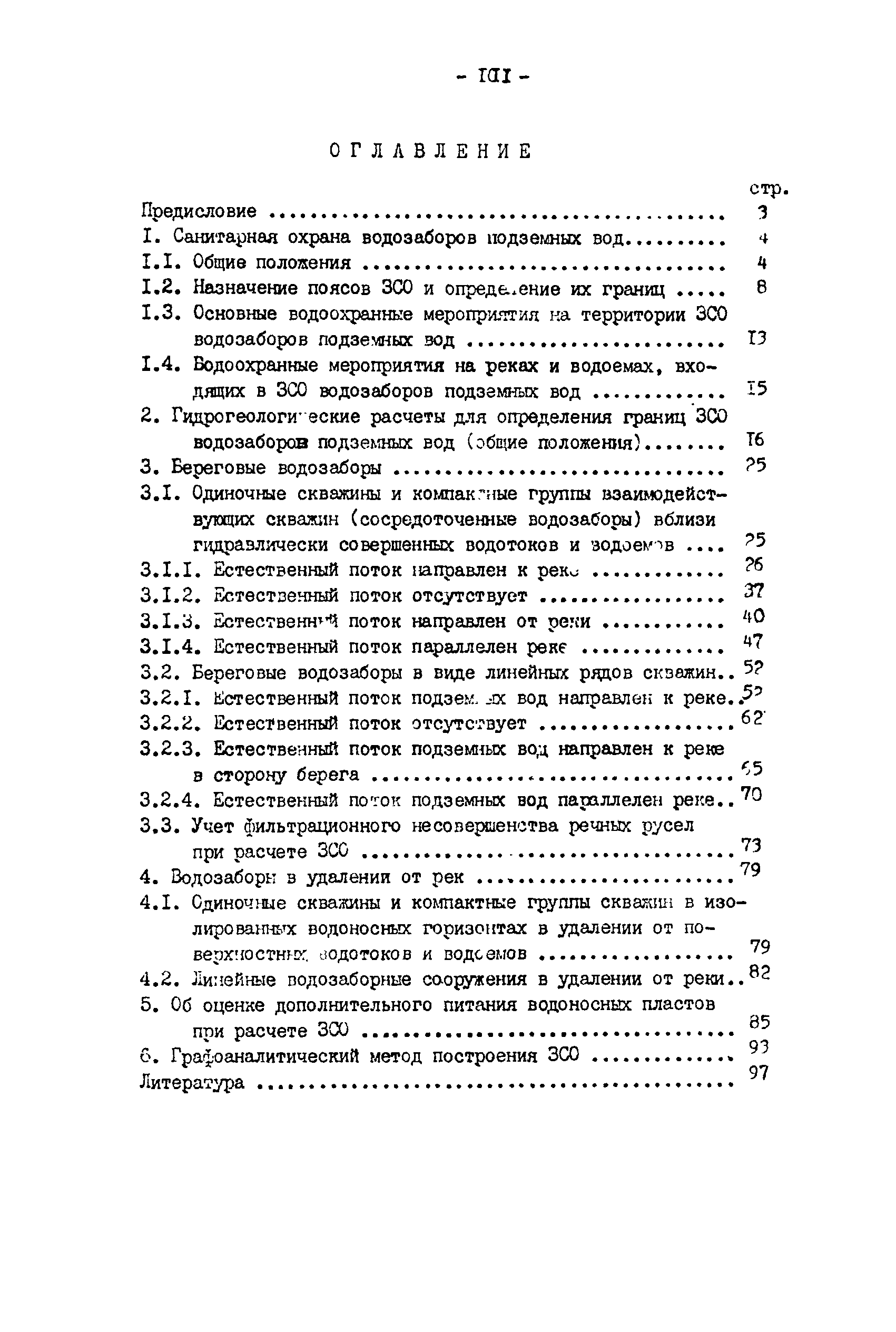 | Оглавление: | Предисловие 1 Санитарная охрана водозаборов подземных вод 1.1. Общие положения 1.2. Назначение поясов ЗСО и определение их границ 1.3. Основные водоохранные мероприятия на территории ЗСО водозаборов подземных вод 1.4. Водоохранные мероприятия на реках и водоемах, входящих в ЗСО водозаборов подземных вод 2 Гидрогеологические расчеты для определения границ зон санитарной охраны водозаборов подземных вод (общие положения) 3 Береговые водозаборы 3.1. Одиночные скважины и компактные группы взаимодействующих скважин (сосредоточенные водозаборы) вблизи гидравлически совершенных водотоков и водоемов 3.1.1. Естественный поток направлен к реке 3.1.2. Естественный поток отсутствует 3.1.3. Естественный поток направлен от реки 3.1.4. Естественный поток параллелен реке 3.2. Береговые водозаборы в виде линейных рядов скважин 3.2.1. Естественный поток подземных вод направлен к реке 3.2.2. Естественный поток отсутствует 3.2.3. Естественный поток подземных вод направлен от реки в сторону берега 3.2.4. Естественный поток подземных вод параллелен реке 3.3. Учет фильтрационного несовершенства речных русел при расчете ЗСО 4 Водозаборы в удалении от рек 4.1. Одиночные скважины и компактные группы взаимодействующих скважин в изолированных водоносных горизонтах в удалении от поверхностных водотоков и водоемов 4.2. Линейные водозаборные сооружения в удалении от реки 5 Об оценке дополнительного питания водоносных пластов при расчете ЗСО 6 Графоаналитический метод построения ЗСО Литература Условные обозначения |