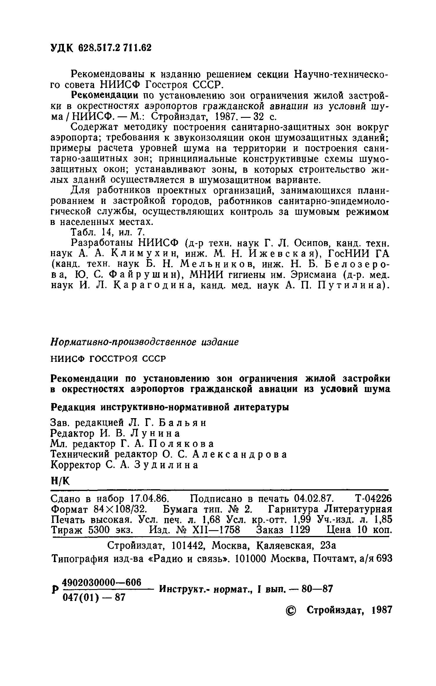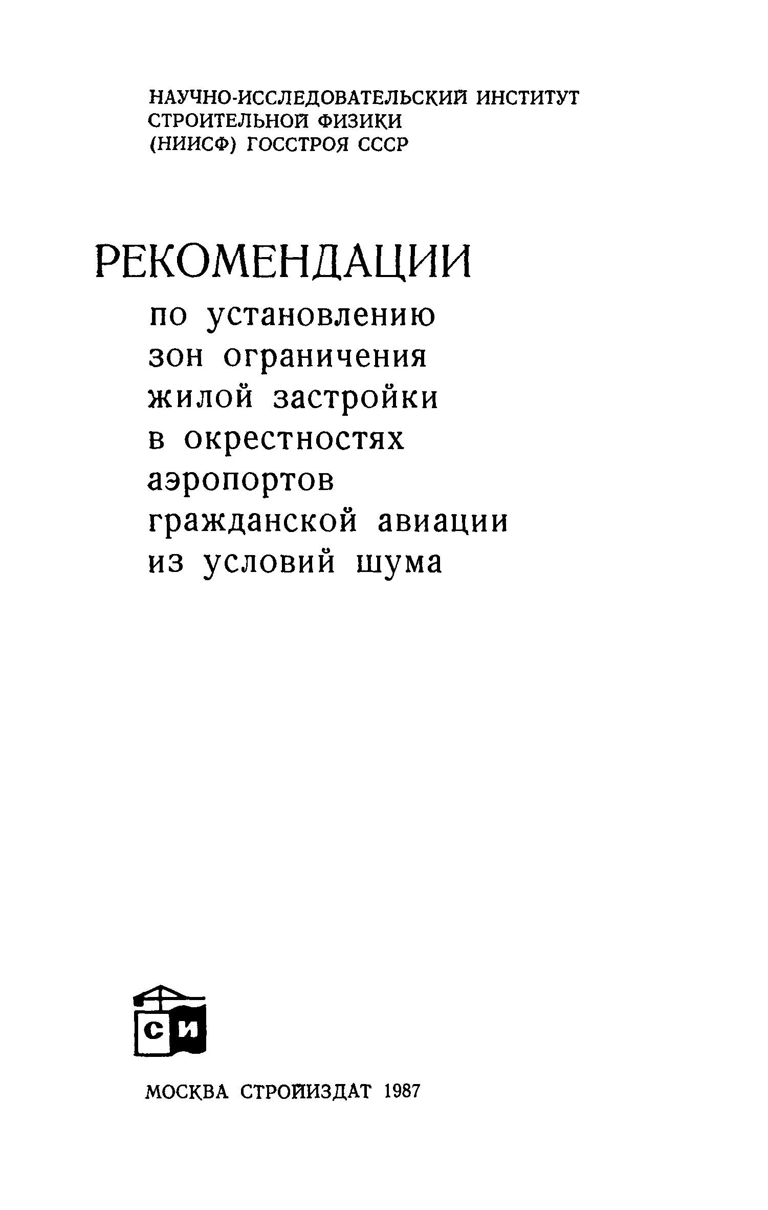| Название рус.: | Рекомендации по установлению зон ограничения жилой застройки в окрестностях аэропортов гражданской авиации из условий шума |