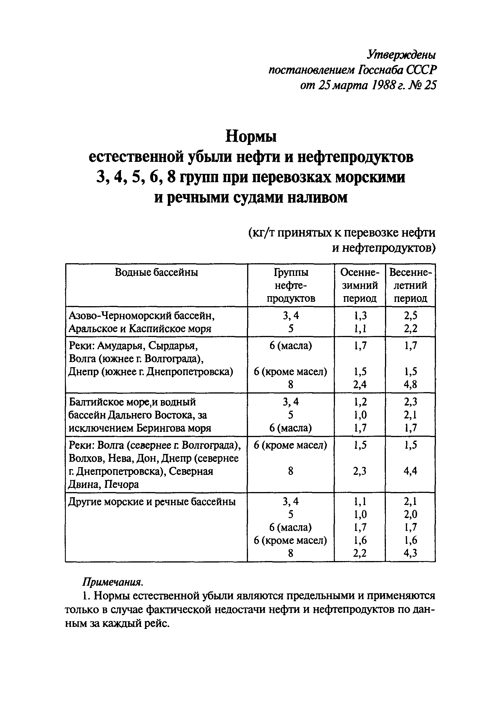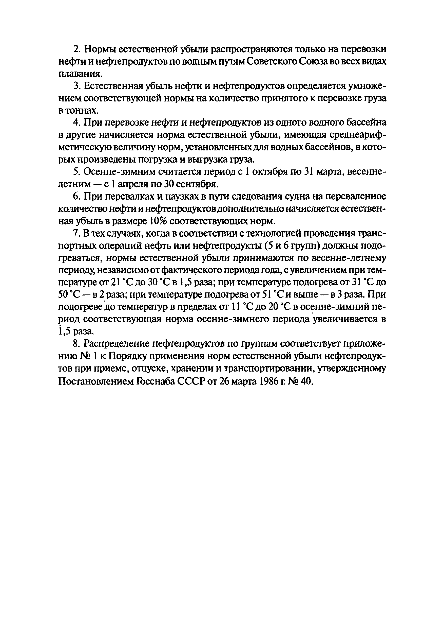 Нормы естественной убыли нефти и нефтепродуктов 3, 4, 5, 6, 8 групп при перевозках морскими и речными судами наливом| Статус: | не действует | | Название рус.: | Нормы естественной убыли нефти и нефтепродуктов 3, 4, 5, 6, 8 групп при перевозках морскими и речными судами наливом | | Дата добавления в базу: | 01.09.2013 | | Дата актуализации: | 01.01.2021 | | Дата окончания срока действия: | 27.01.2011 | | Утверждён: | 25.03.1988 Госснаб СССР (USSR Gossnab 25)
