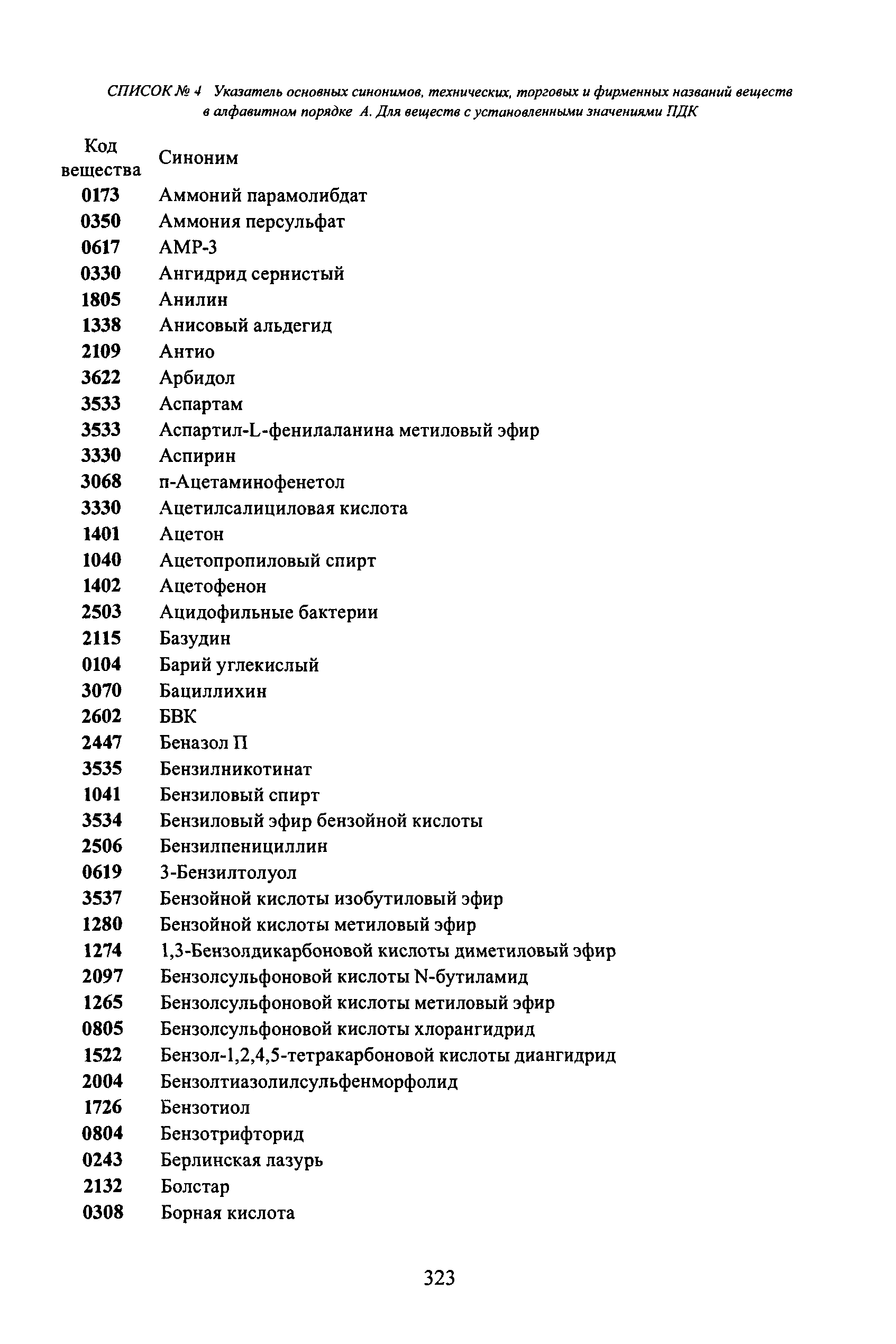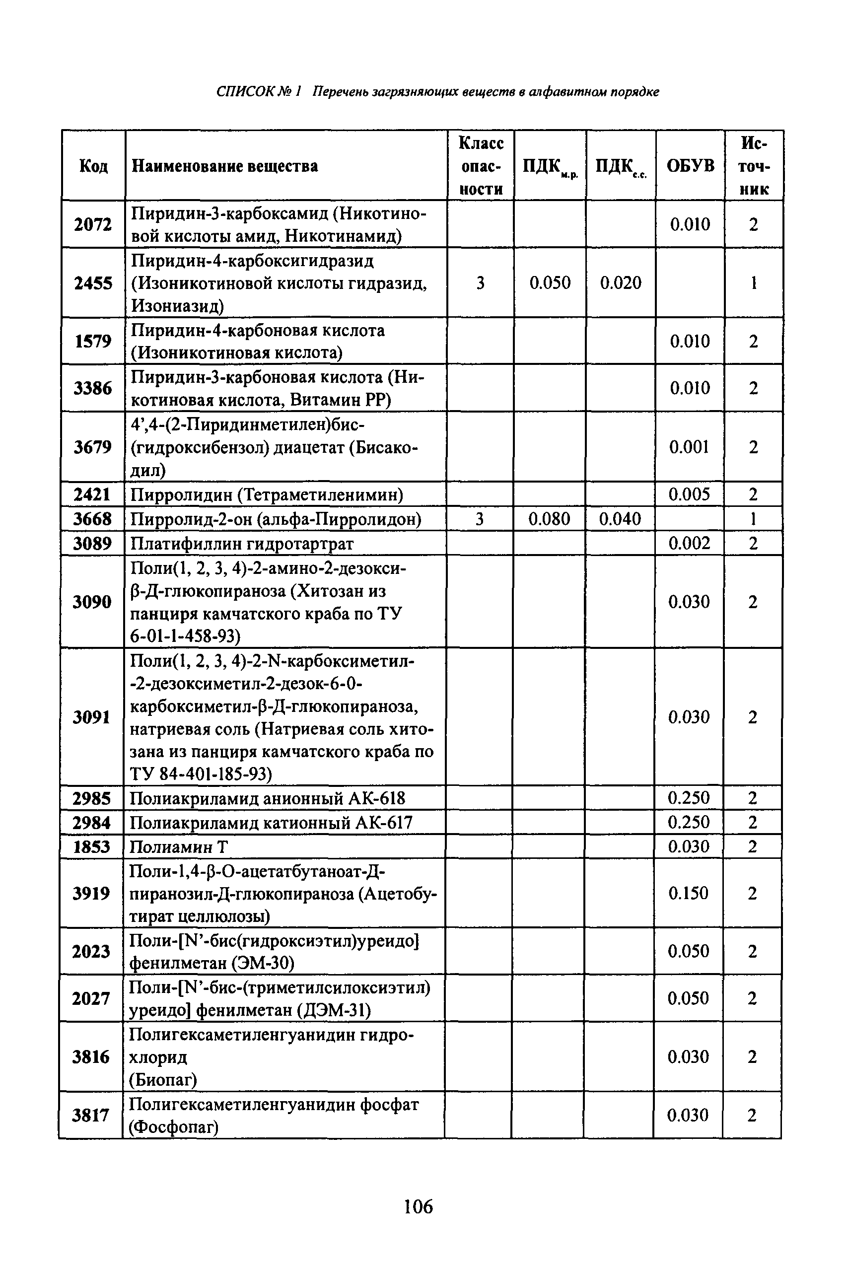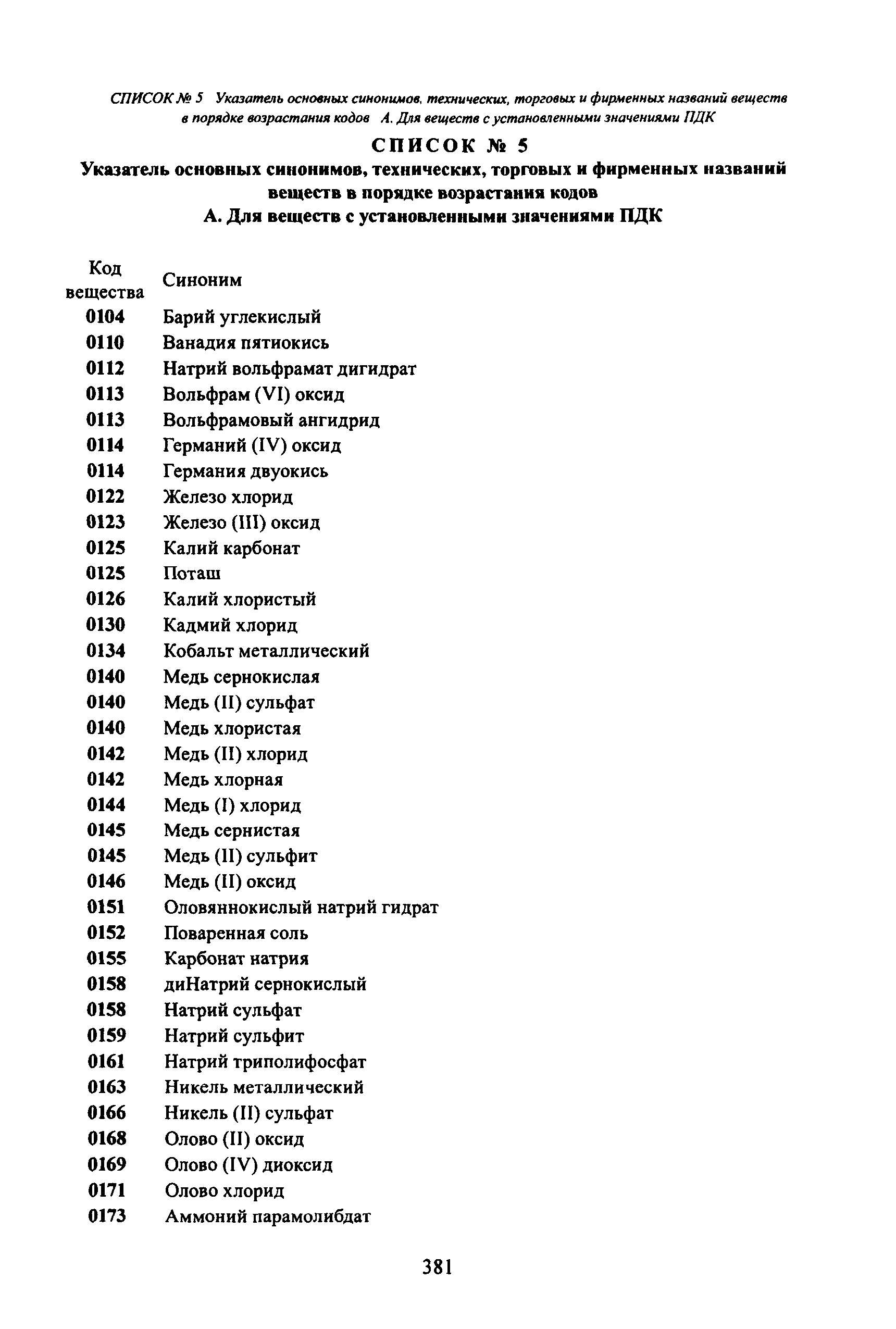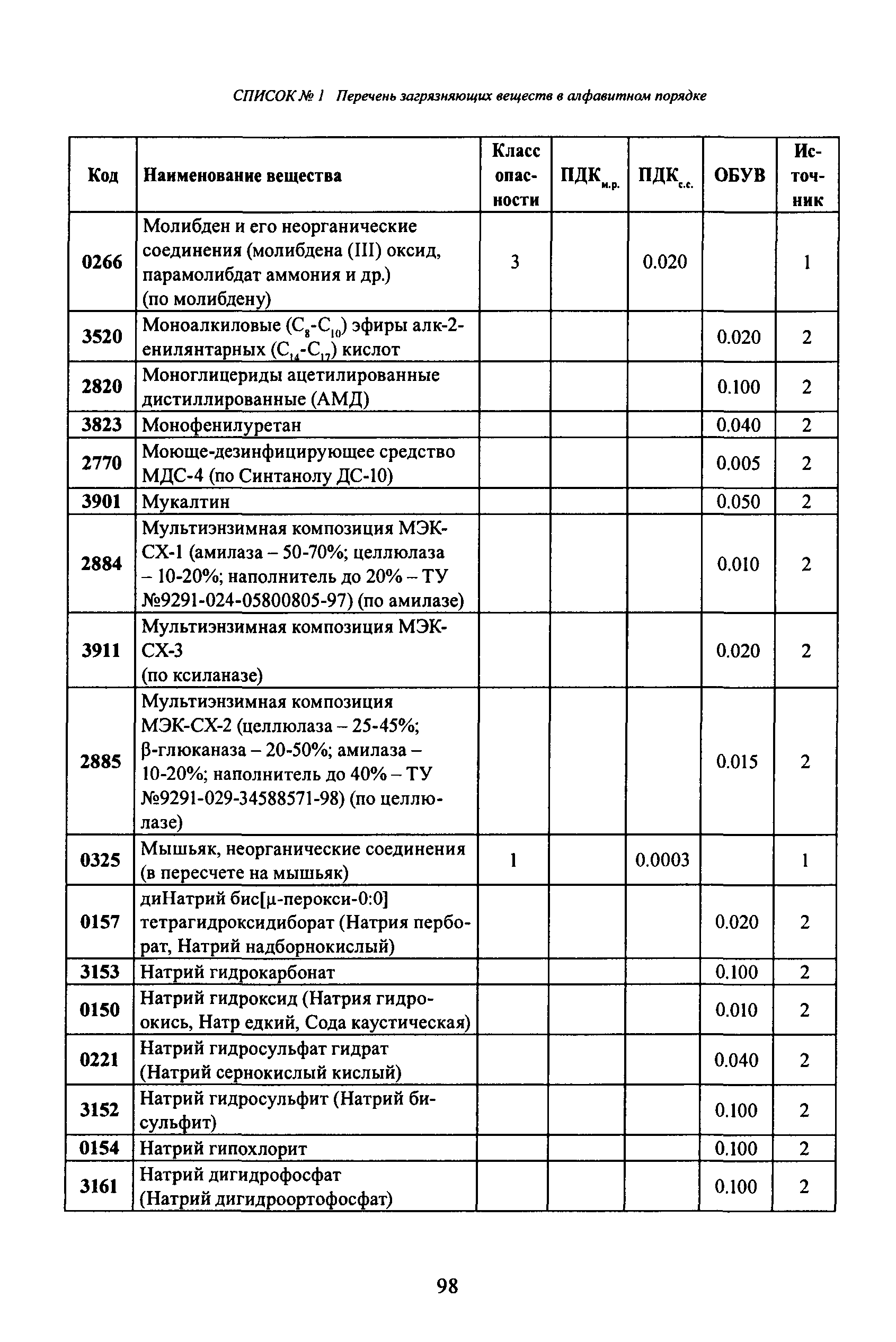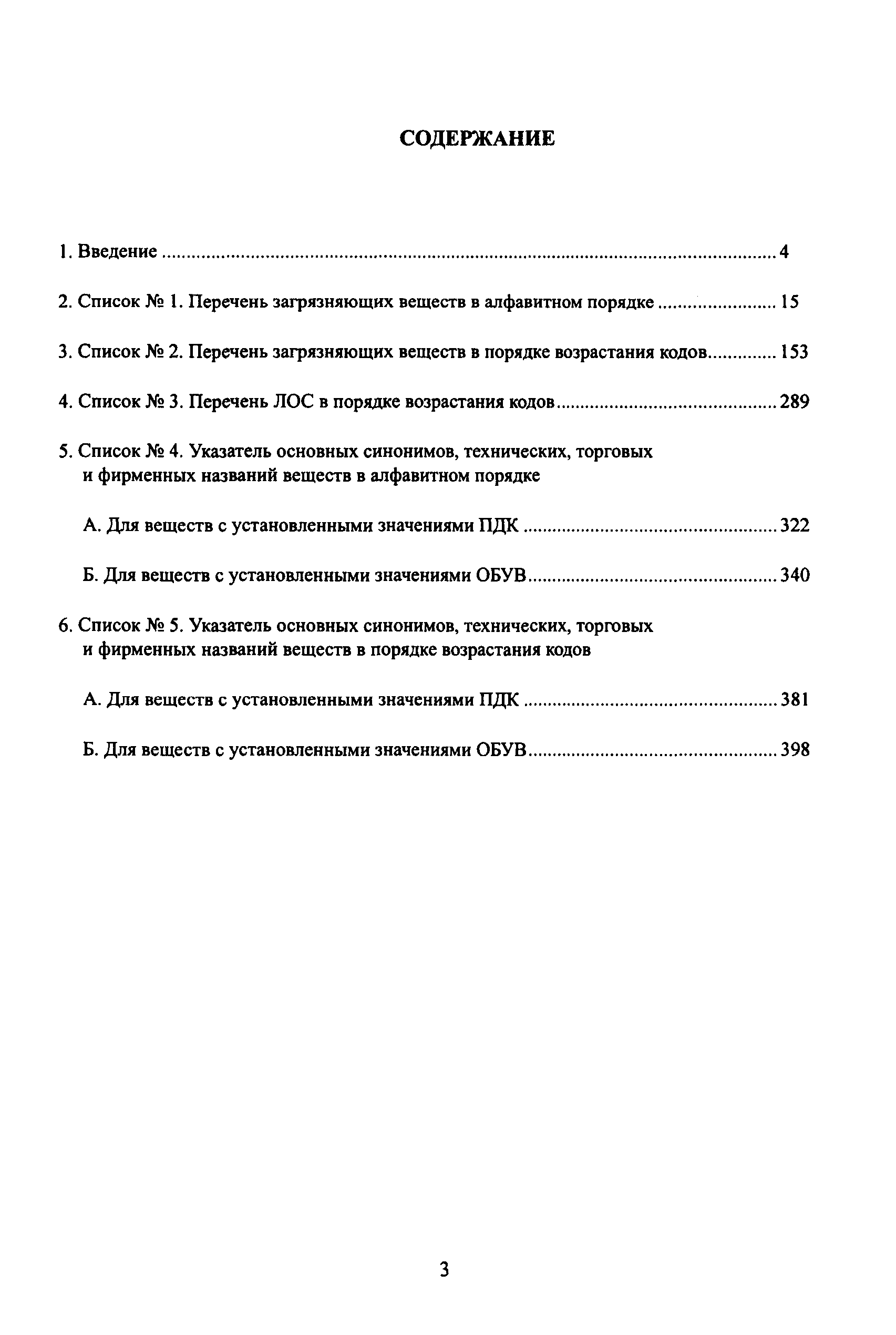| Оглавление: | Введение Список № 1 Перечень загрязняющих веществ в алфавитном порядке Список № 2 Перечень загрязняющих веществ в порядке возрастания кодов Список № 3 Перечень ЛОС в порядке возрастания кодов Список № 4 Указатель основных синонимов, технических, торговых и фирменных названий веществ в алфавитном порядке А. Для веществ с установленными значениями ПДК Б. Для веществ с установленными значениями ОБУВ Список № 5 Указатель основных синонимов, технических, торговых и фирменных названий веществ в порядке возрастания кодов А. Для веществ с установленными значениями ПДК Б. Для веществ с установленными значениями ОБУВ |