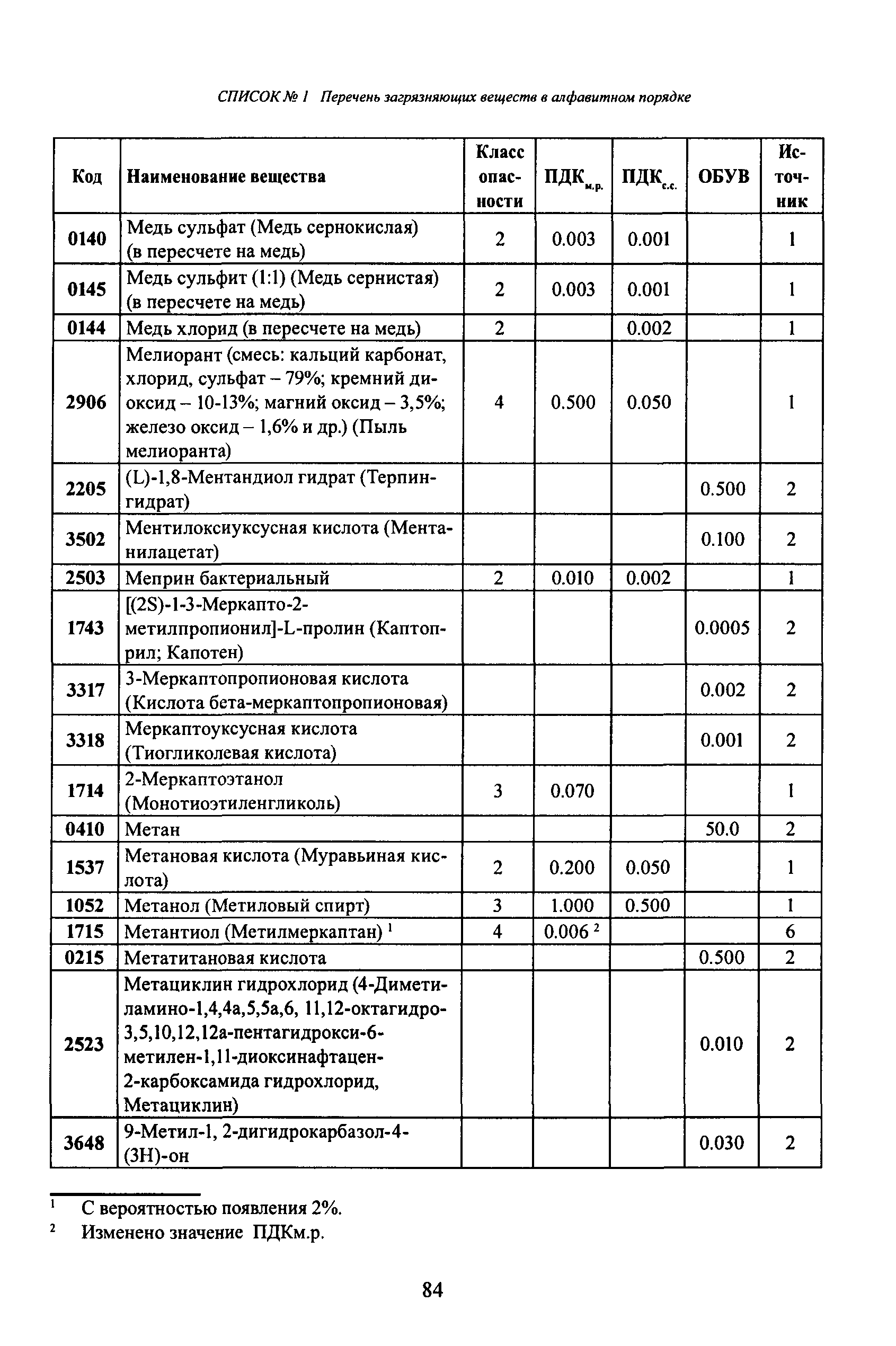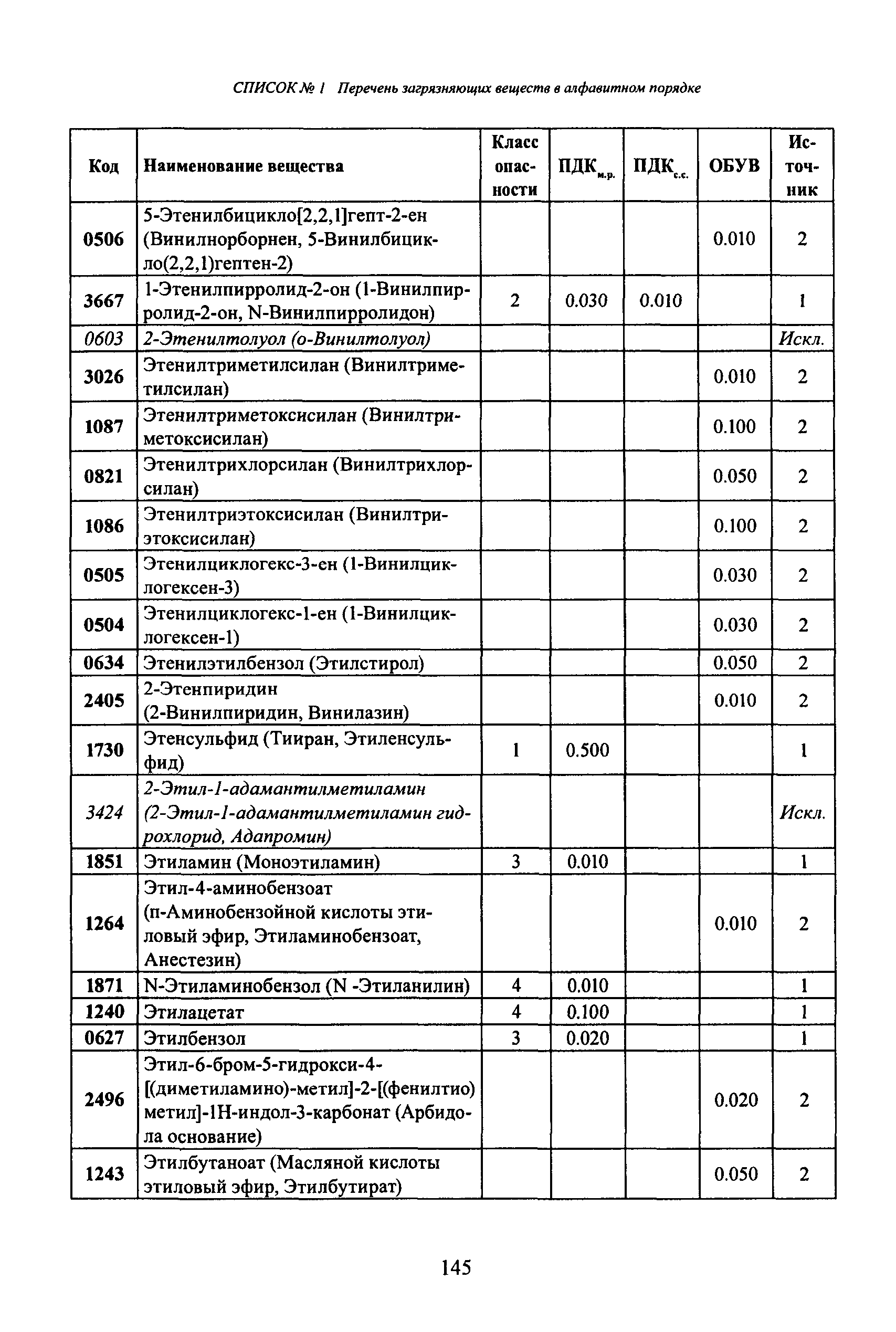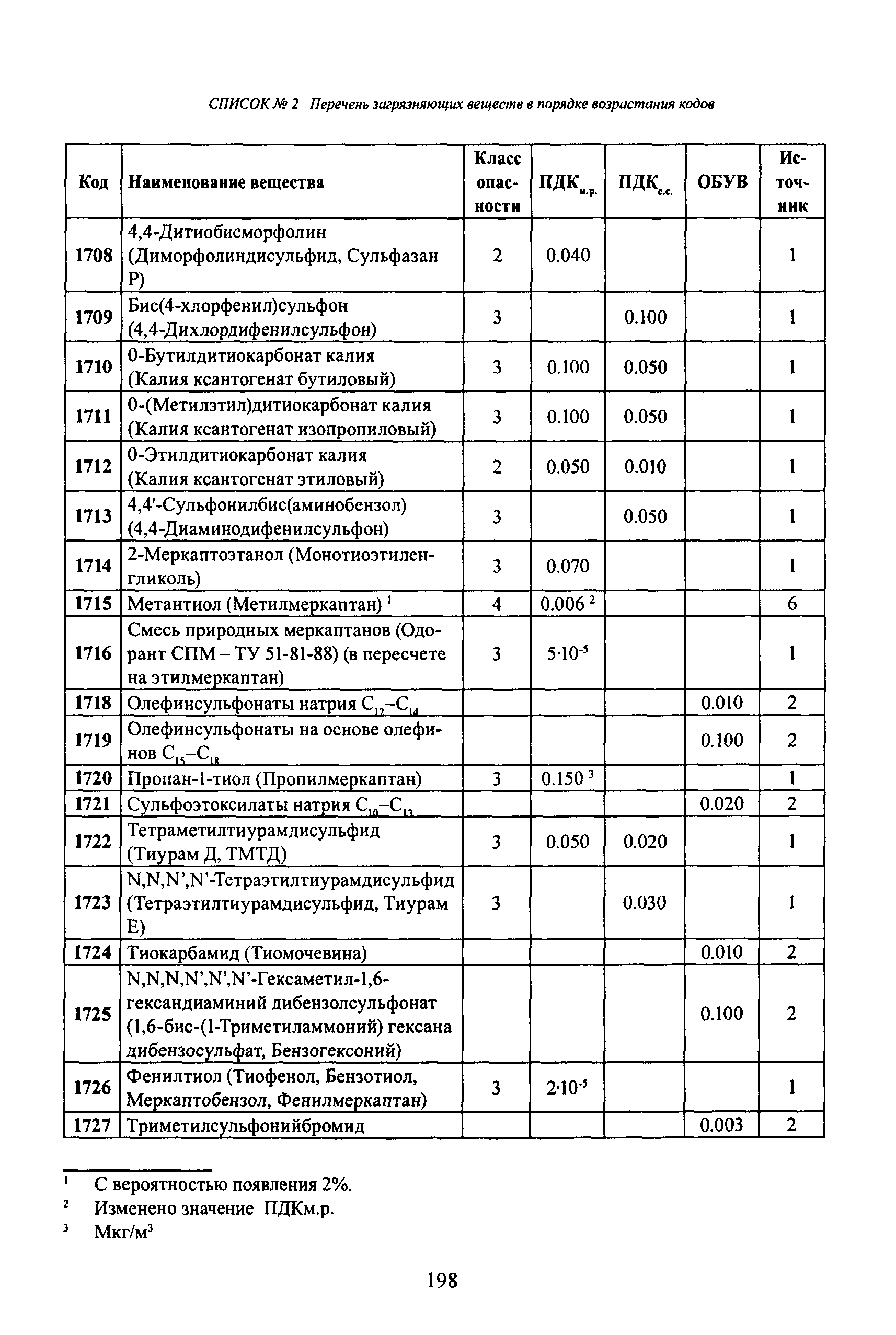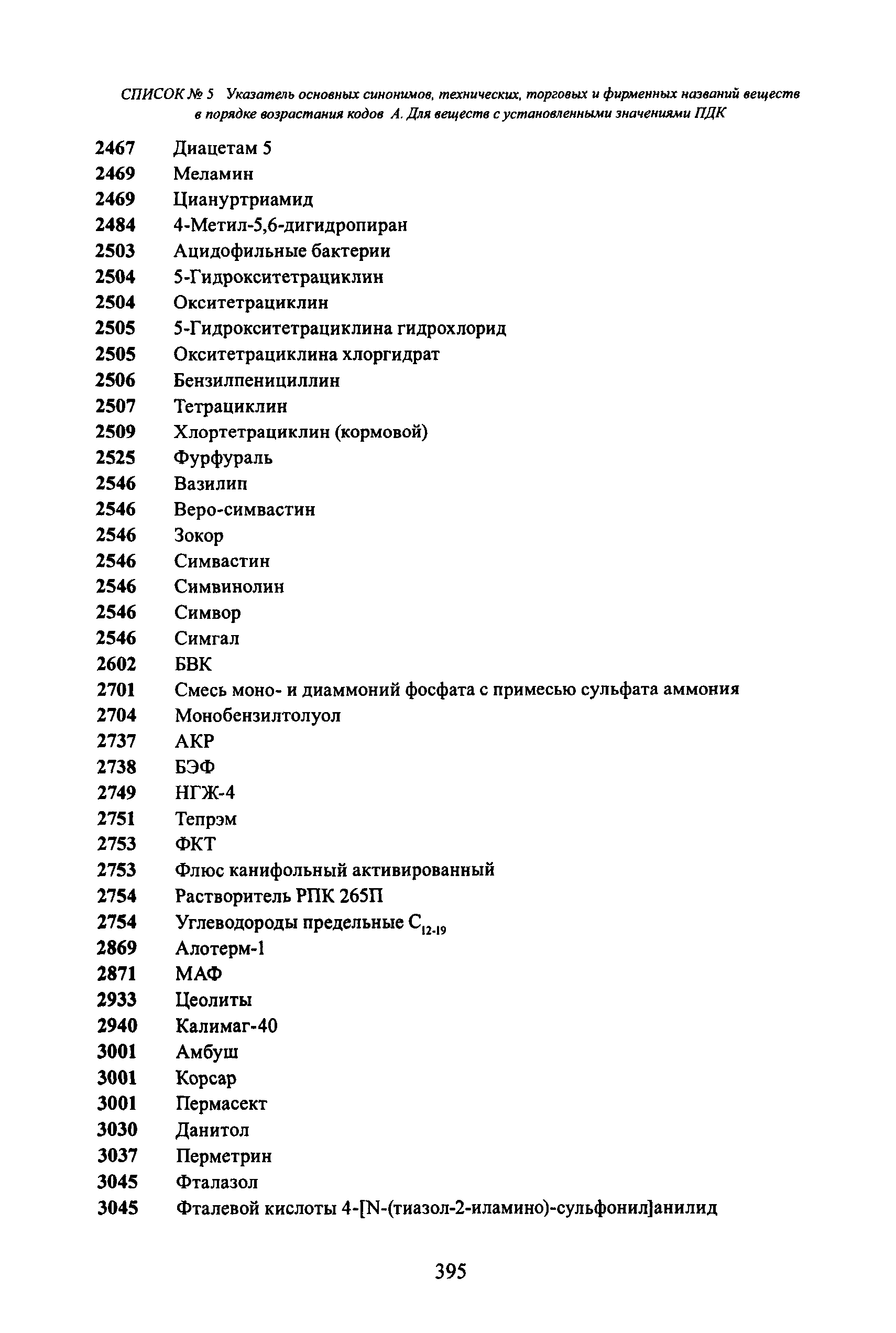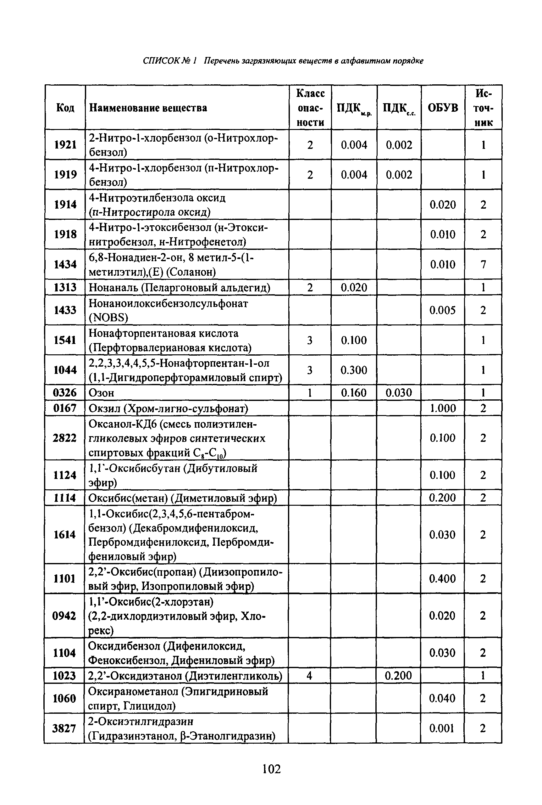 | Оглавление: | Введение Список № 1 Перечень загрязняющих веществ в алфавитном порядке Список № 2 Перечень загрязняющих веществ в порядке возрастания кодов Список № 3 Перечень ЛОС в порядке возрастания кодов Список № 4 Указатель основных синонимов, технических, торговых и фирменных названий веществ в алфавитном порядке А. Для веществ с установленными значениями ПДК Б. Для веществ с установленными значениями ОБУВ Список № 5 Указатель основных синонимов, технических, торговых и фирменных названий веществ в порядке возрастания кодов А. Для веществ с установленными значениями ПДК Б. Для веществ с установленными значениями ОБУВ |
