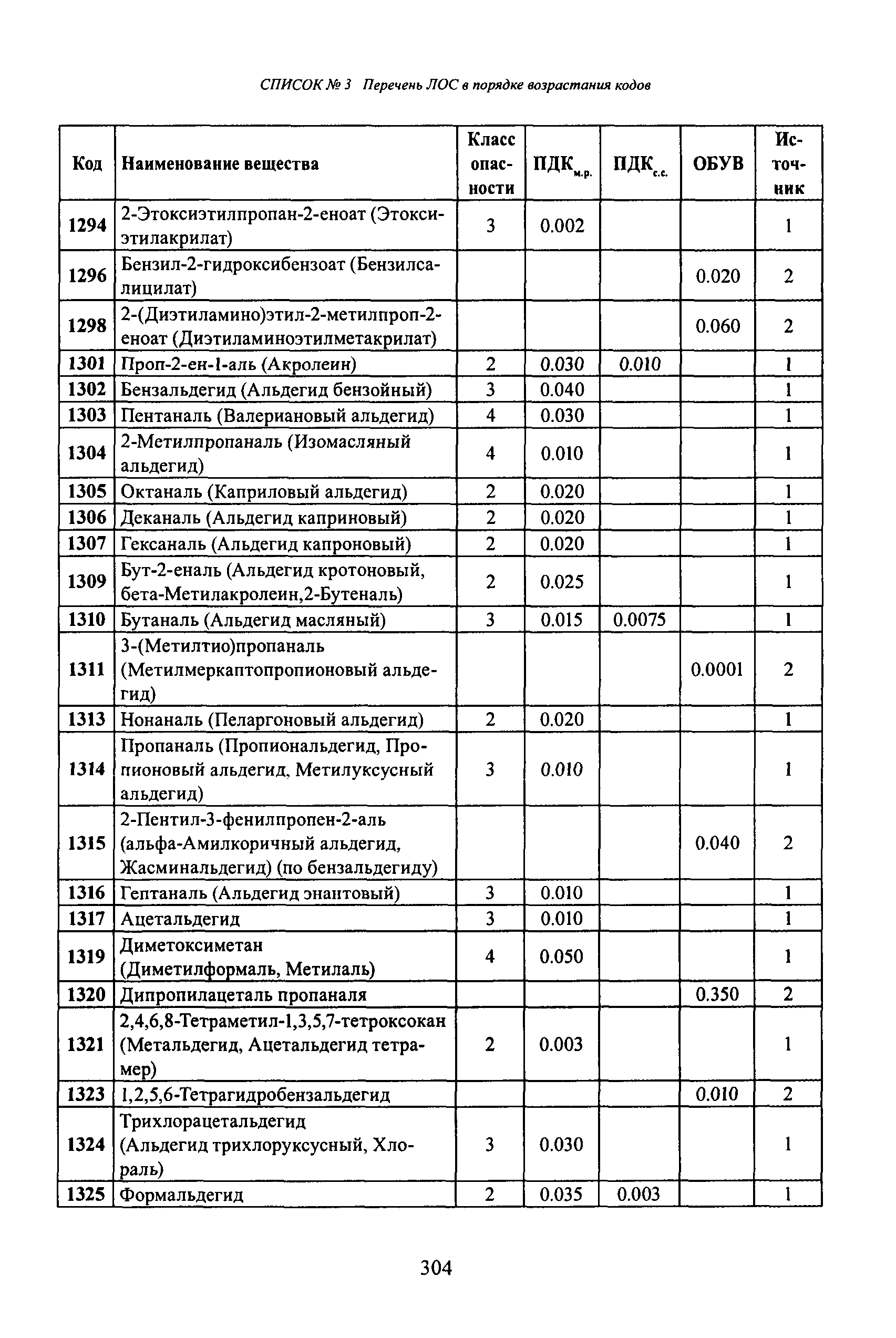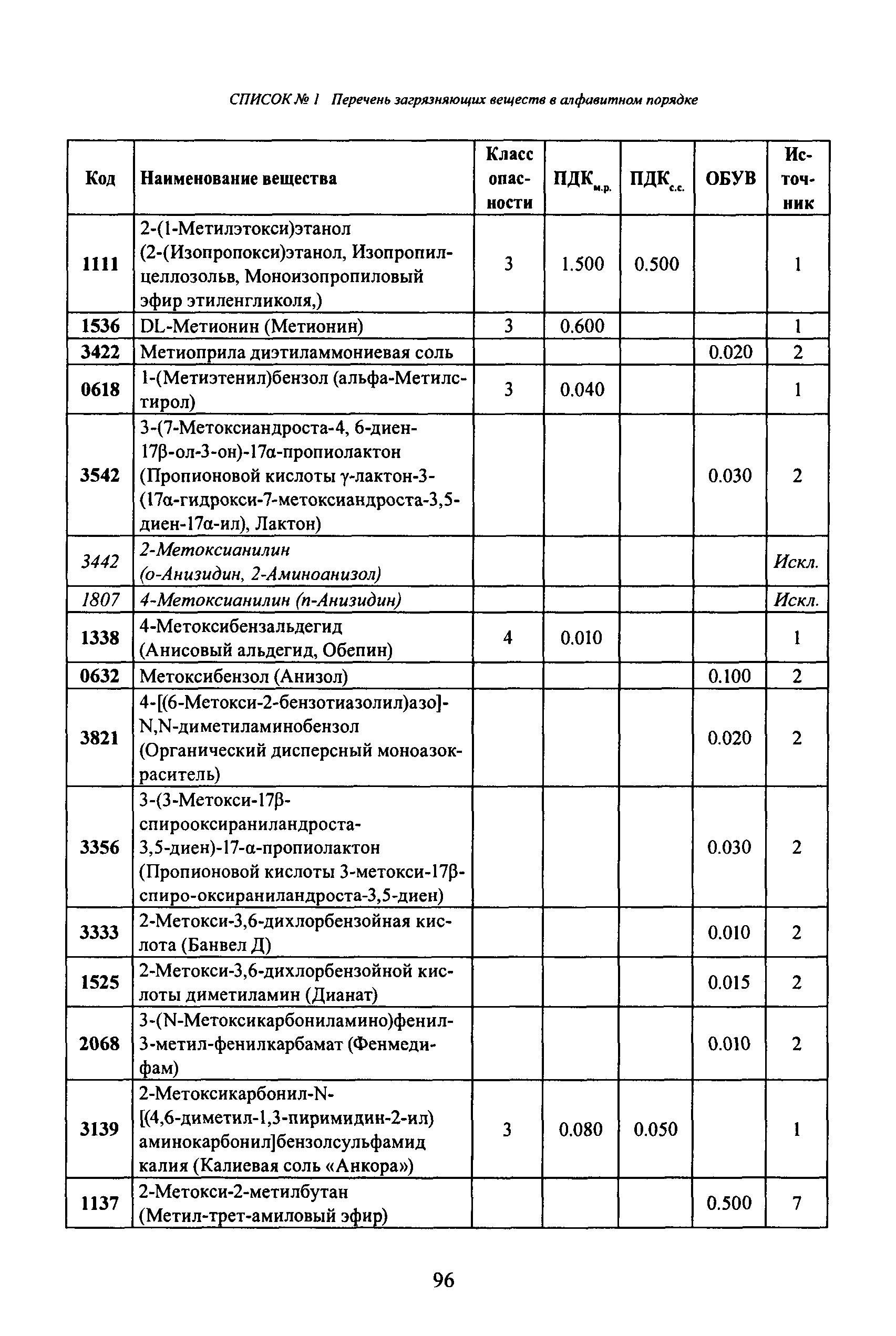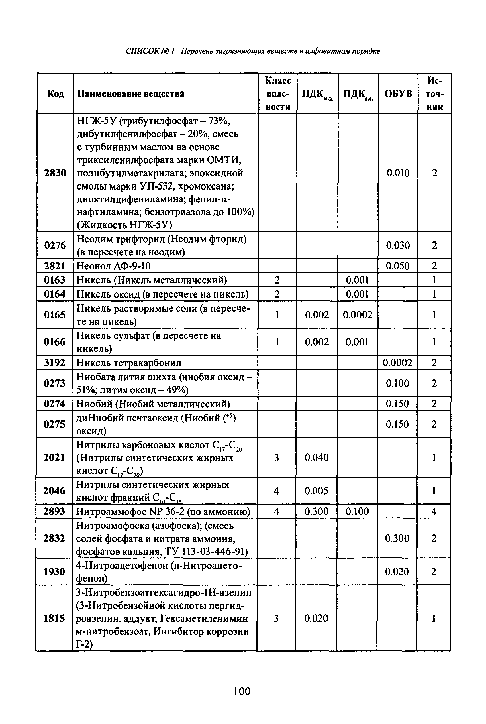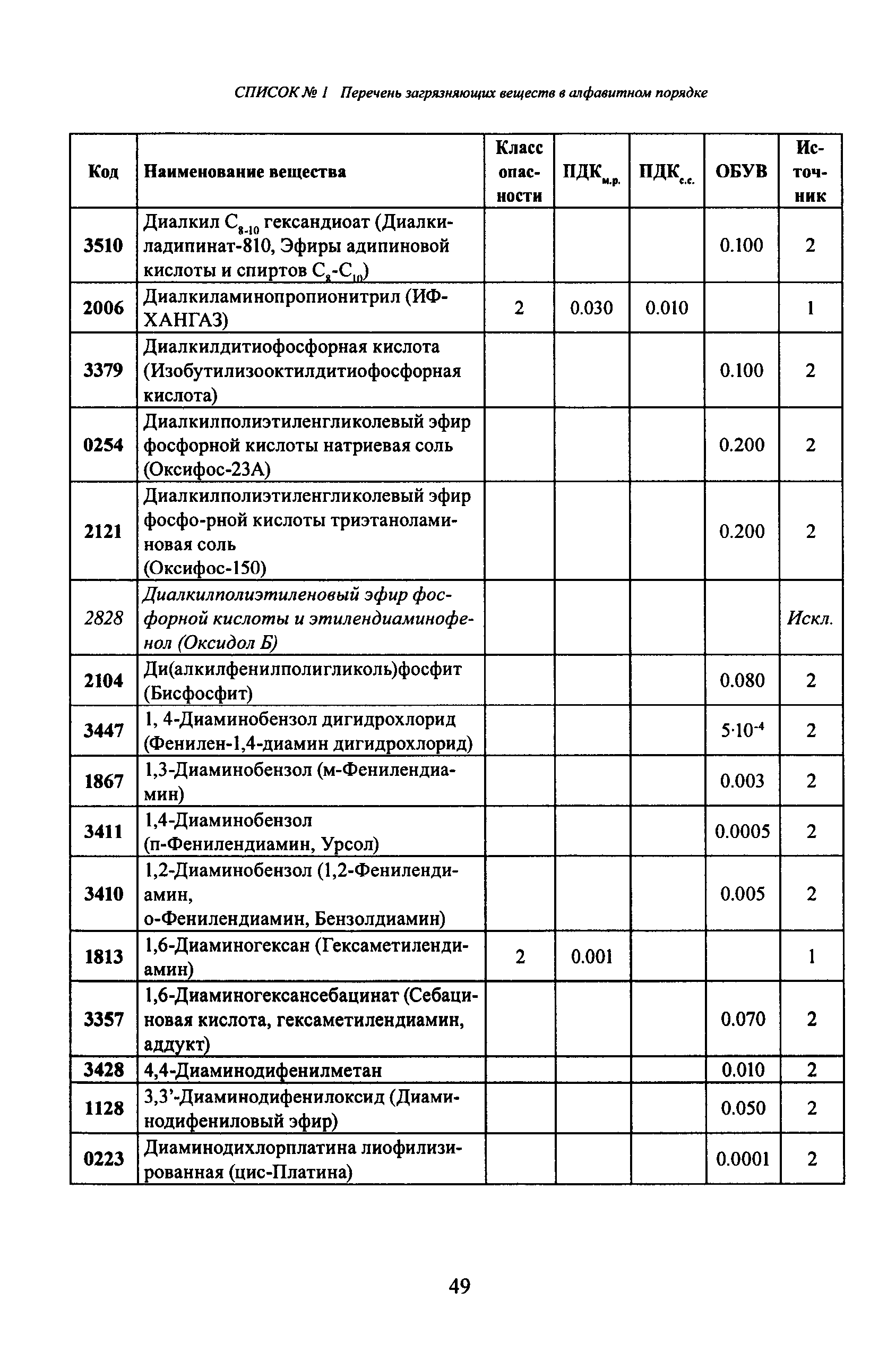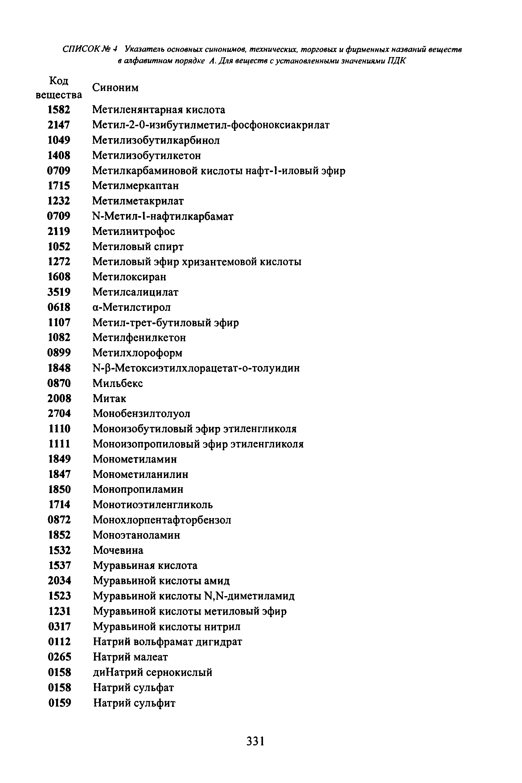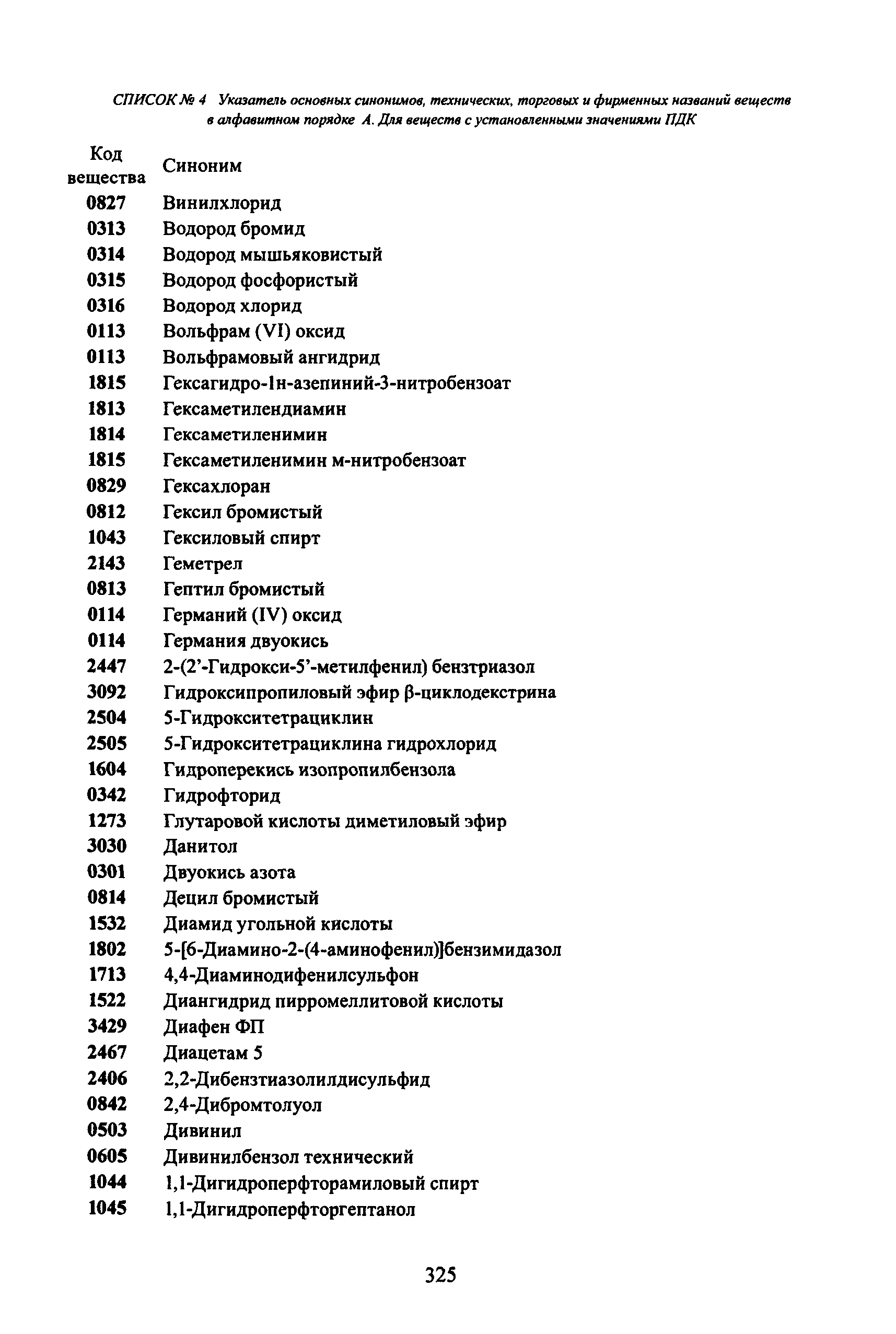 | Оглавление: | Введение Список № 1 Перечень загрязняющих веществ в алфавитном порядке Список № 2 Перечень загрязняющих веществ в порядке возрастания кодов Список № 3 Перечень ЛОС в порядке возрастания кодов Список № 4 Указатель основных синонимов, технических, торговых и фирменных названий веществ в алфавитном порядке А. Для веществ с установленными значениями ПДК Б. Для веществ с установленными значениями ОБУВ Список № 5 Указатель основных синонимов, технических, торговых и фирменных названий веществ в порядке возрастания кодов А. Для веществ с установленными значениями ПДК Б. Для веществ с установленными значениями ОБУВ |