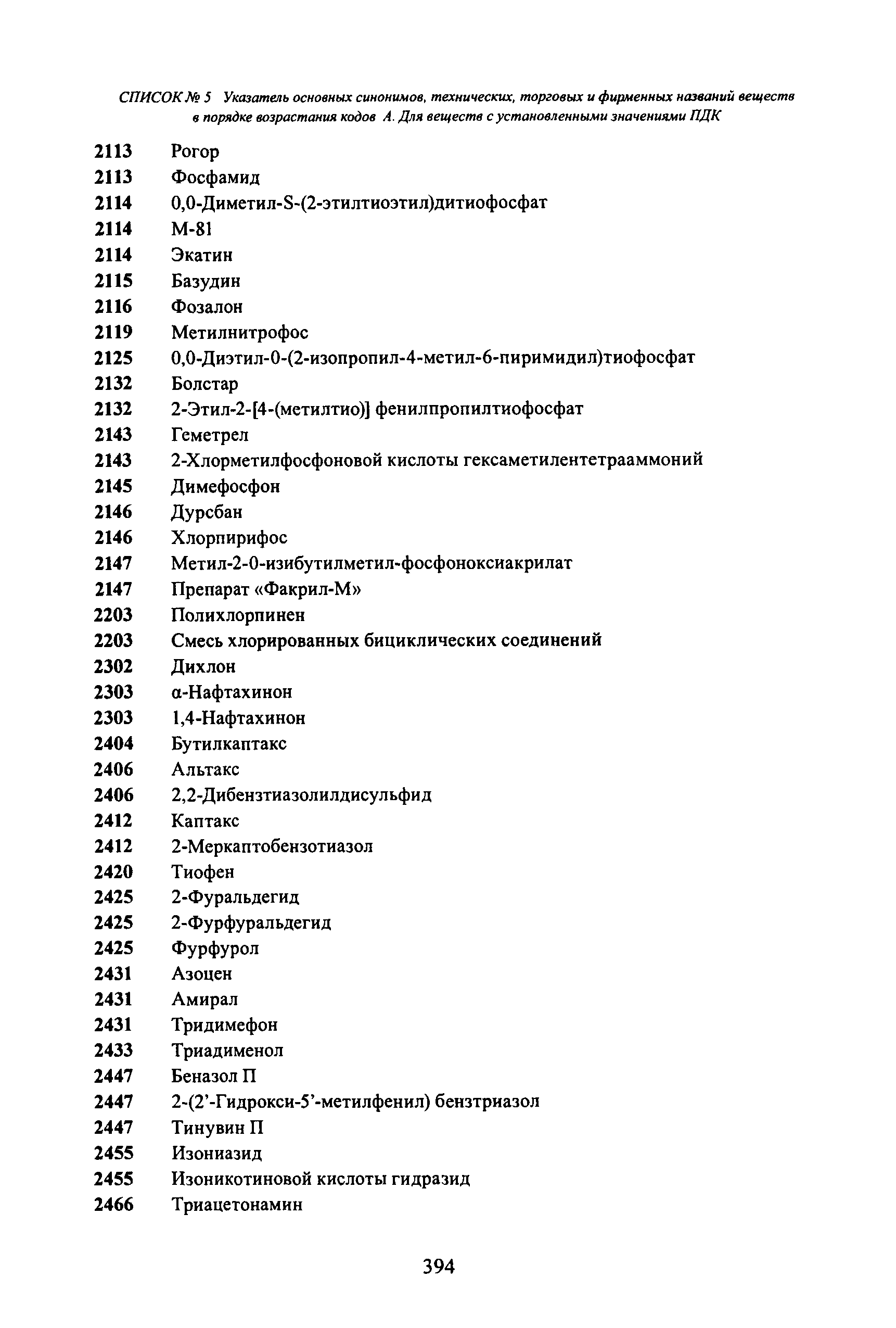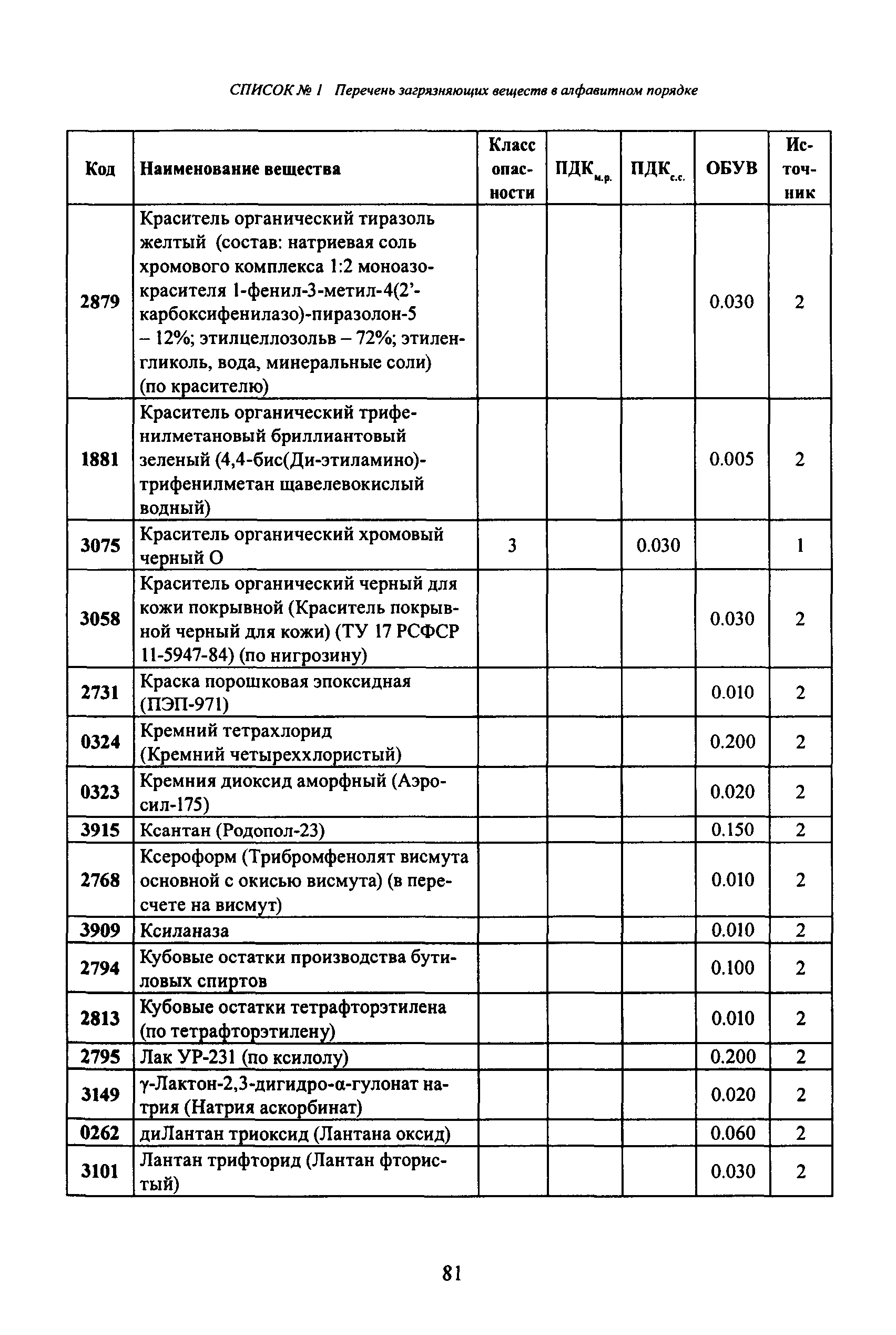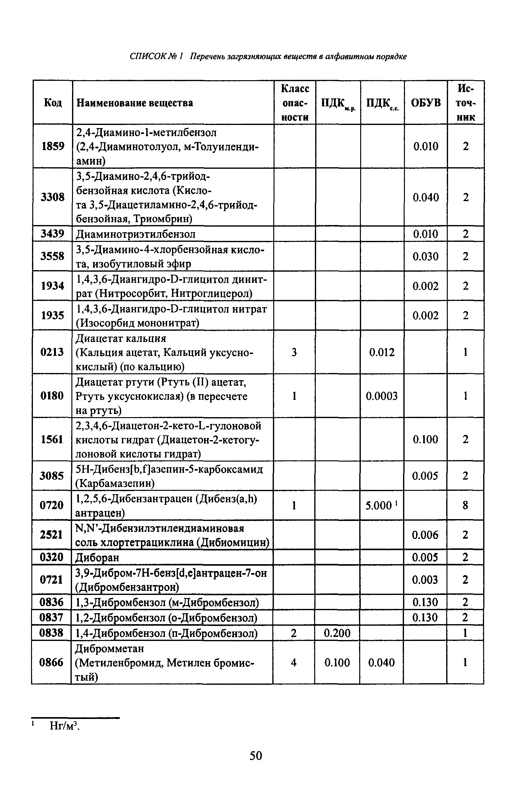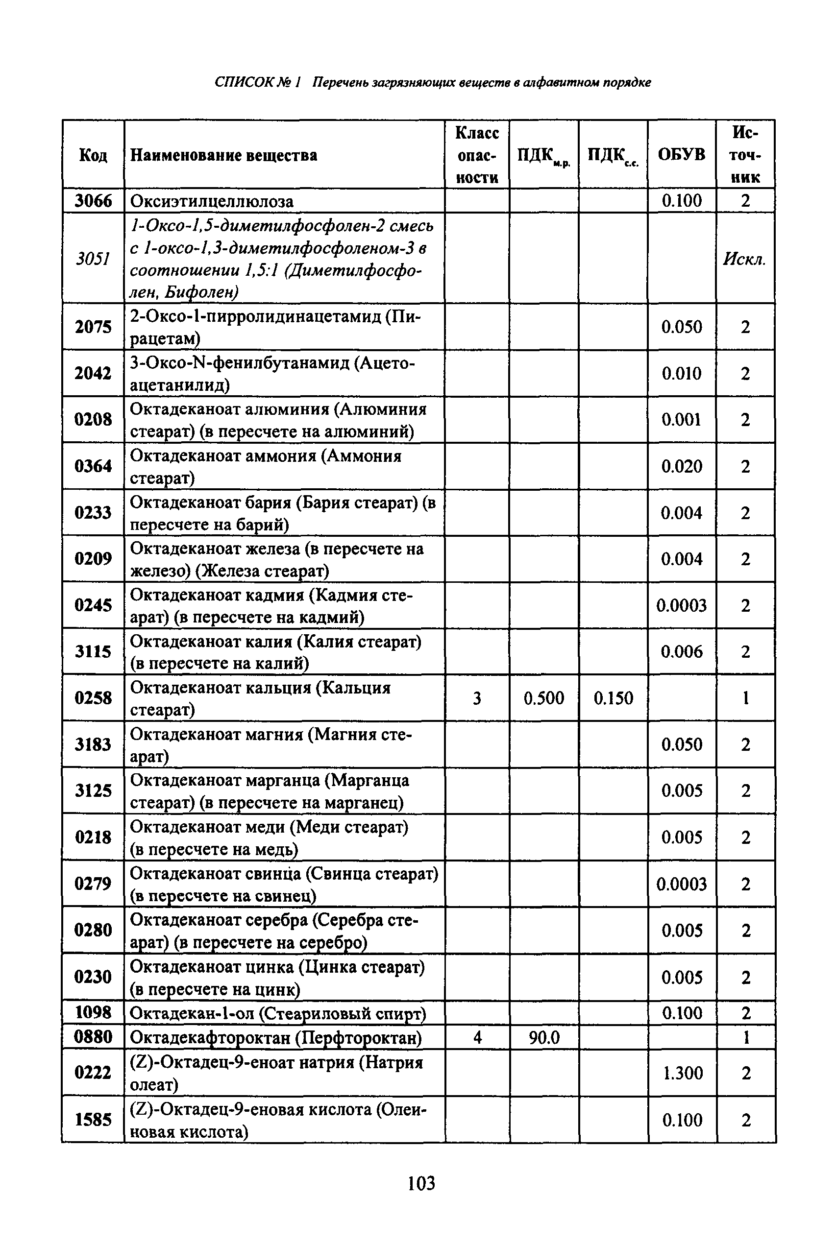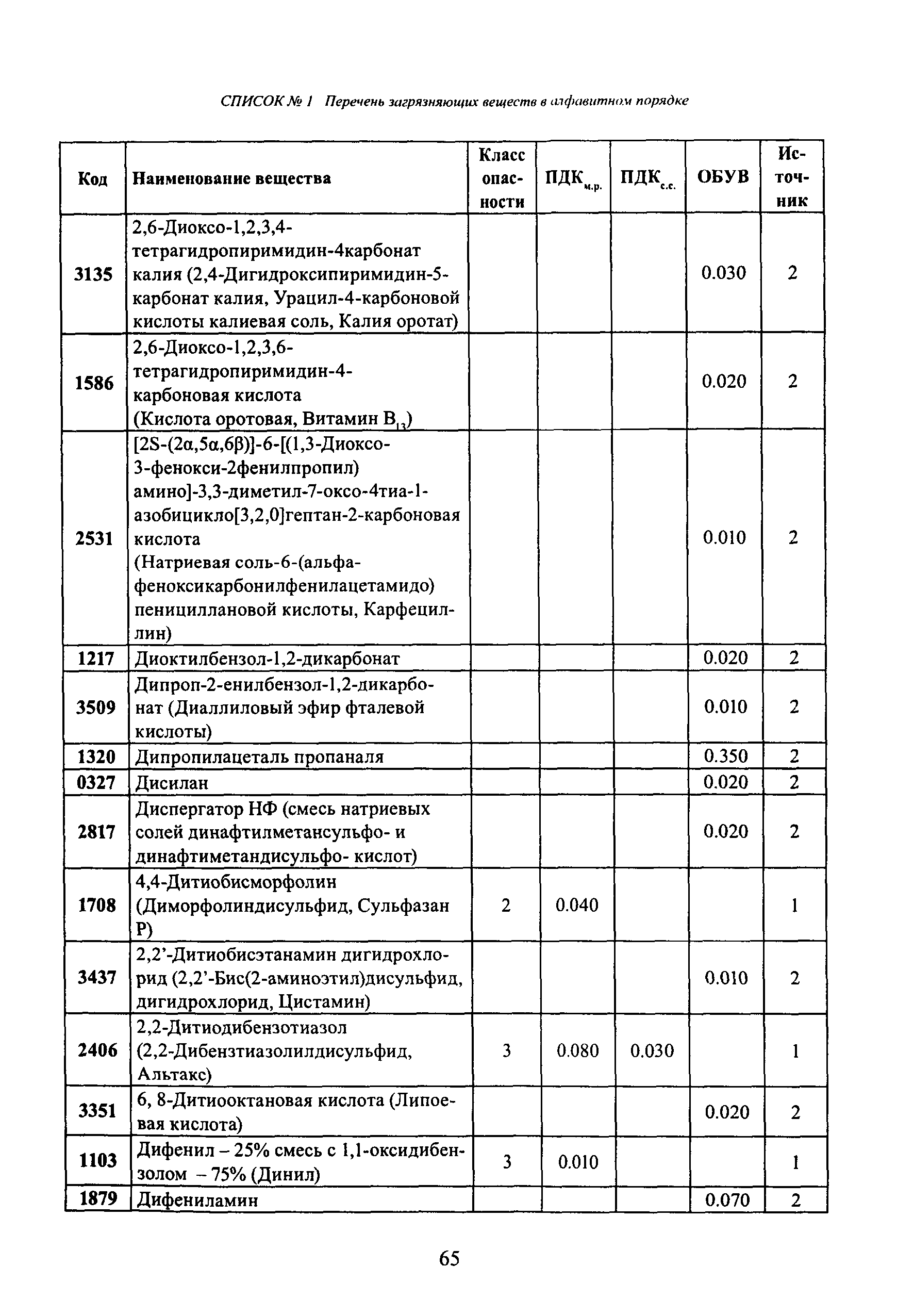 | Оглавление: | Введение Список № 1 Перечень загрязняющих веществ в алфавитном порядке Список № 2 Перечень загрязняющих веществ в порядке возрастания кодов Список № 3 Перечень ЛОС в порядке возрастания кодов Список № 4 Указатель основных синонимов, технических, торговых и фирменных названий веществ в алфавитном порядке А. Для веществ с установленными значениями ПДК Б. Для веществ с установленными значениями ОБУВ Список № 5 Указатель основных синонимов, технических, торговых и фирменных названий веществ в порядке возрастания кодов А. Для веществ с установленными значениями ПДК Б. Для веществ с установленными значениями ОБУВ |