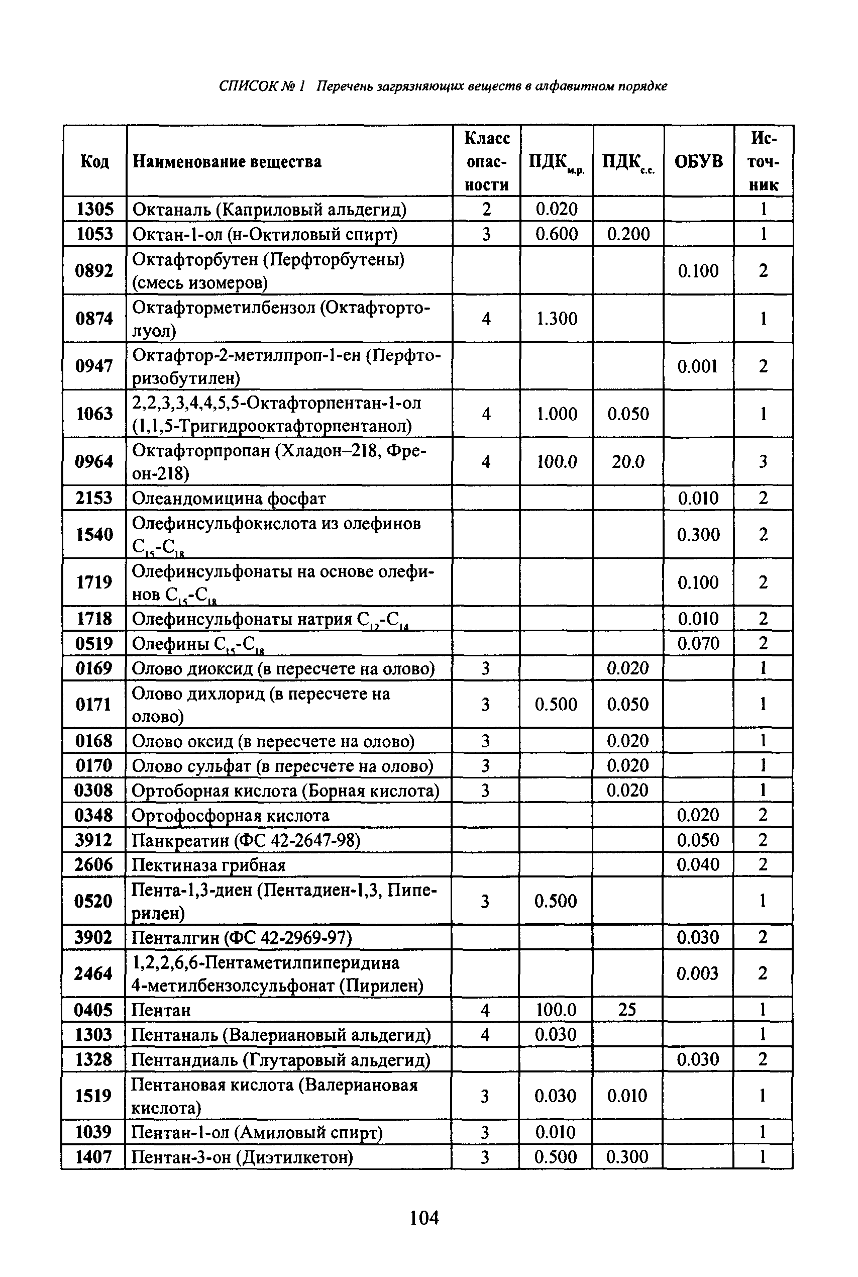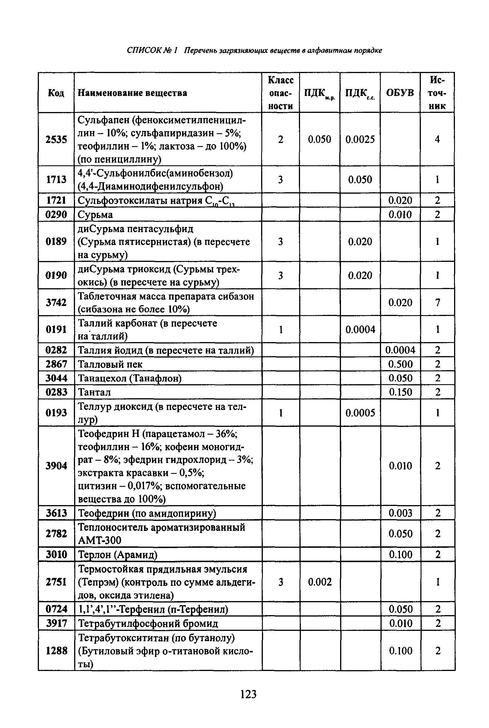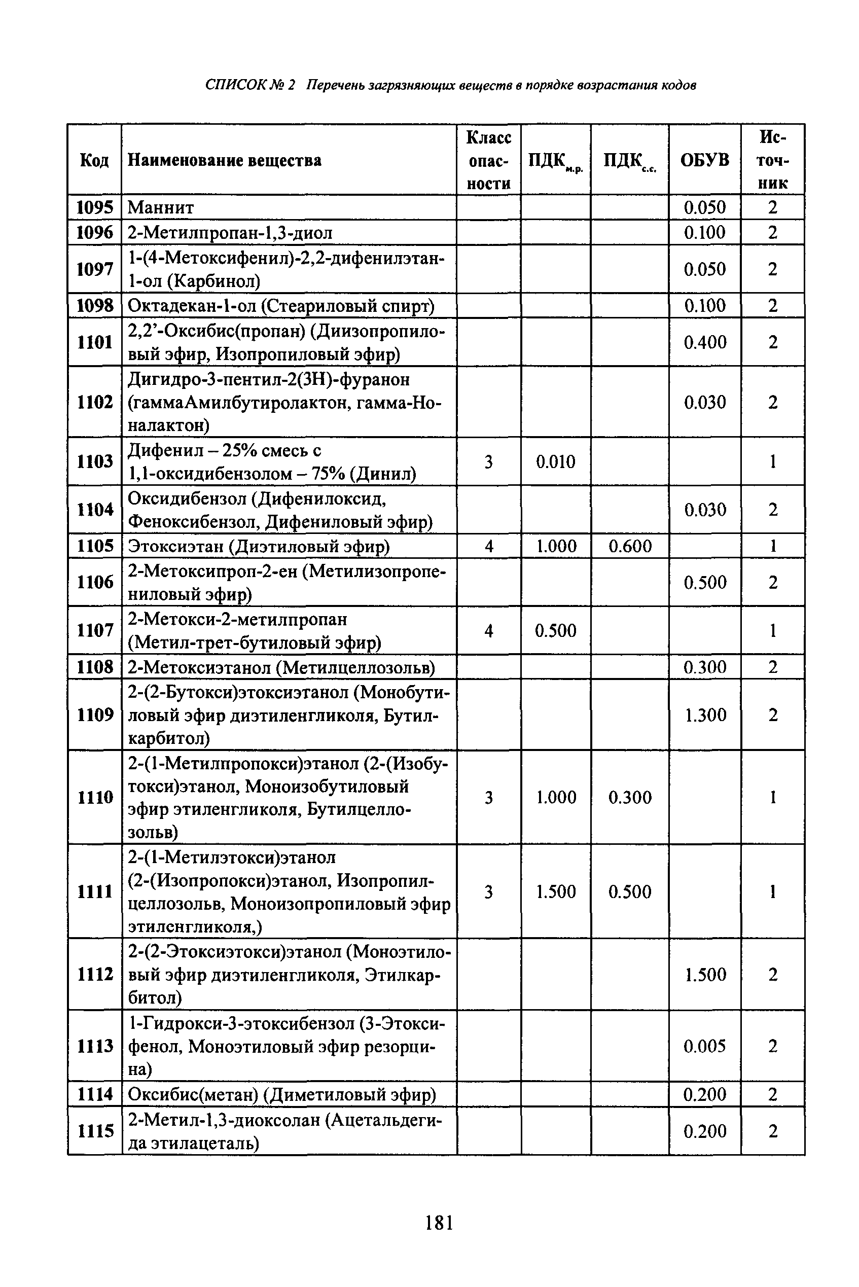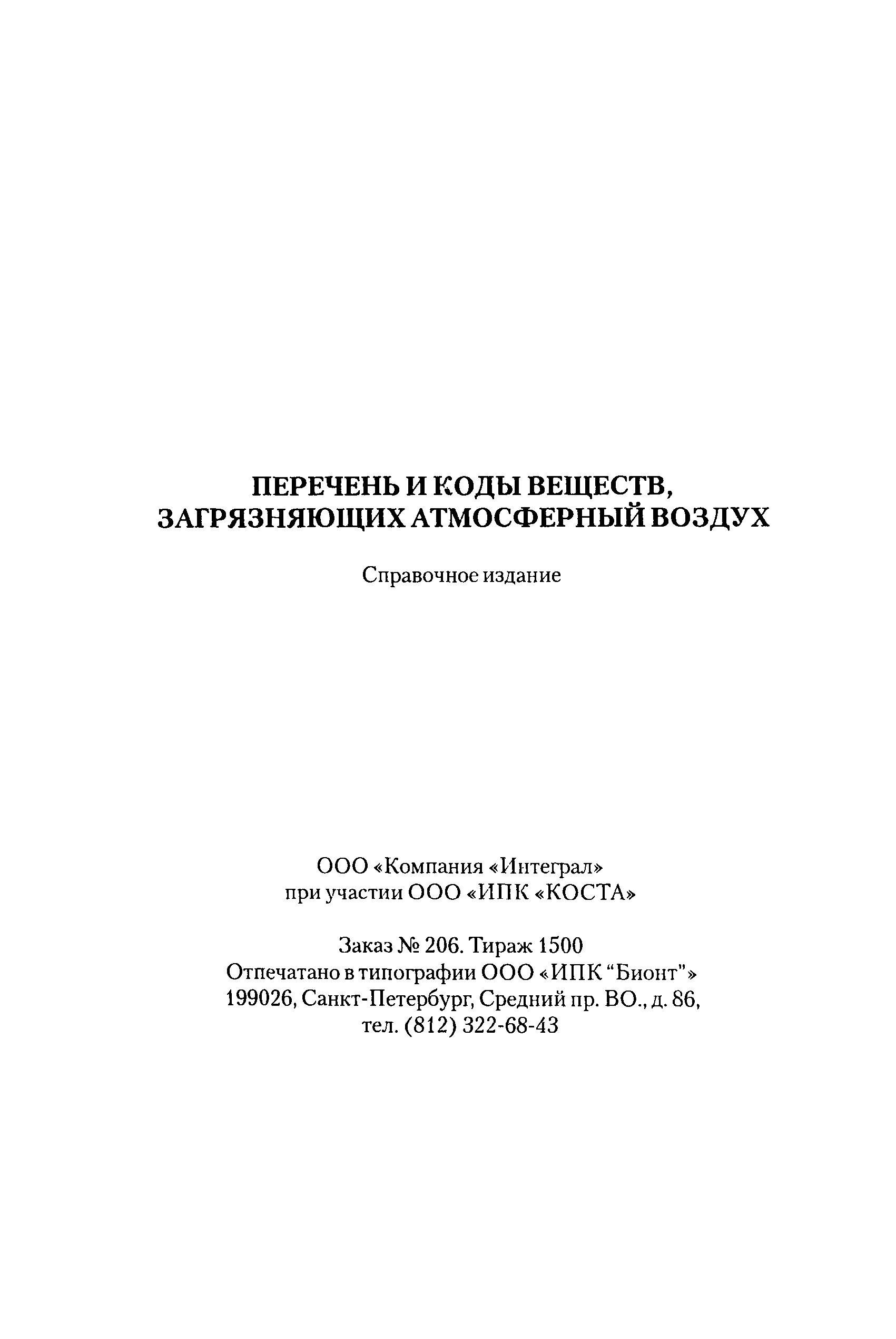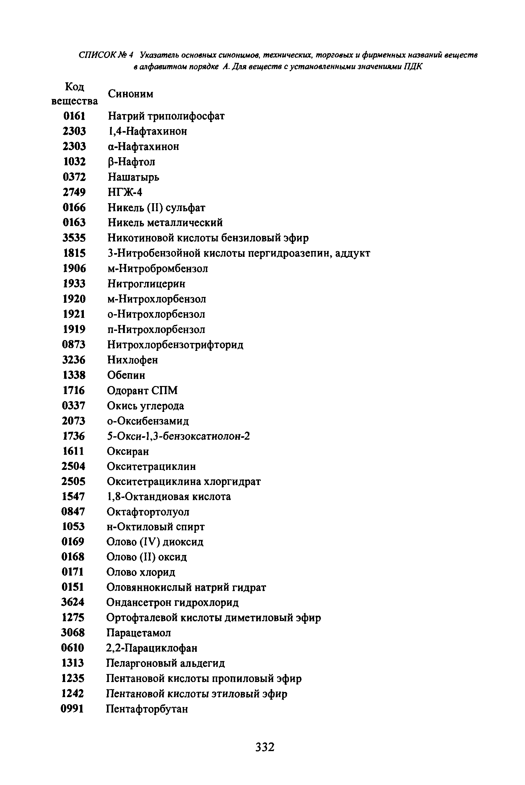 | Оглавление: | Введение Список № 1 Перечень загрязняющих веществ в алфавитном порядке Список № 2 Перечень загрязняющих веществ в порядке возрастания кодов Список № 3 Перечень ЛОС в порядке возрастания кодов Список № 4 Указатель основных синонимов, технических, торговых и фирменных названий веществ в алфавитном порядке А. Для веществ с установленными значениями ПДК Б. Для веществ с установленными значениями ОБУВ Список № 5 Указатель основных синонимов, технических, торговых и фирменных названий веществ в порядке возрастания кодов А. Для веществ с установленными значениями ПДК Б. Для веществ с установленными значениями ОБУВ |