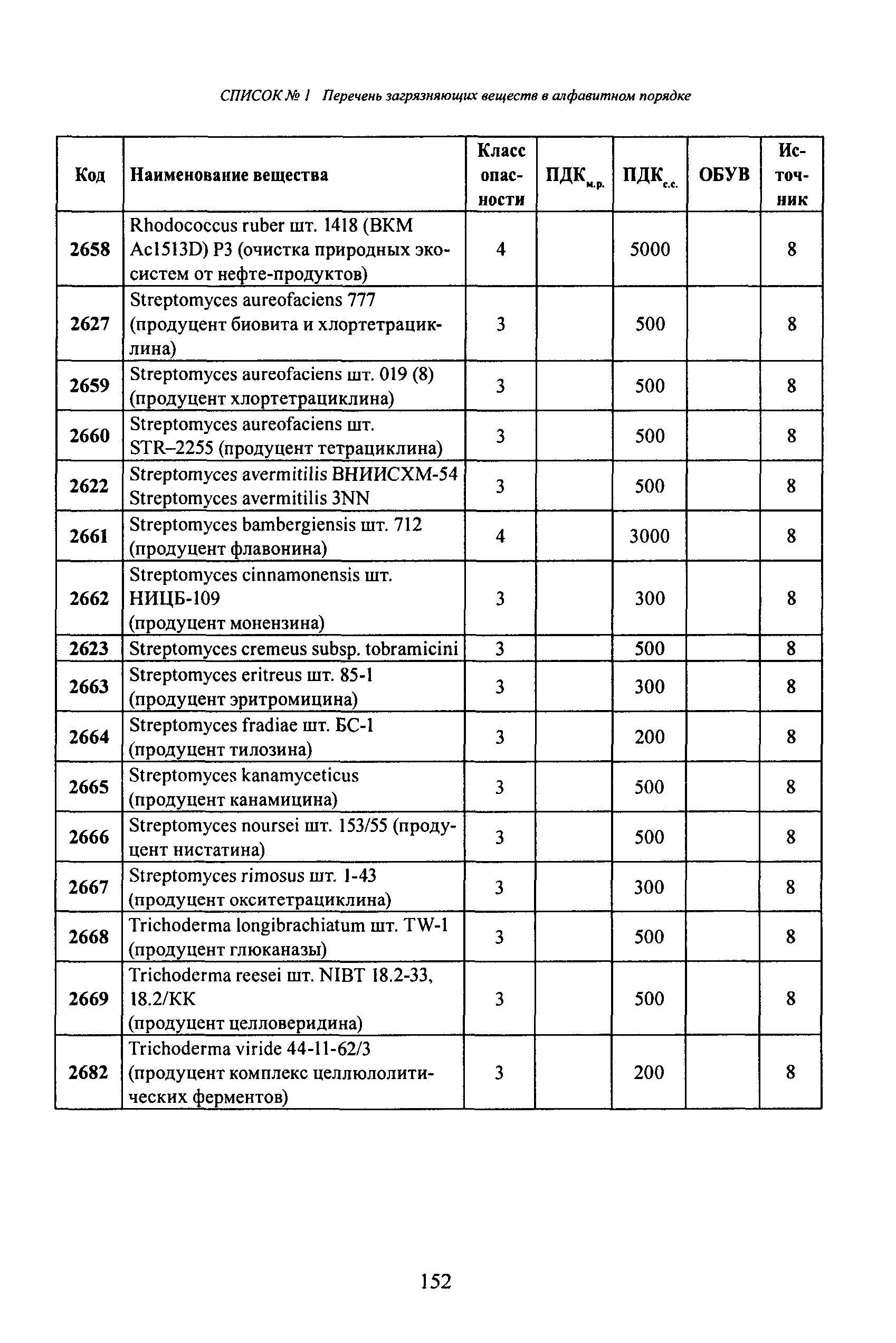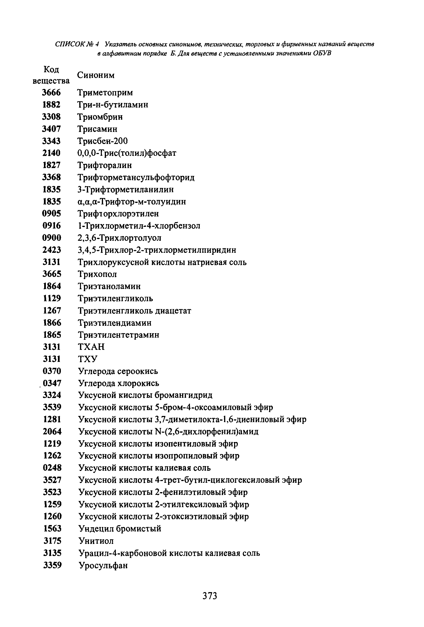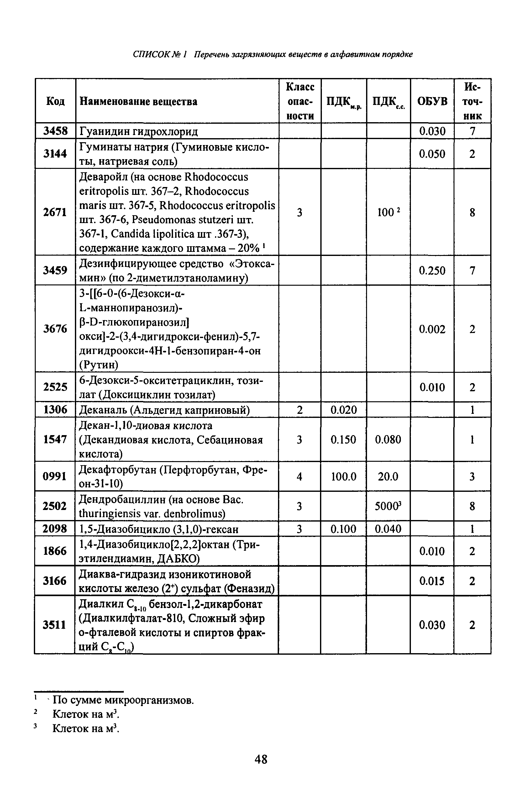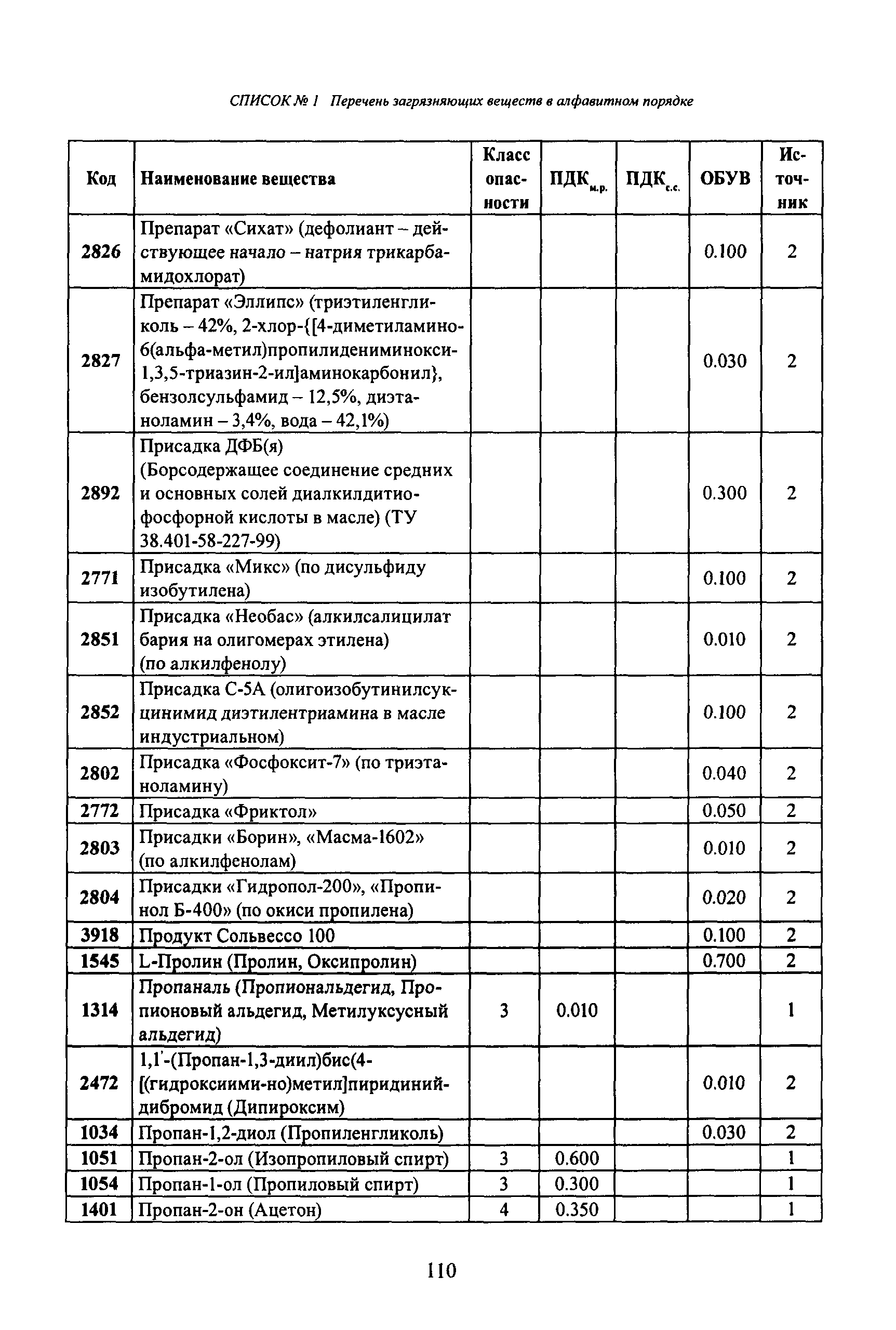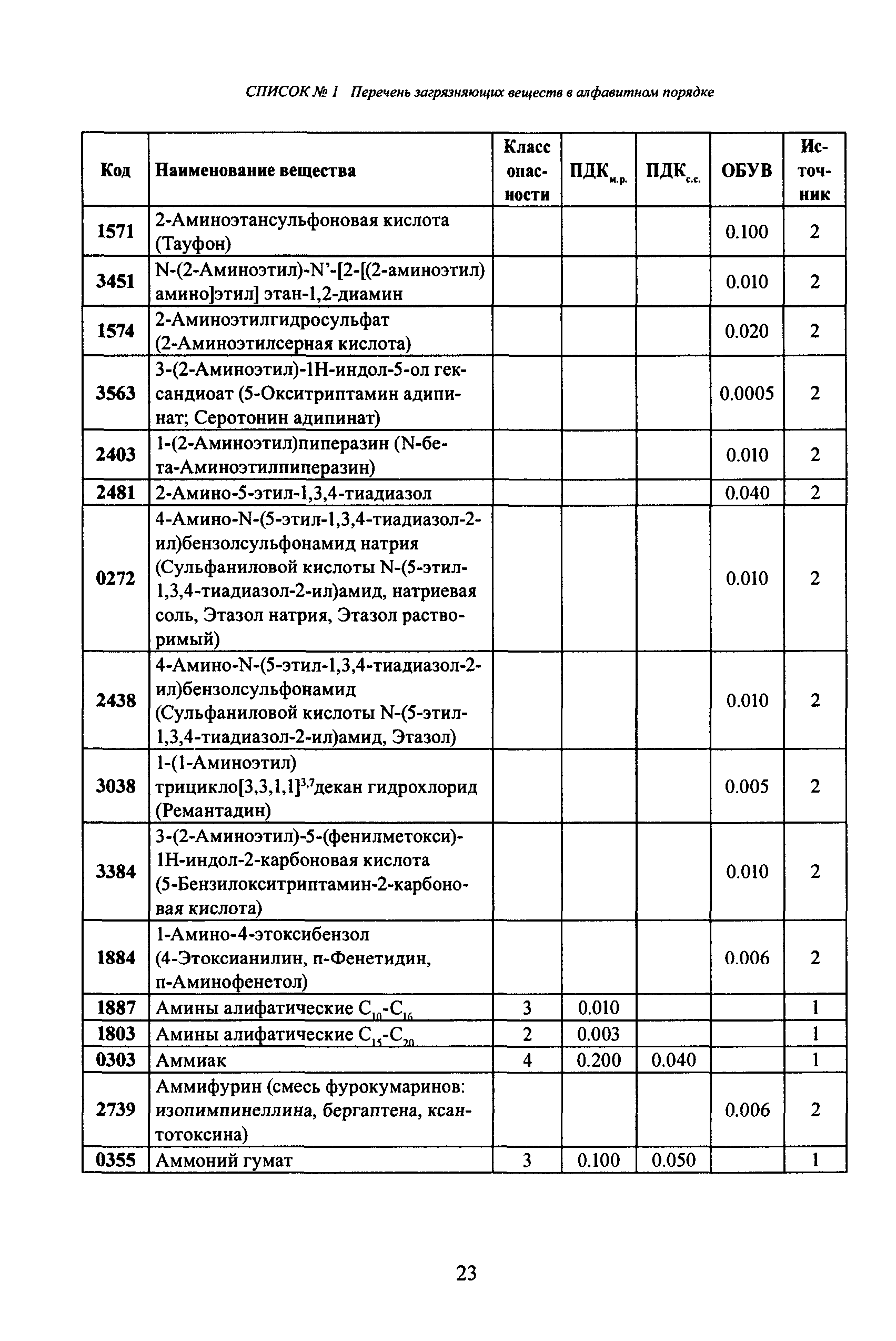 | Оглавление: | Введение Список № 1 Перечень загрязняющих веществ в алфавитном порядке Список № 2 Перечень загрязняющих веществ в порядке возрастания кодов Список № 3 Перечень ЛОС в порядке возрастания кодов Список № 4 Указатель основных синонимов, технических, торговых и фирменных названий веществ в алфавитном порядке А. Для веществ с установленными значениями ПДК Б. Для веществ с установленными значениями ОБУВ Список № 5 Указатель основных синонимов, технических, торговых и фирменных названий веществ в порядке возрастания кодов А. Для веществ с установленными значениями ПДК Б. Для веществ с установленными значениями ОБУВ |