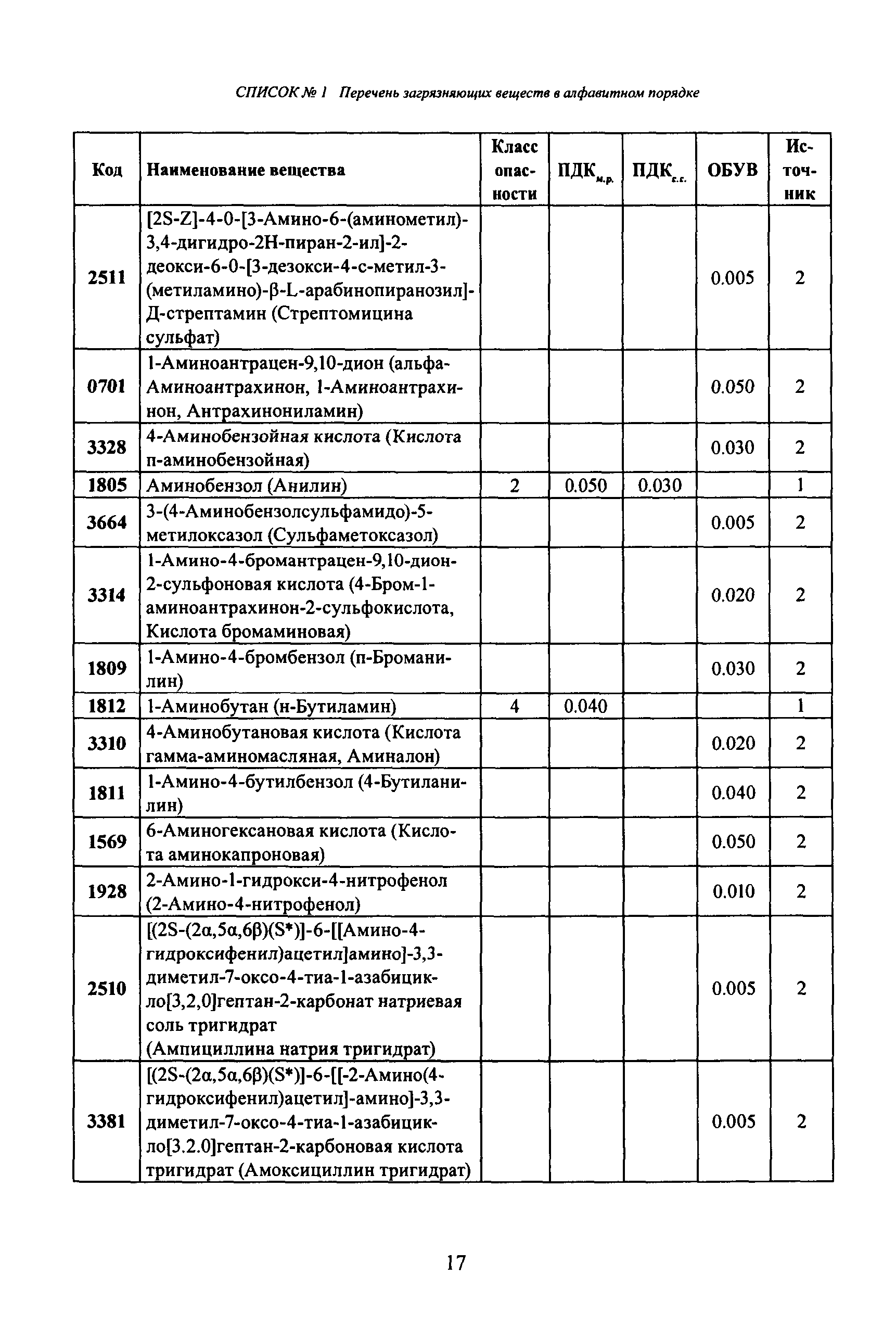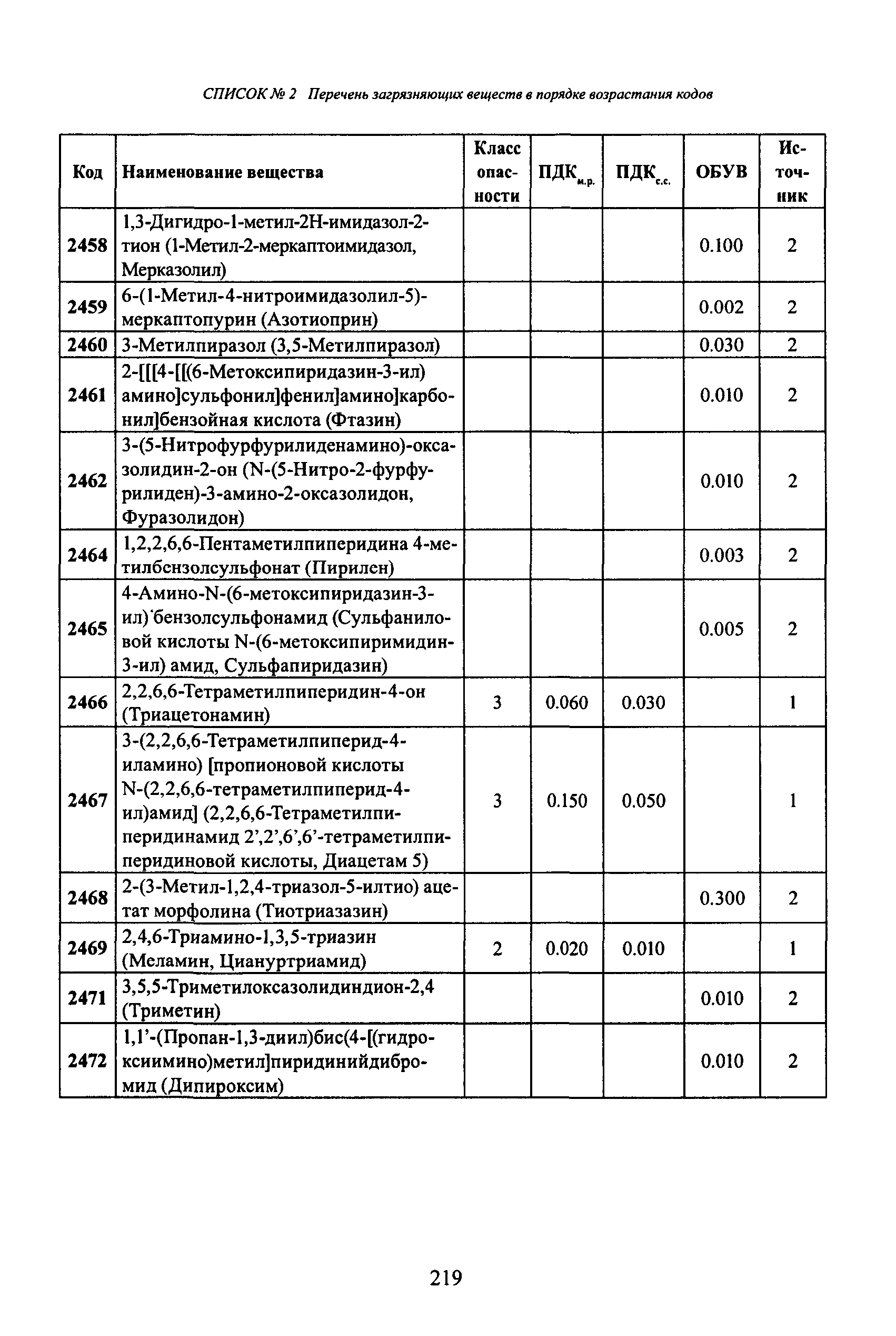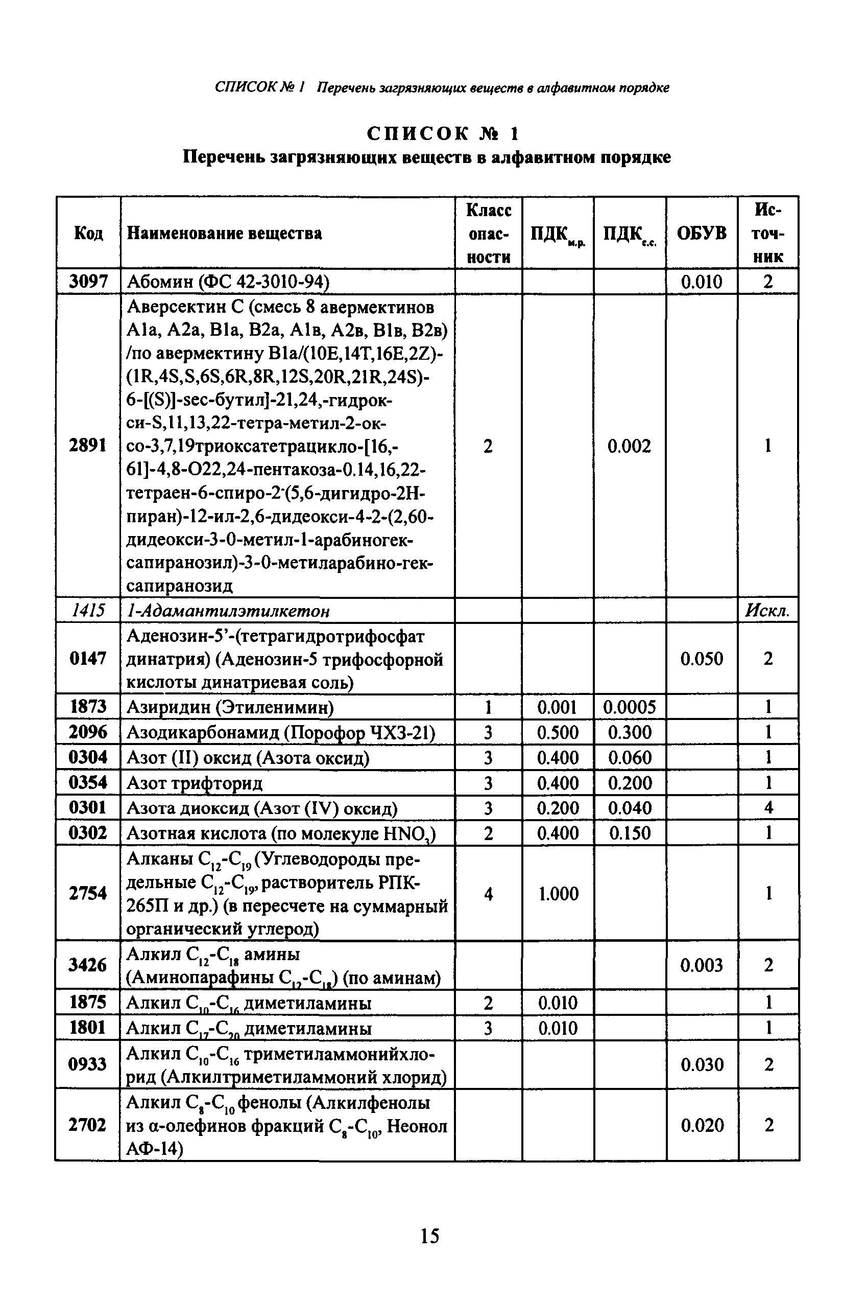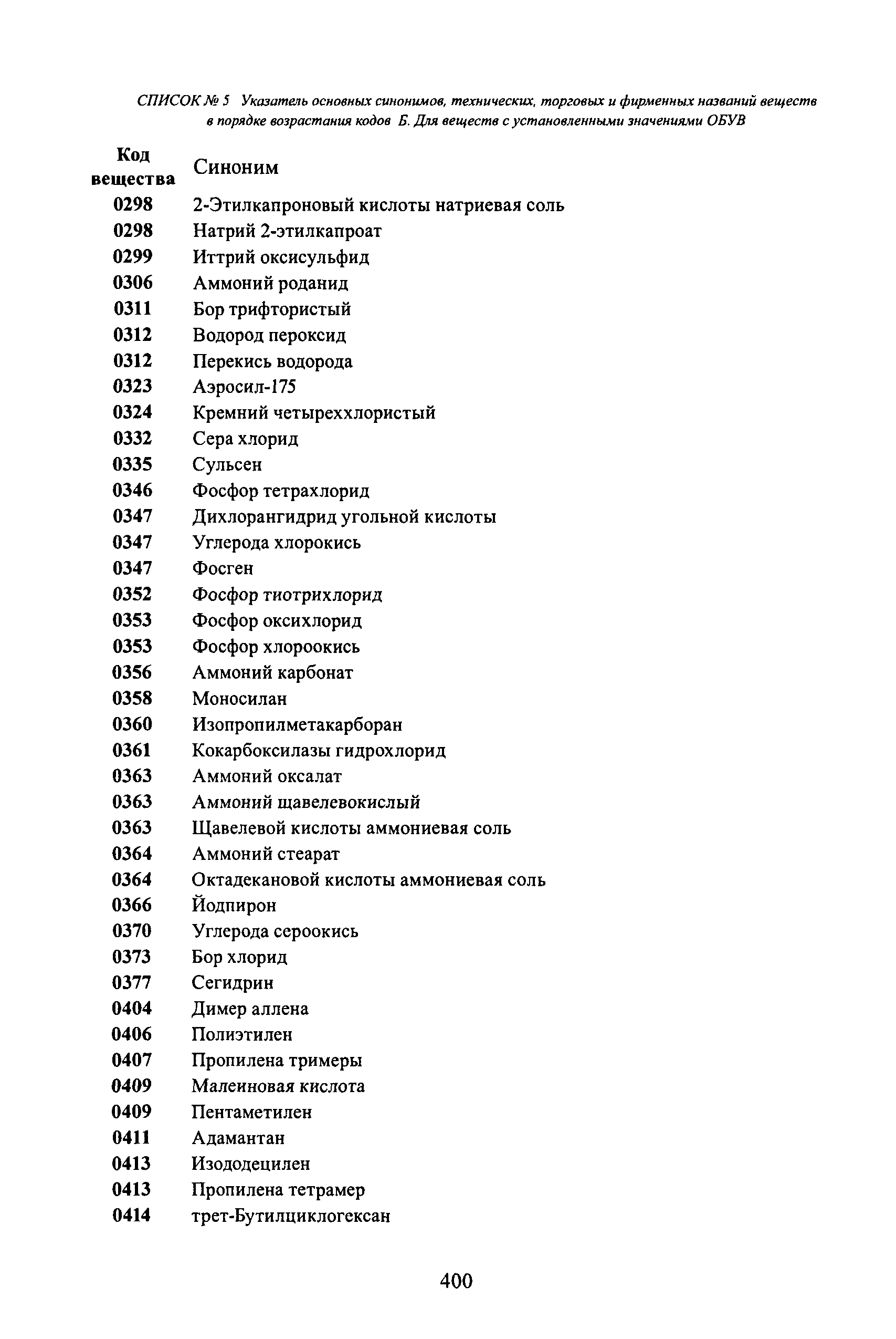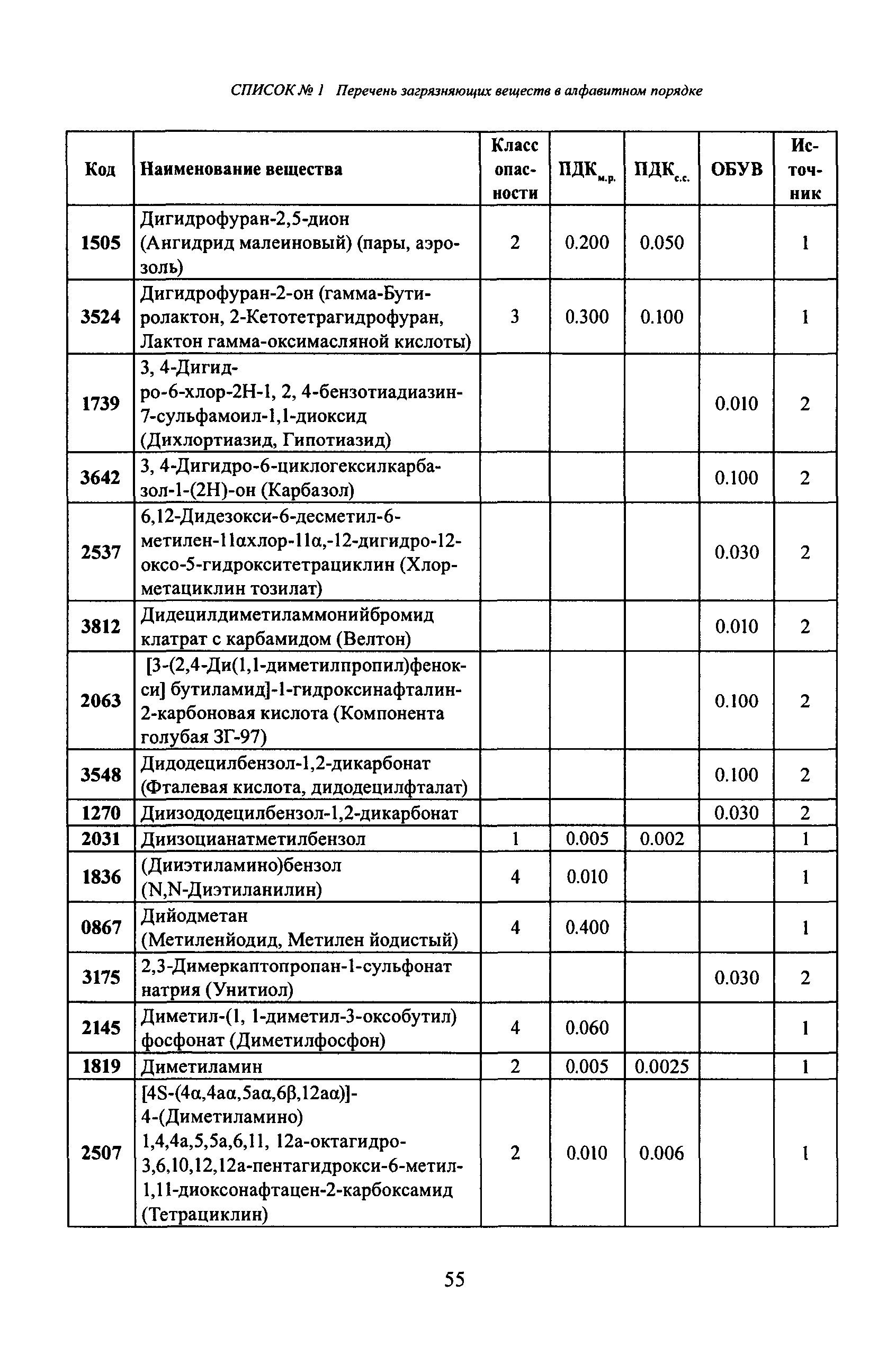 | Оглавление: | Введение Список № 1 Перечень загрязняющих веществ в алфавитном порядке Список № 2 Перечень загрязняющих веществ в порядке возрастания кодов Список № 3 Перечень ЛОС в порядке возрастания кодов Список № 4 Указатель основных синонимов, технических, торговых и фирменных названий веществ в алфавитном порядке А. Для веществ с установленными значениями ПДК Б. Для веществ с установленными значениями ОБУВ Список № 5 Указатель основных синонимов, технических, торговых и фирменных названий веществ в порядке возрастания кодов А. Для веществ с установленными значениями ПДК Б. Для веществ с установленными значениями ОБУВ |
