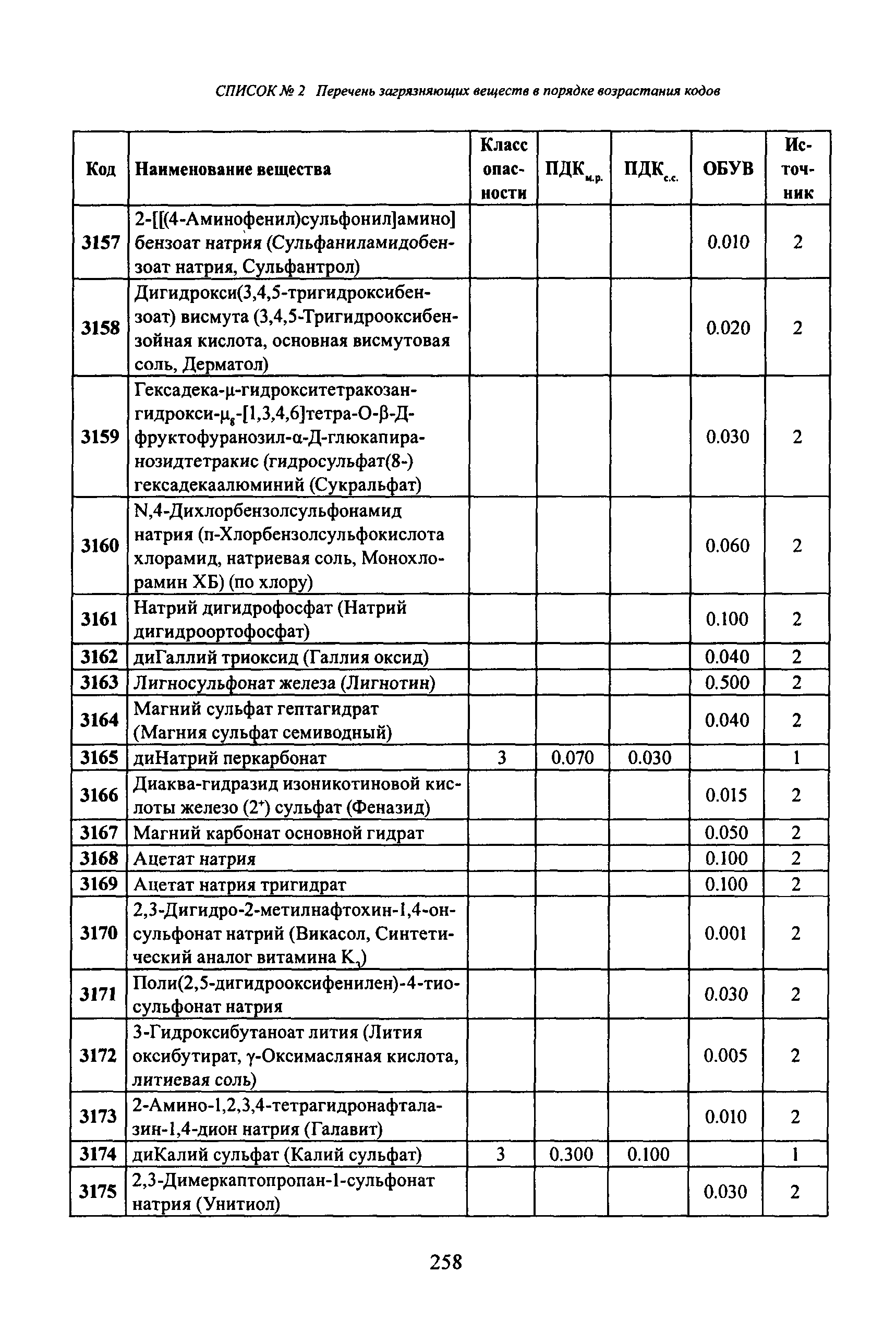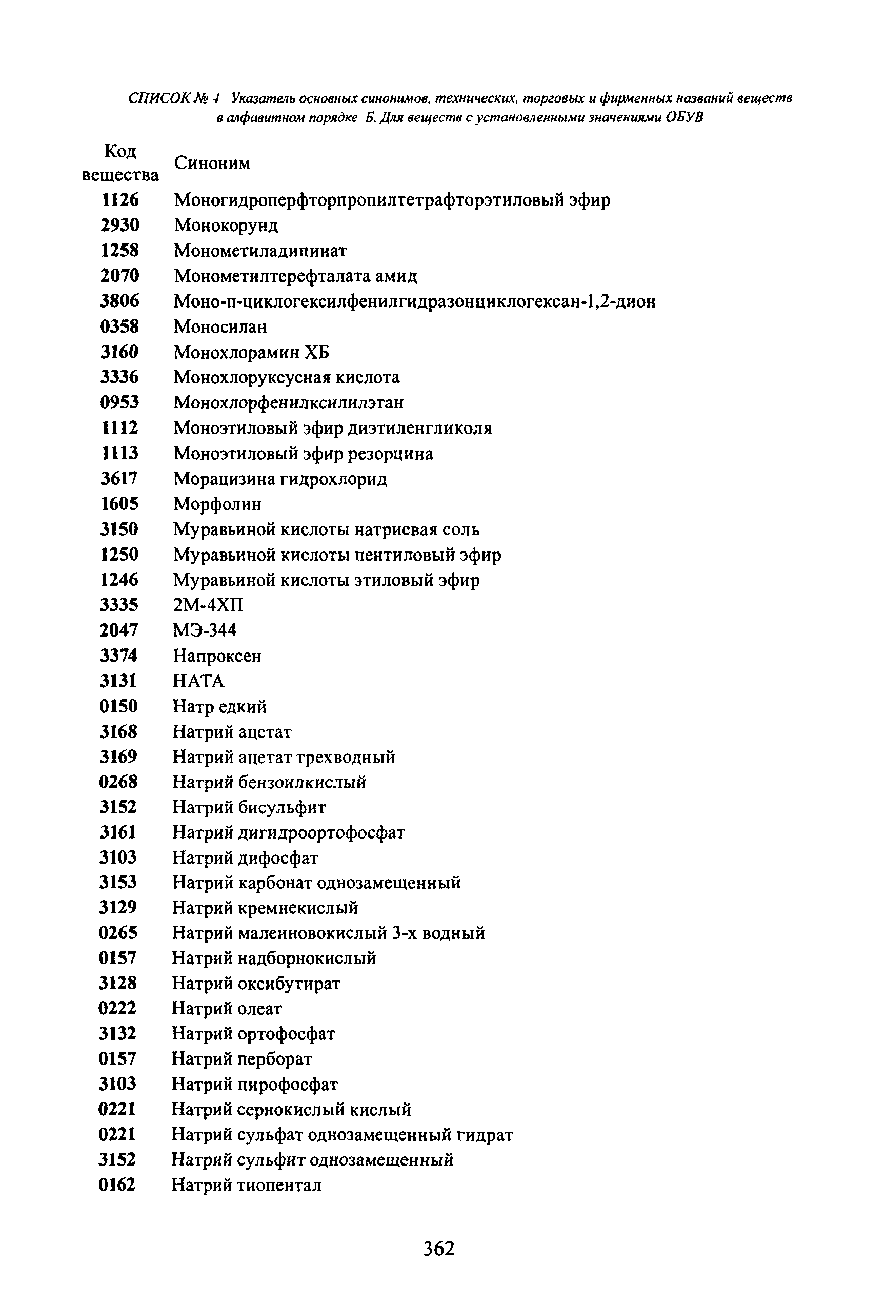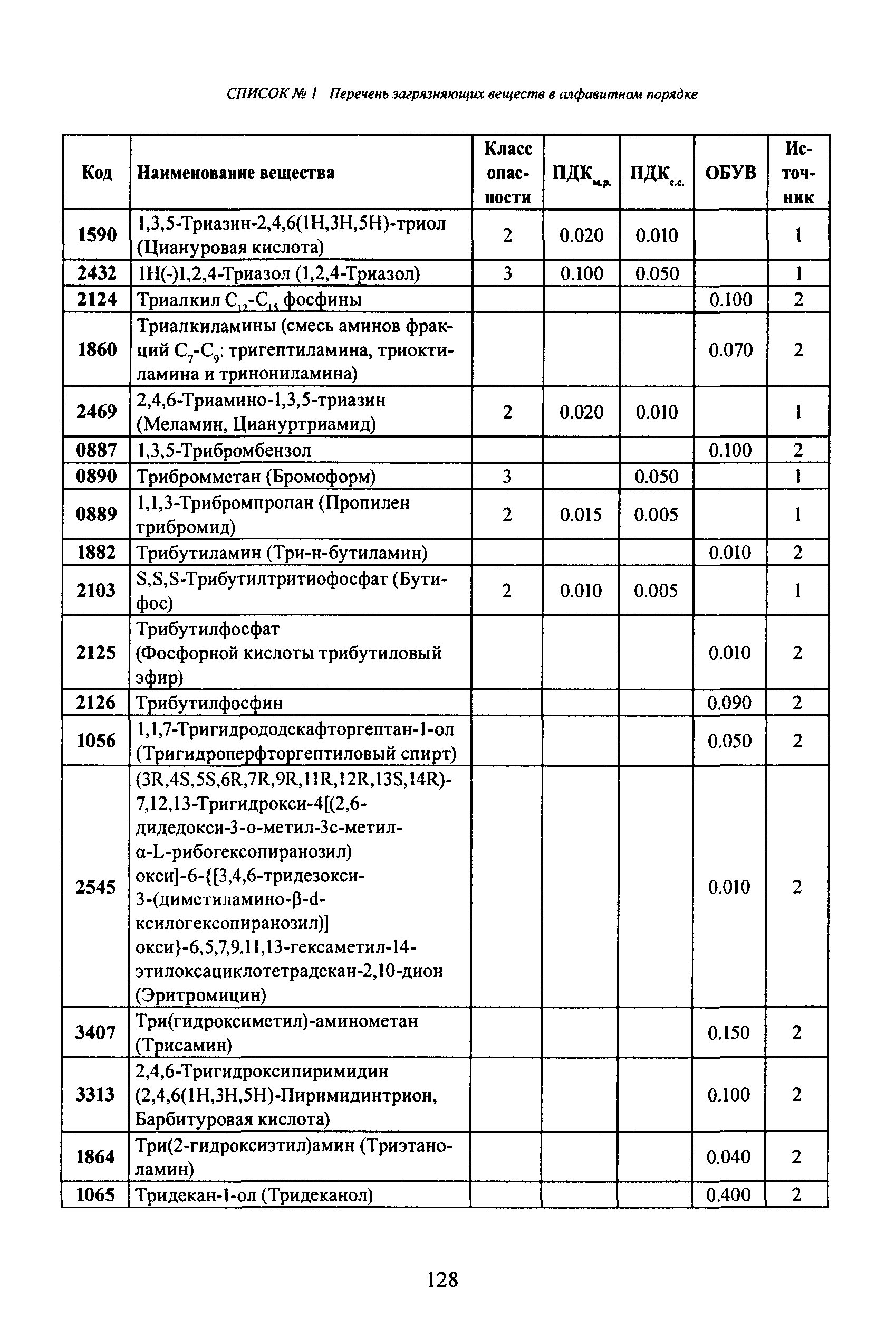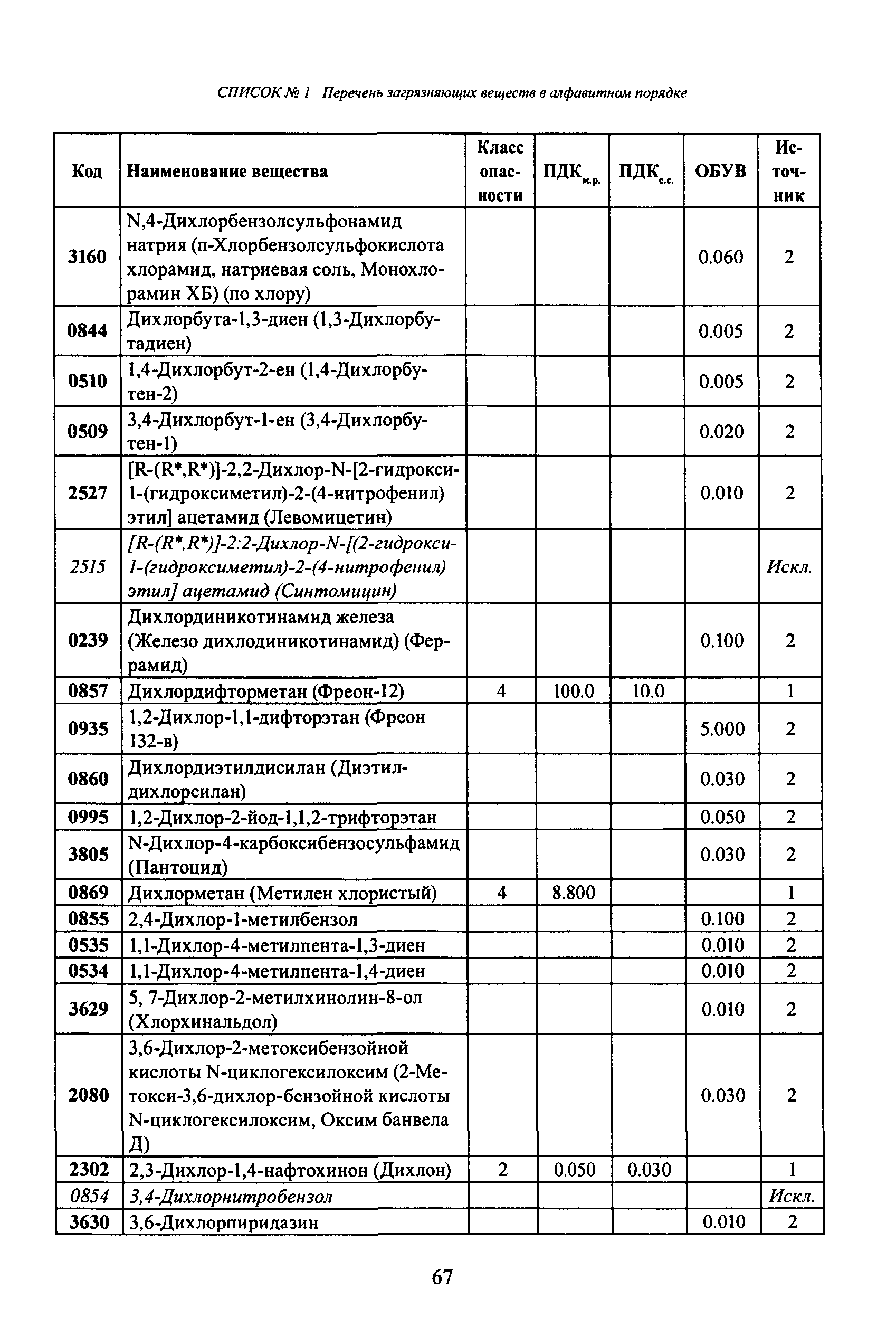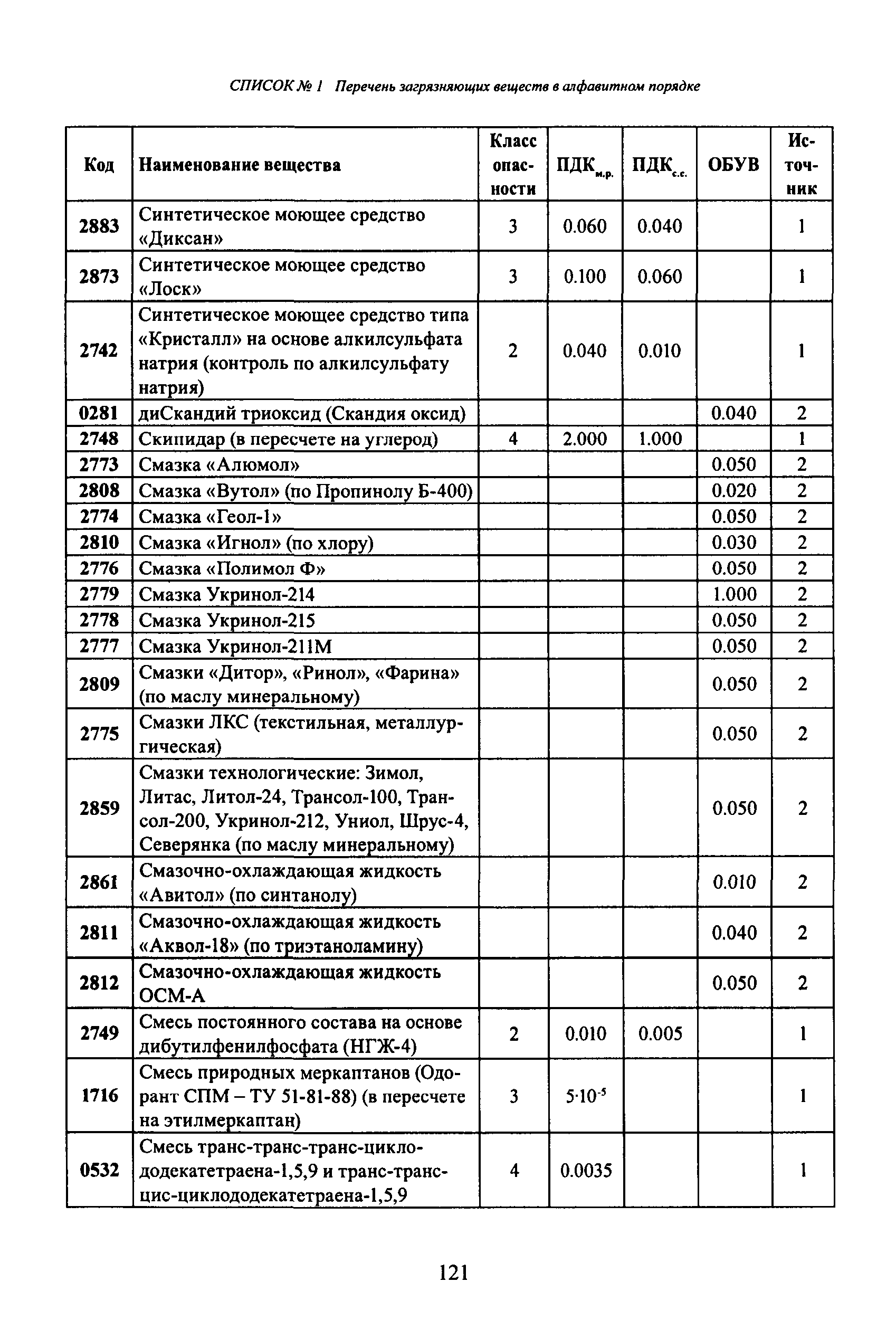 | Оглавление: | Введение Список № 1 Перечень загрязняющих веществ в алфавитном порядке Список № 2 Перечень загрязняющих веществ в порядке возрастания кодов Список № 3 Перечень ЛОС в порядке возрастания кодов Список № 4 Указатель основных синонимов, технических, торговых и фирменных названий веществ в алфавитном порядке А. Для веществ с установленными значениями ПДК Б. Для веществ с установленными значениями ОБУВ Список № 5 Указатель основных синонимов, технических, торговых и фирменных названий веществ в порядке возрастания кодов А. Для веществ с установленными значениями ПДК Б. Для веществ с установленными значениями ОБУВ |