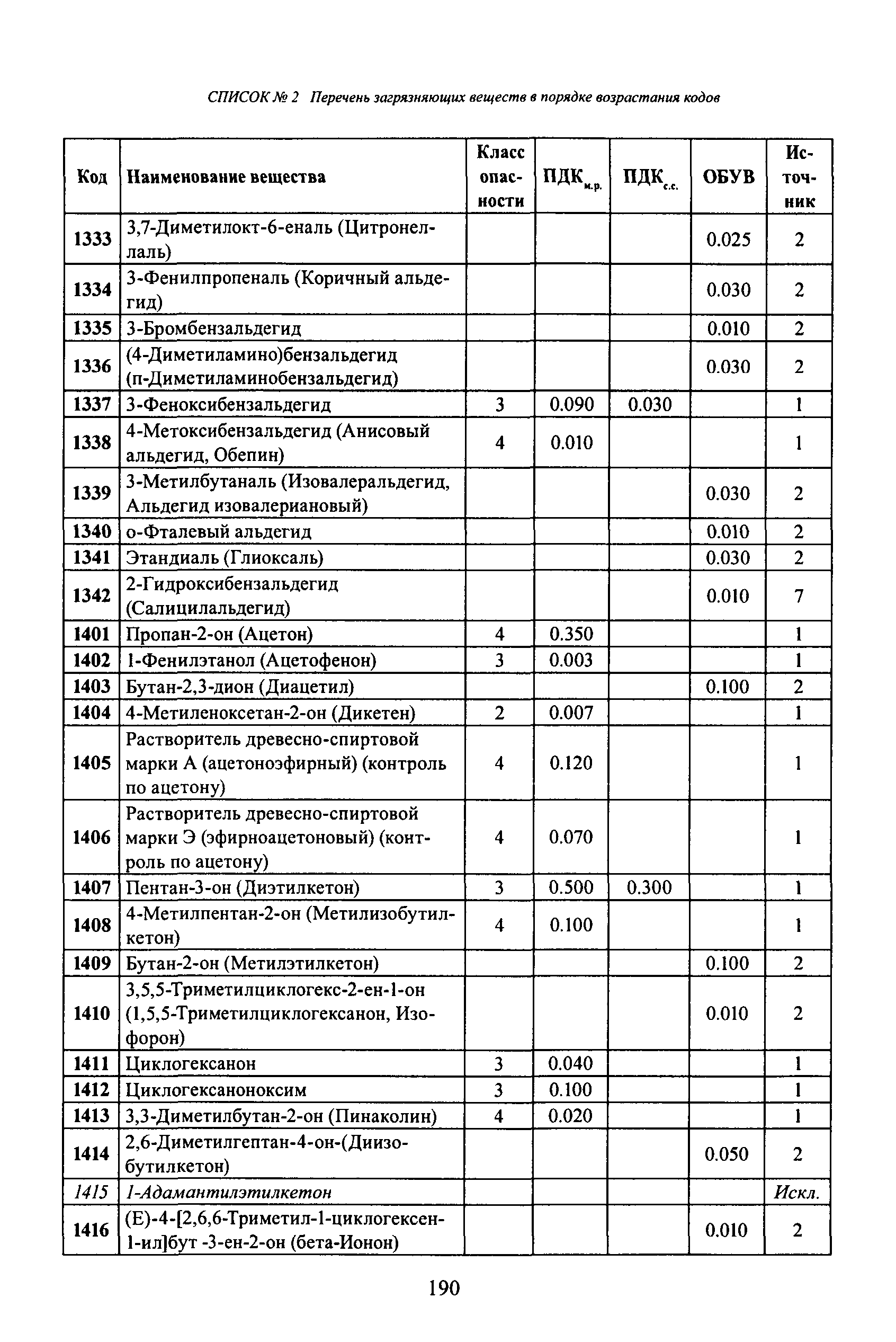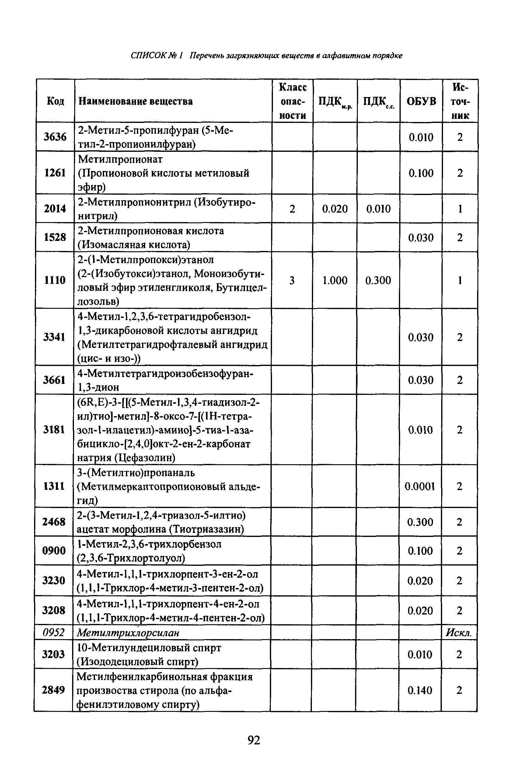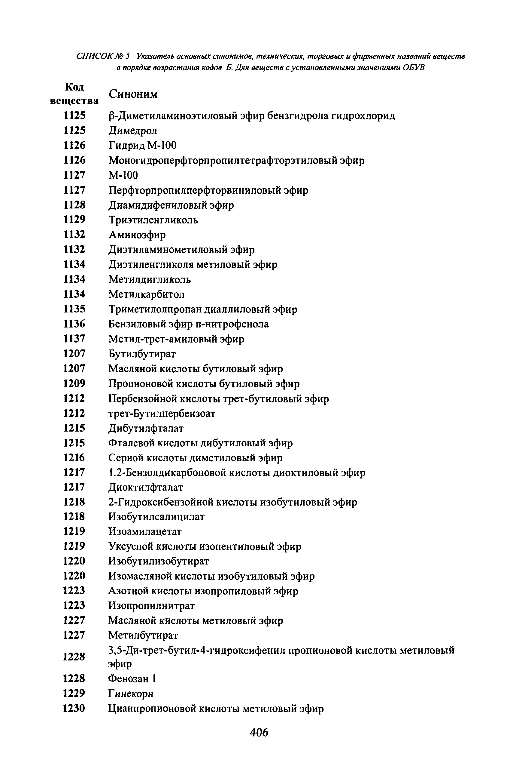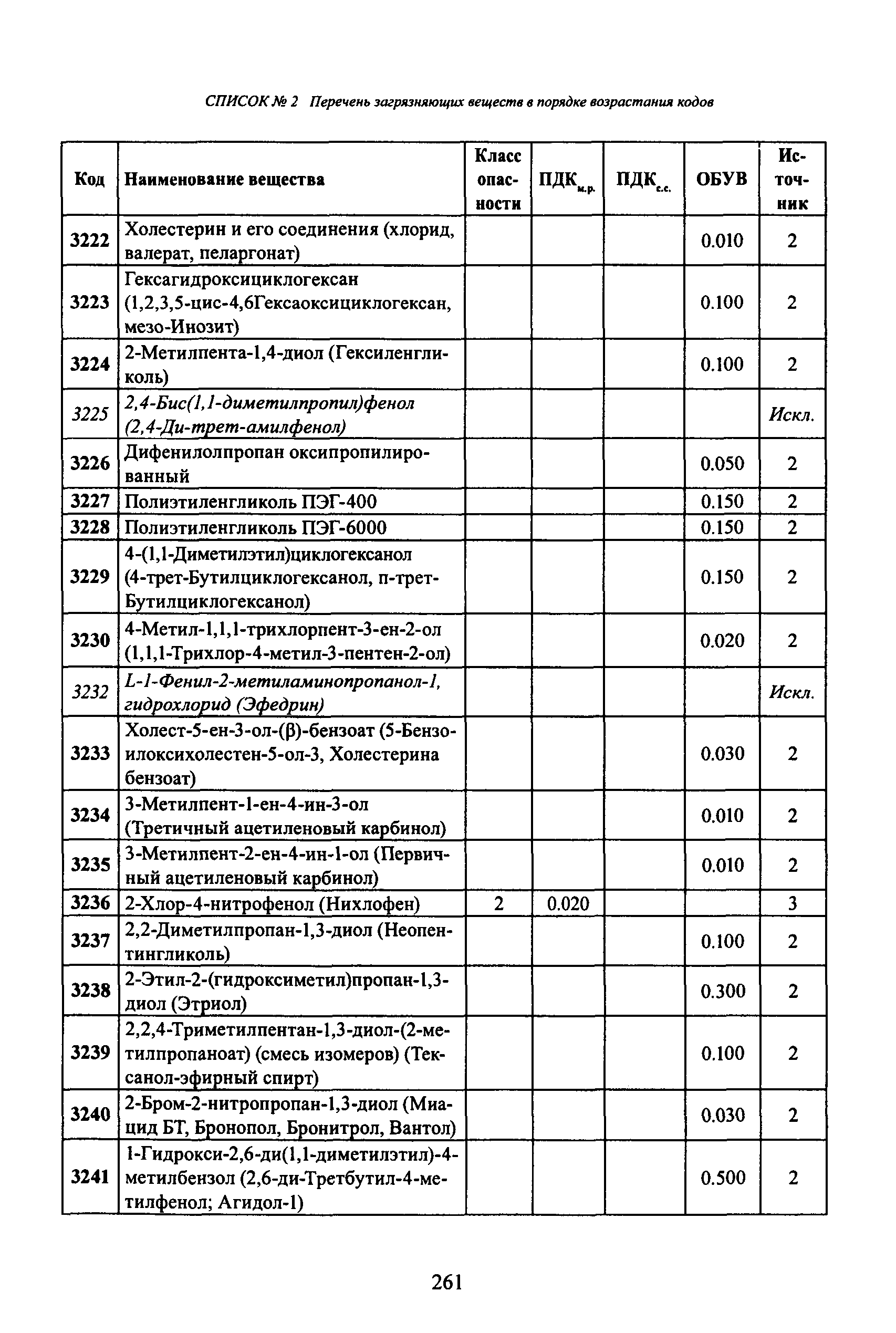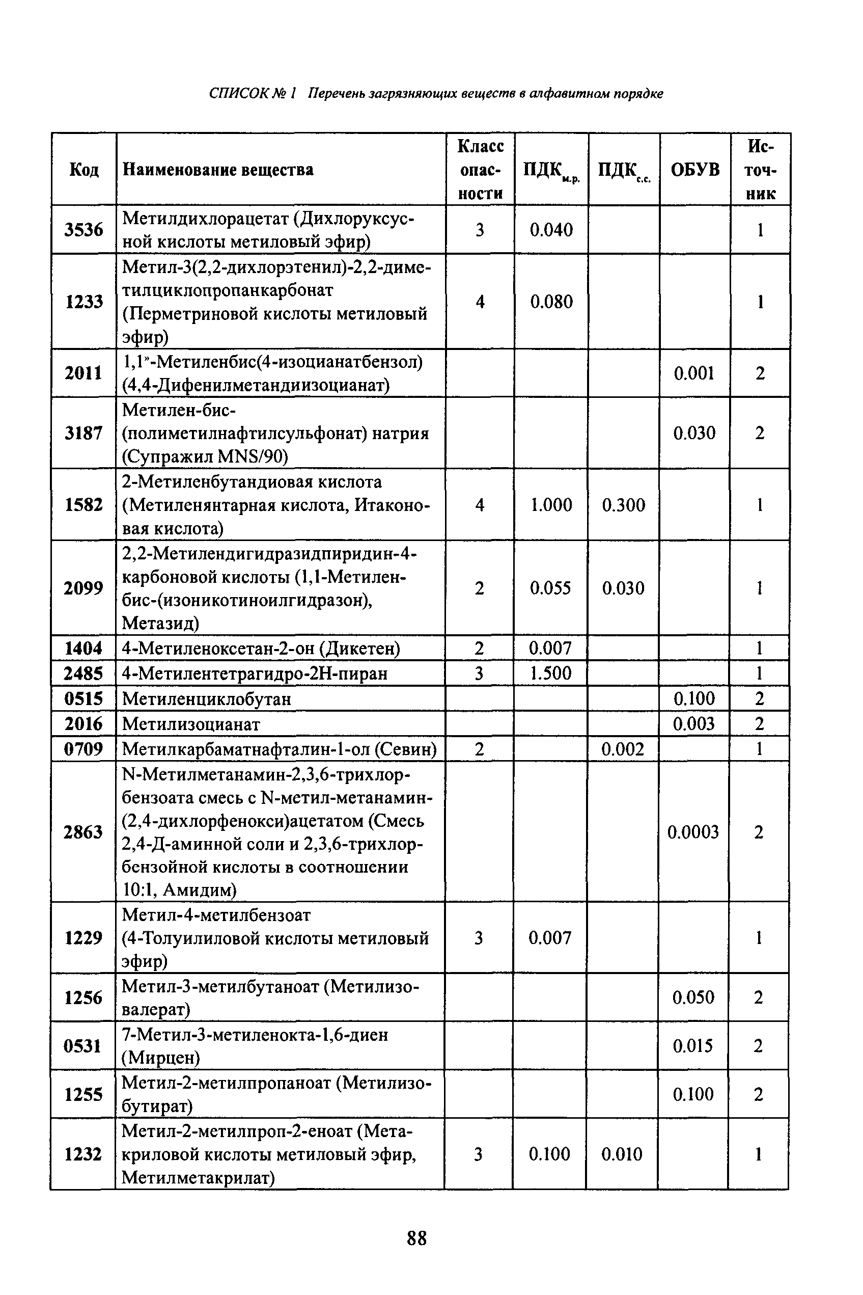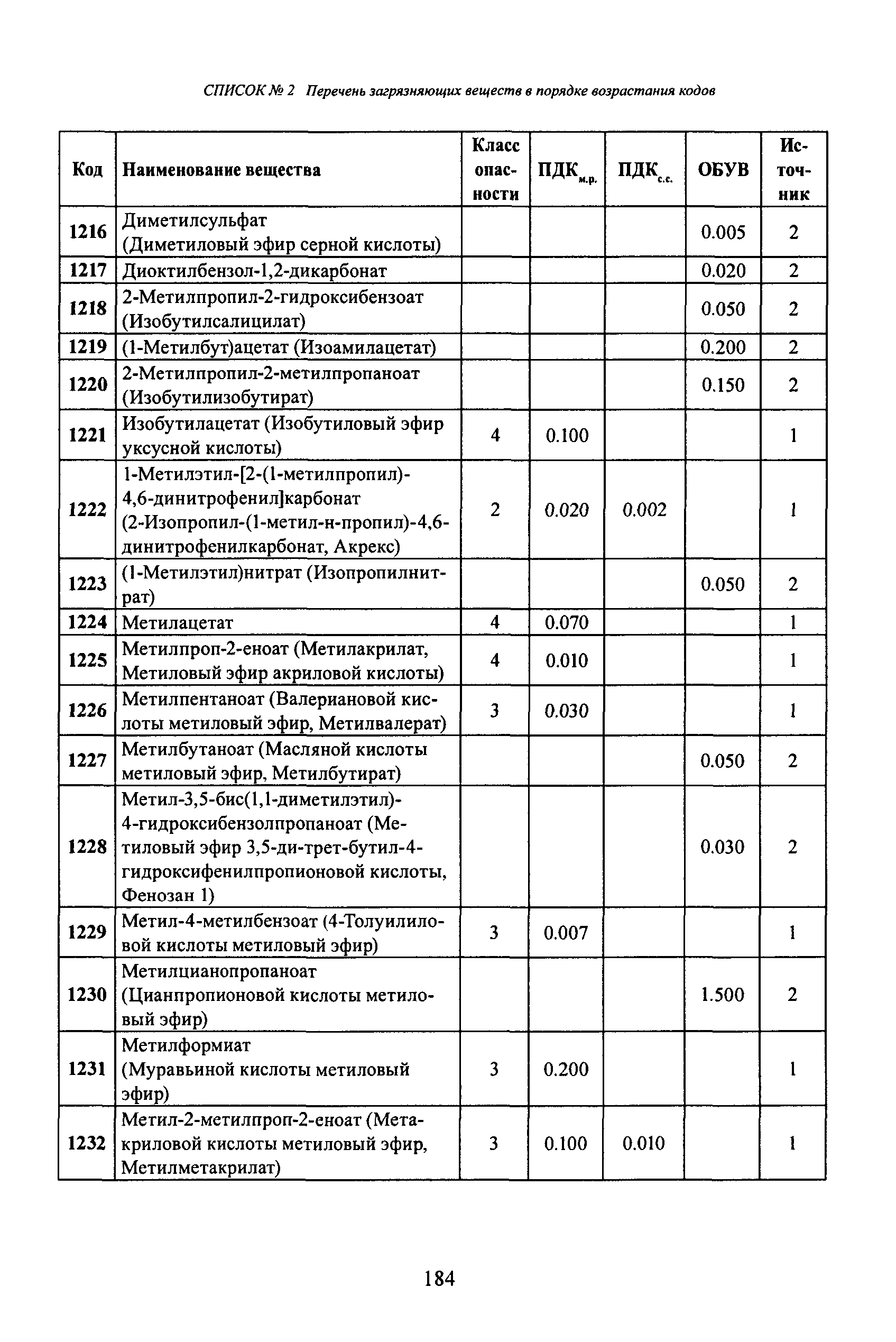 | Оглавление: | Введение Список № 1 Перечень загрязняющих веществ в алфавитном порядке Список № 2 Перечень загрязняющих веществ в порядке возрастания кодов Список № 3 Перечень ЛОС в порядке возрастания кодов Список № 4 Указатель основных синонимов, технических, торговых и фирменных названий веществ в алфавитном порядке А. Для веществ с установленными значениями ПДК Б. Для веществ с установленными значениями ОБУВ Список № 5 Указатель основных синонимов, технических, торговых и фирменных названий веществ в порядке возрастания кодов А. Для веществ с установленными значениями ПДК Б. Для веществ с установленными значениями ОБУВ |