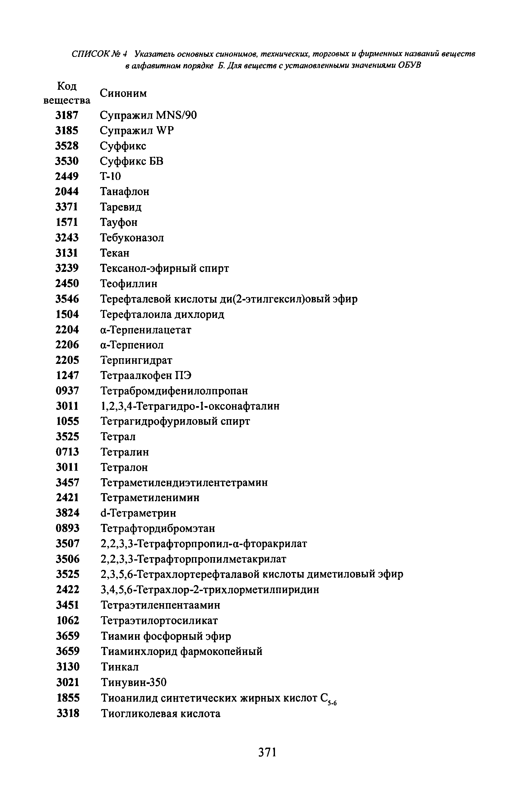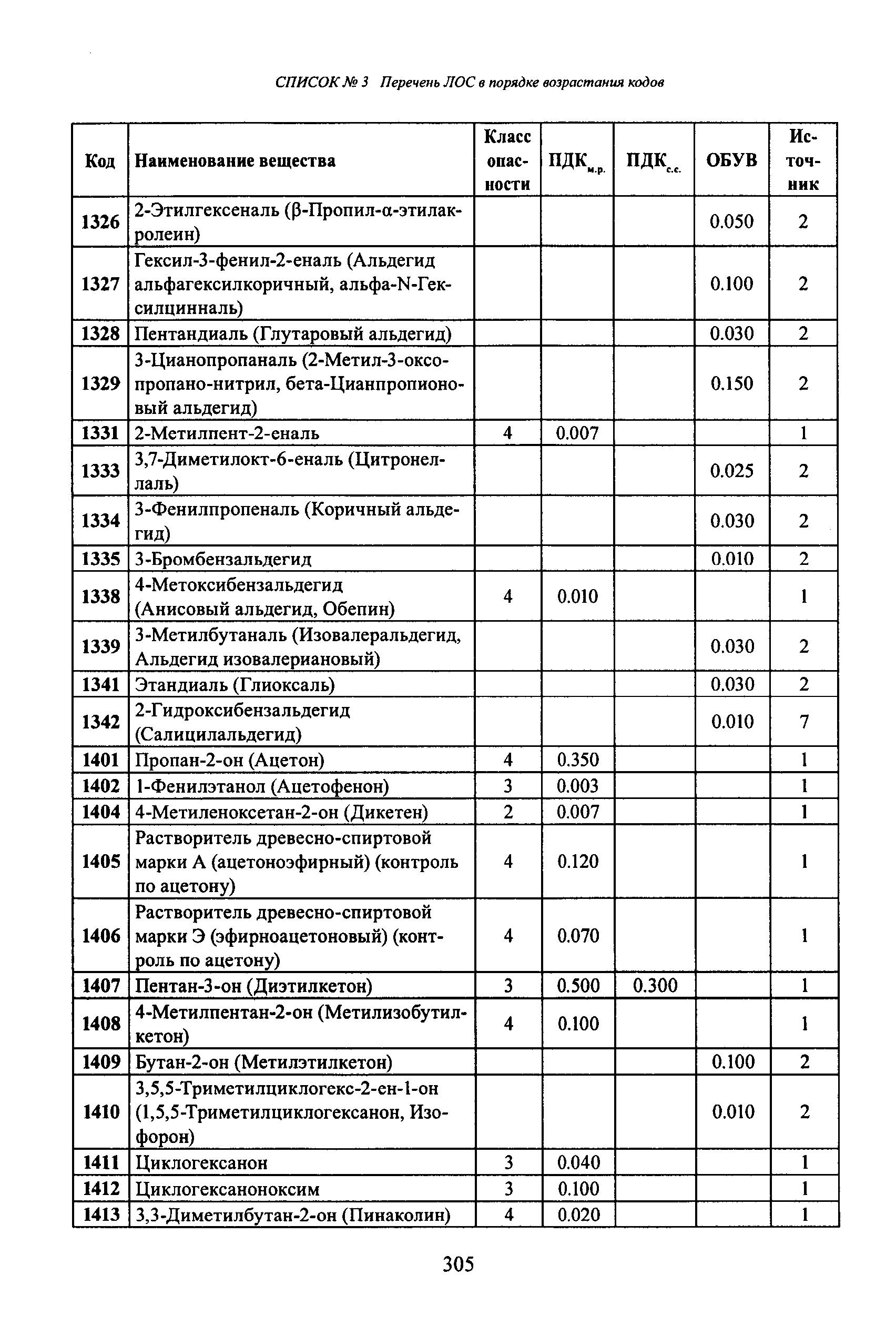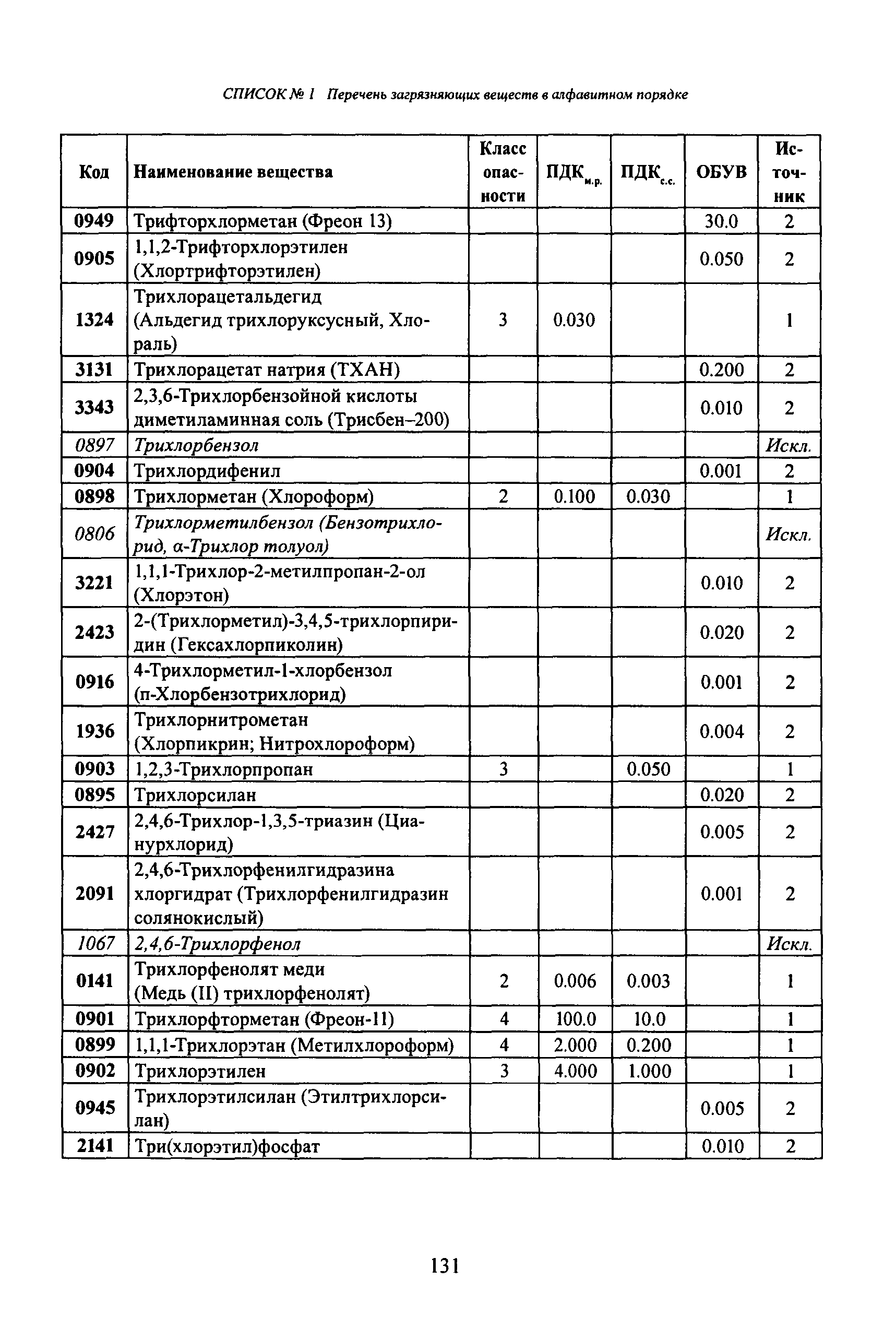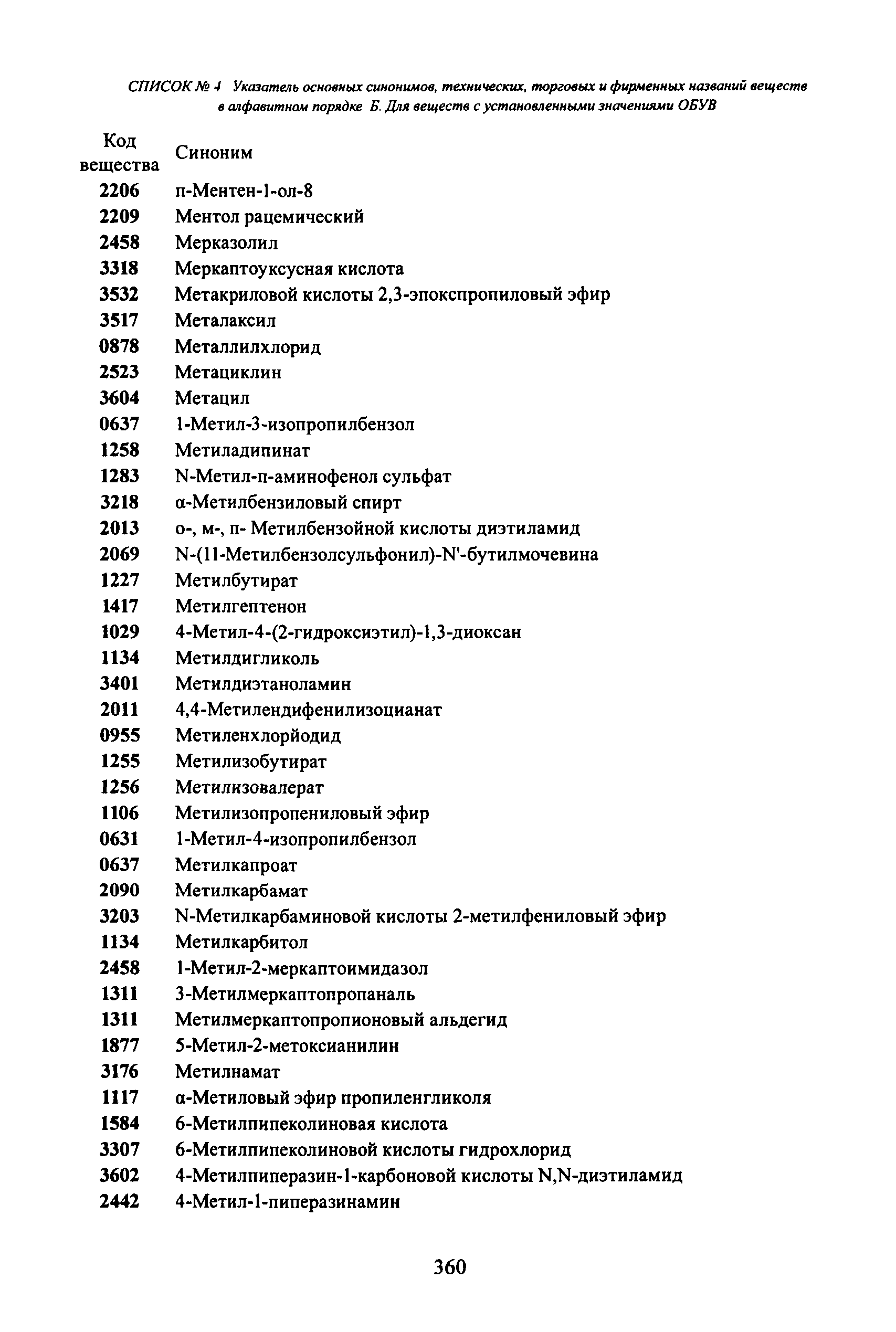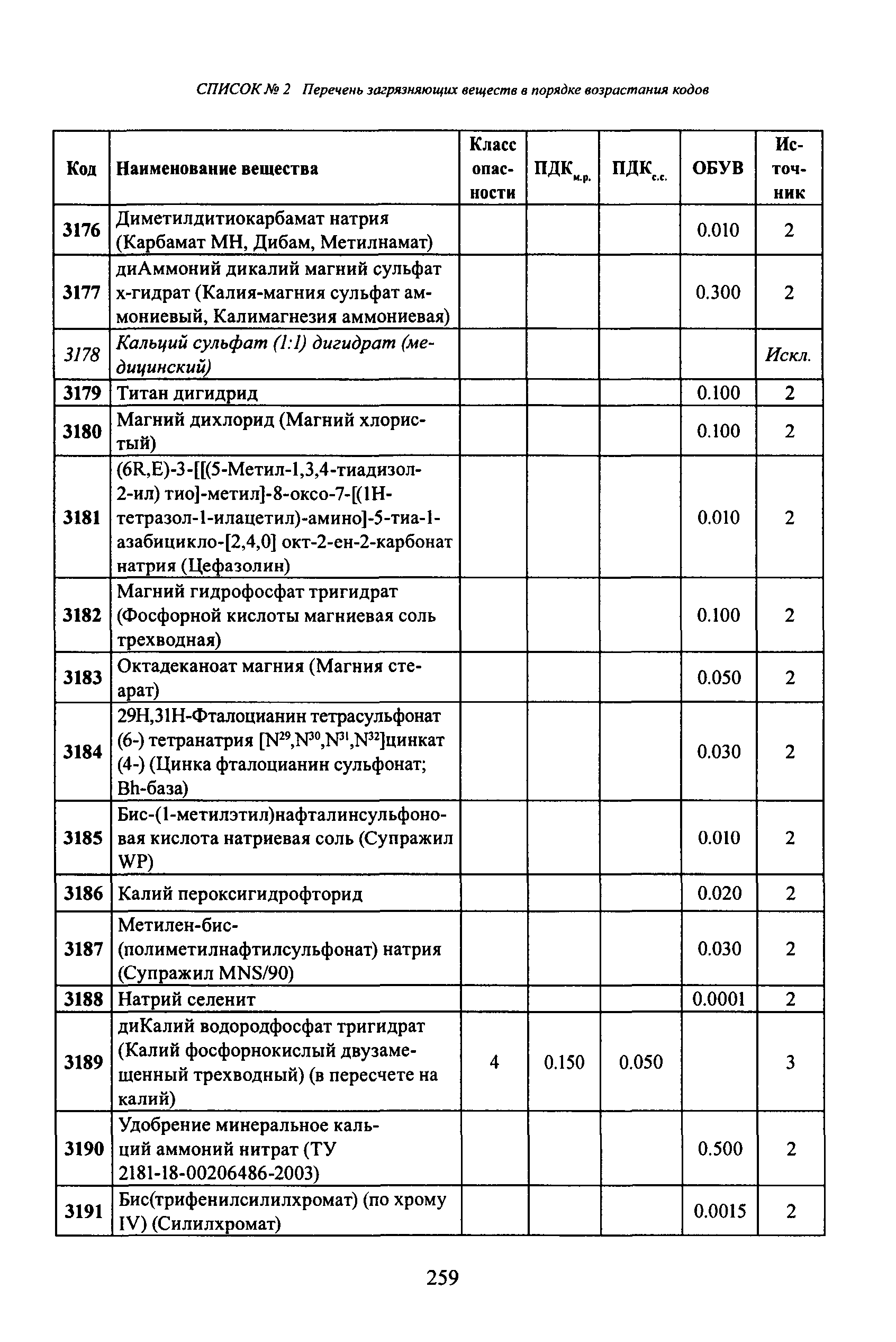 | Оглавление: | Введение Список № 1 Перечень загрязняющих веществ в алфавитном порядке Список № 2 Перечень загрязняющих веществ в порядке возрастания кодов Список № 3 Перечень ЛОС в порядке возрастания кодов Список № 4 Указатель основных синонимов, технических, торговых и фирменных названий веществ в алфавитном порядке А. Для веществ с установленными значениями ПДК Б. Для веществ с установленными значениями ОБУВ Список № 5 Указатель основных синонимов, технических, торговых и фирменных названий веществ в порядке возрастания кодов А. Для веществ с установленными значениями ПДК Б. Для веществ с установленными значениями ОБУВ |